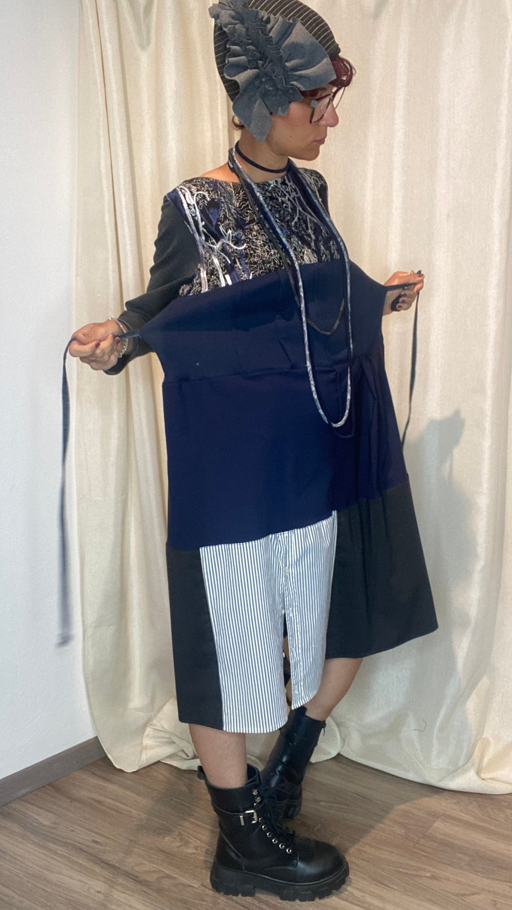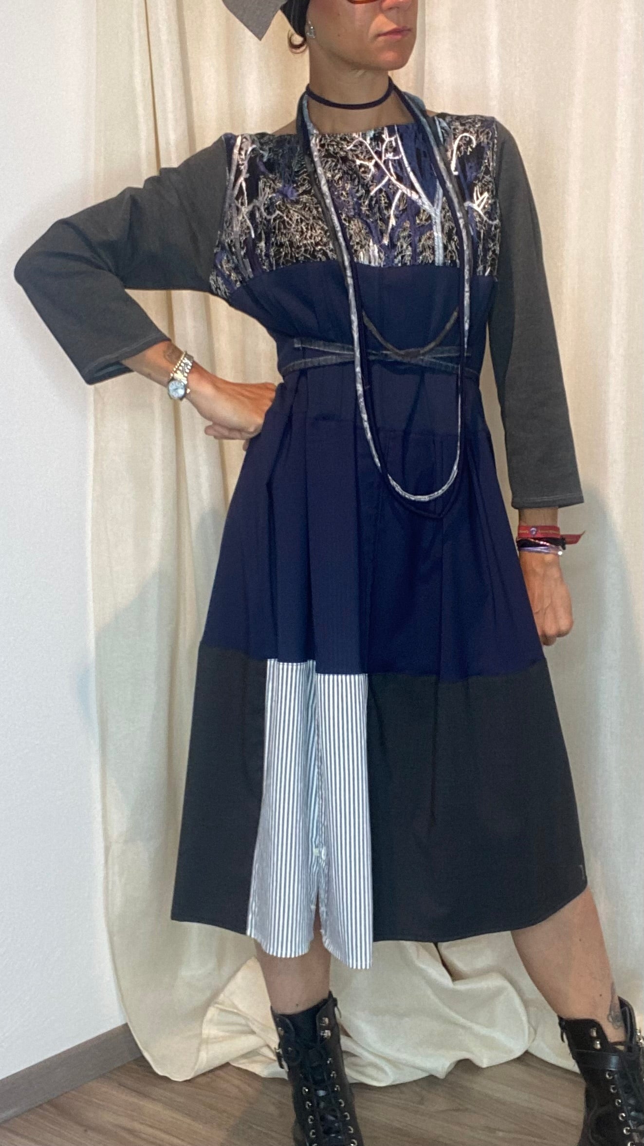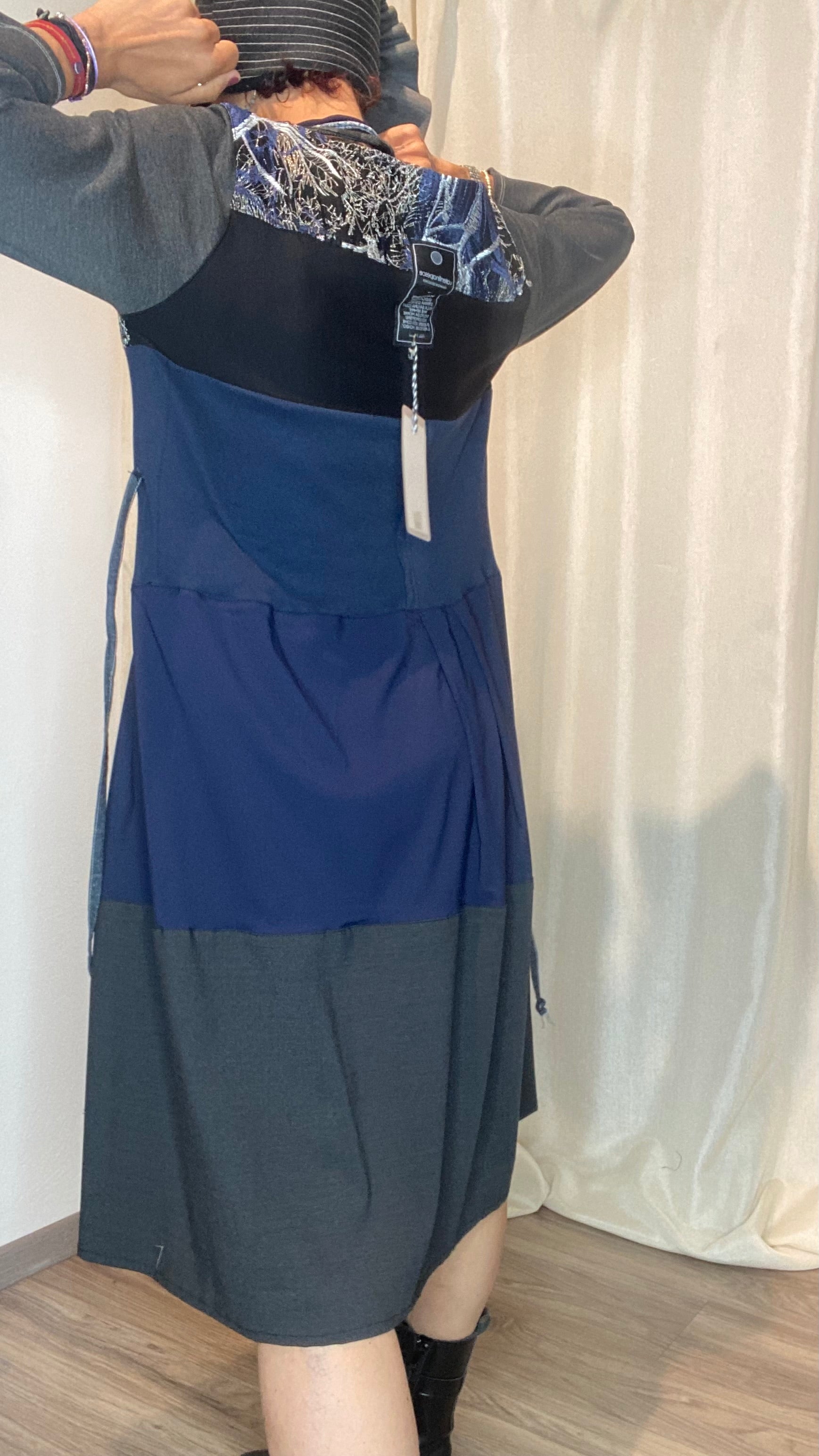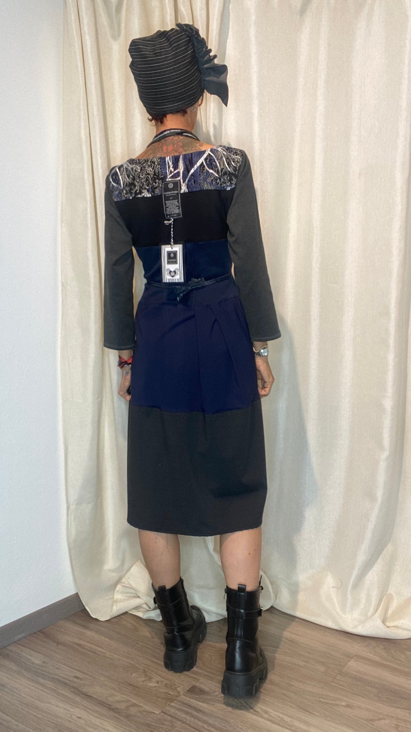 Abito asimmetrico patchwork, con manica lunga, drappeggio sul davanti e regolabile in vita mediante laccetti. Taglia unica, veste dalla tg 38 alla tg 50.