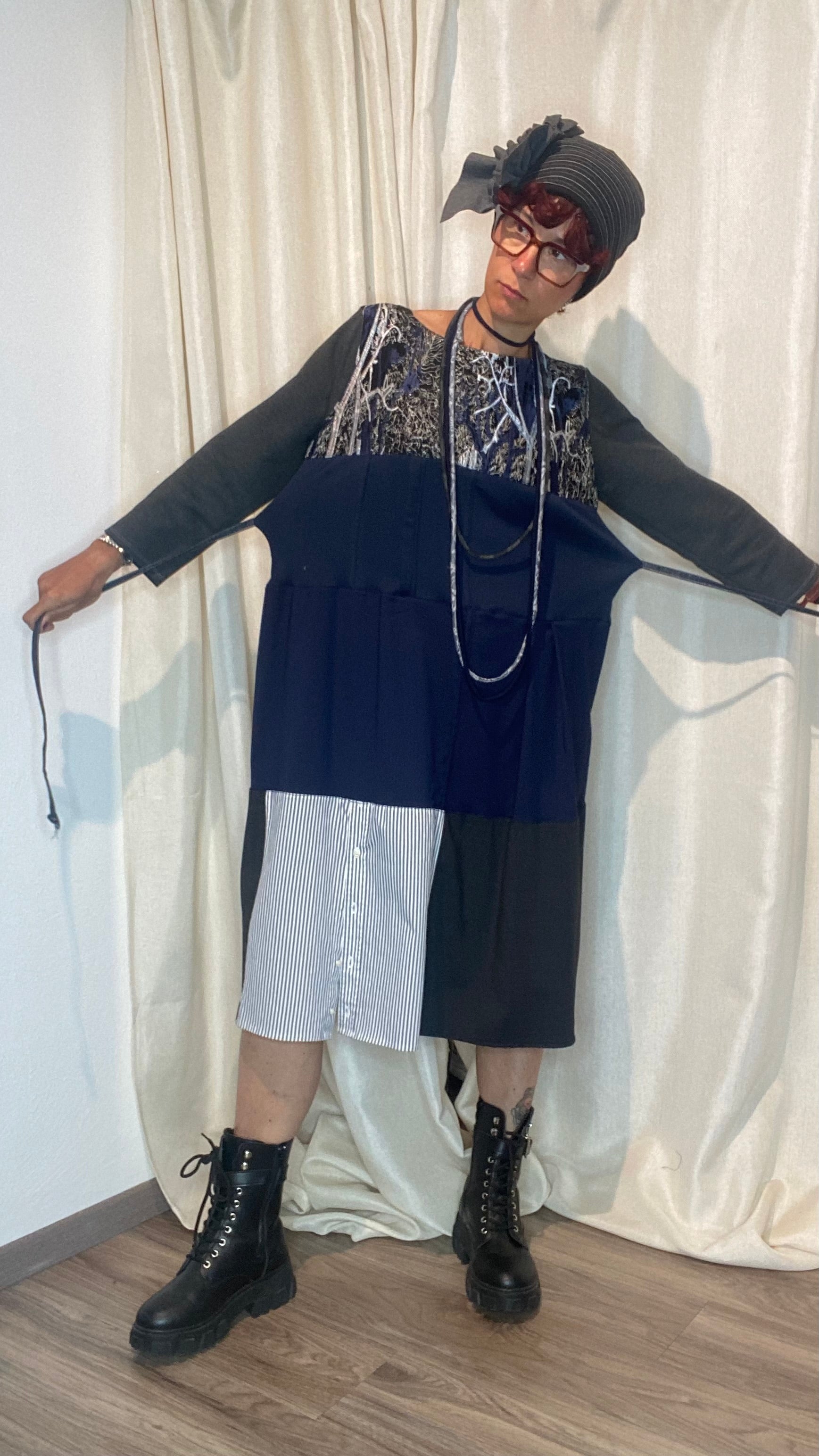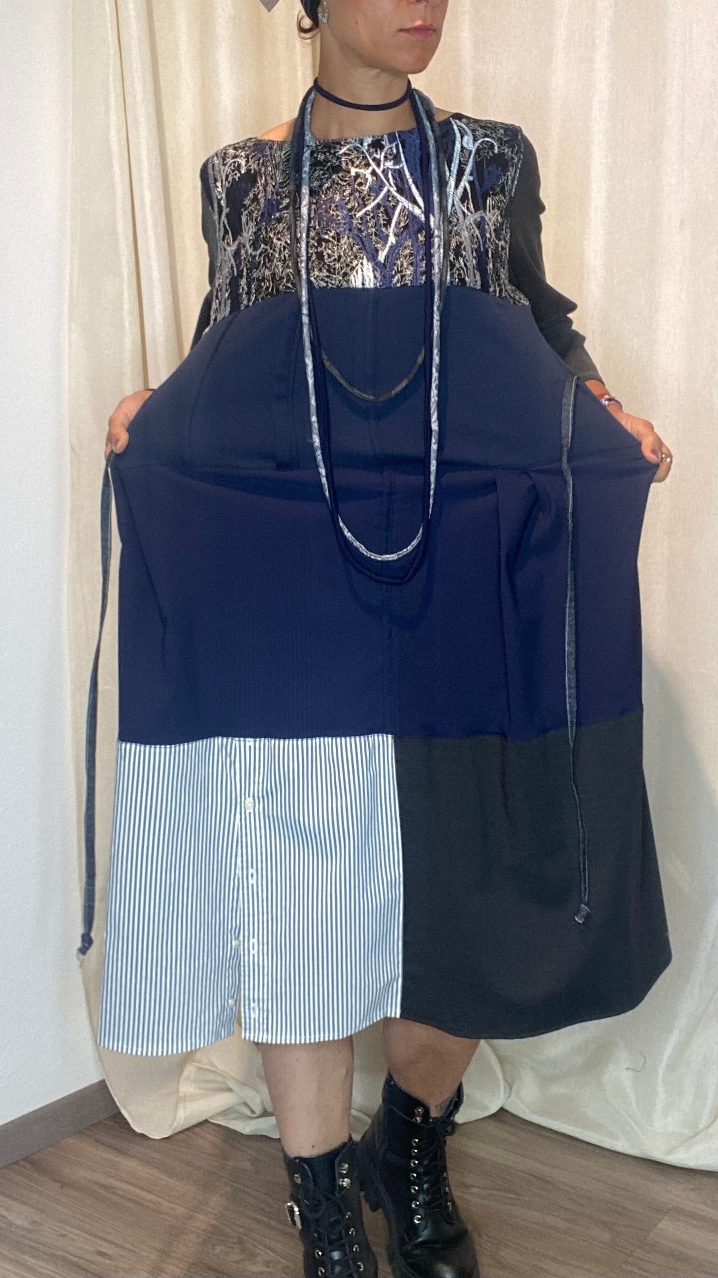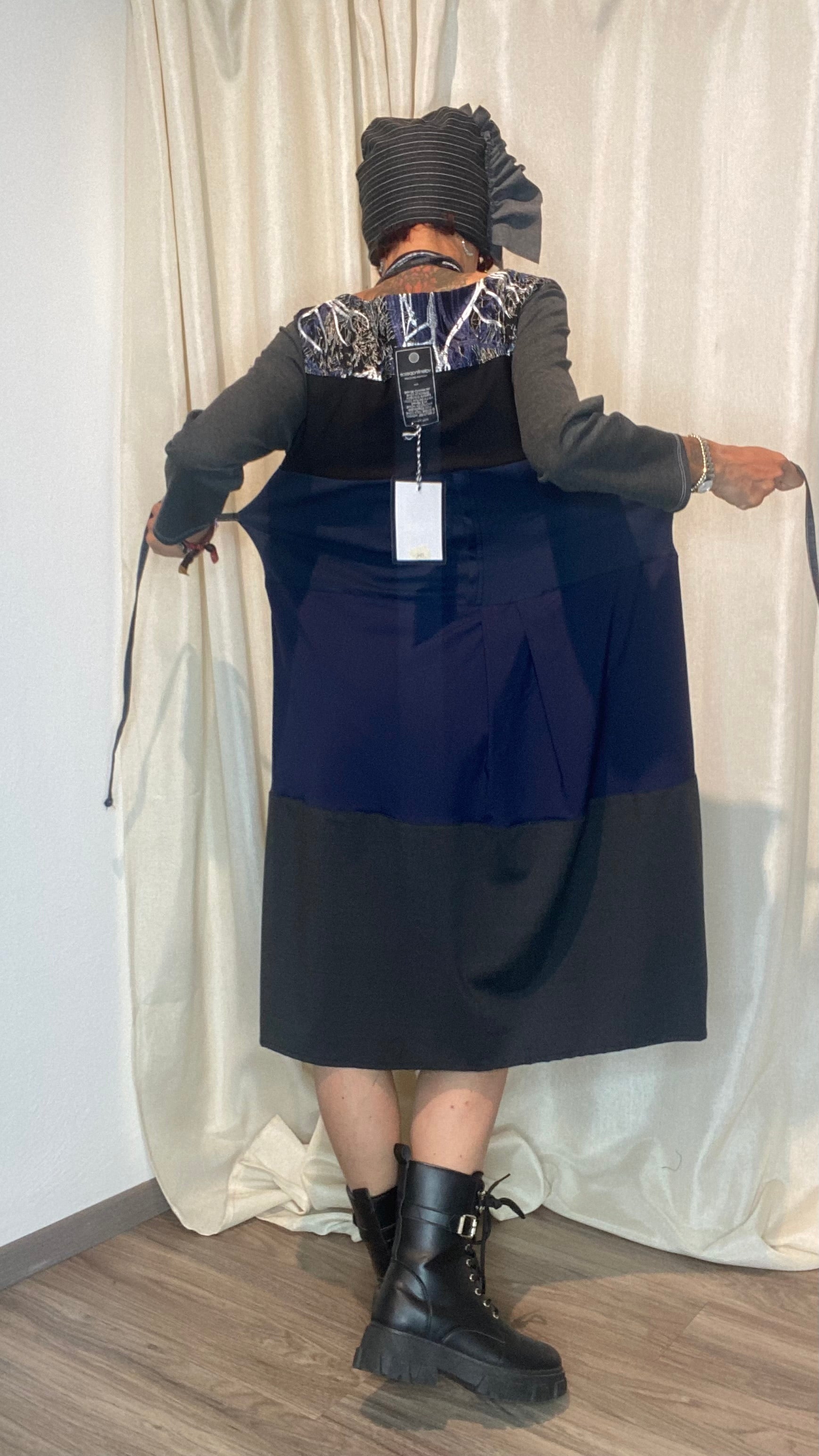 Abito asimmetrico patchwork, con manica lunga, drappeggio sul davanti e regolabile in vita mediante laccetti. Taglia unica, veste dalla tg 38 alla tg 50.