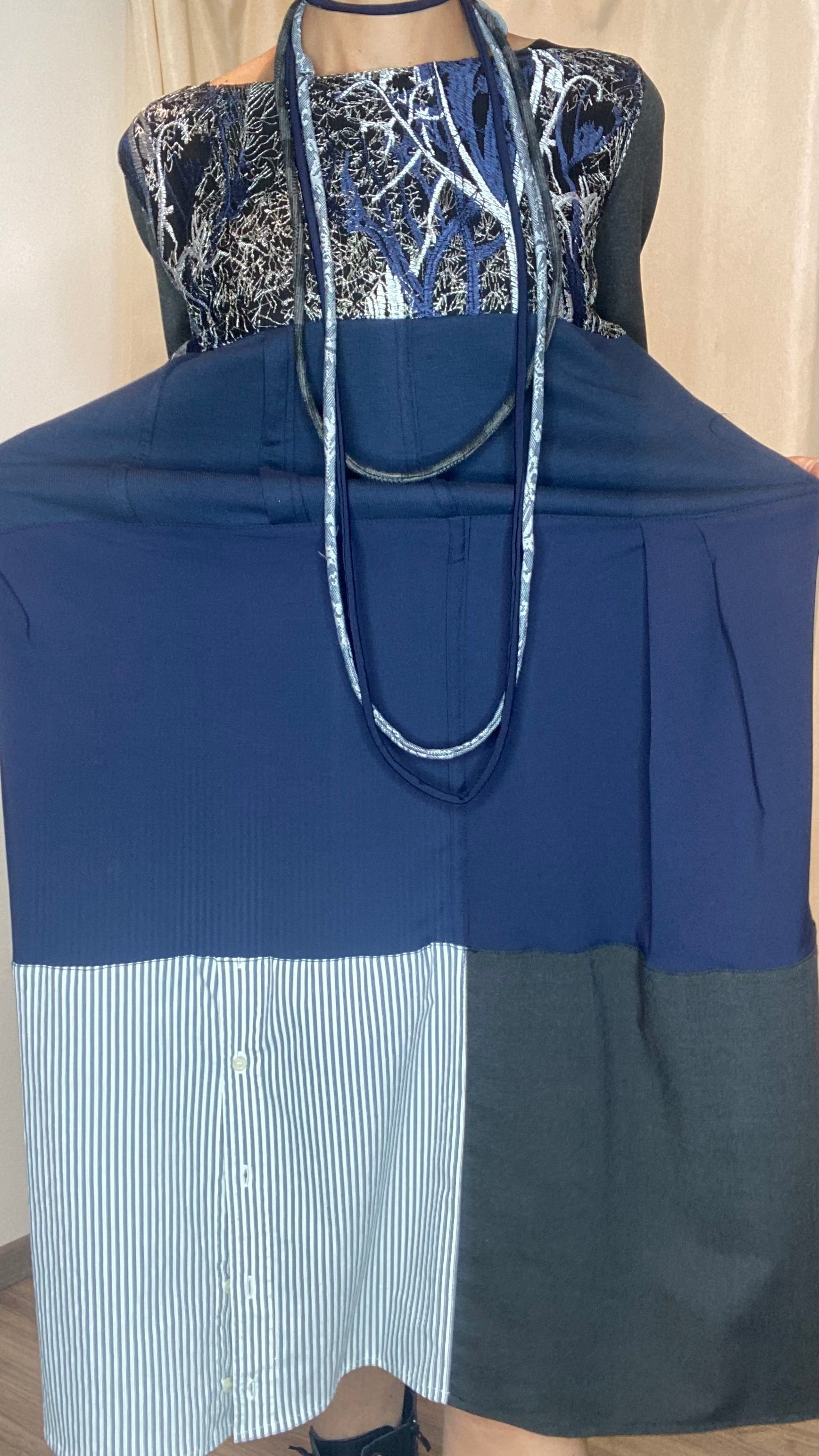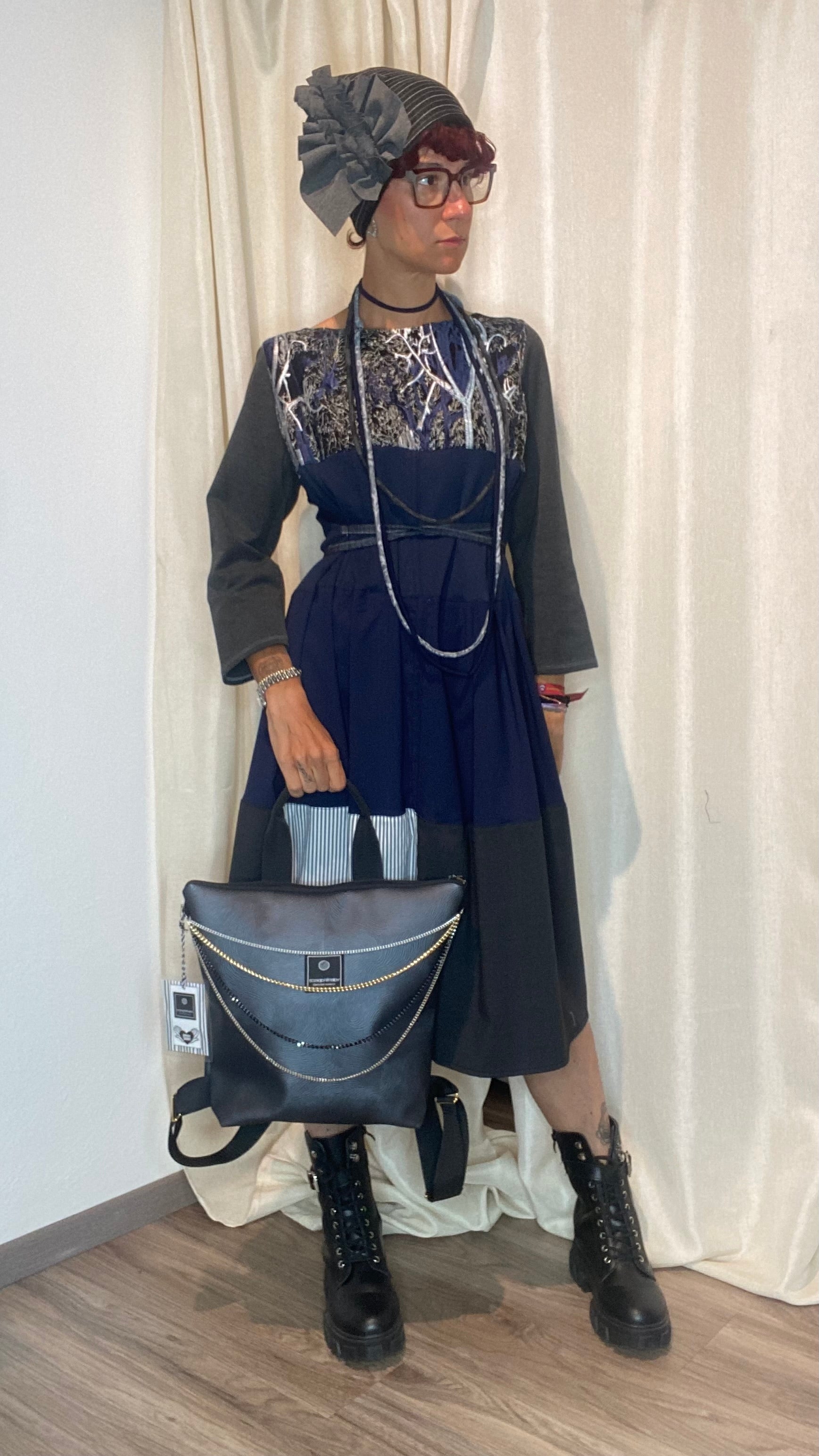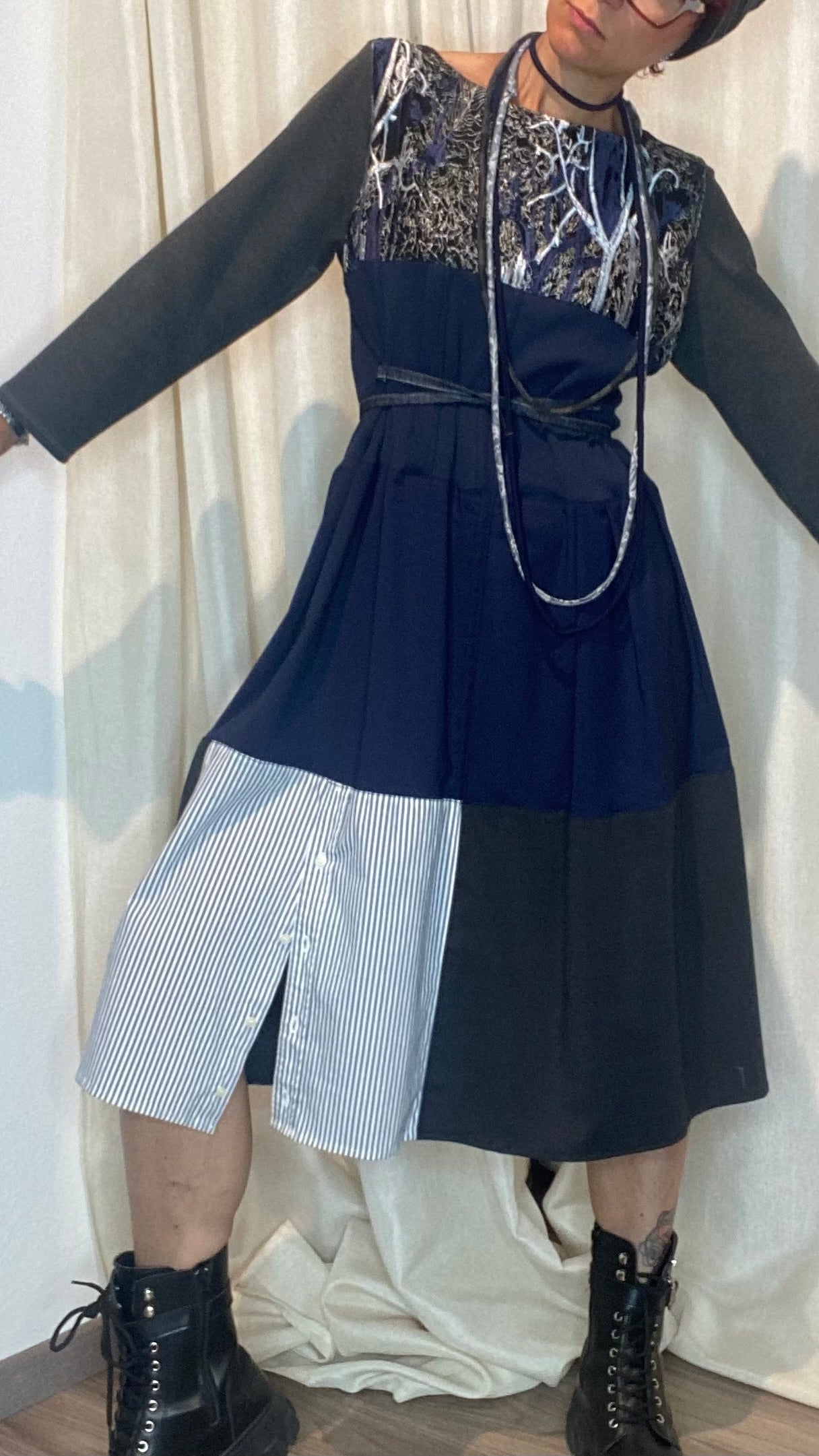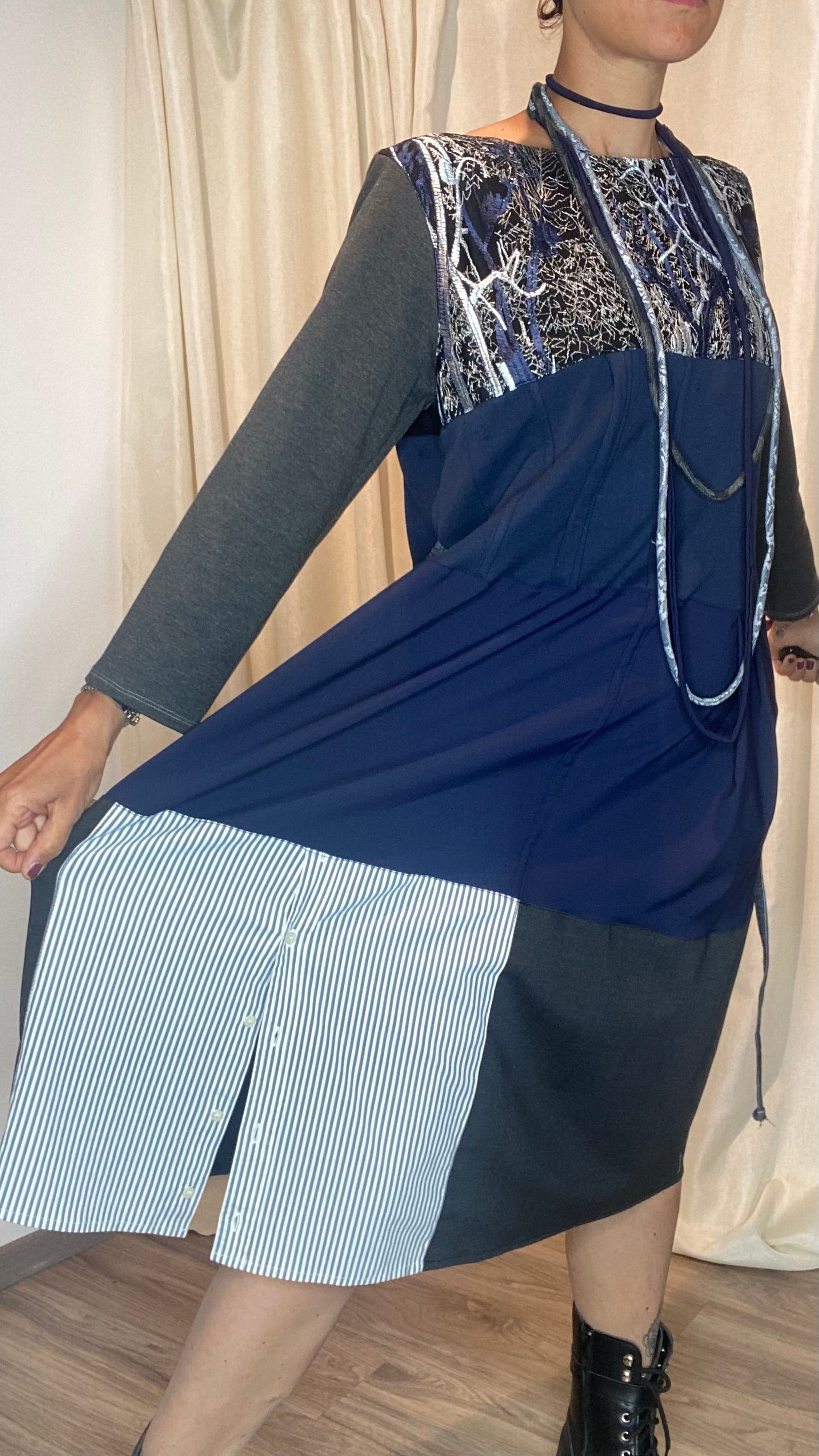 Abito asimmetrico patchwork, con manica lunga, drappeggio sul davanti e regolabile in vita mediante laccetti. Taglia unica, veste dalla tg 38 alla tg 50.