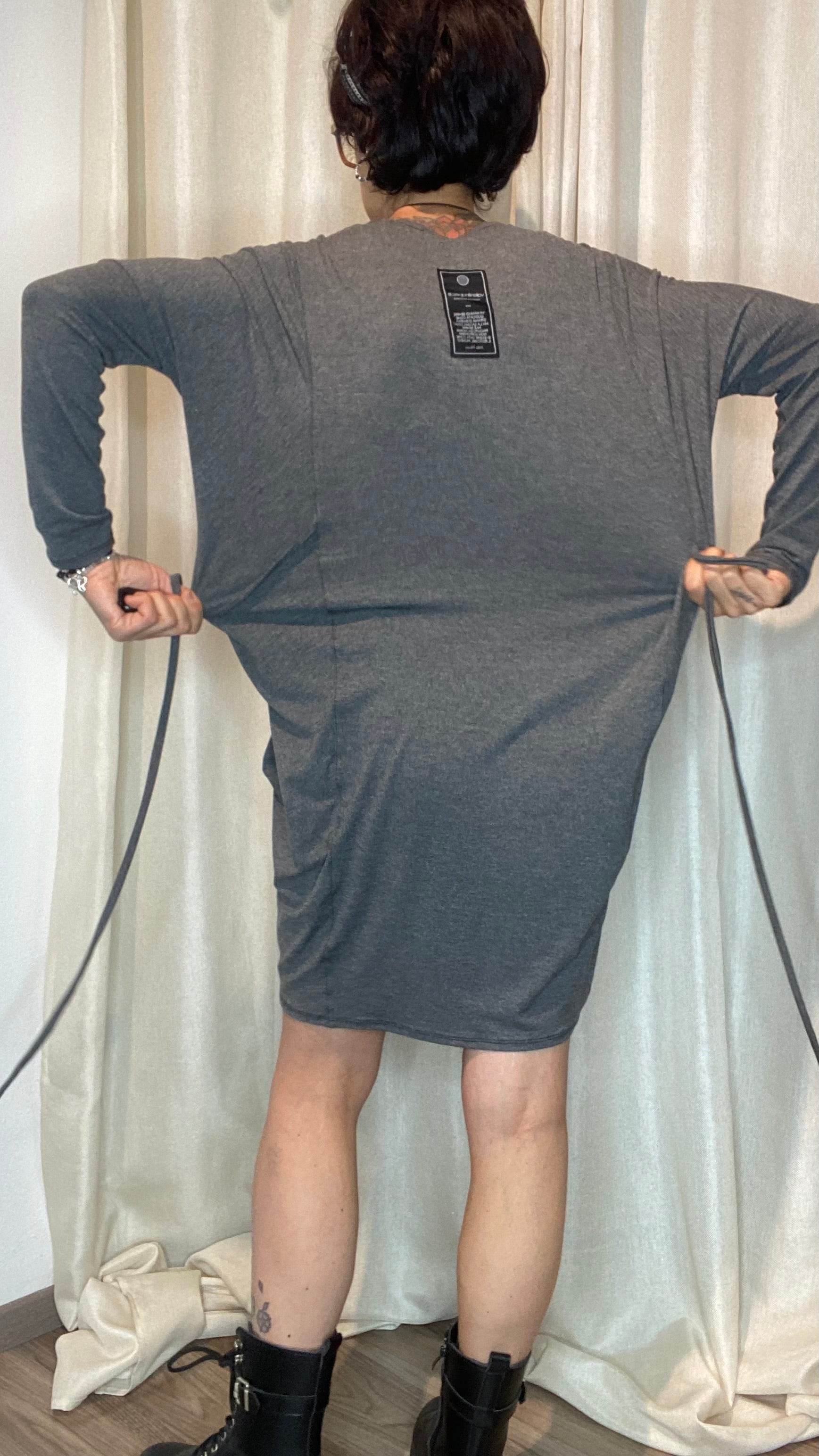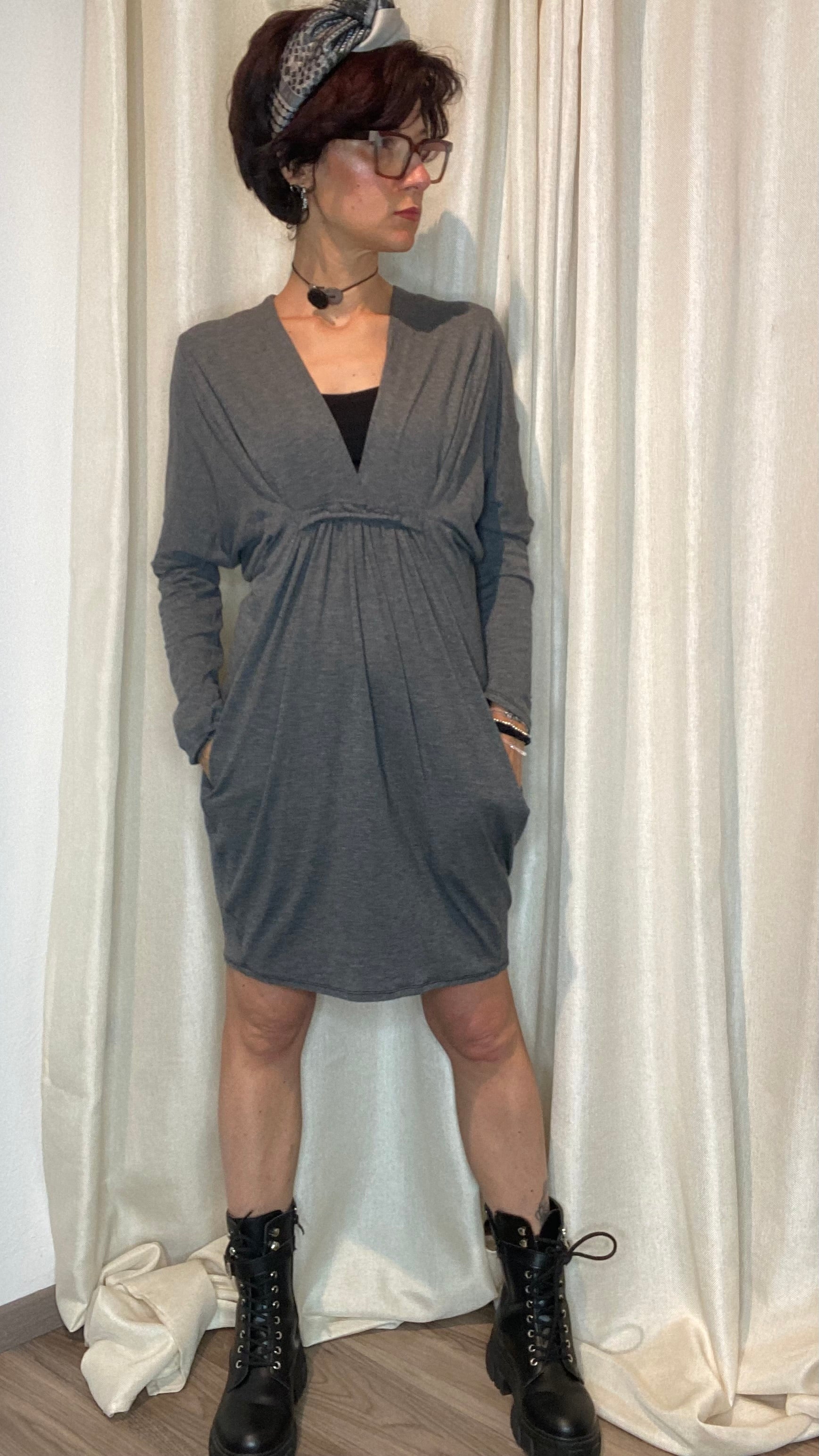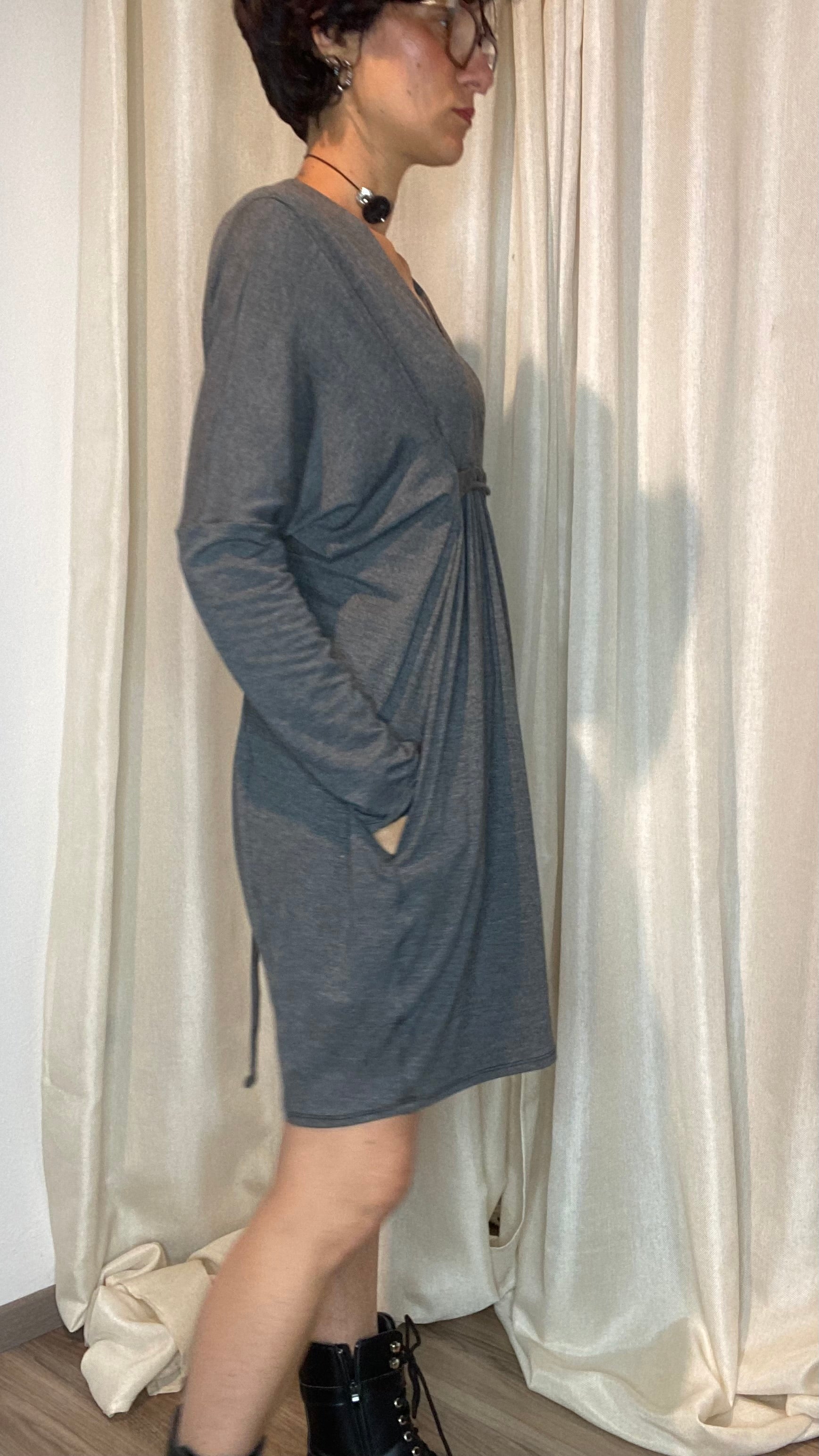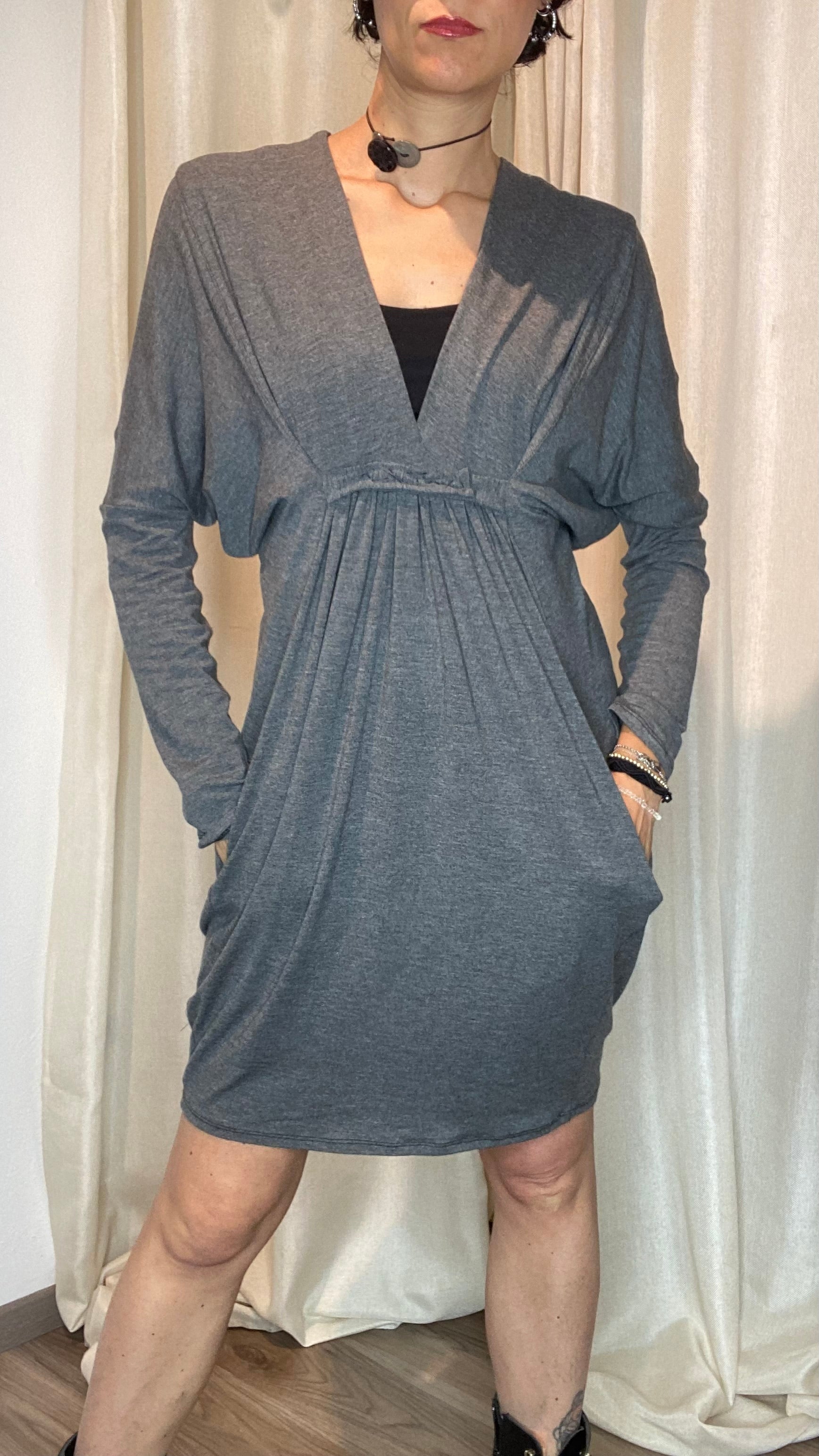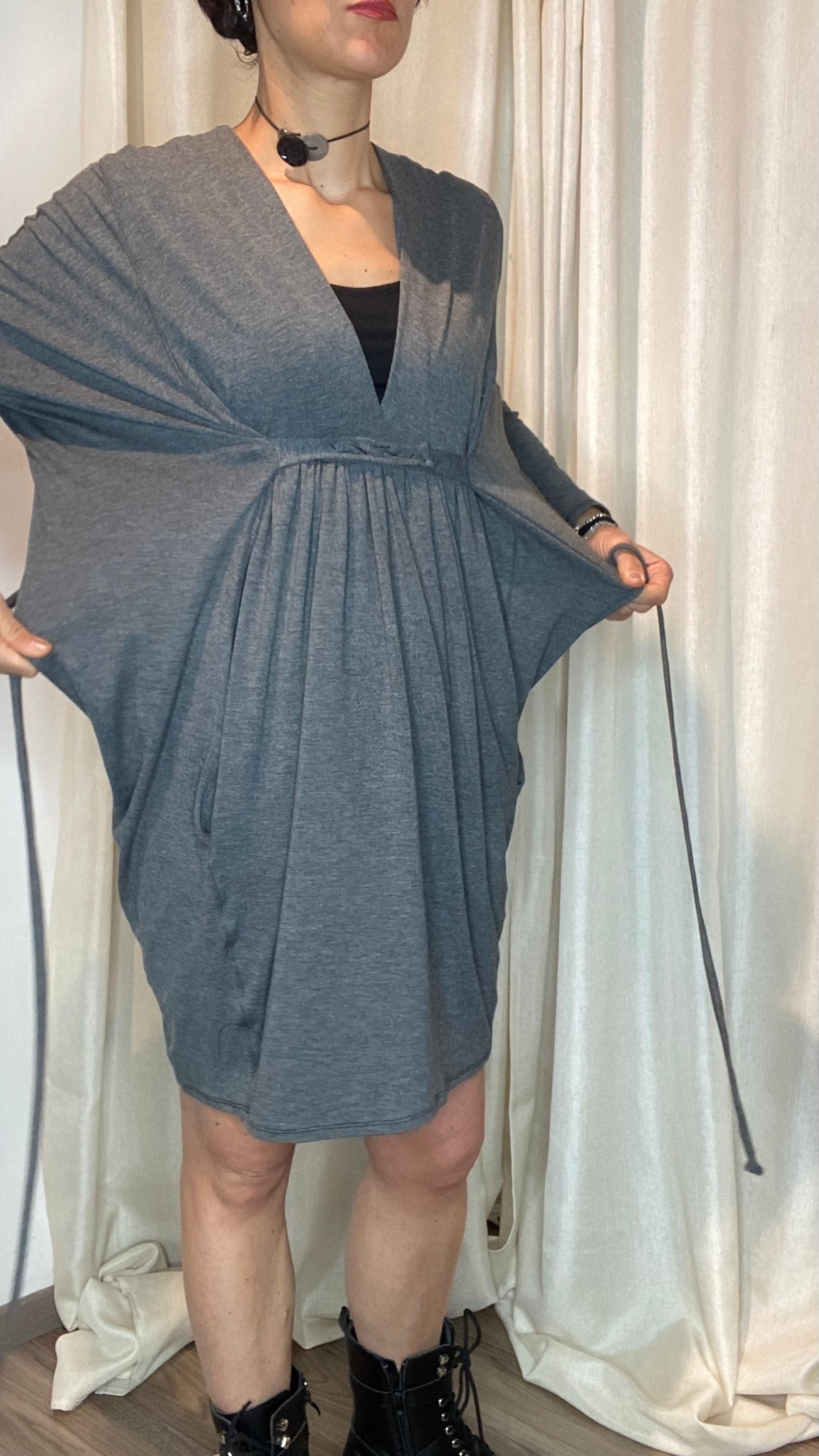 Abito in morbida maglia di cotone grigio mélange, con manica a pipistrello, tasche laterali e regolazione sul retro mediante laccetti. Taglia unica, veste dalla tg 38 alla tg 48.