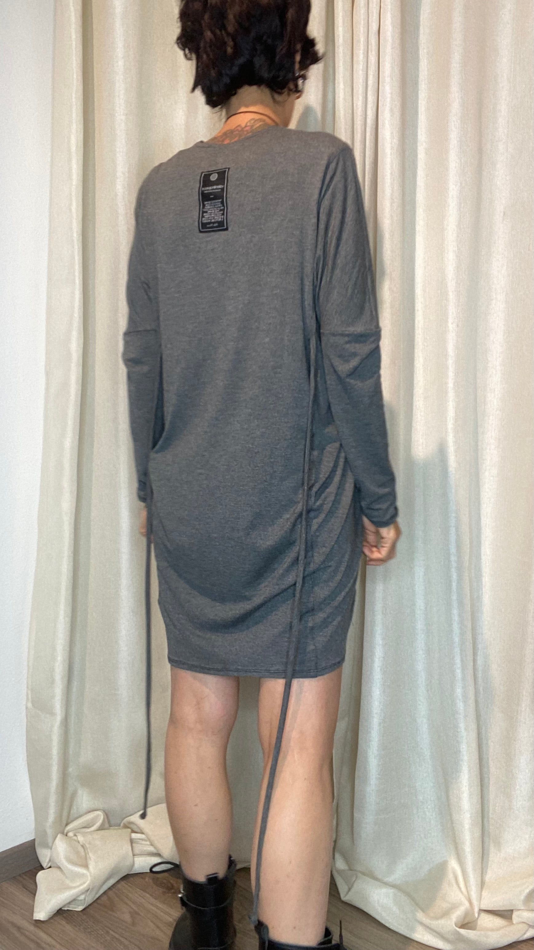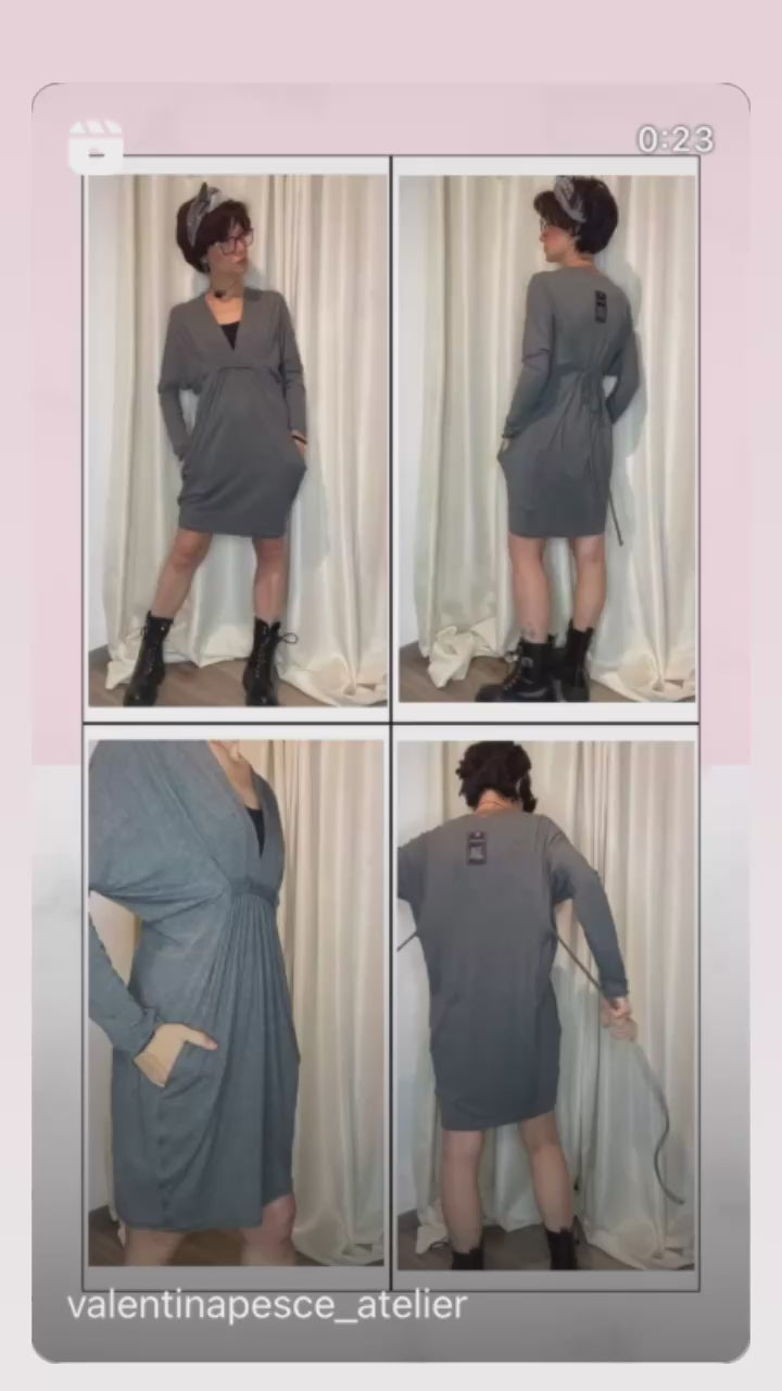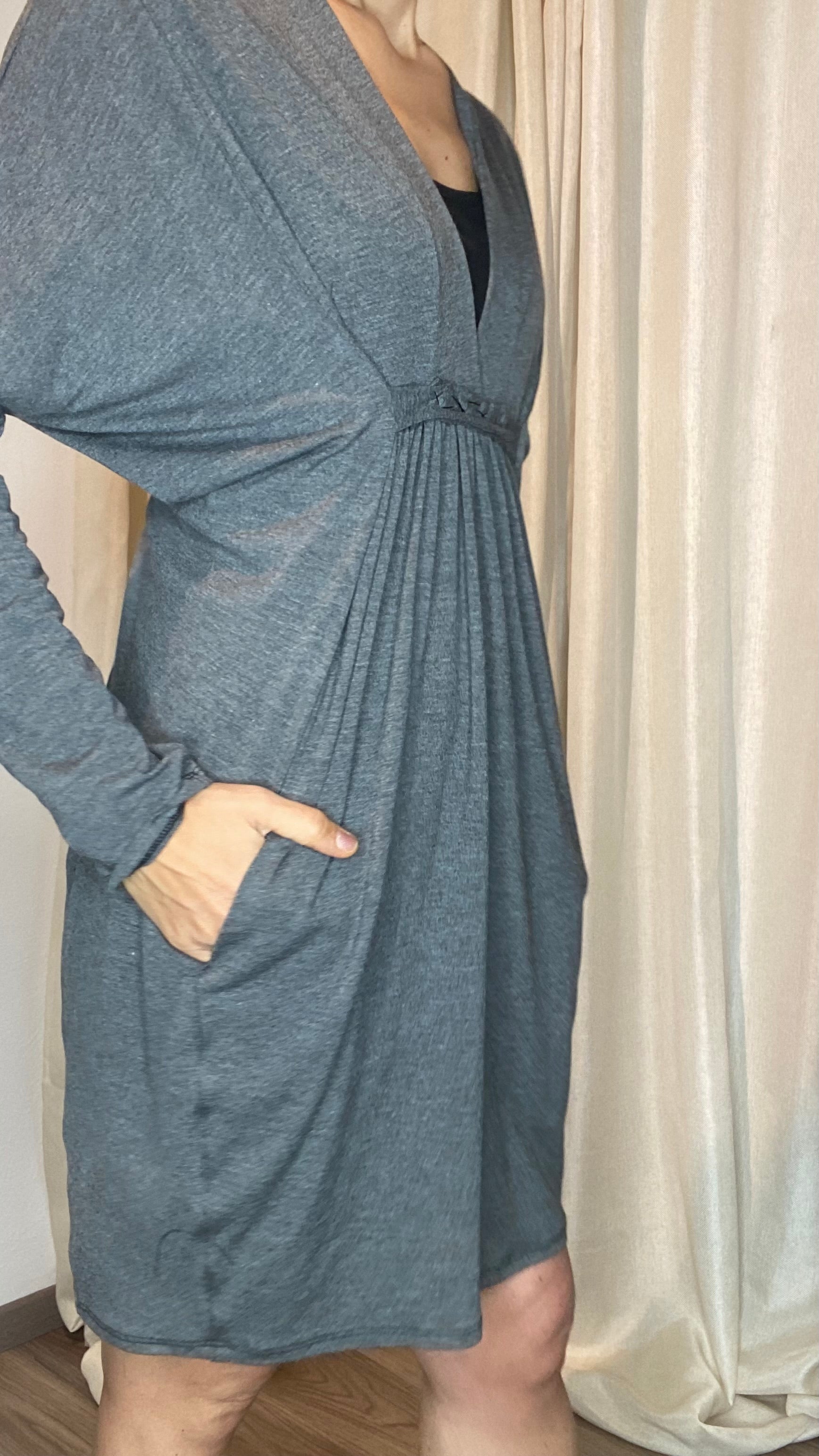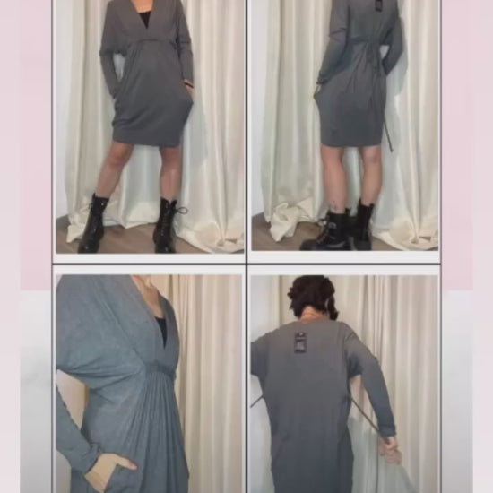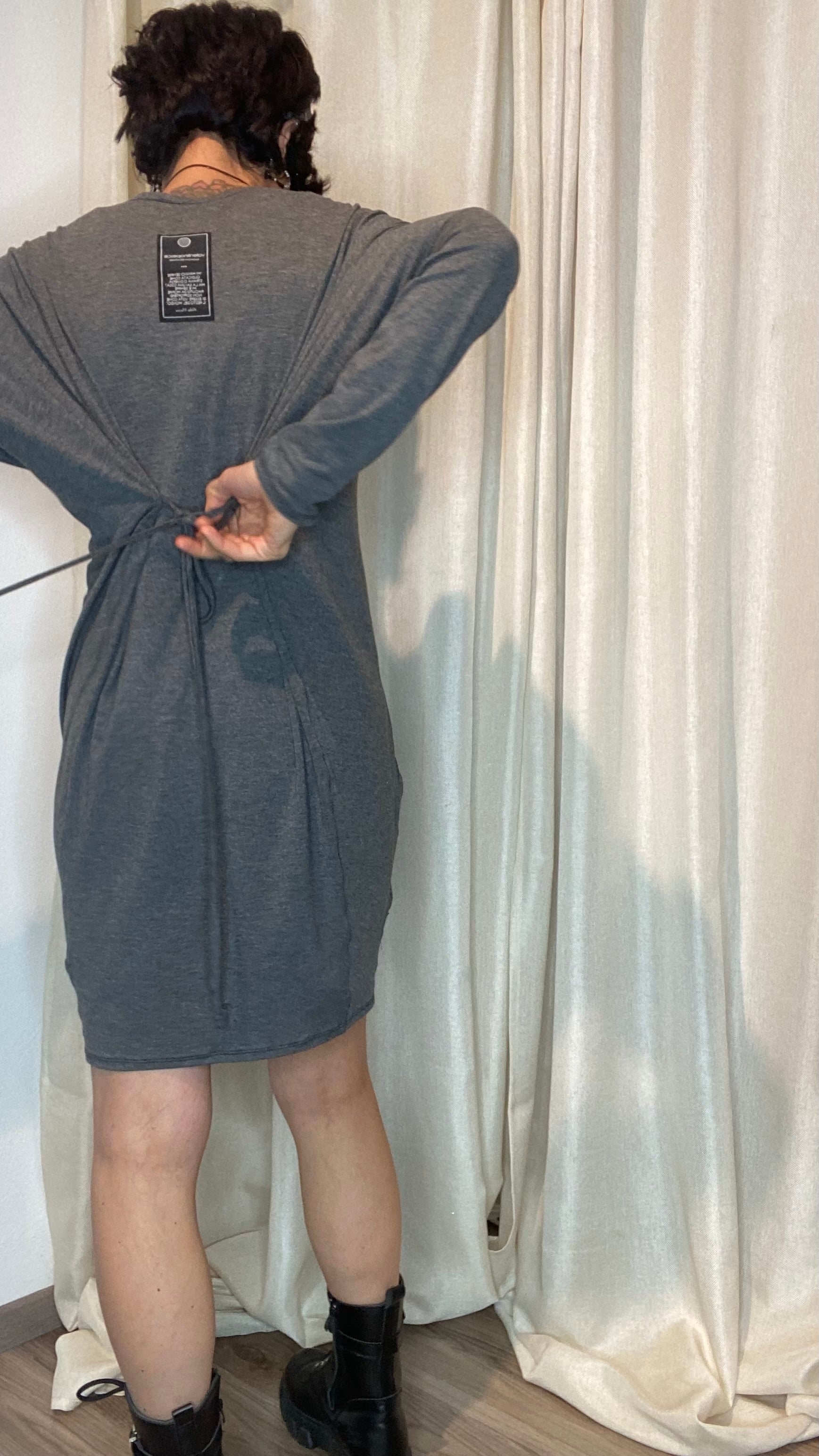 Abito in morbida maglia di cotone grigio mélange, con manica a pipistrello, tasche laterali e regolazione sul retro mediante laccetti. Taglia unica, veste dalla tg 38 alla tg 48.