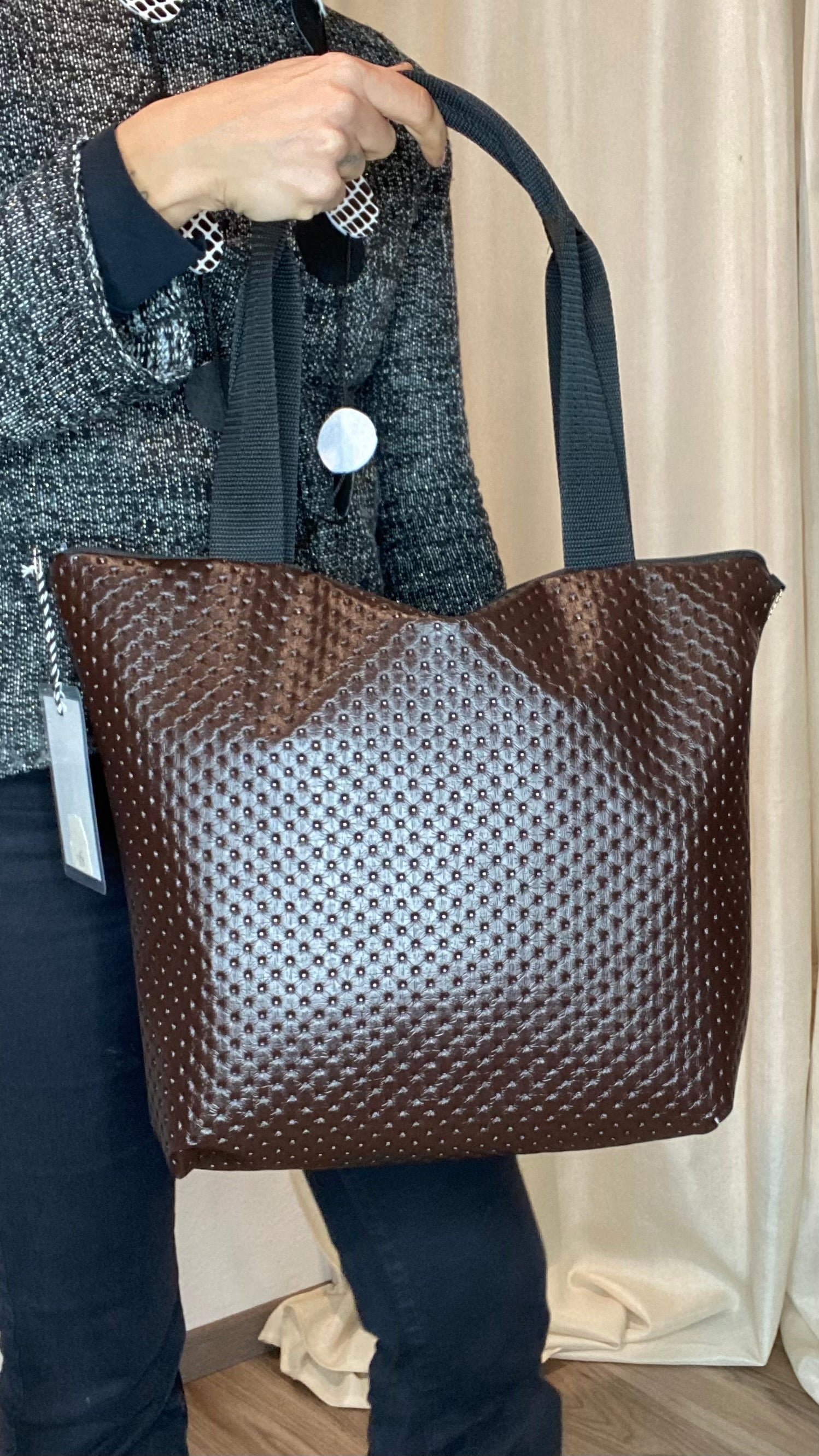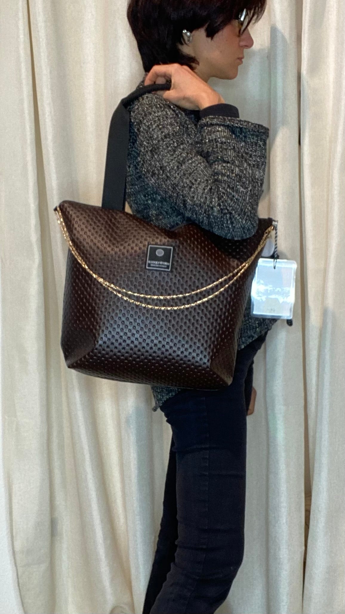 Borsa a manico in pelle vegetale color testa di moro a trama, con cinghia in catena color oro, cerniera esterna, foderata in cotone e con tasca interna.