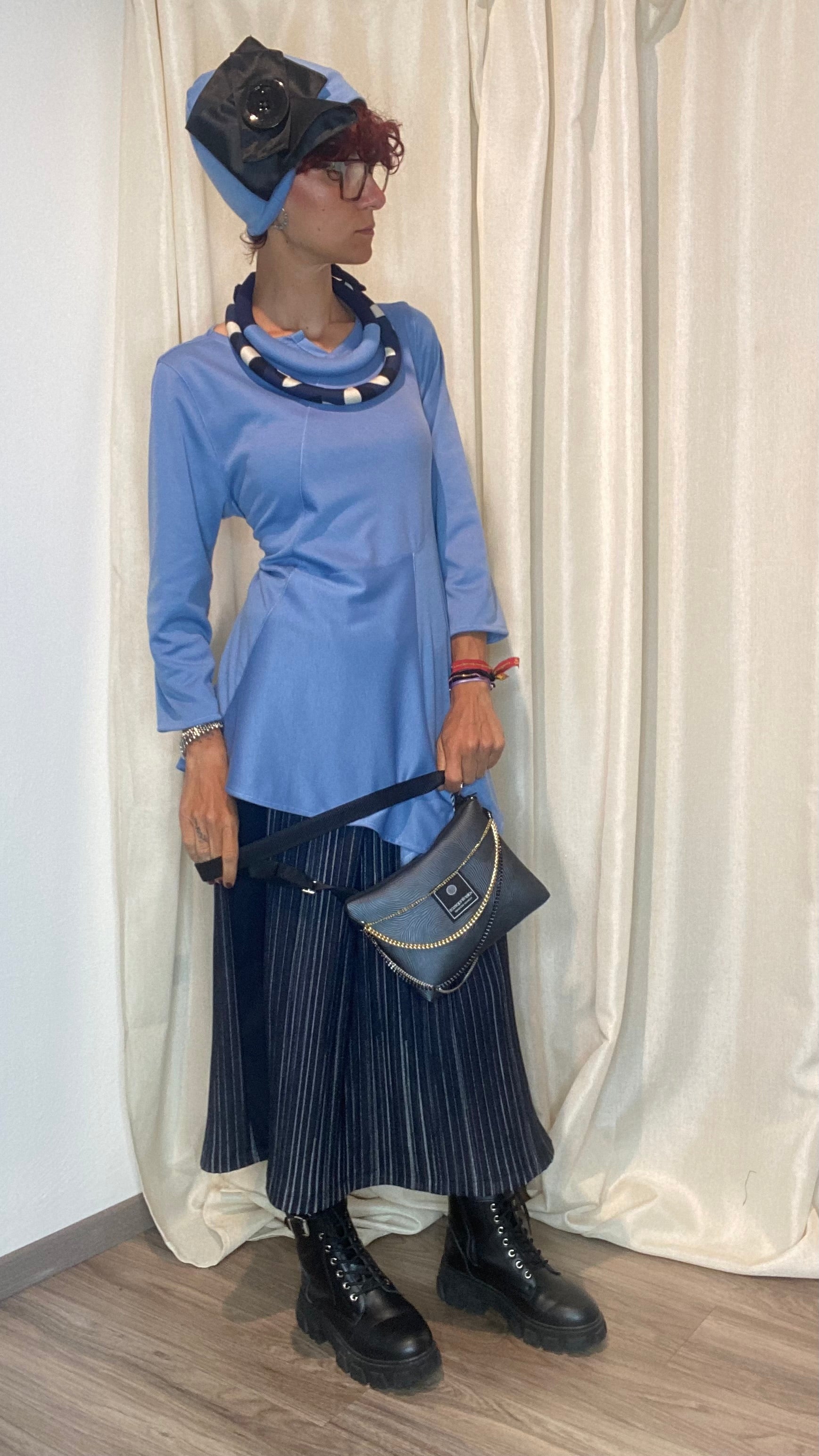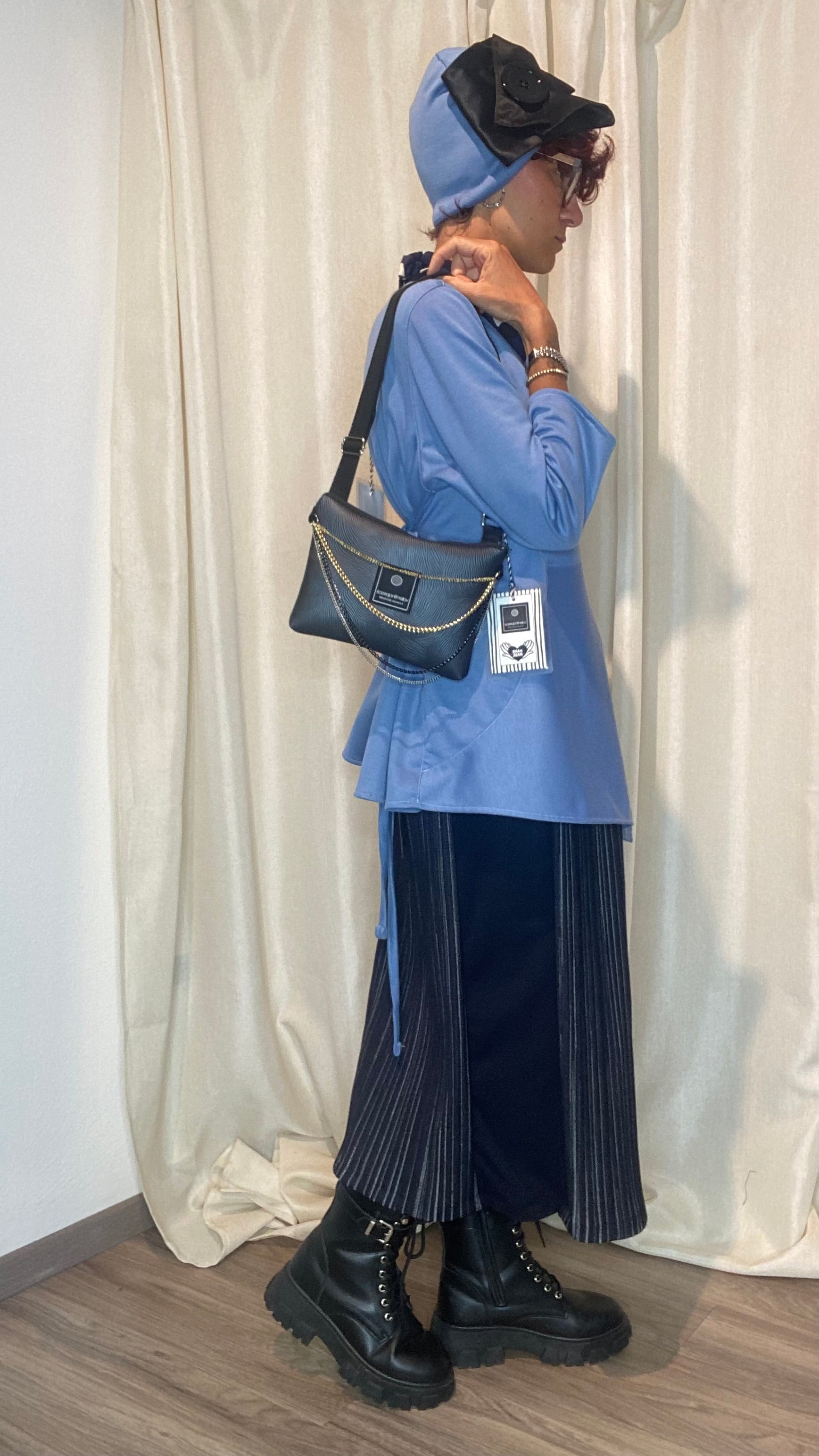 Borsa in pelle vegetale color grigio antracite a trama, con tracolla regolabile, catenine pendenti sul davanti, cerniera esterna, foderata in cotone e con tasca interna.