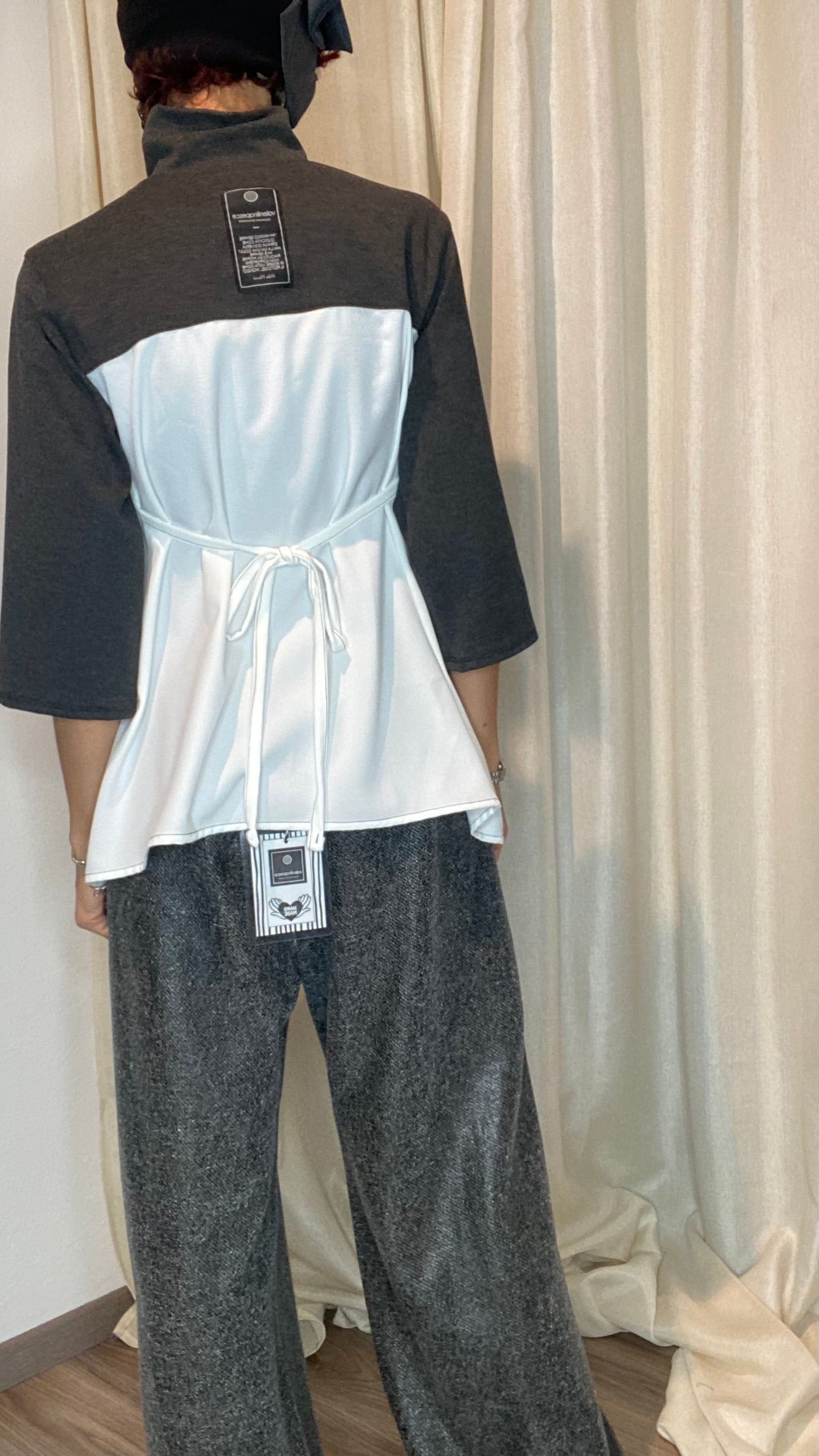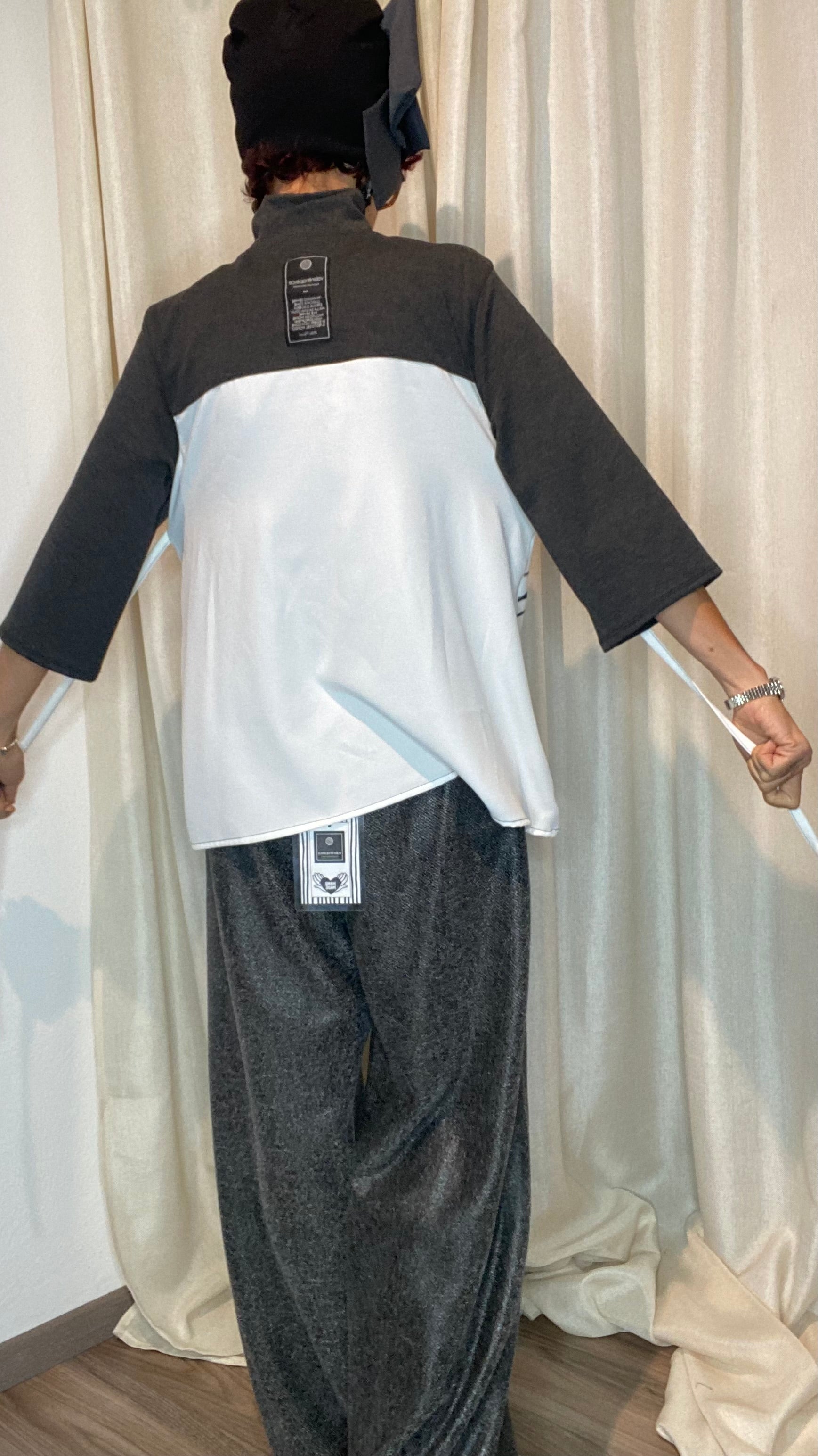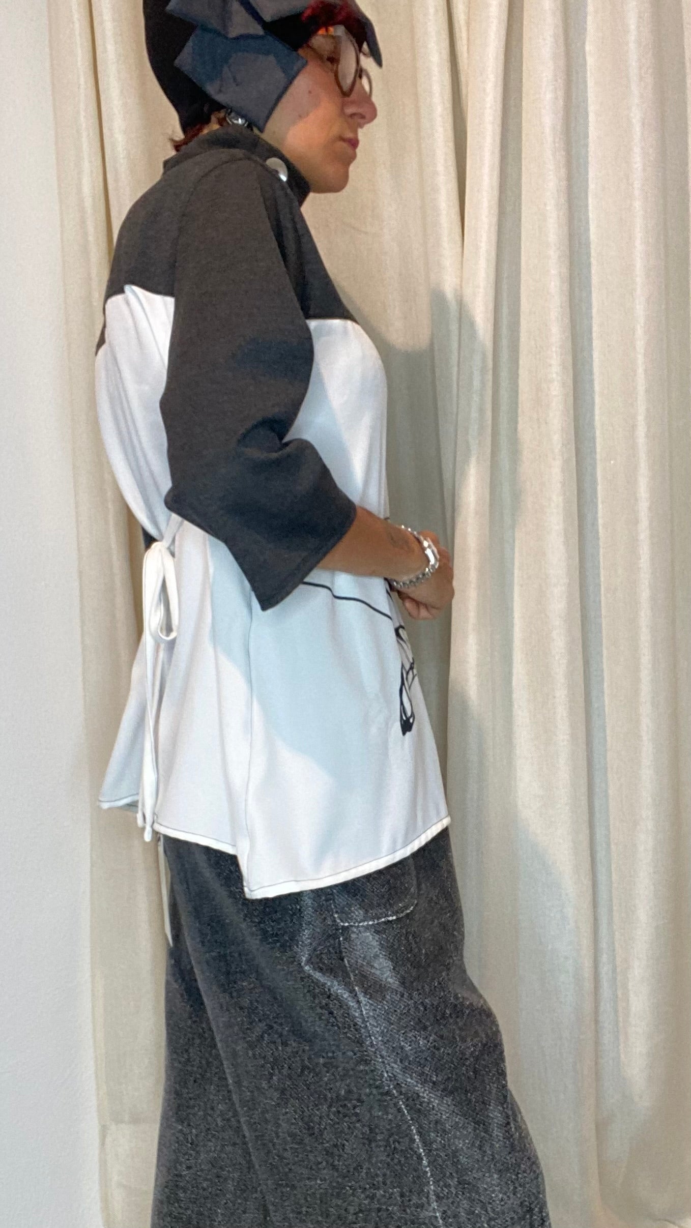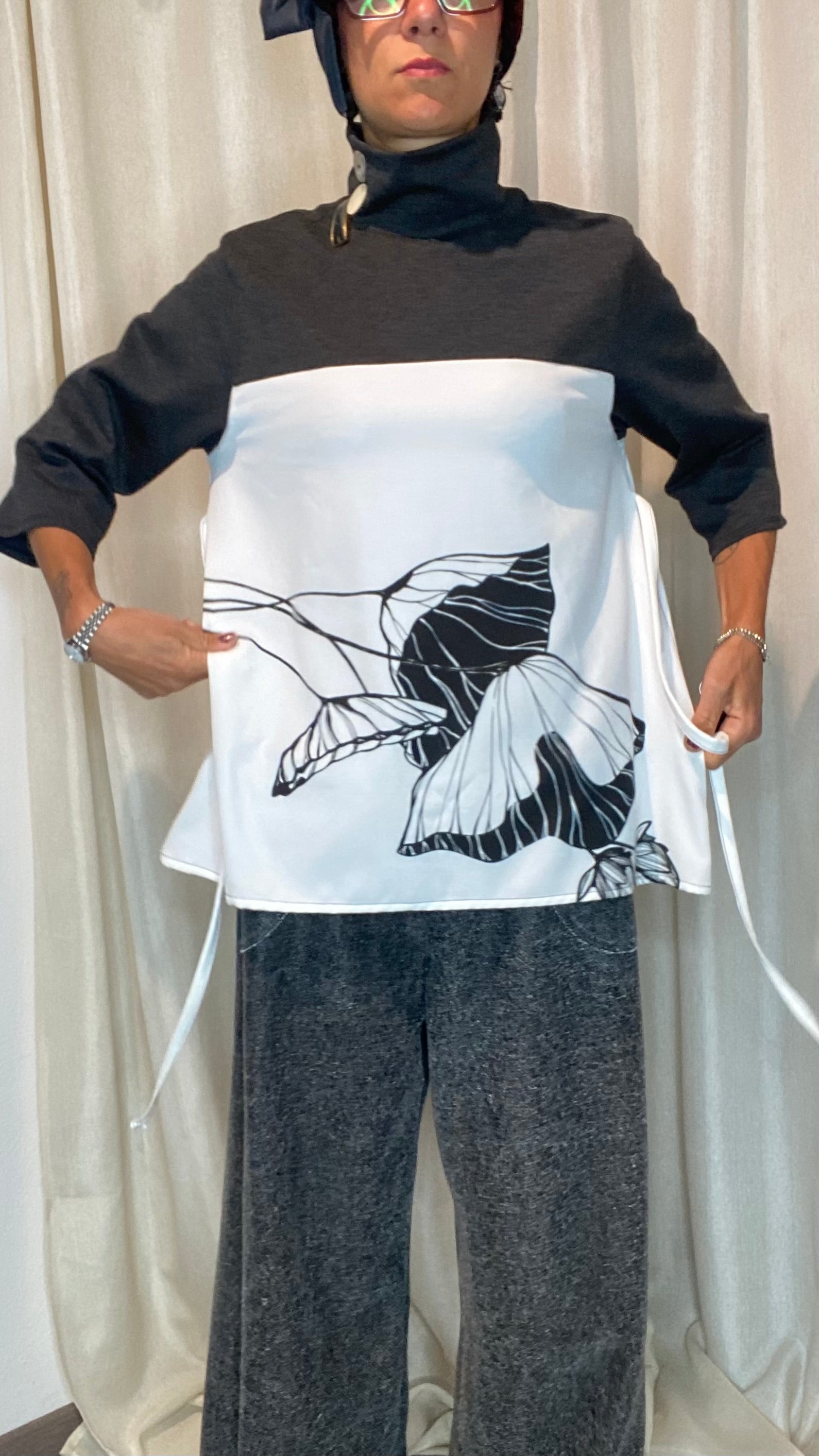 Casacca a manica lunga in maglia punto Milano con parte centrale in georgette stampata, collo alto, bottoni applicati e regolazione in vita mediante laccetti. Taglia unica, veste dalla tg 38 alla tg 50.
