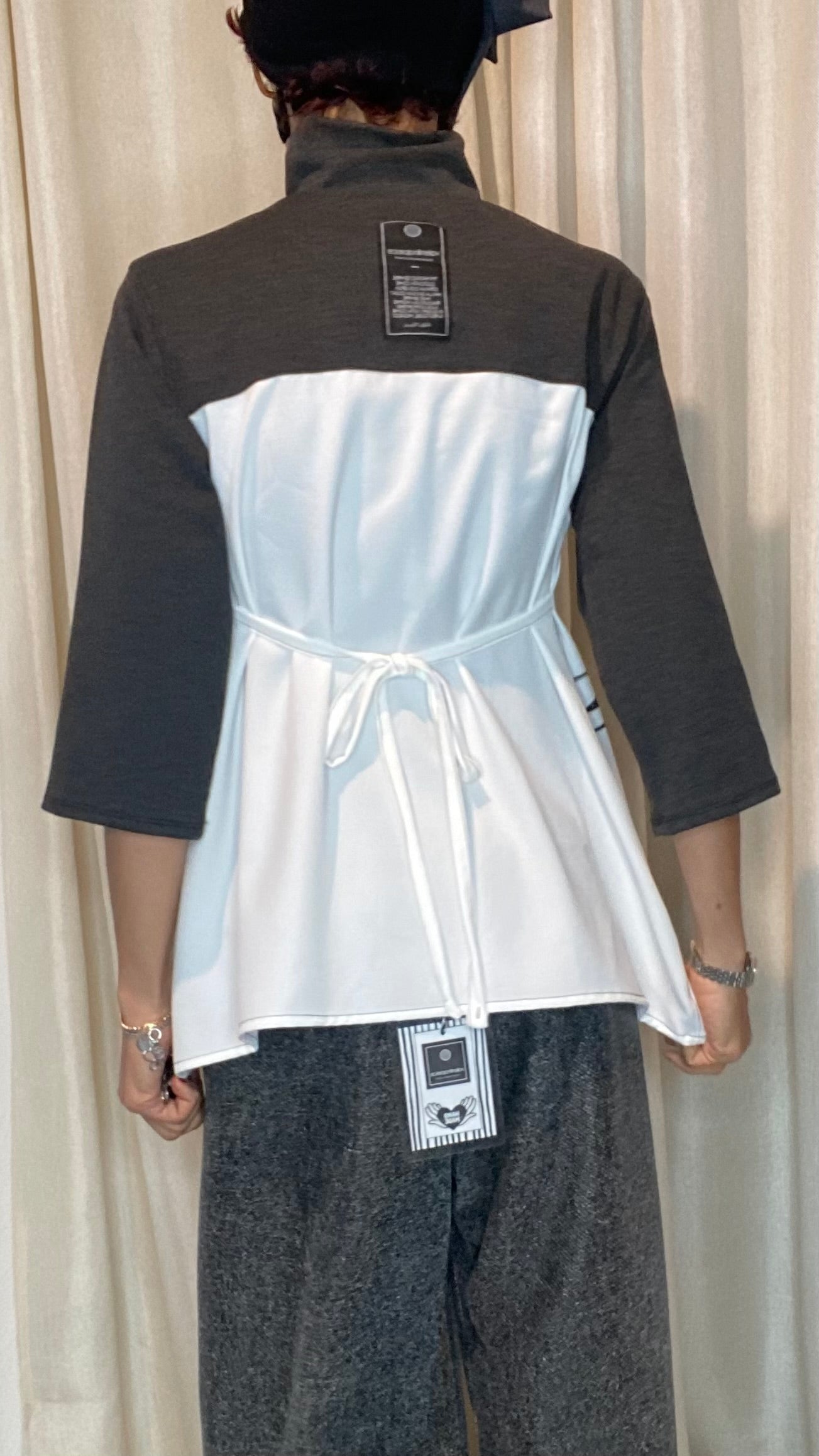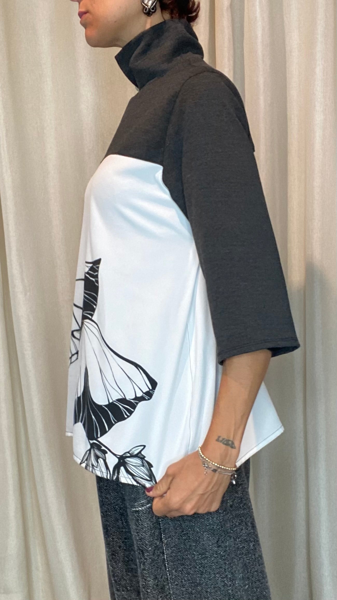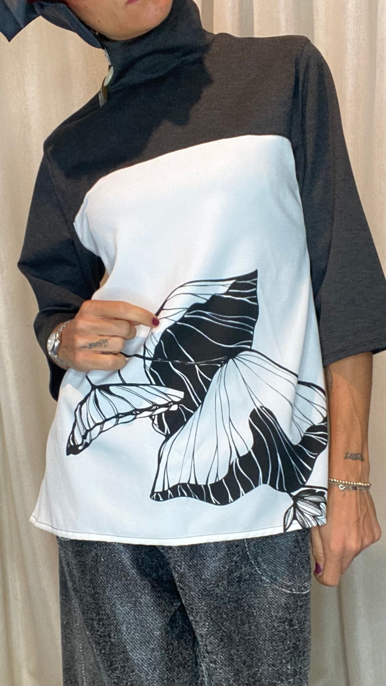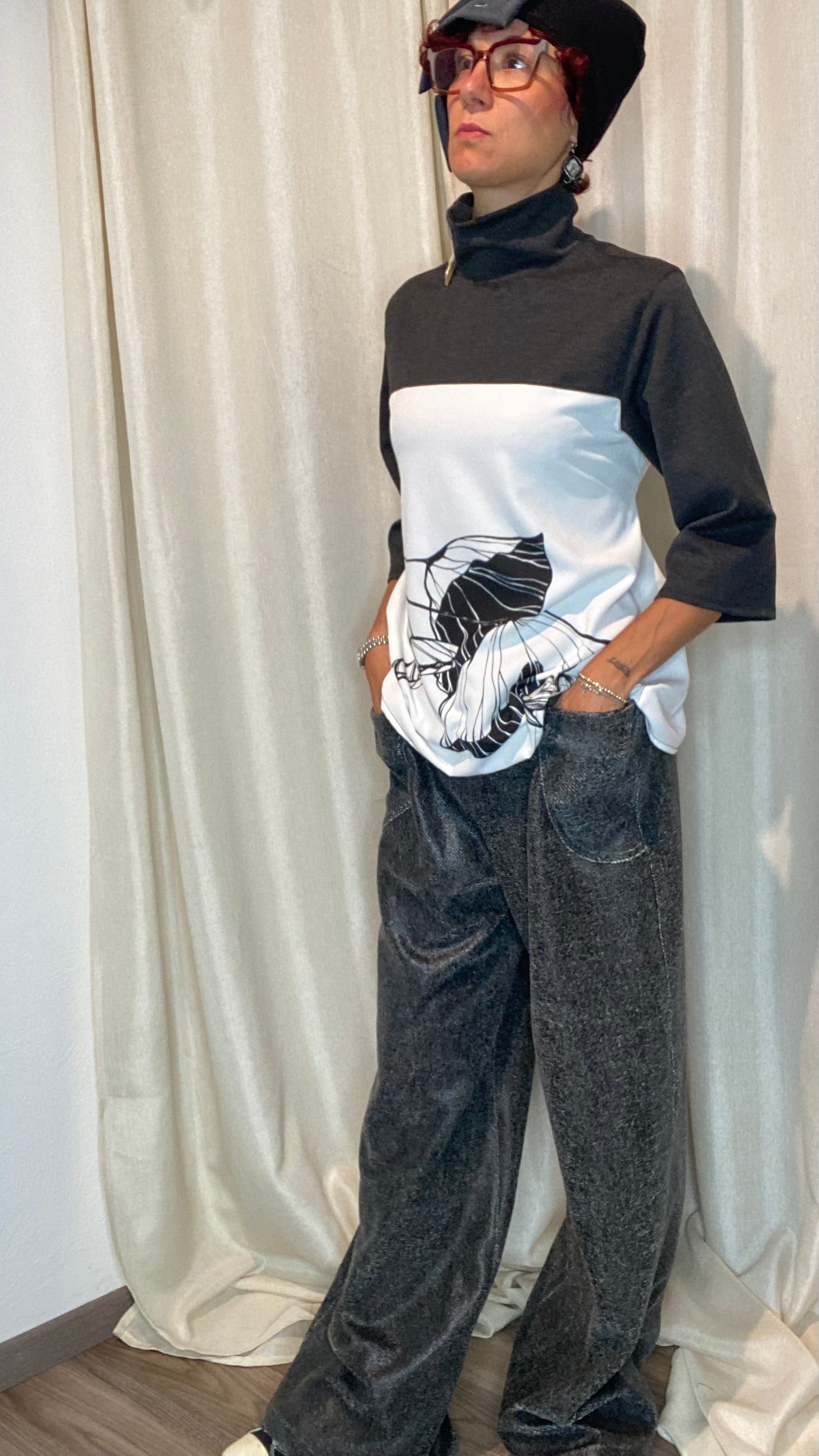 Casacca a manica lunga in maglia punto Milano con parte centrale in georgette stampata, collo alto, bottoni applicati e regolazione in vita mediante laccetti. Taglia unica, veste dalla tg 38 alla tg 50.