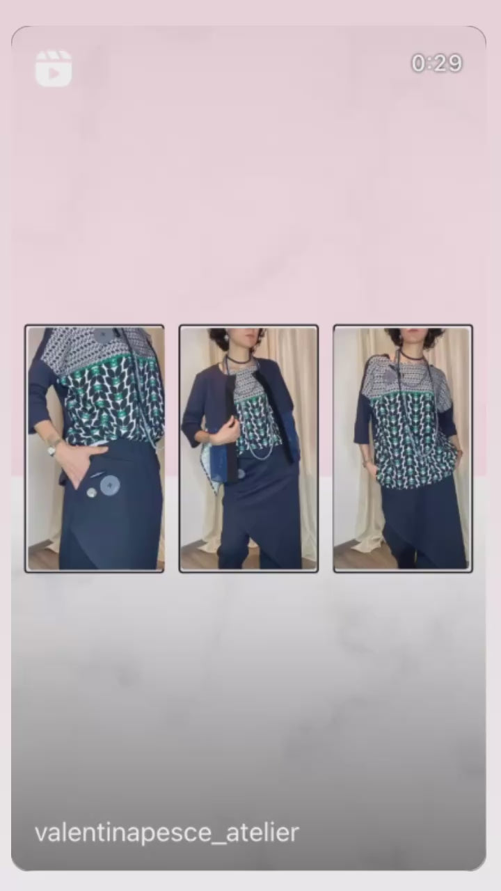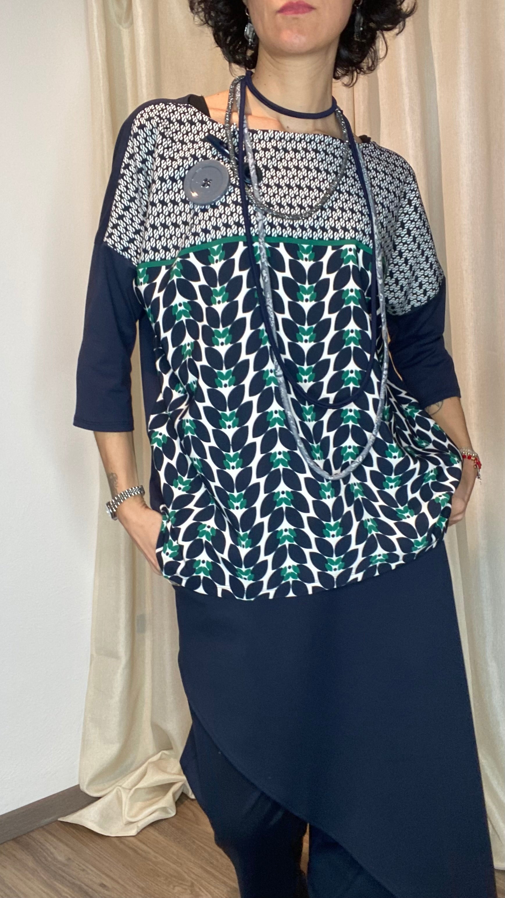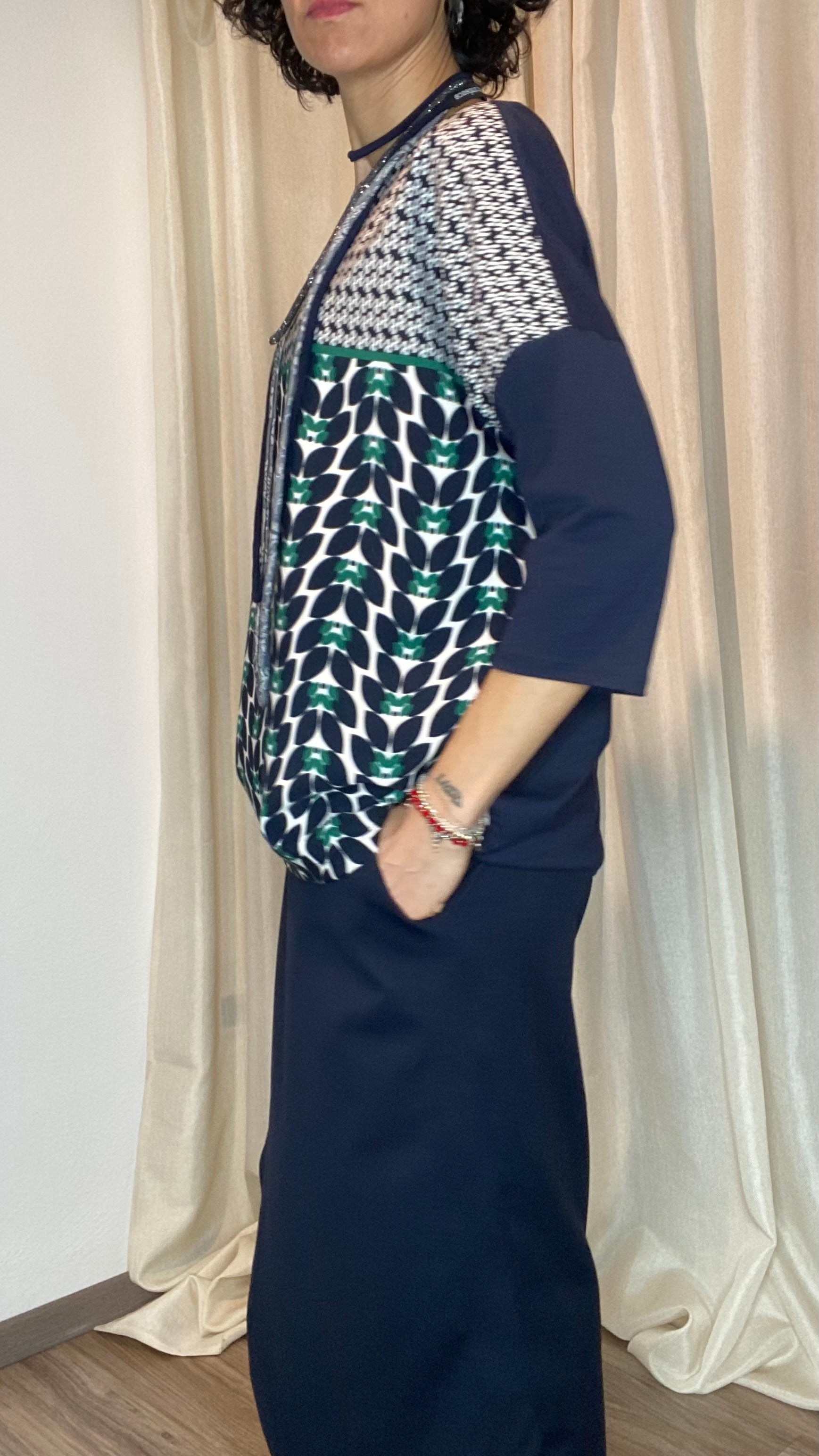 Casacca asimmetrica con retro e maniche in morbida maglina di cotone, bottoni applicati e pannello davanti in cotone misto fantasia. Taglia unica, veste dalla tg 38 alla 50.