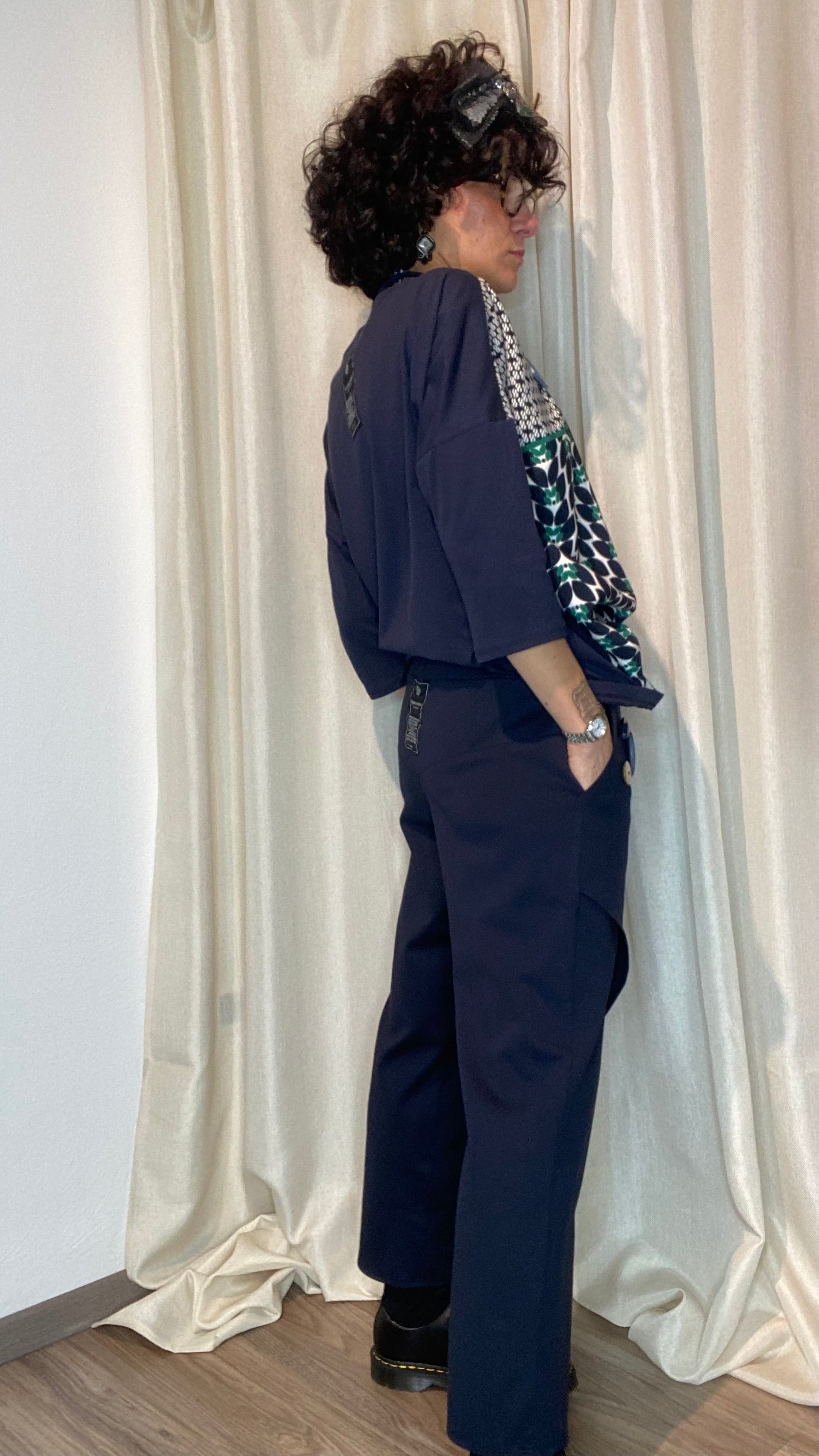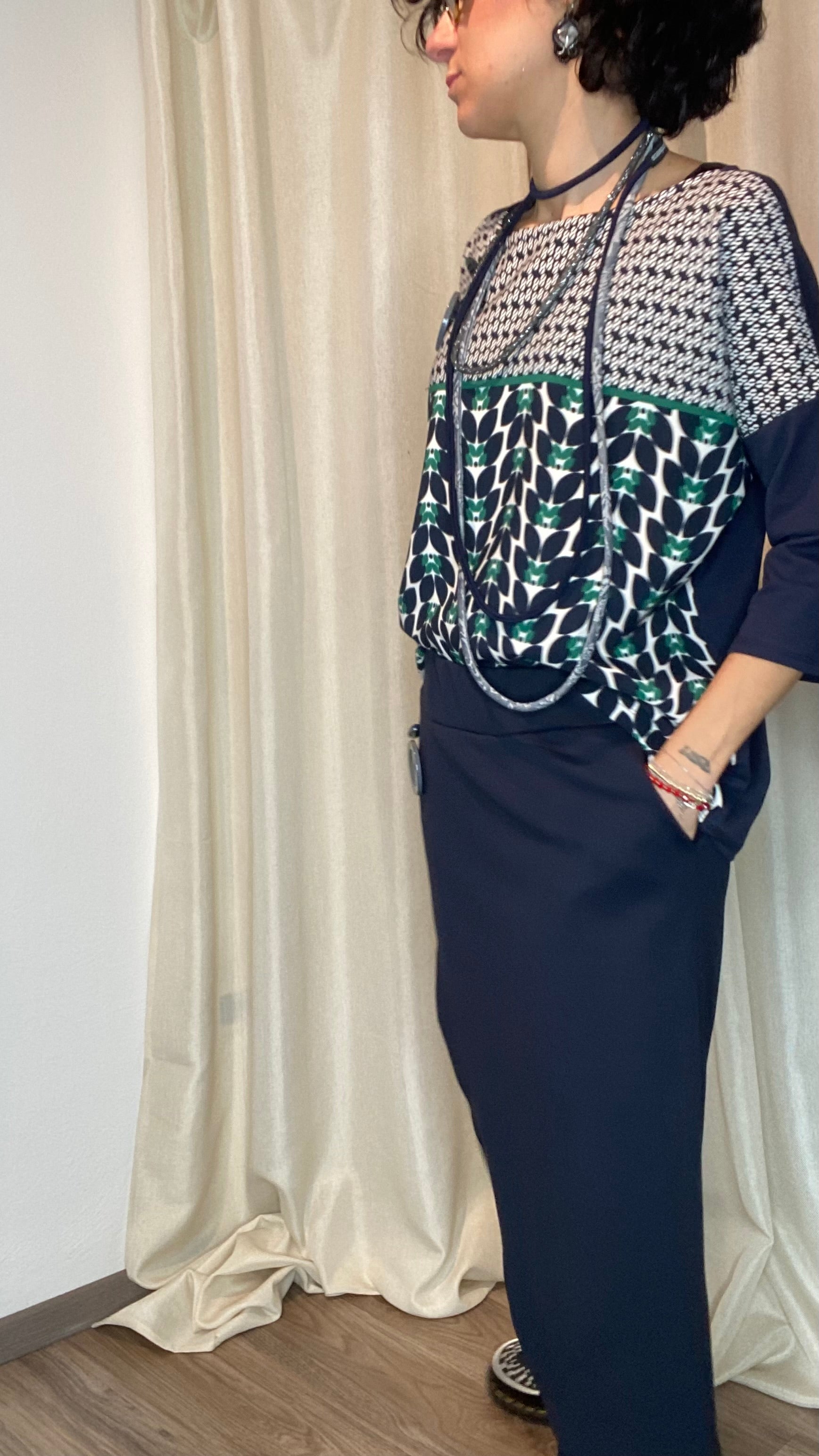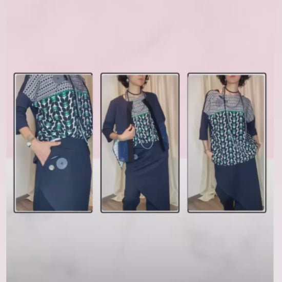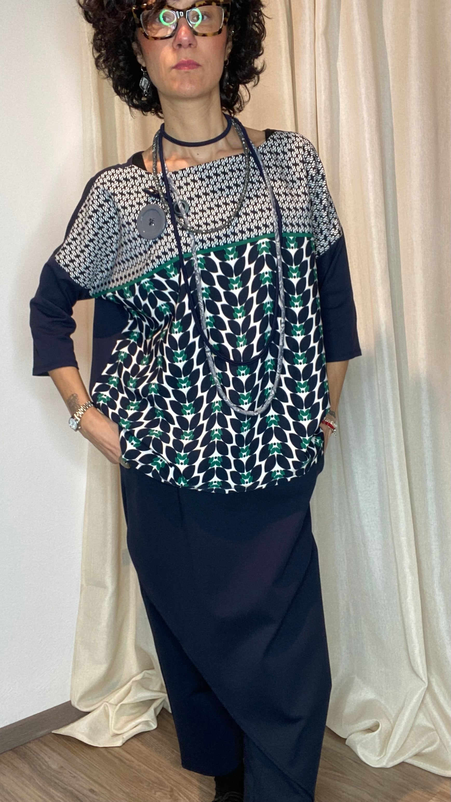 Casacca asimmetrica con retro e maniche in morbida maglina di cotone, bottoni applicati e pannello davanti in cotone misto fantasia. Taglia unica, veste dalla tg 38 alla 50.