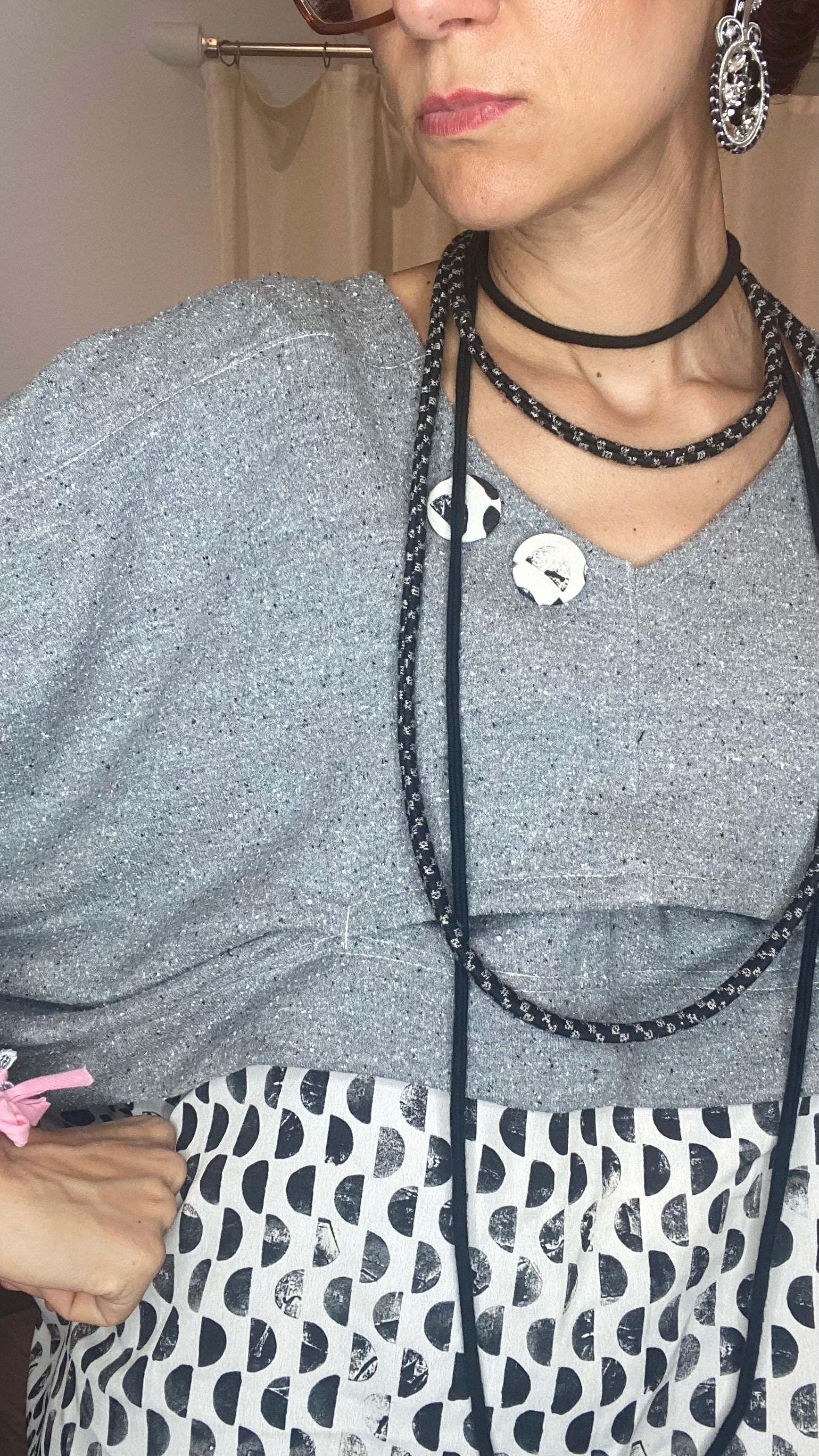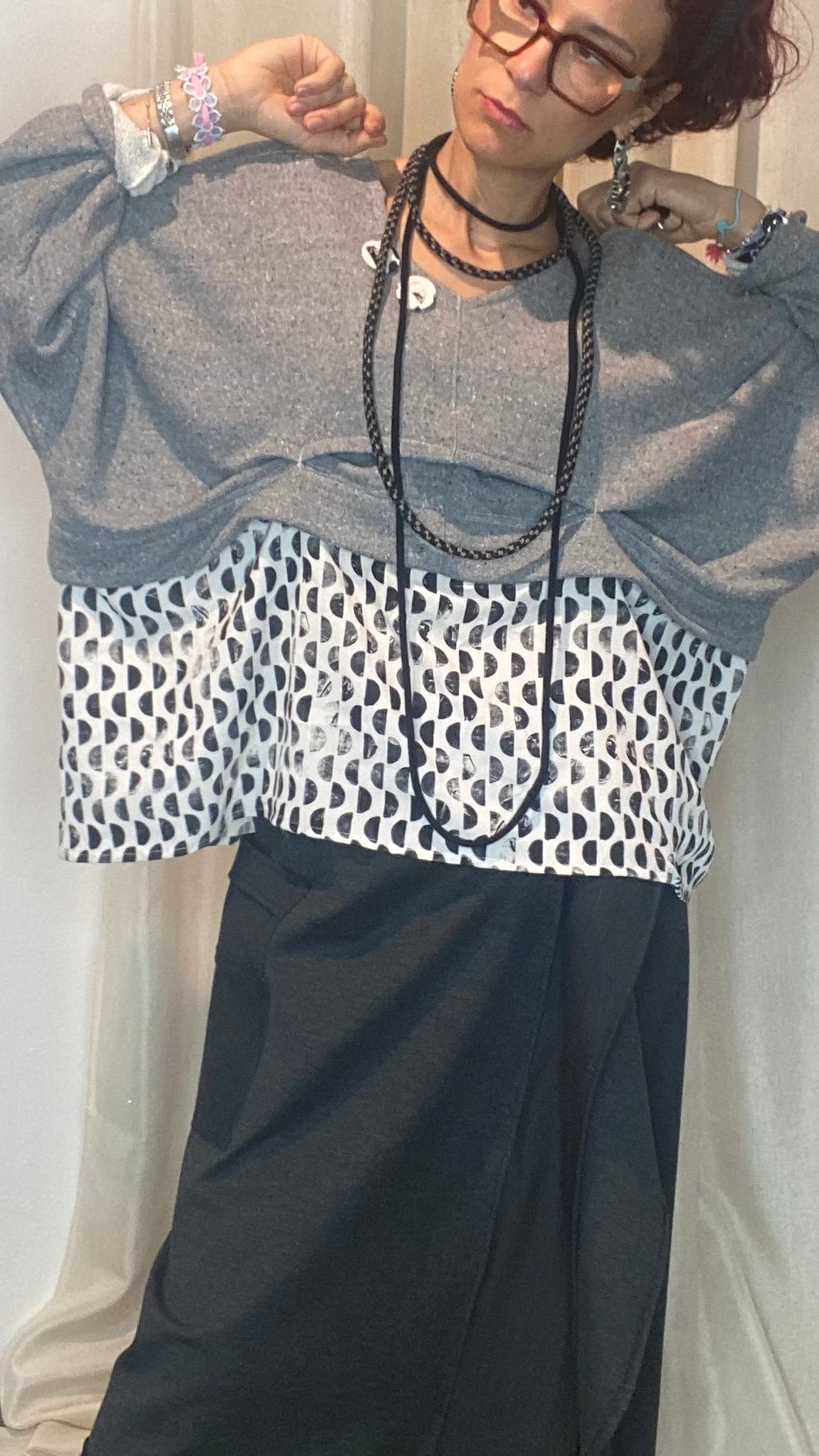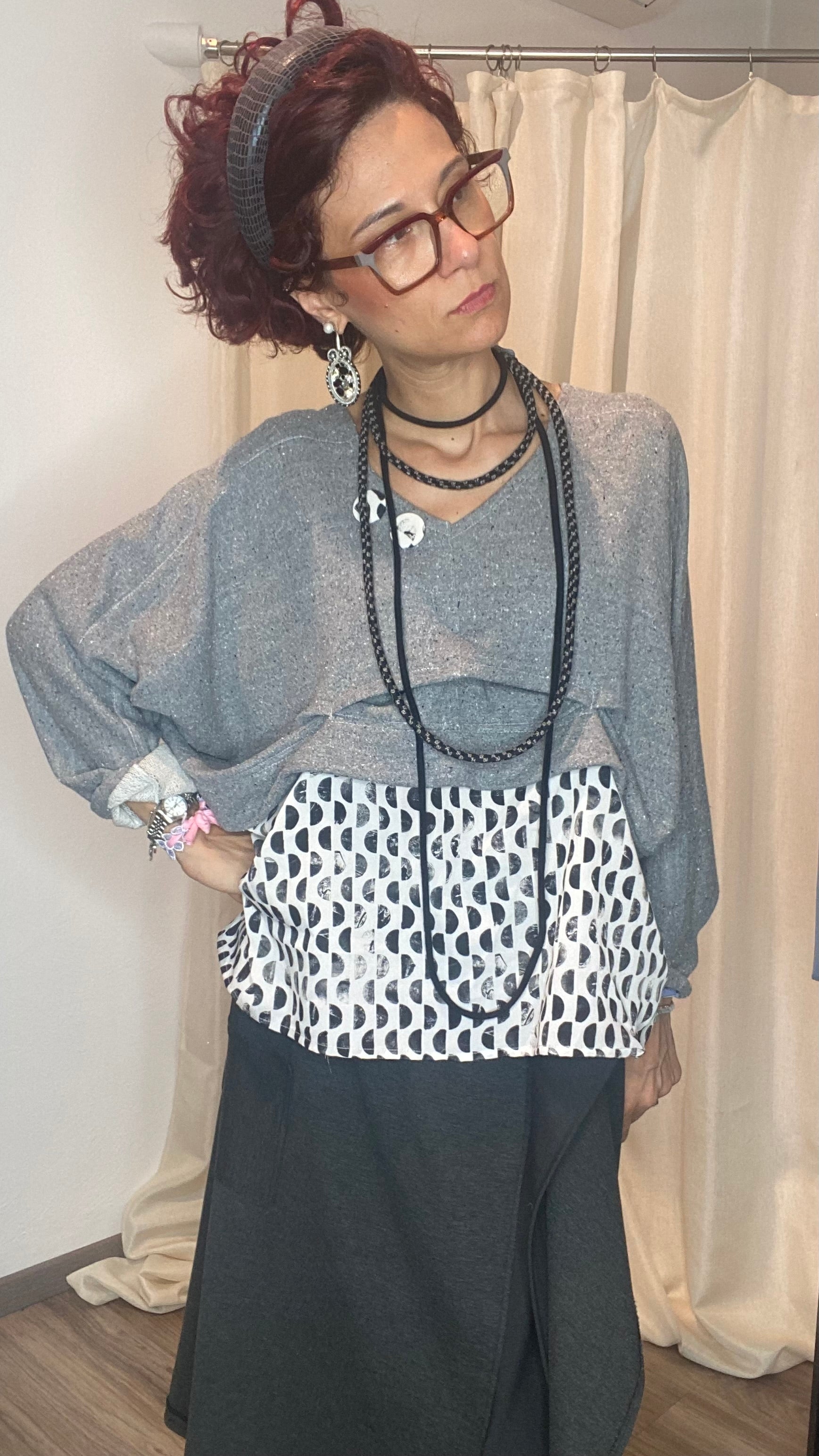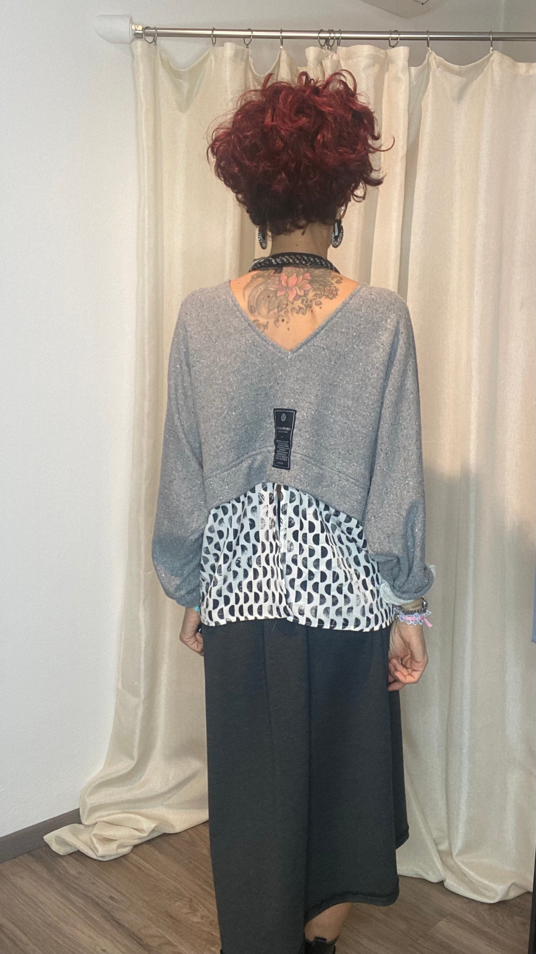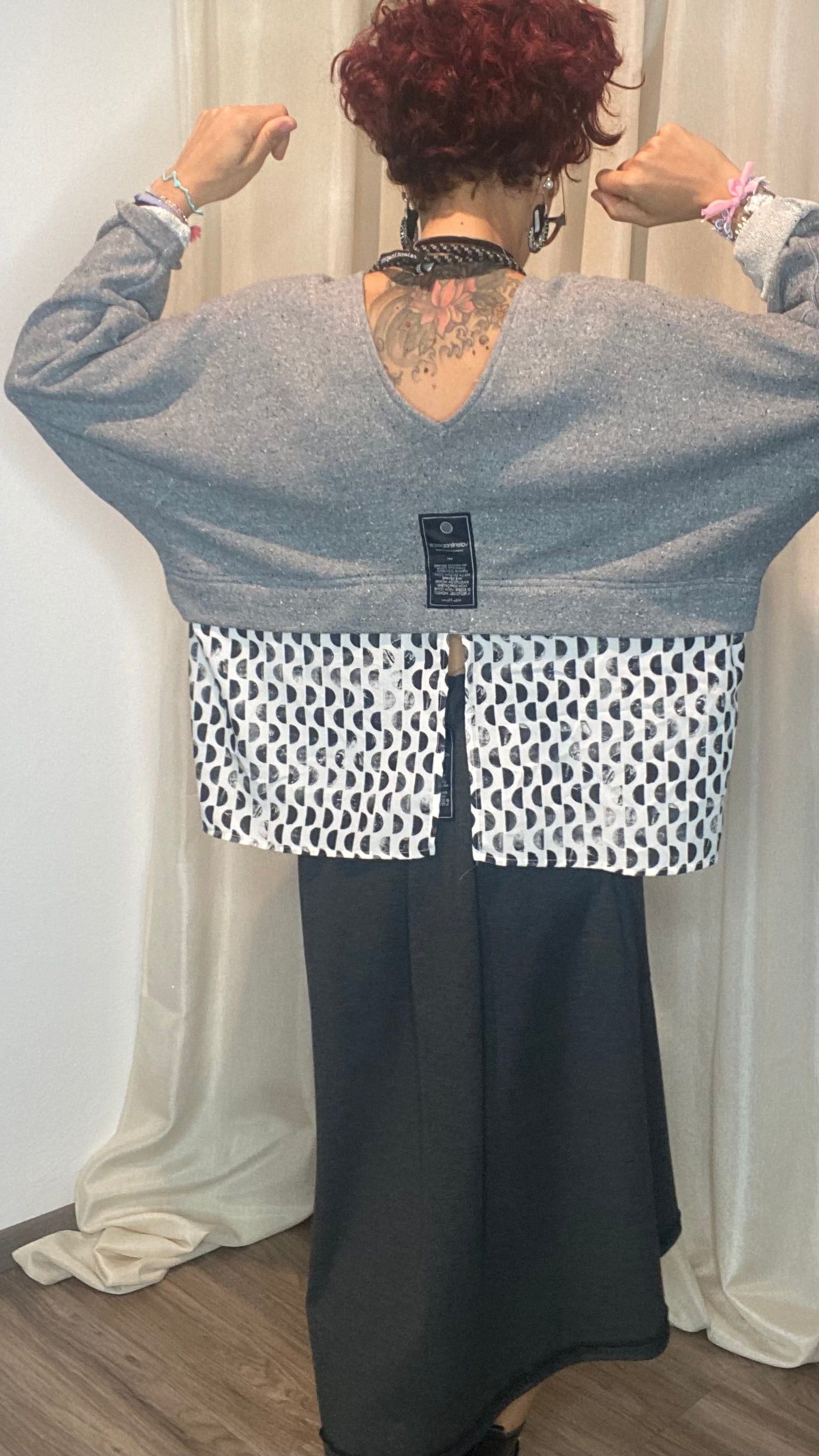 Felpa a manica lunga in cotone con inserto fantasia, bottoni foderati e spacco centrale sul dietro. Taglia unica, veste dalla tg 38 alla tg 50.