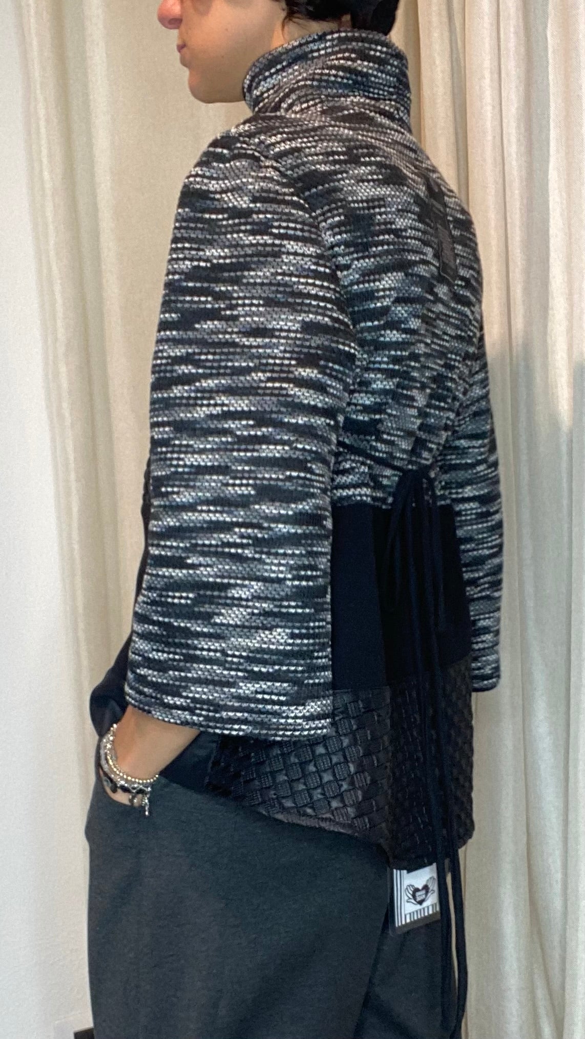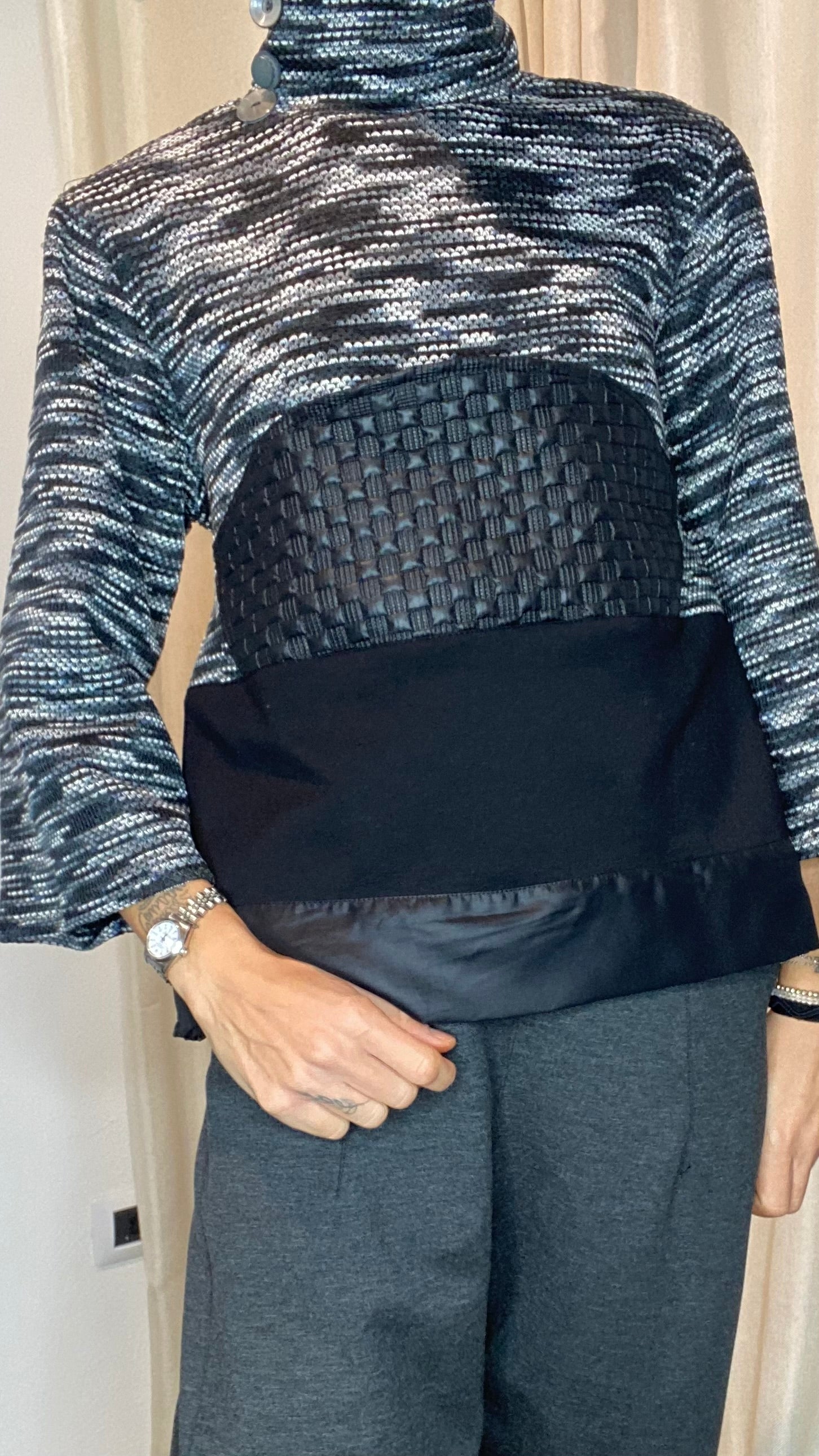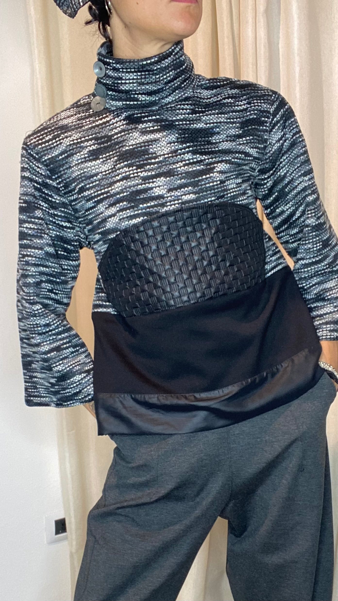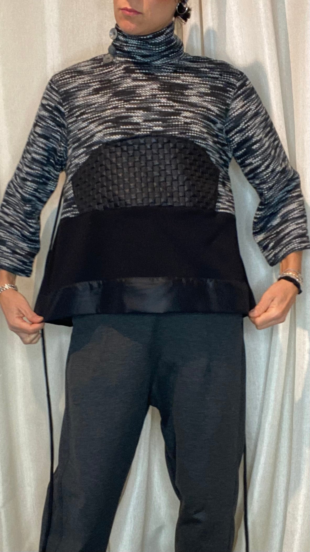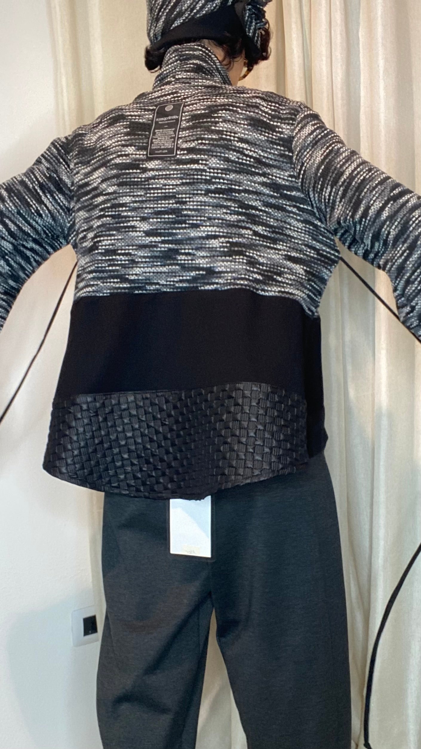 Casacca asimmetrica morbidissima a collo alto, in maglina, tasca centrale e bottoni applicati, si regola in vita mediante laccetti. Taglia unica, veste dalla tg 38 alla tg 50.