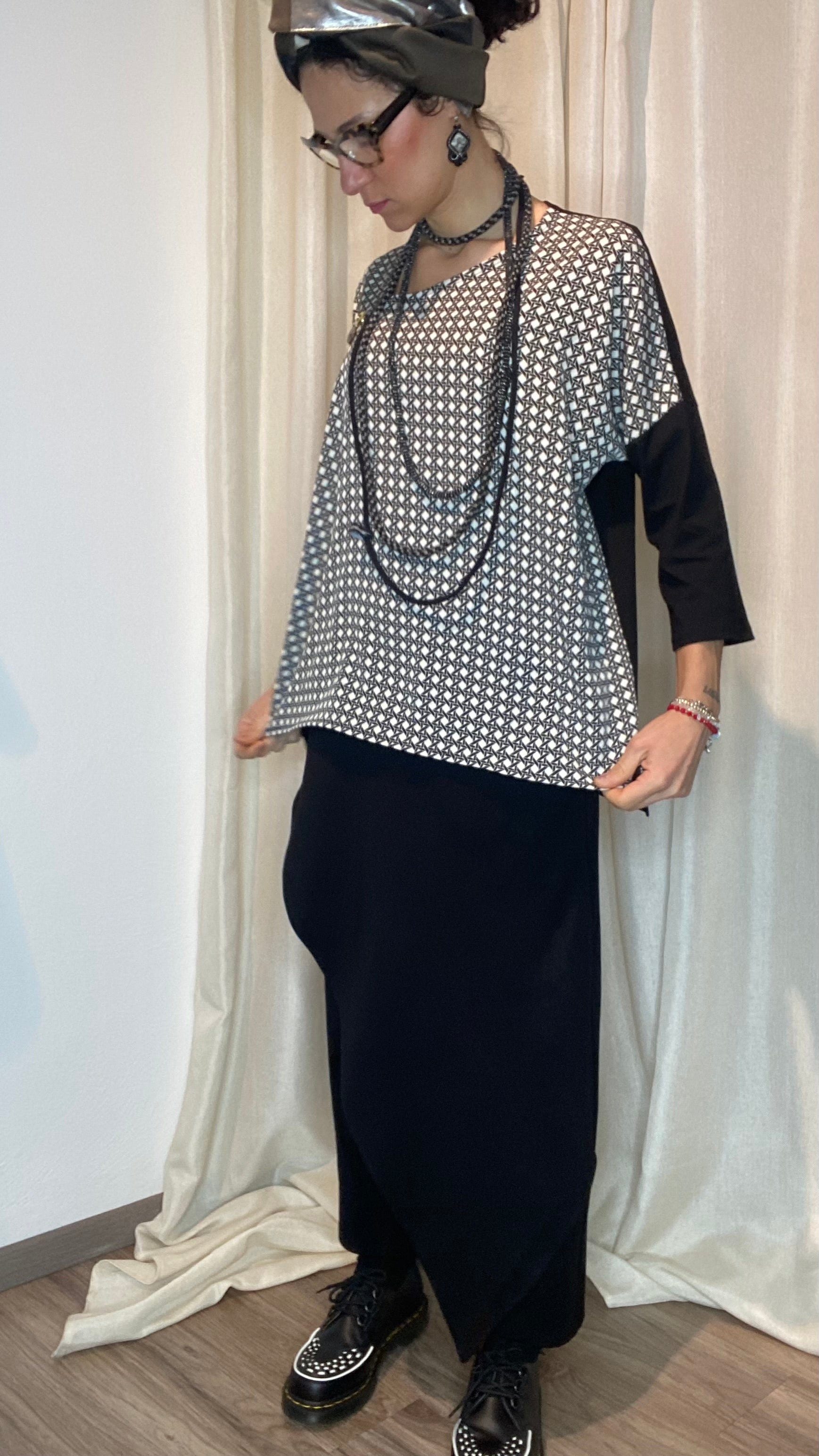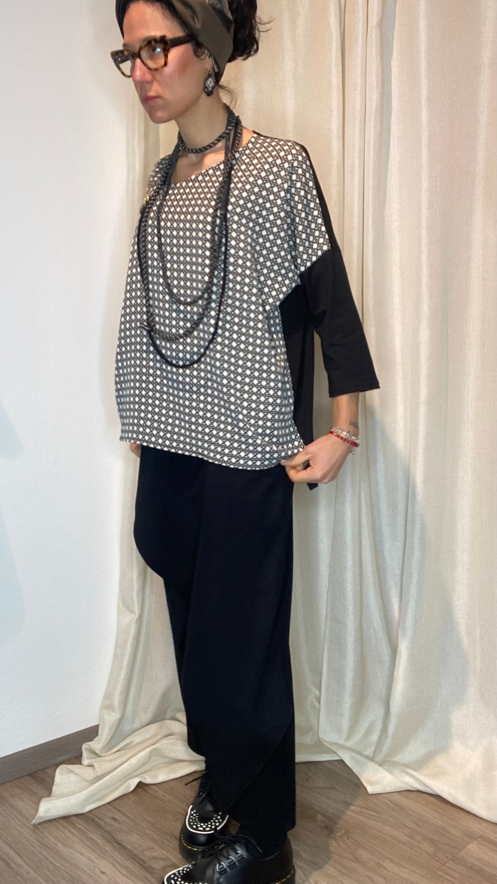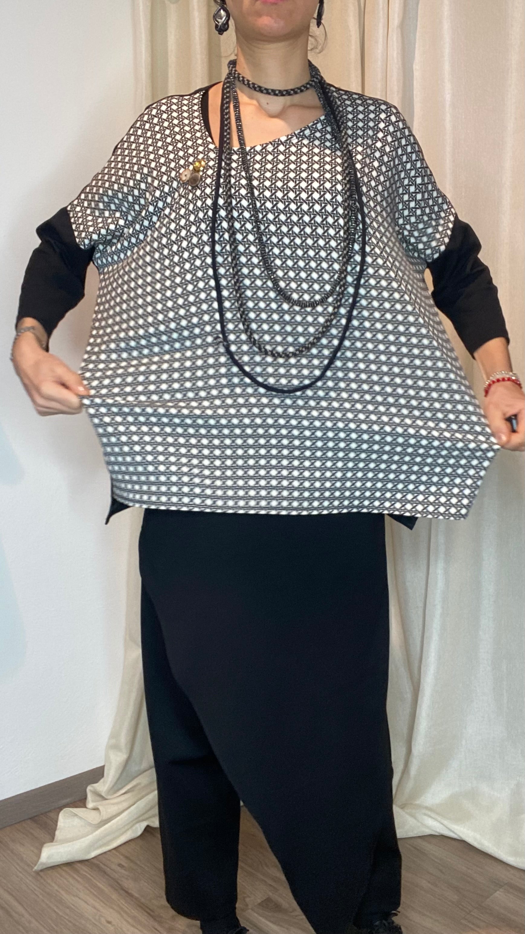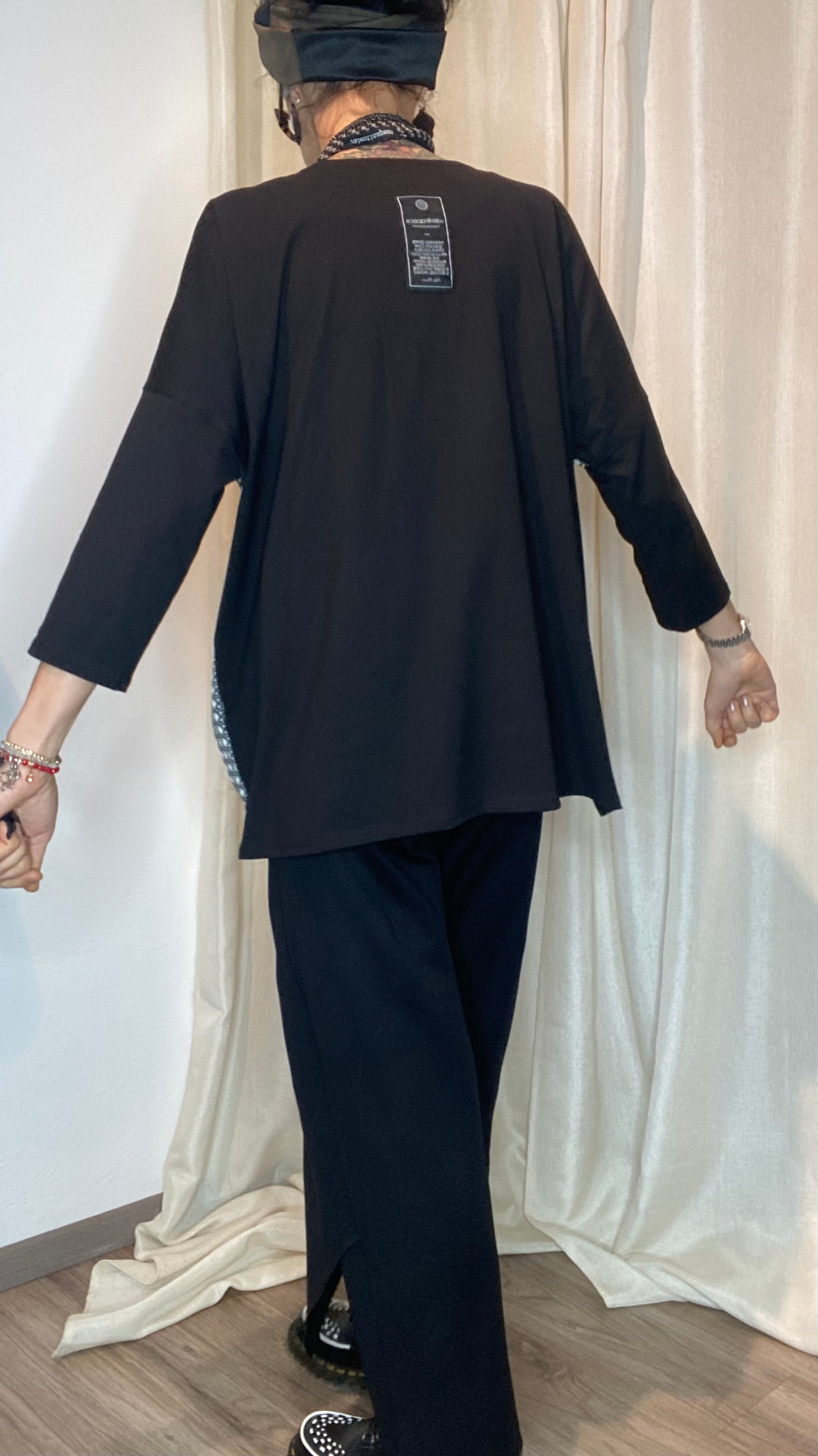 Casacca asimmetrica con retro e maniche in morbida maglina di cotone, bottoni applicati e pannello davanti in cotone misto fantasia. Taglia unica, veste dalla tg 38 alla 50.