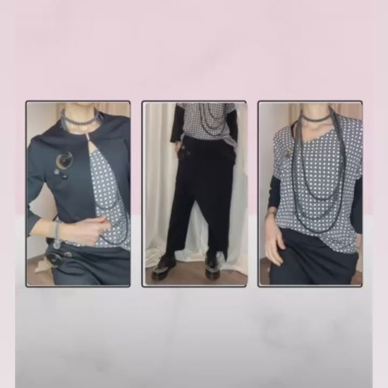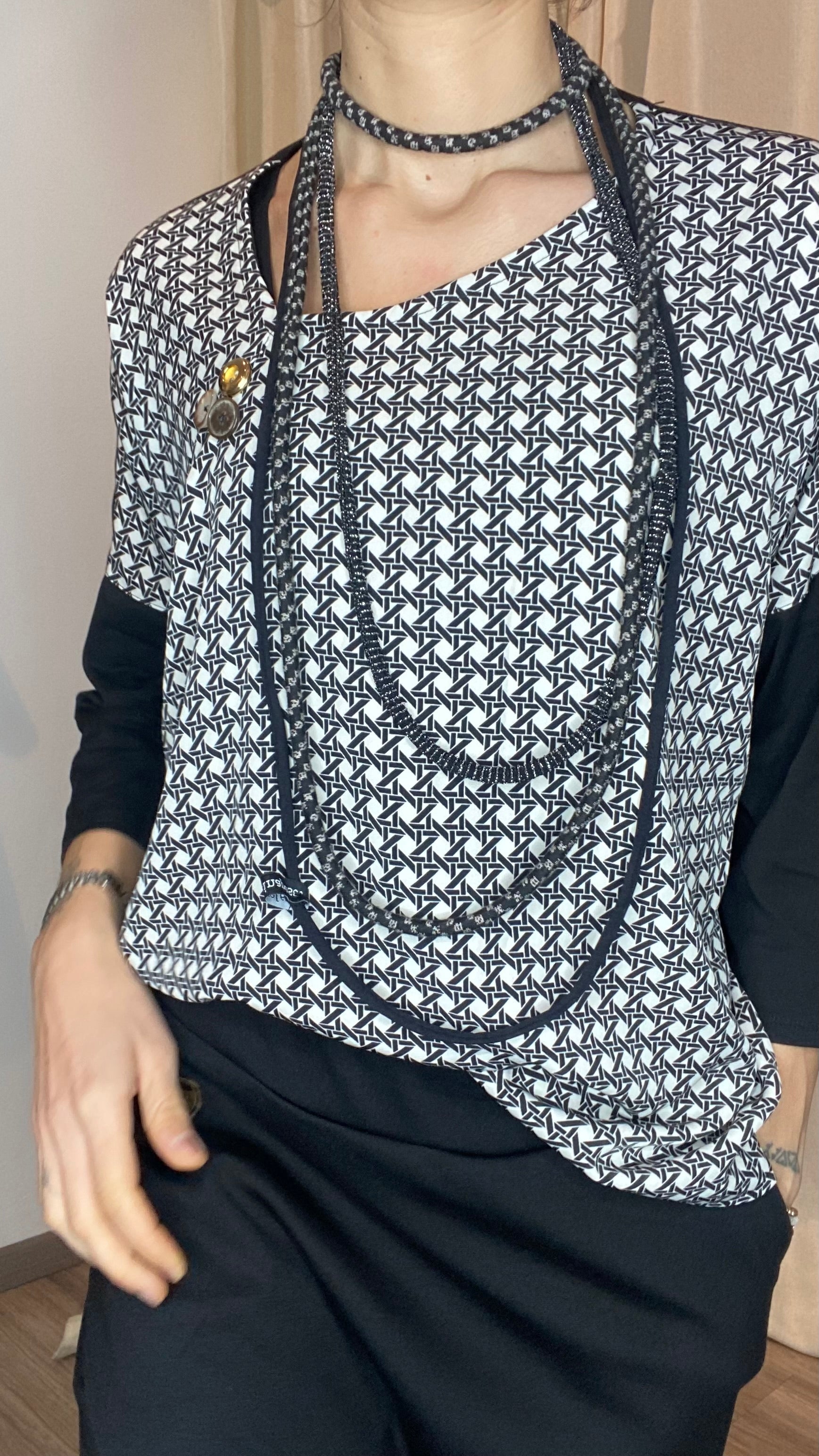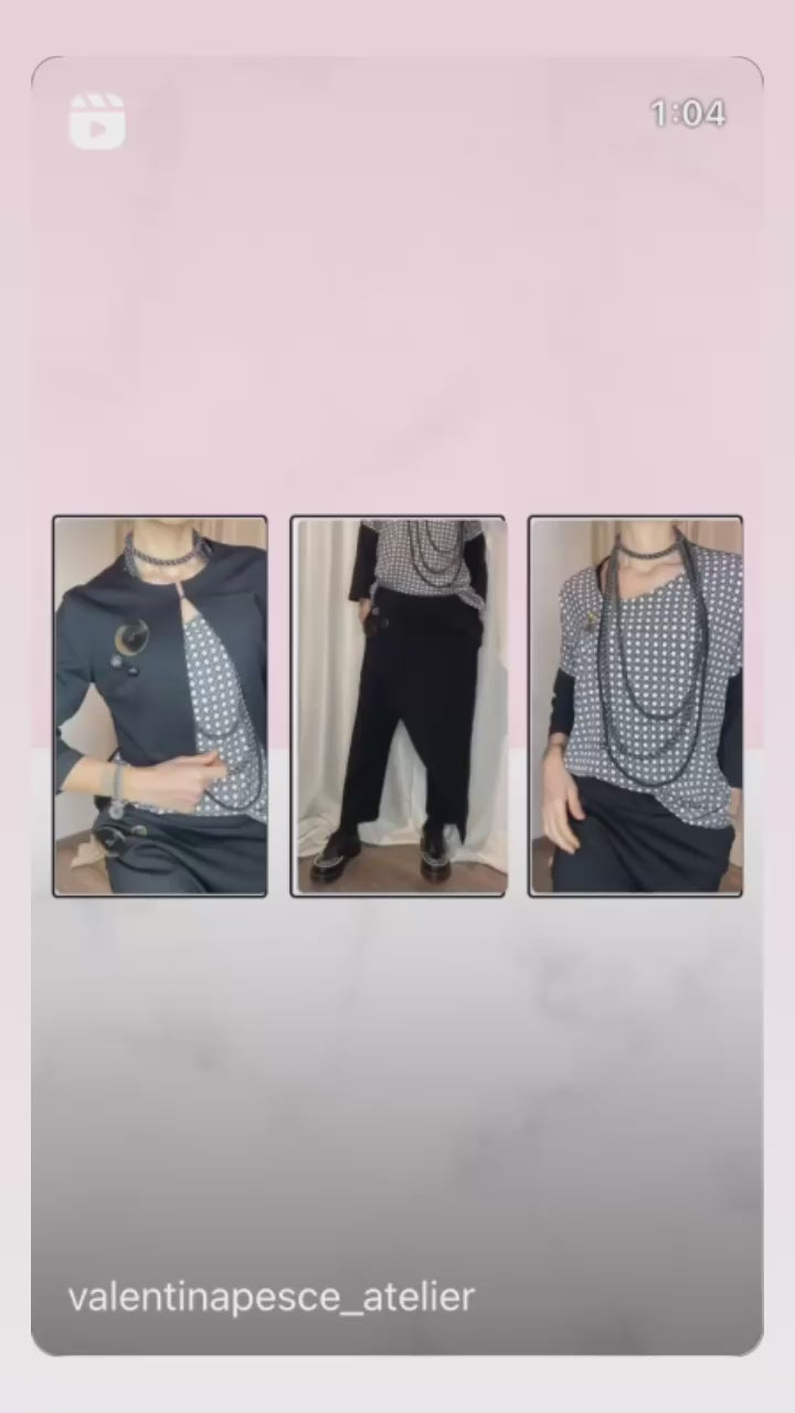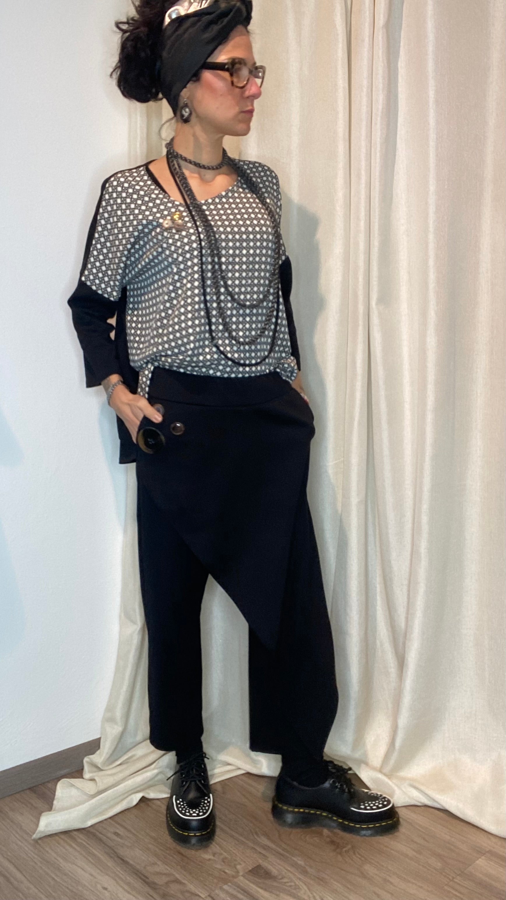 Casacca asimmetrica con retro e maniche in morbida maglina di cotone, bottoni applicati e pannello davanti in cotone misto fantasia. Taglia unica, veste dalla tg 38 alla 50.