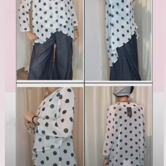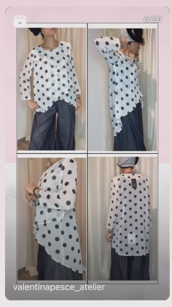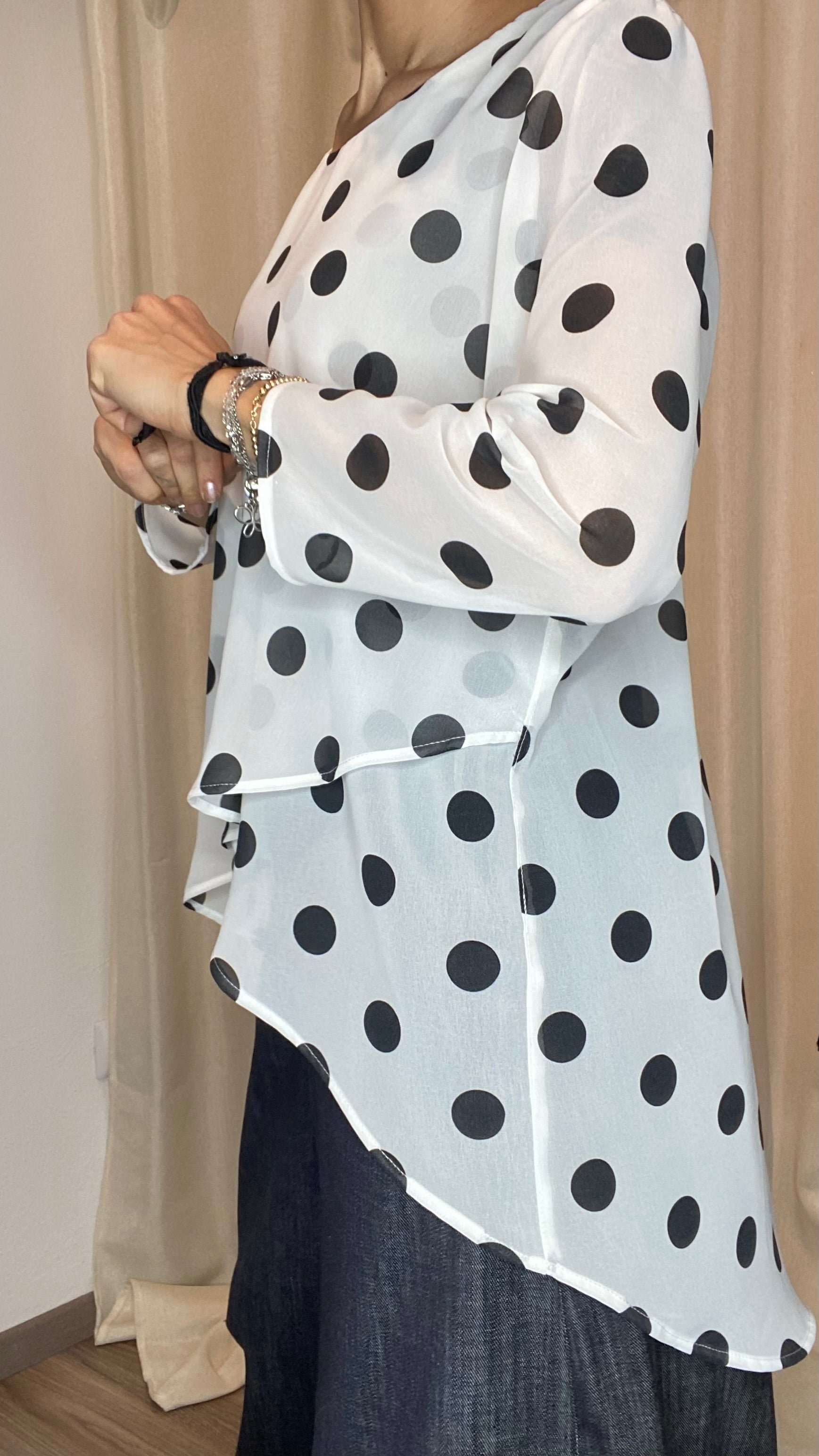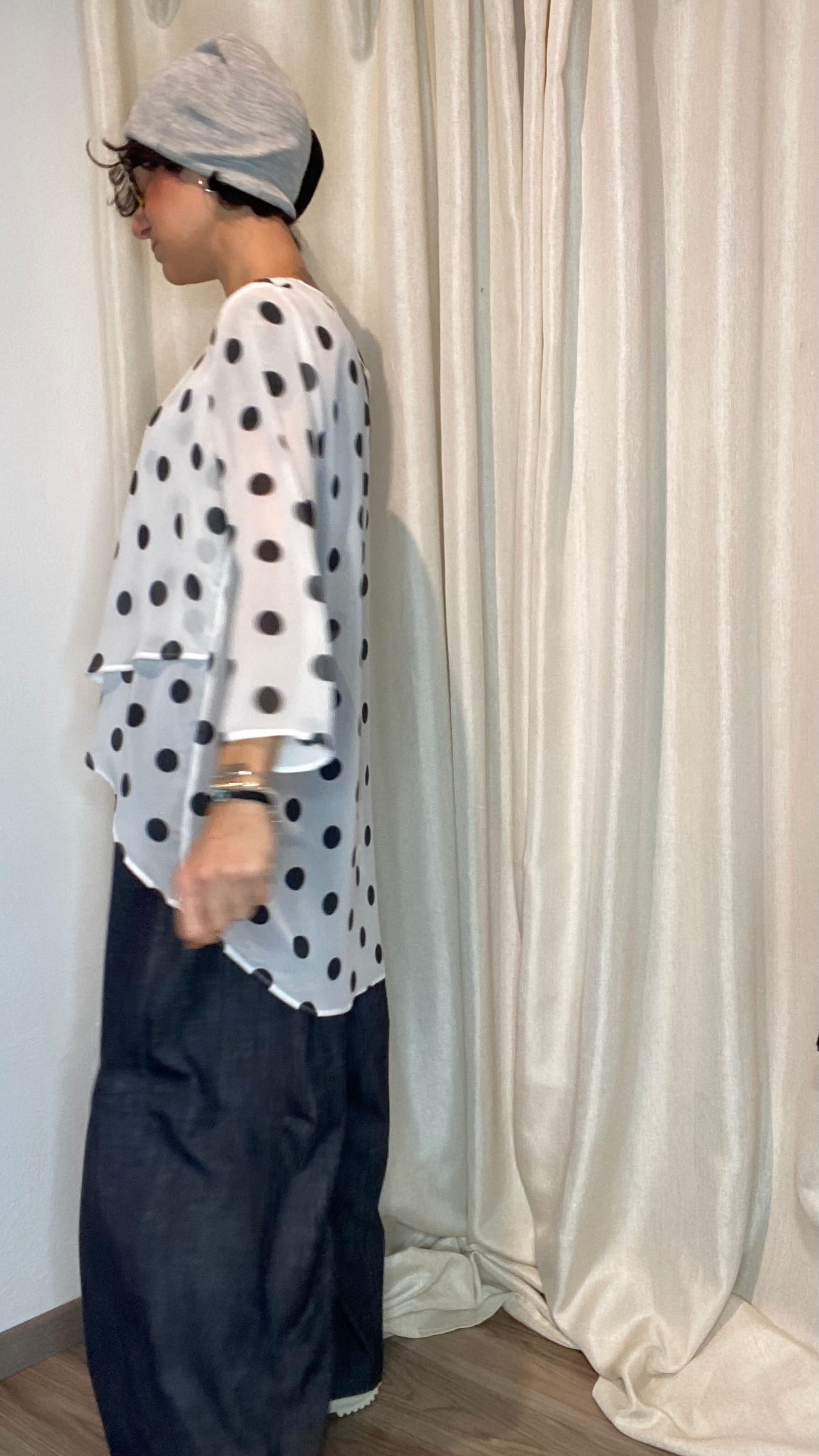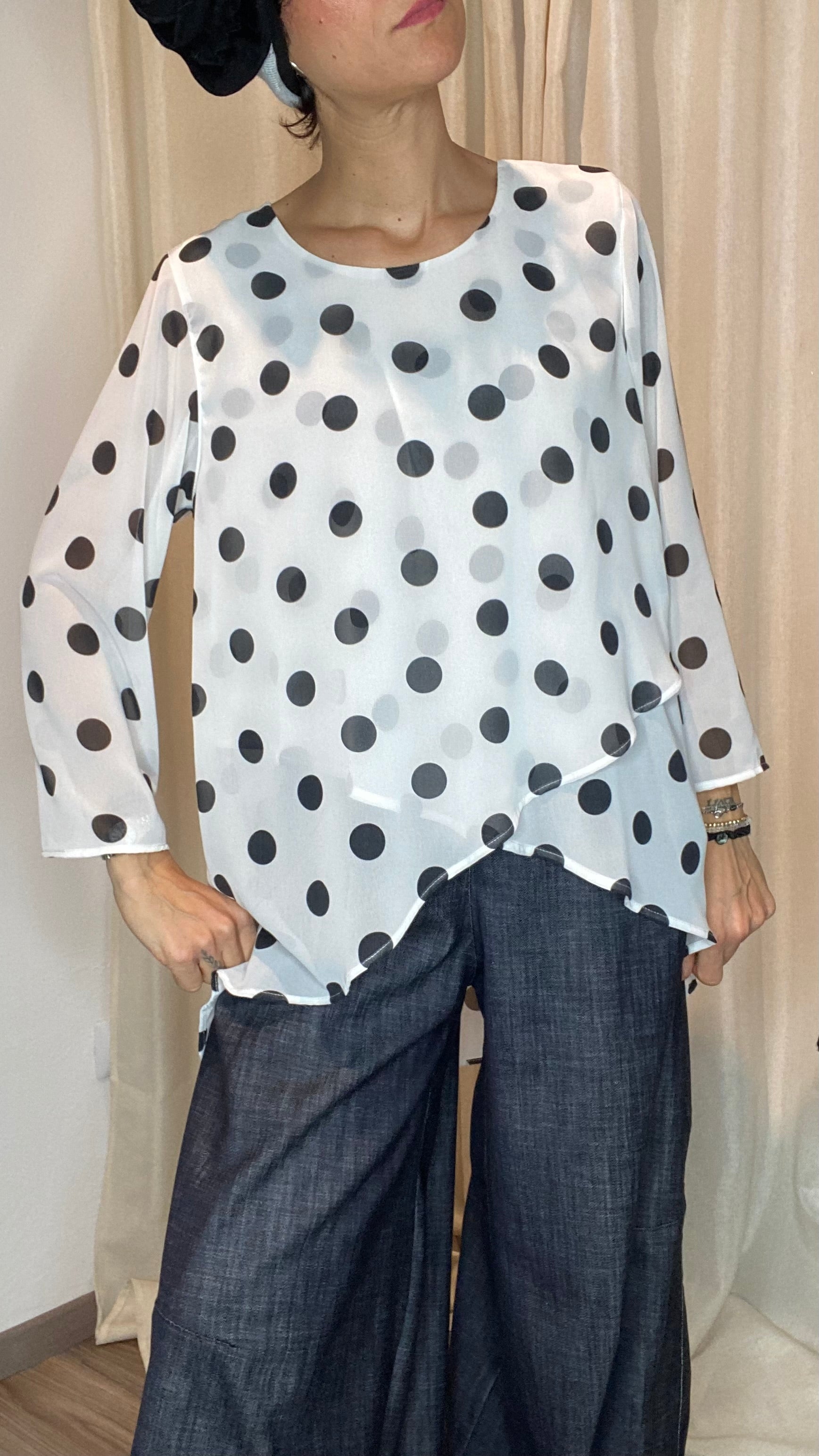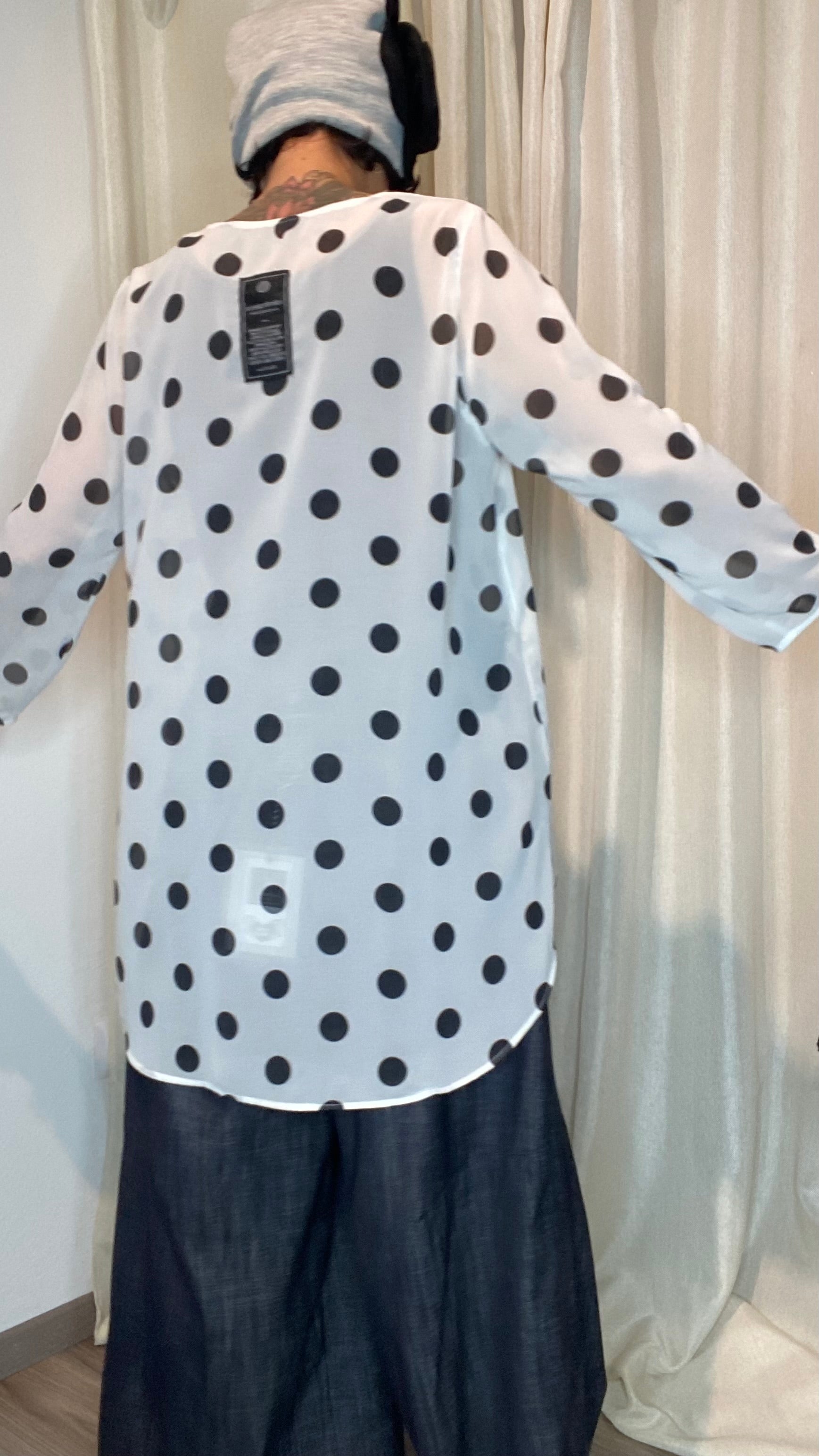 Casacca ampia in chiffon bianco a pois, con drappeggio sul davanti. Taglia unica, veste dalla tg 38 alla tg 50.