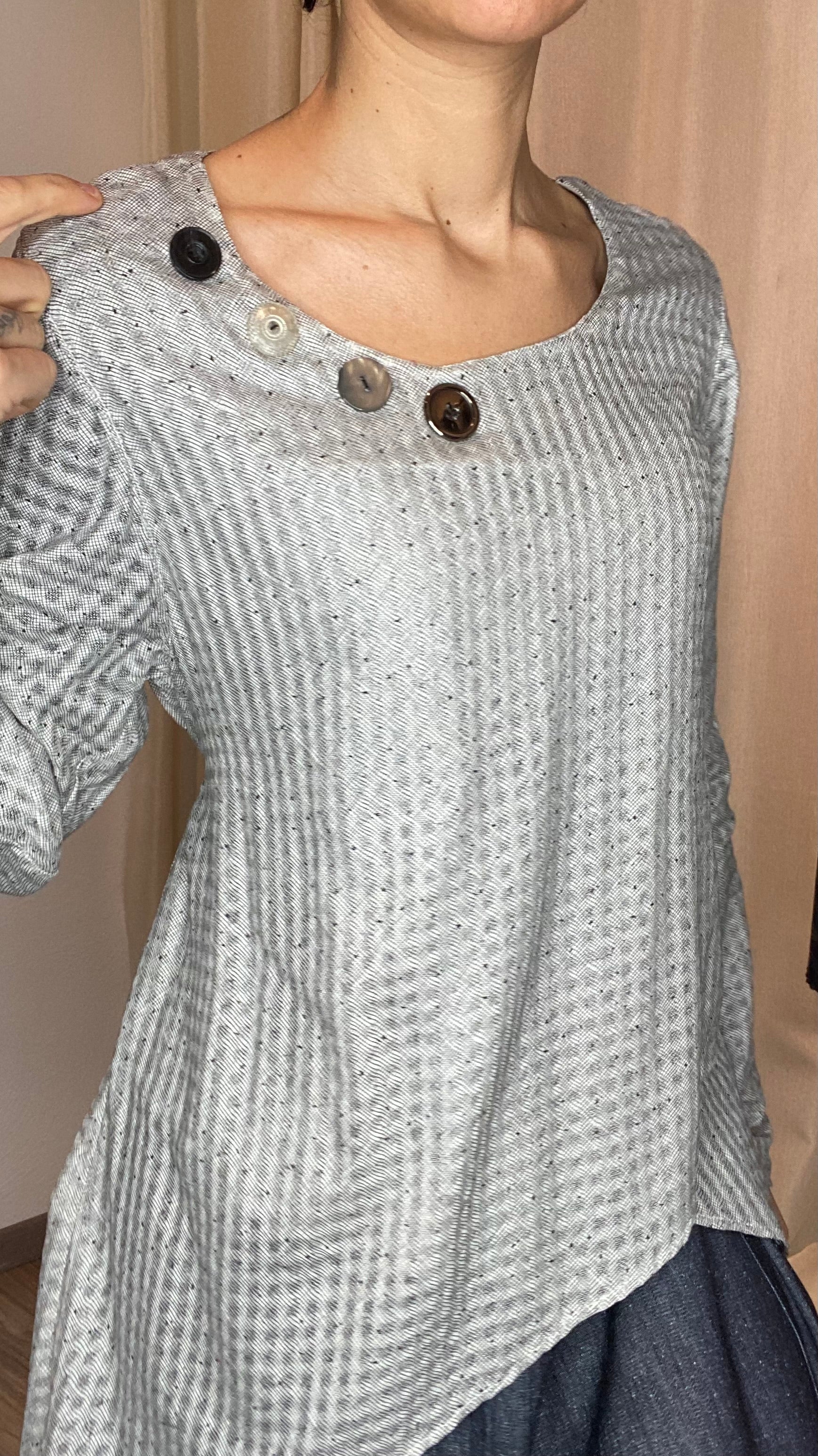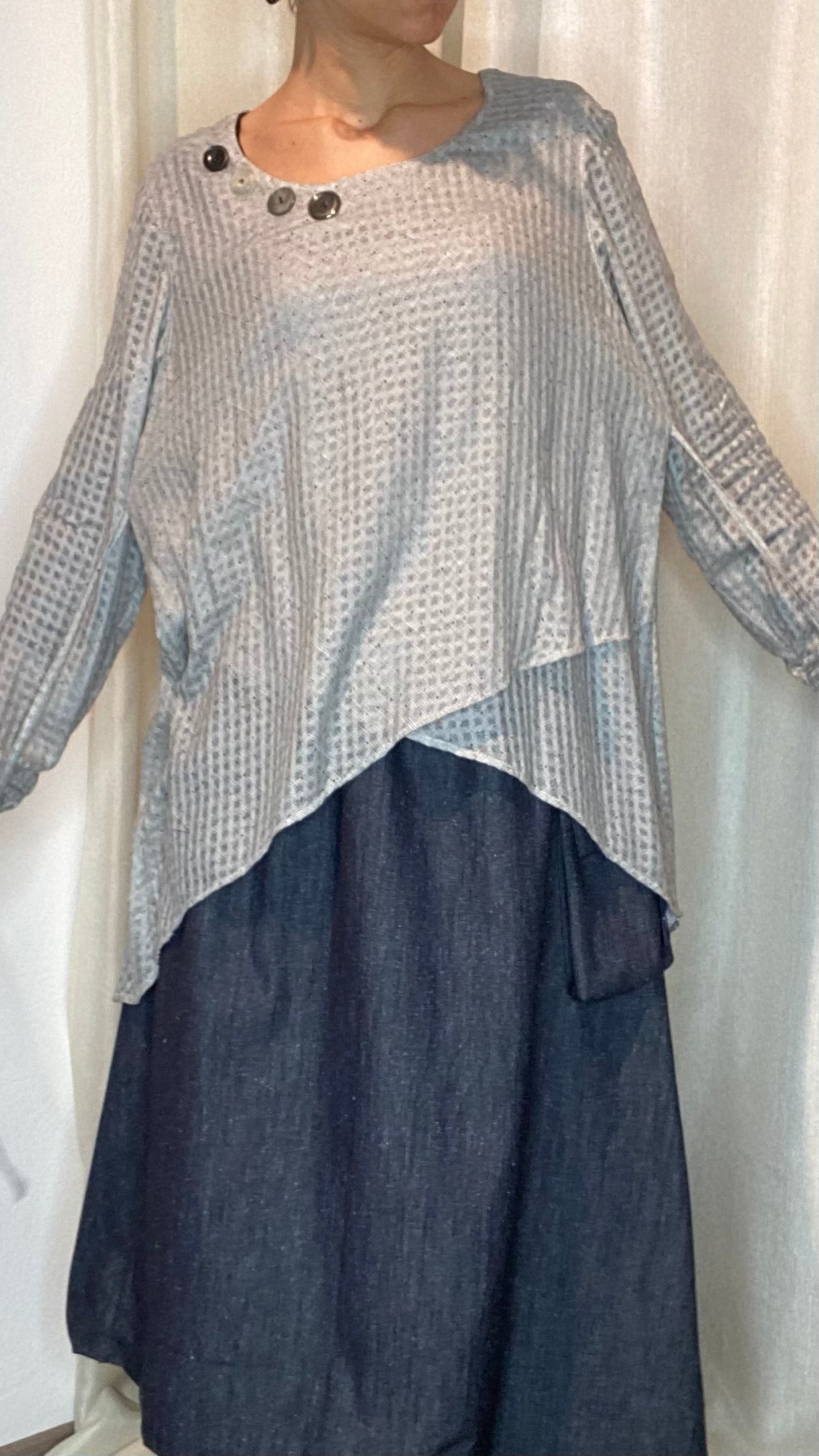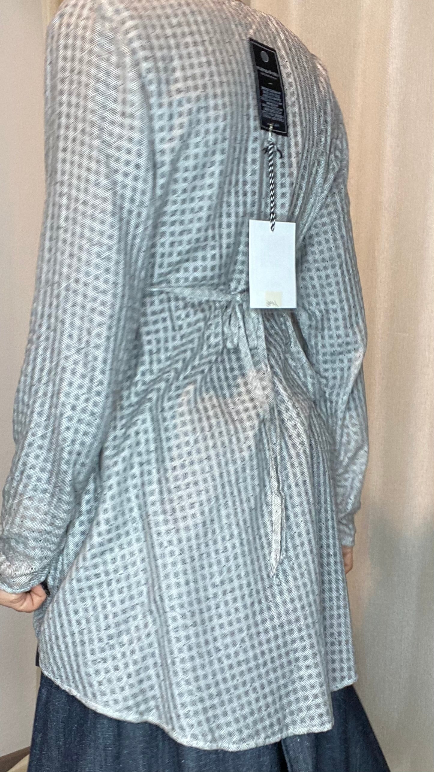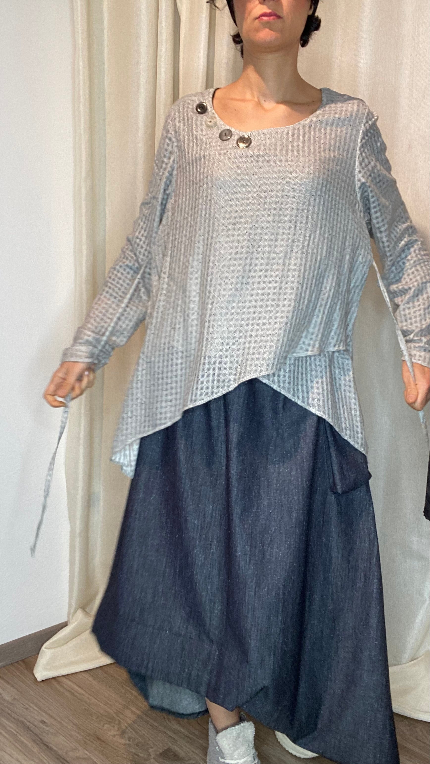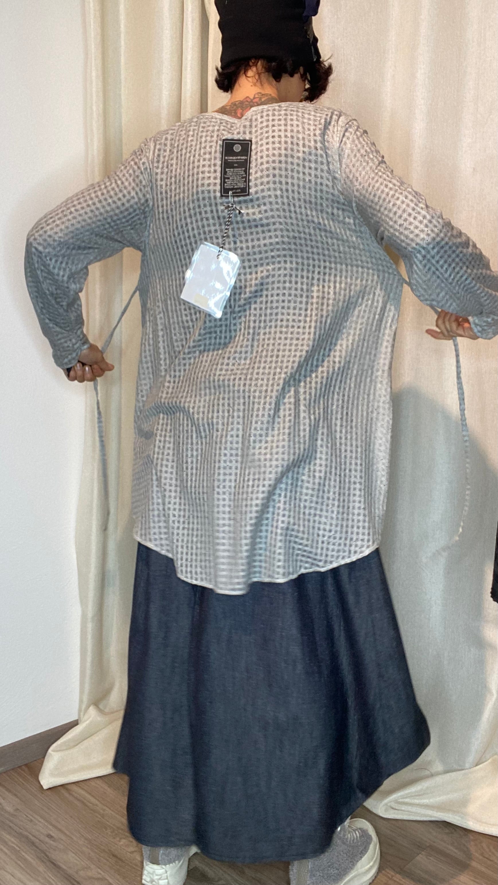 Casacca ampia in chiffon lavorato, con drappeggio sul davanti, bottoni applicati, regolabile in vita tramite laccetti. Taglia unica, veste dalla tg 38 alla tg 50.