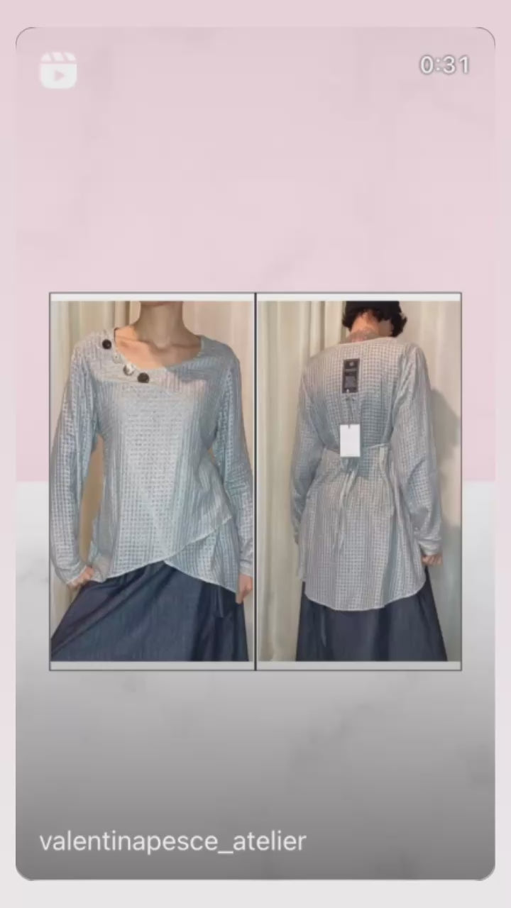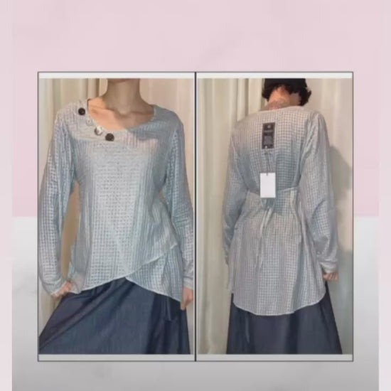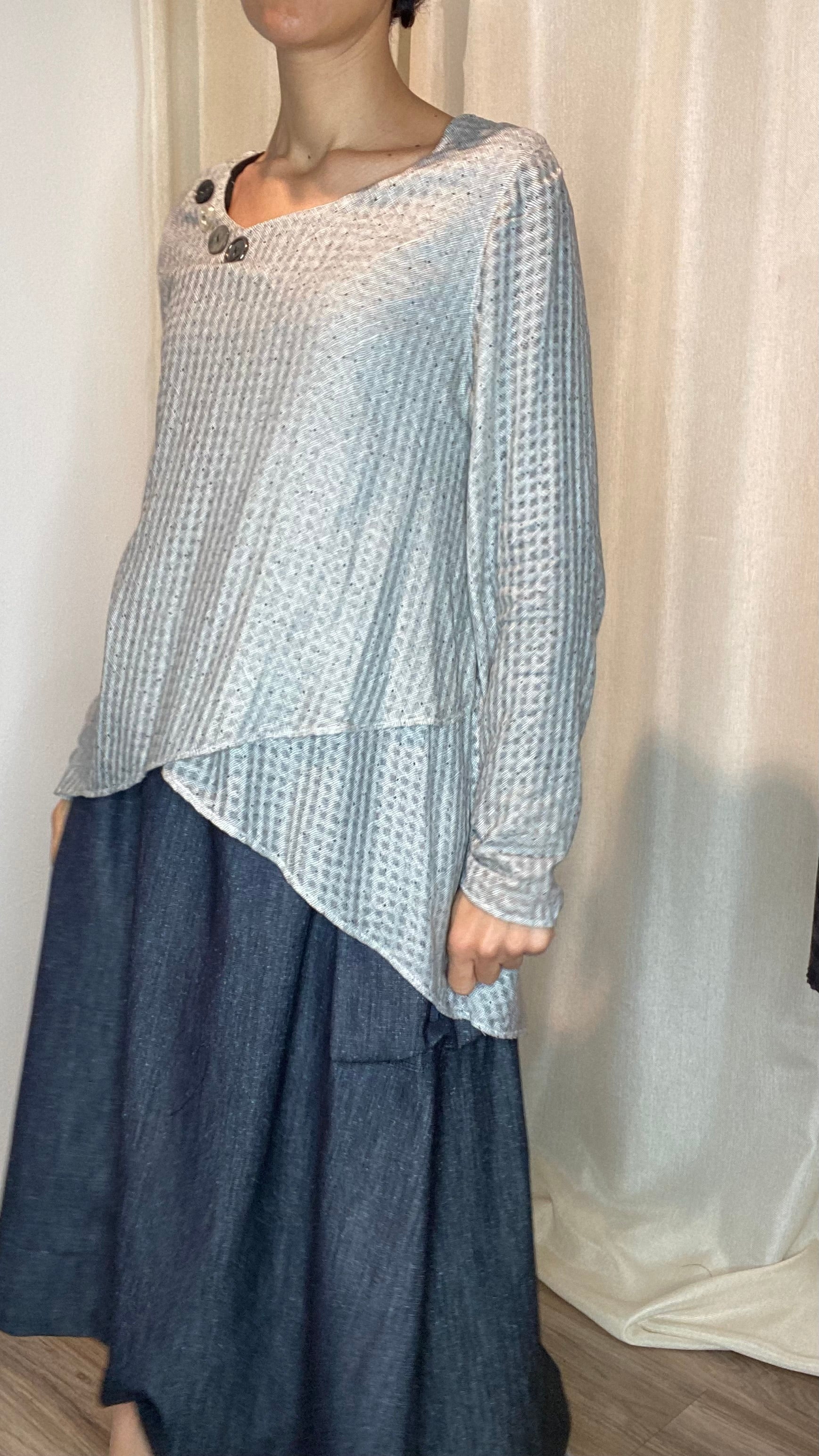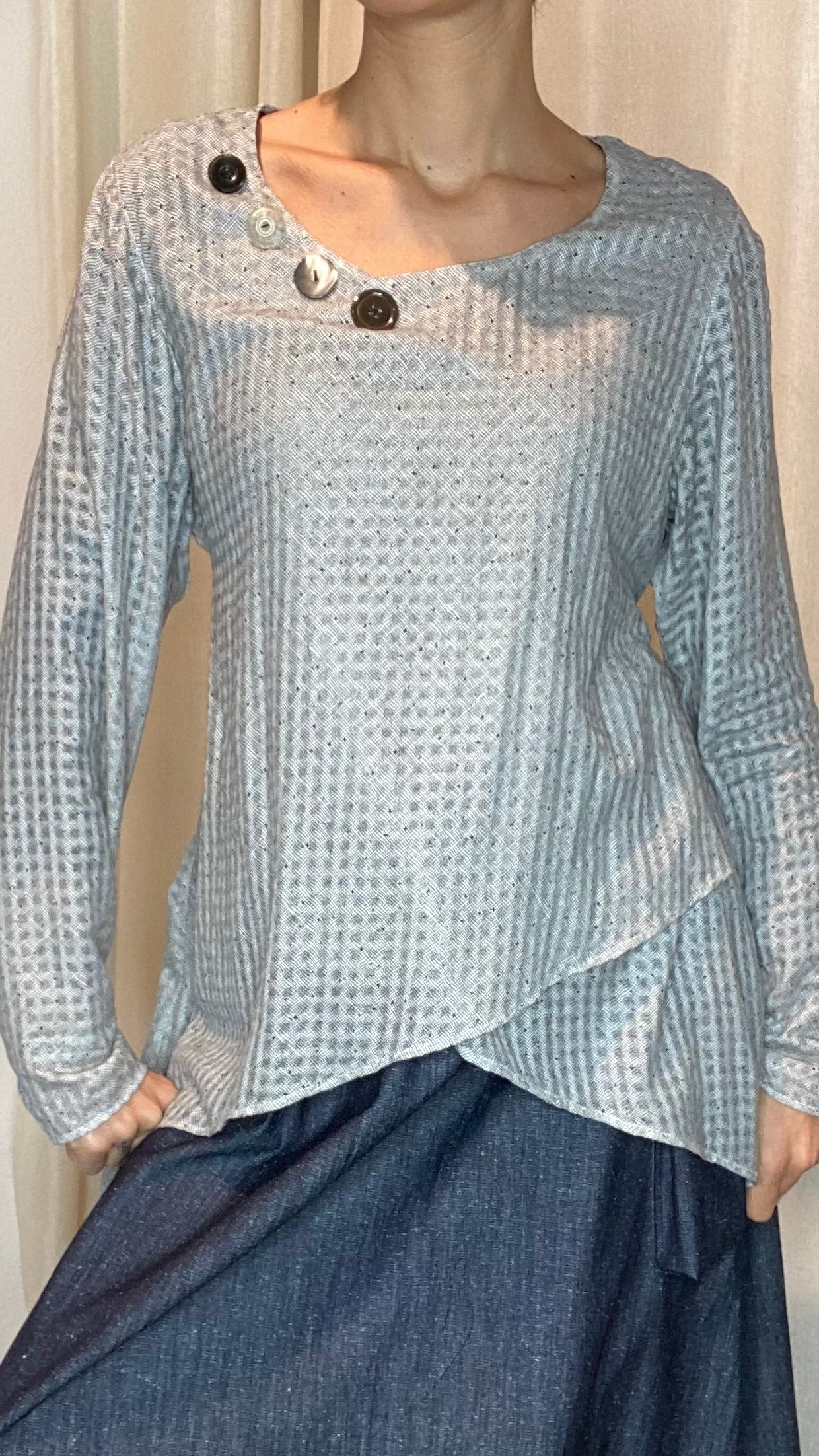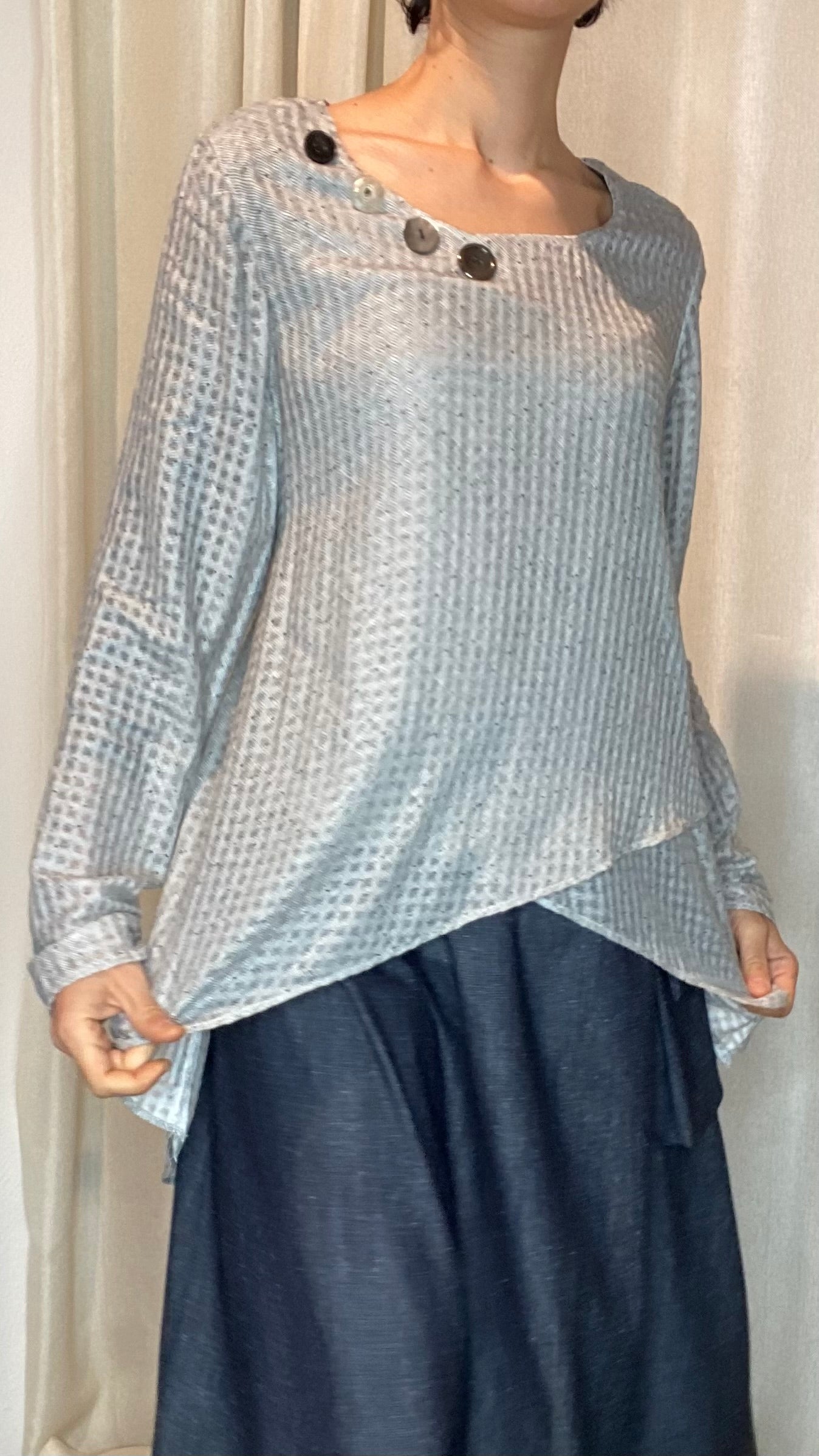Casacca ampia in chiffon lavorato, con drappeggio sul davanti, bottoni applicati, regolabile in vita tramite laccetti. Taglia unica, veste dalla tg 38 alla tg 50.
