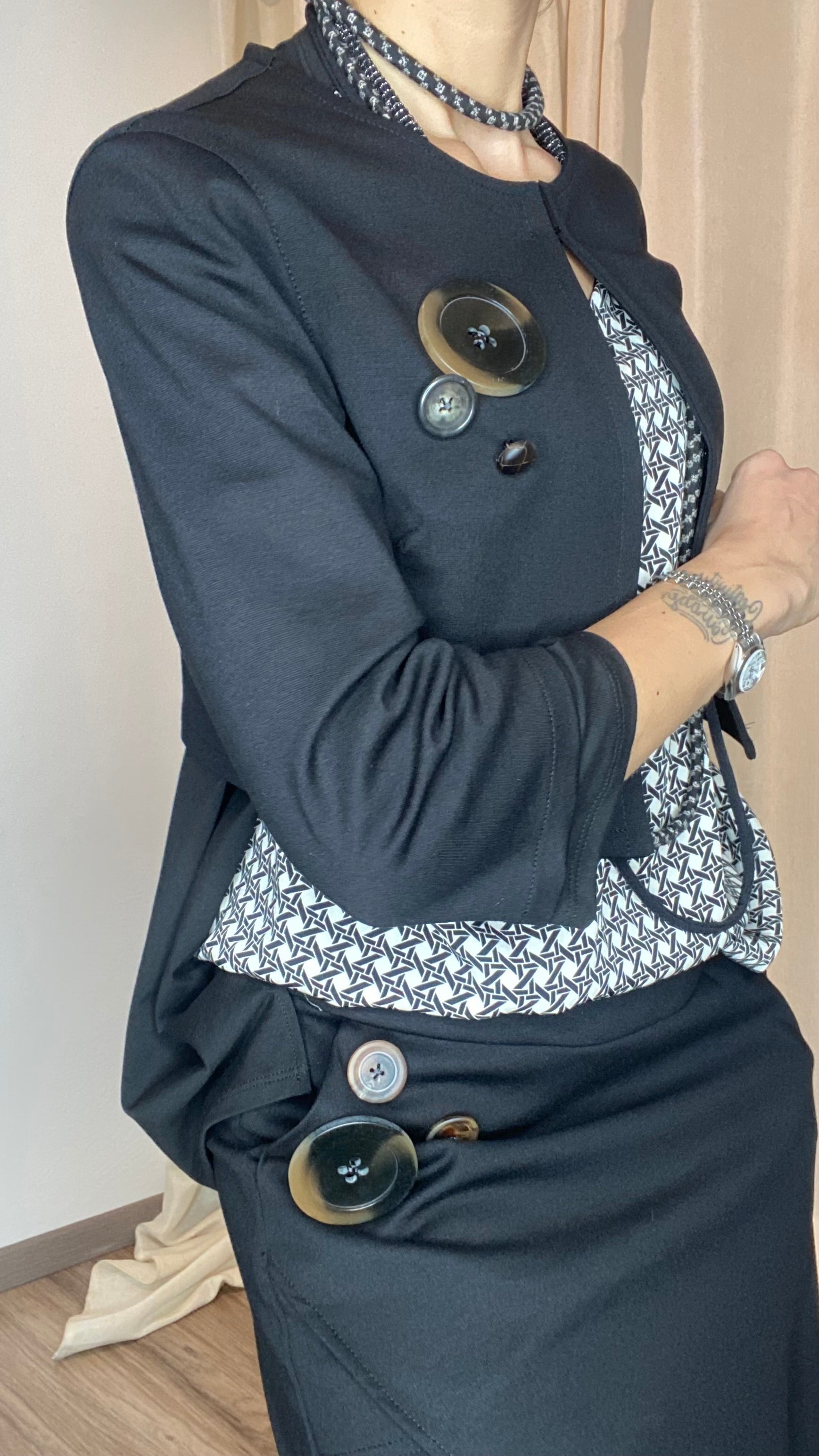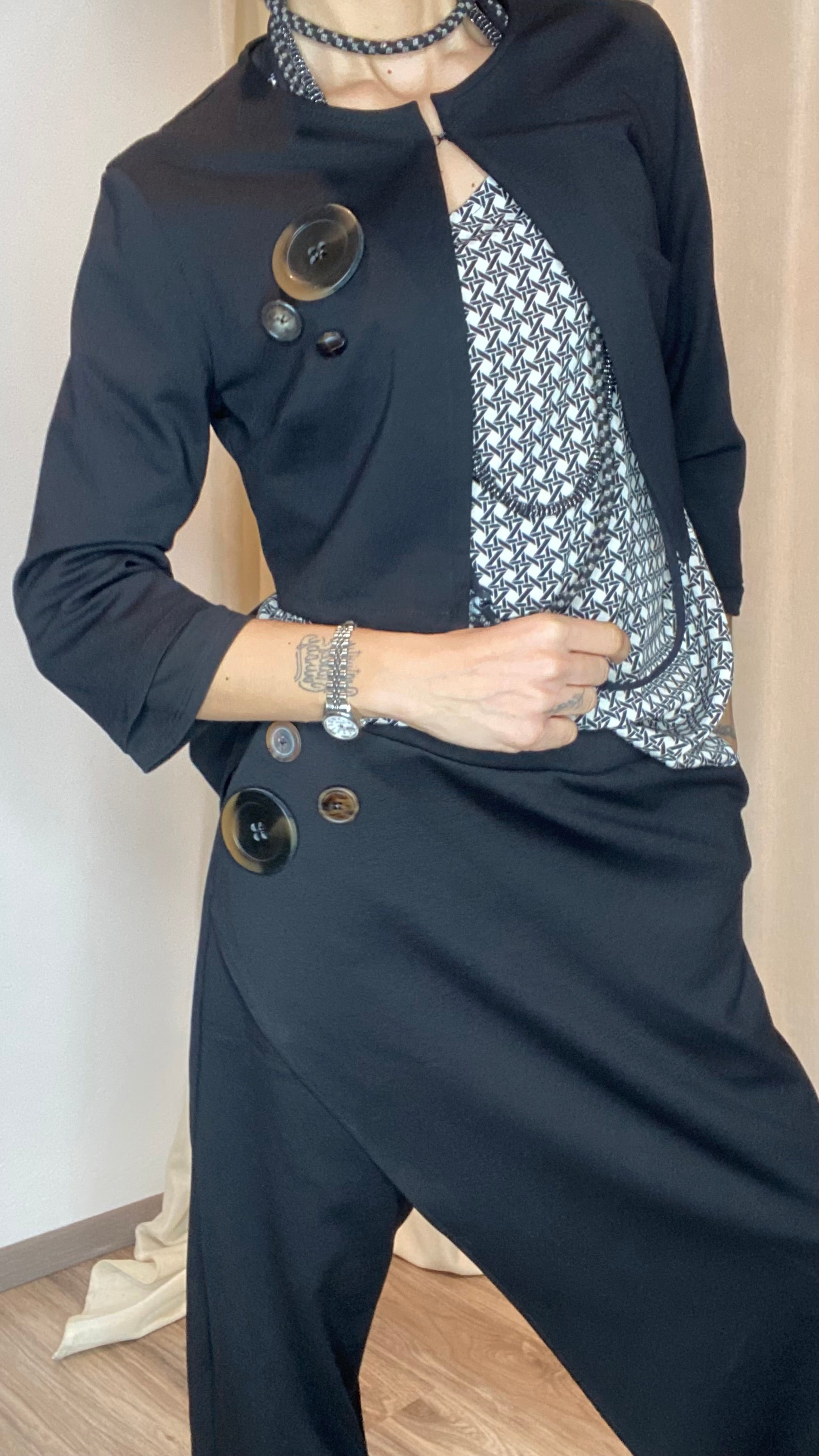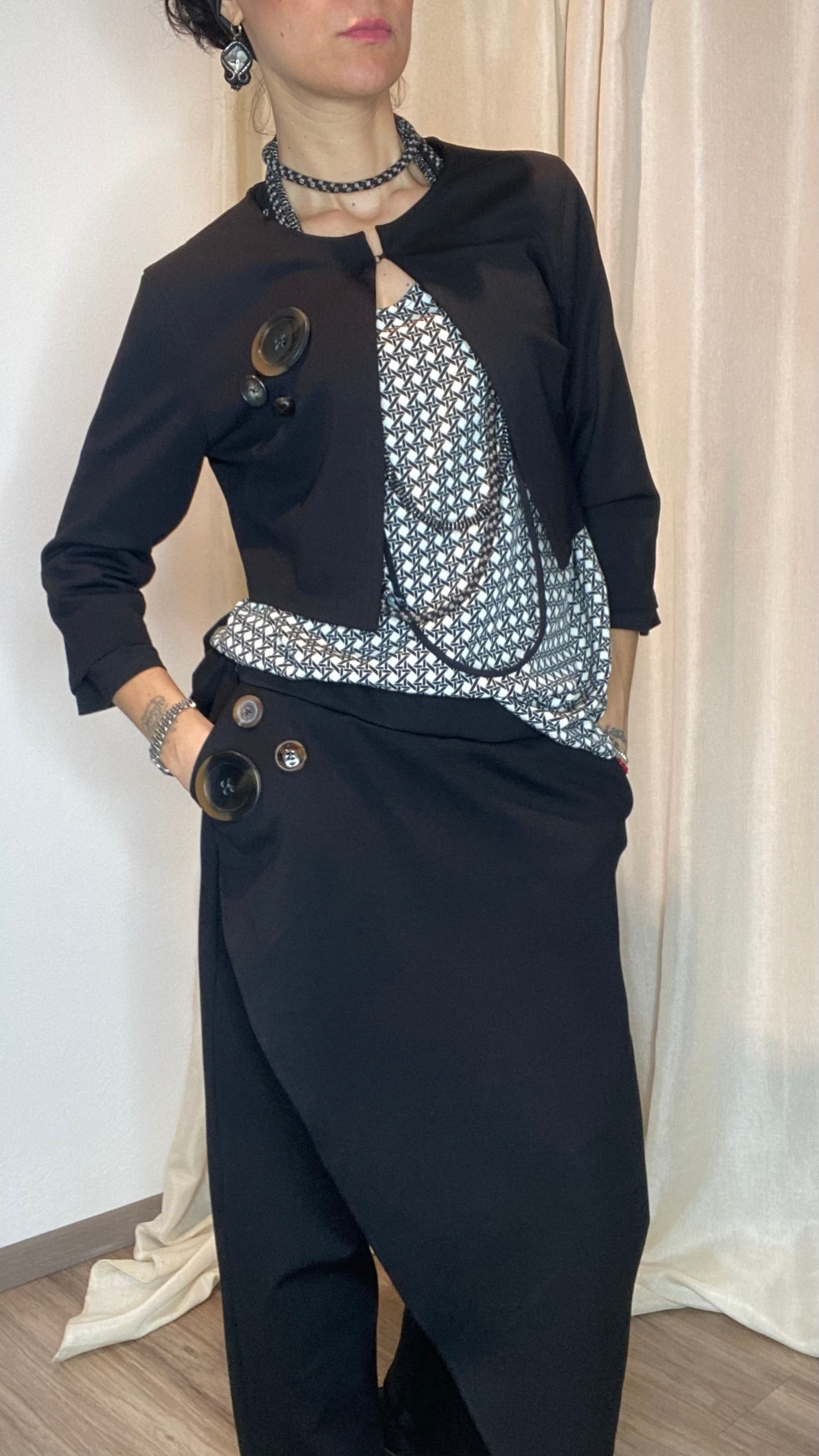 Coprispalle in morbida maglina stretch Punto Milano con manica a 3/4 e bottoni applicati. Taglia unica, veste dalla tg 38 alla 50.