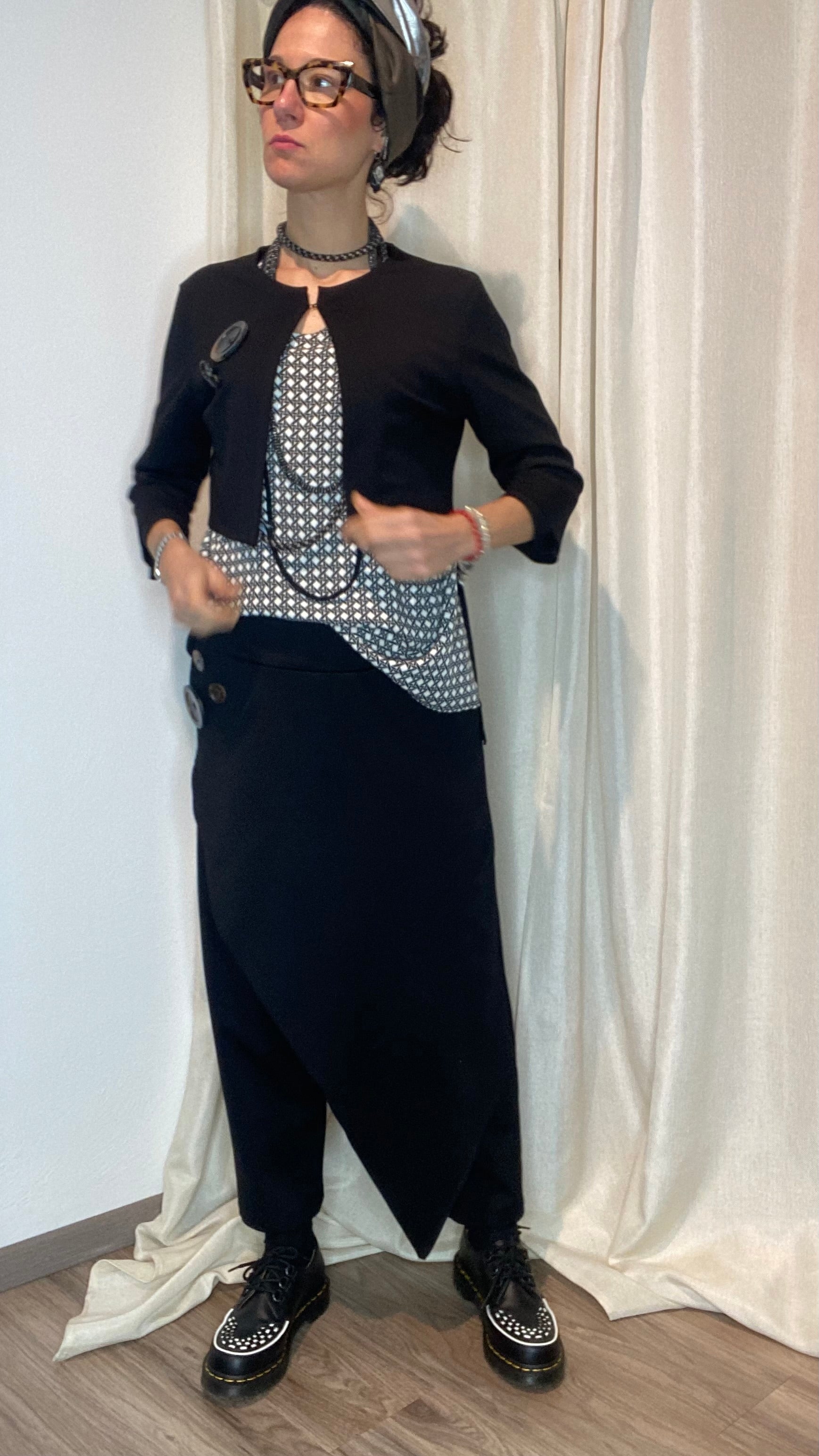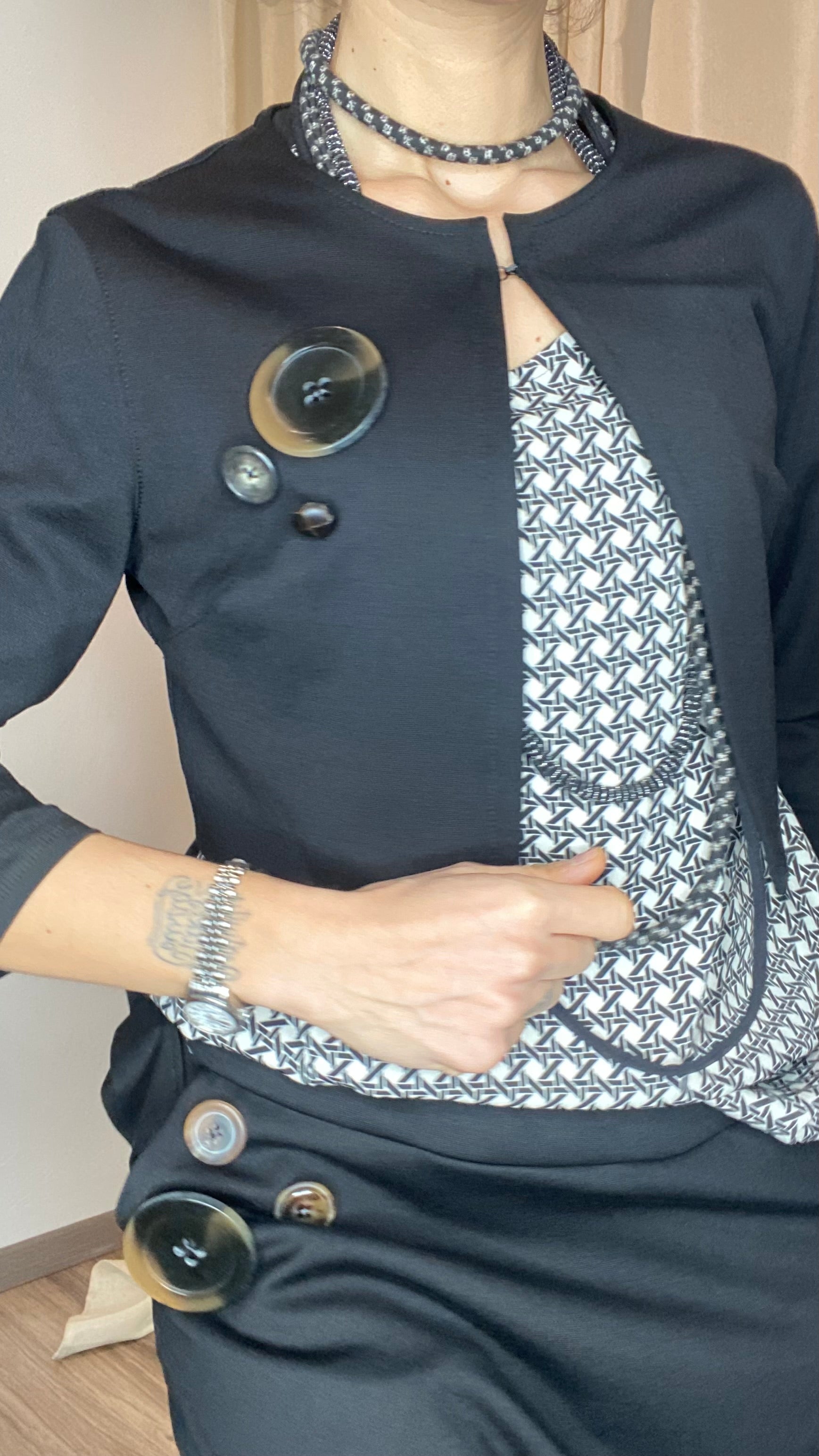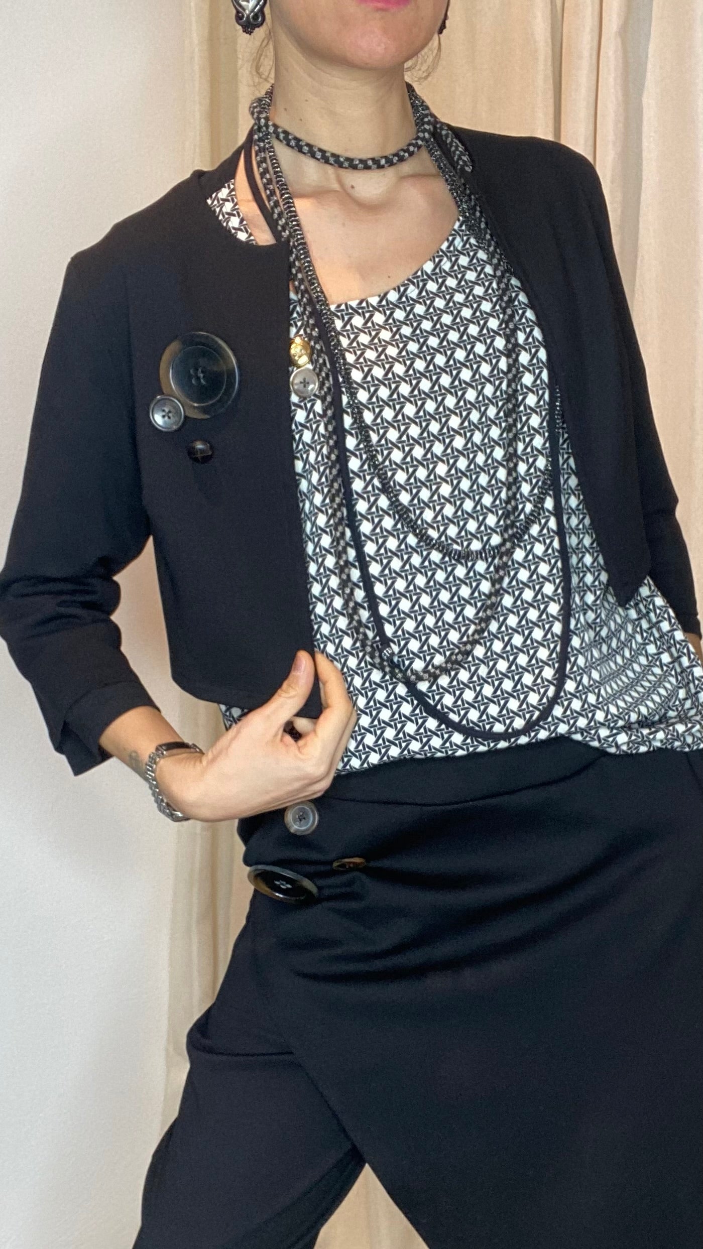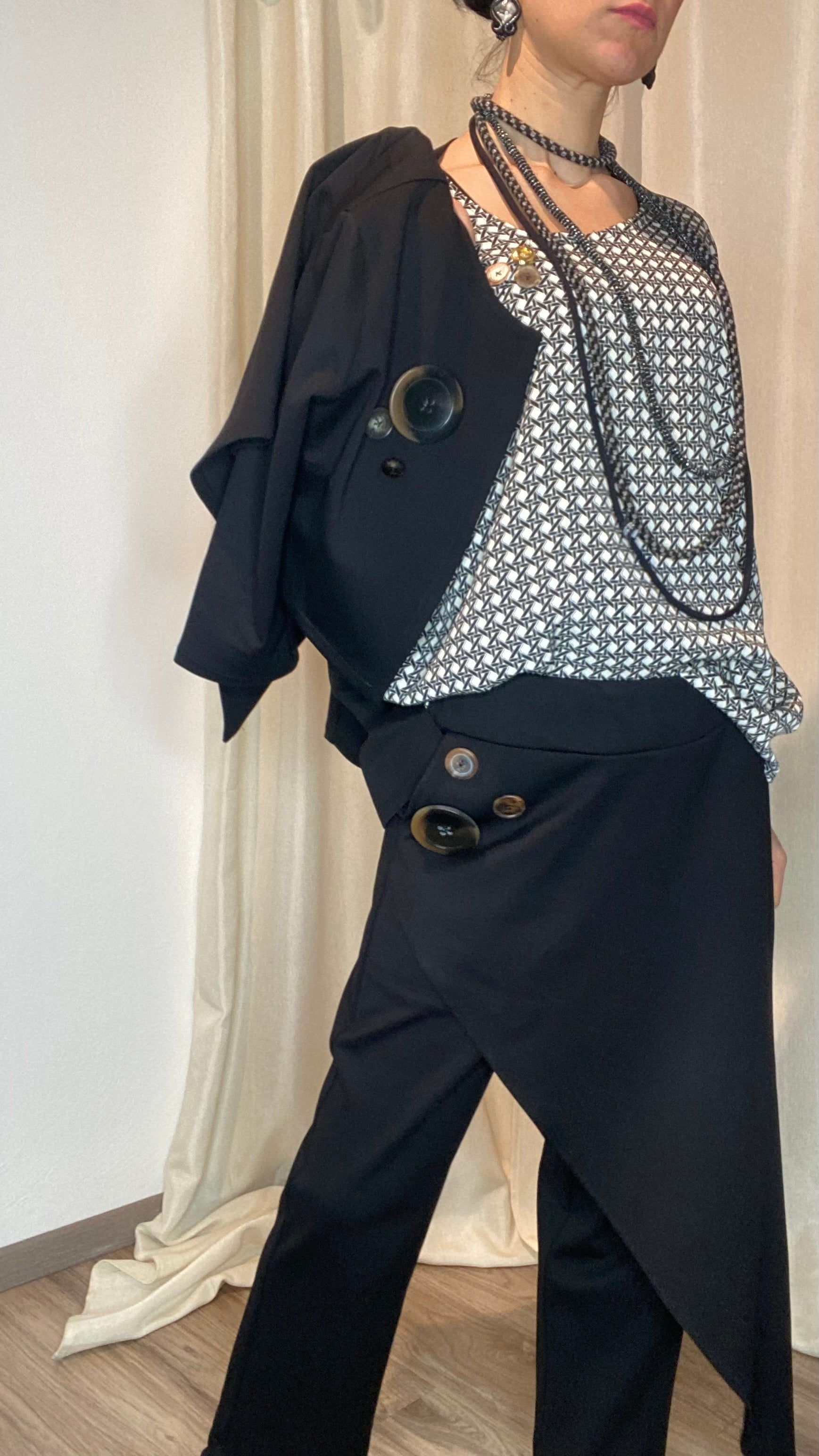 Coprispalle in morbida maglina stretch Punto Milano con manica a 3/4 e bottoni applicati. Taglia unica, veste dalla tg 38 alla 50.