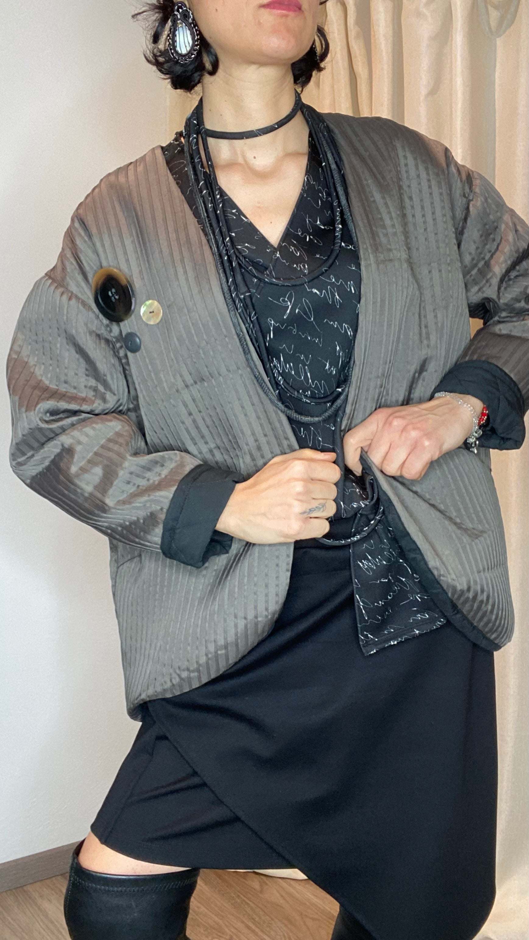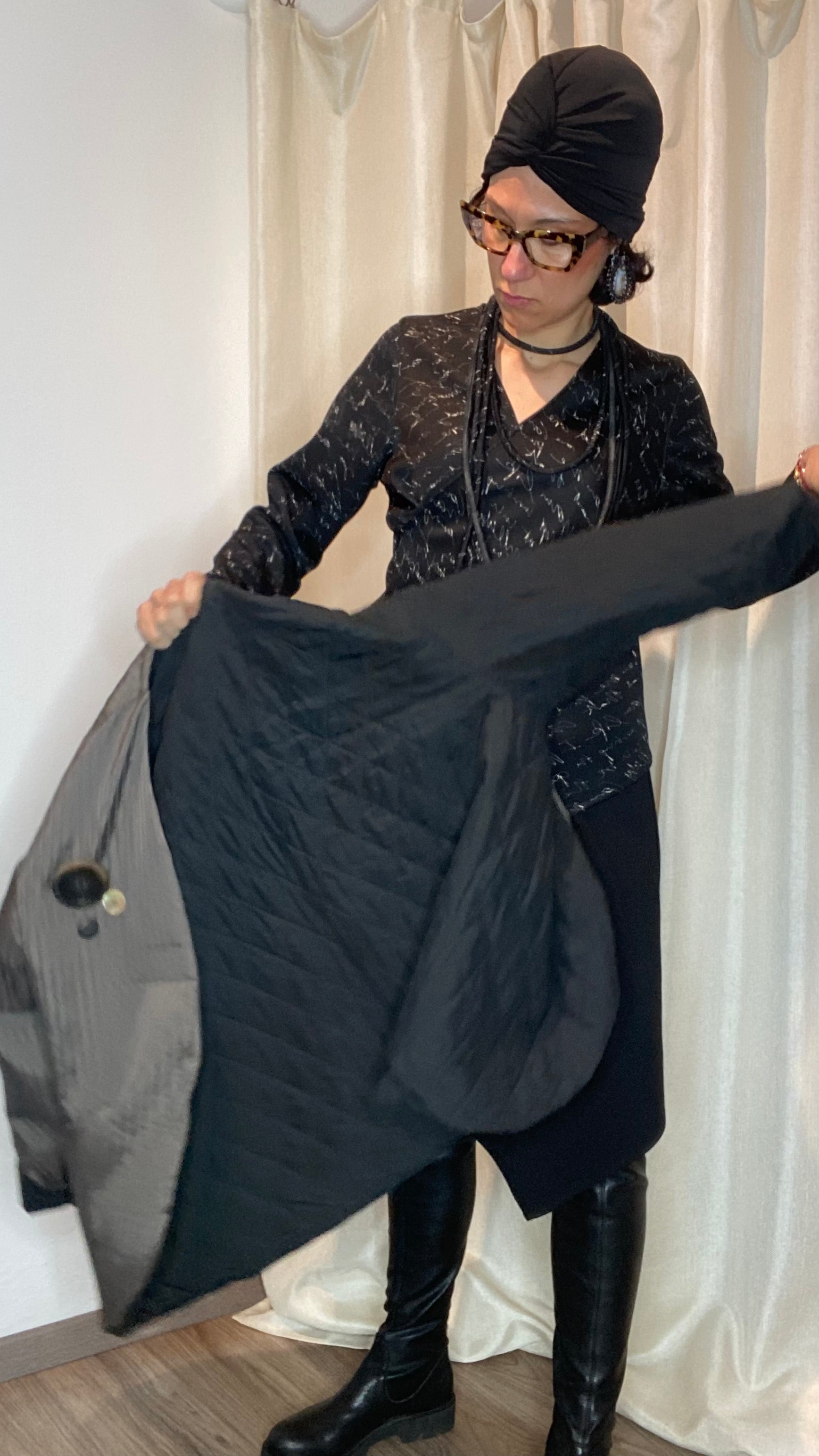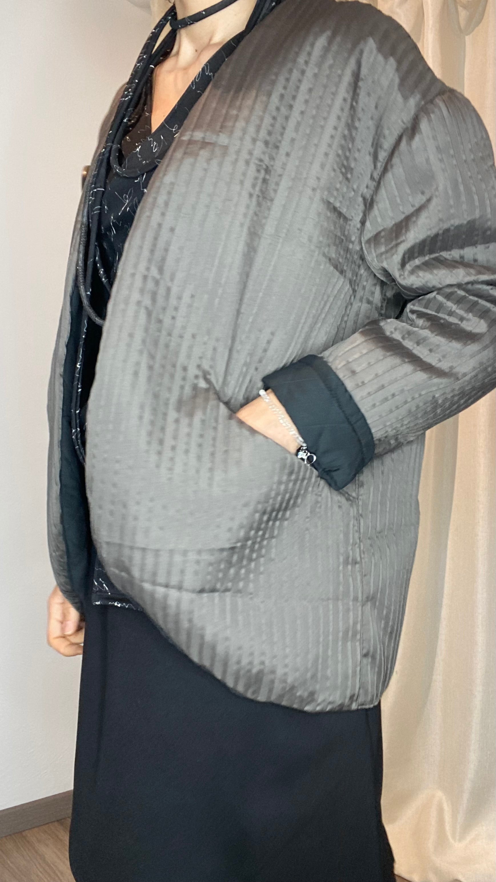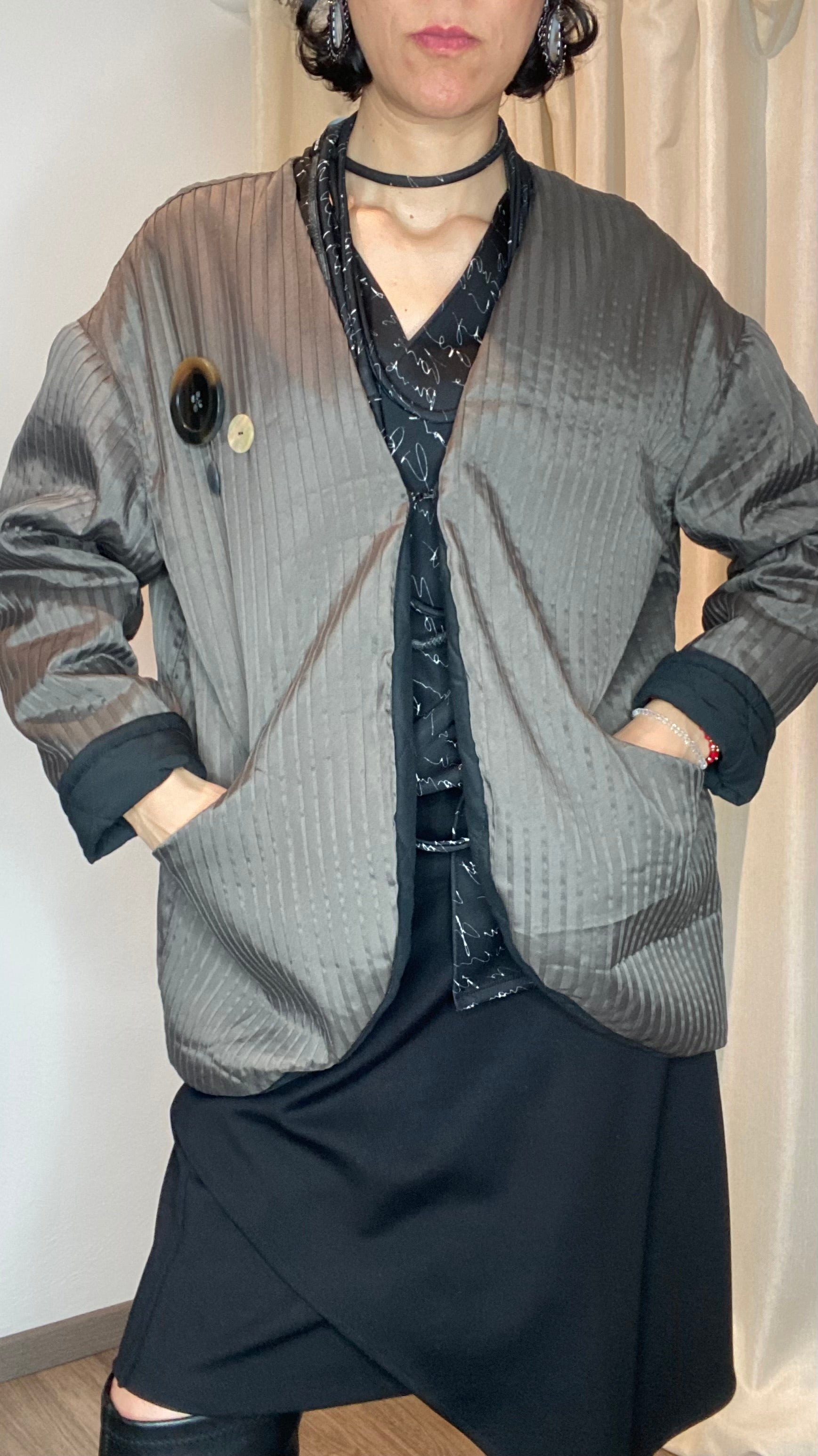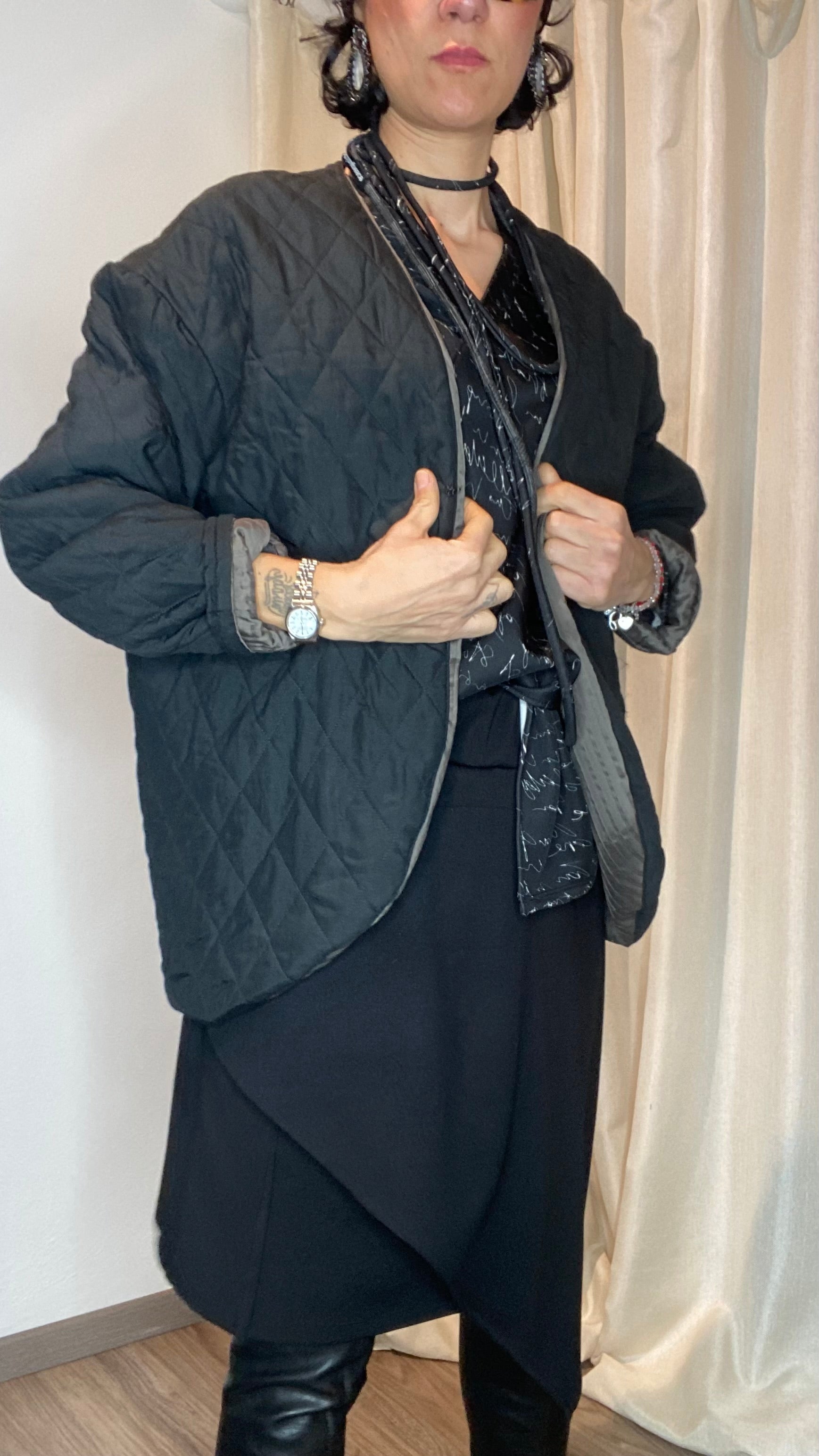 Giacca reversibile, con tasche laterali, bottoni applicati e gancetto per chiuderla. Veste dalla taglia 38 alla taglia 50.