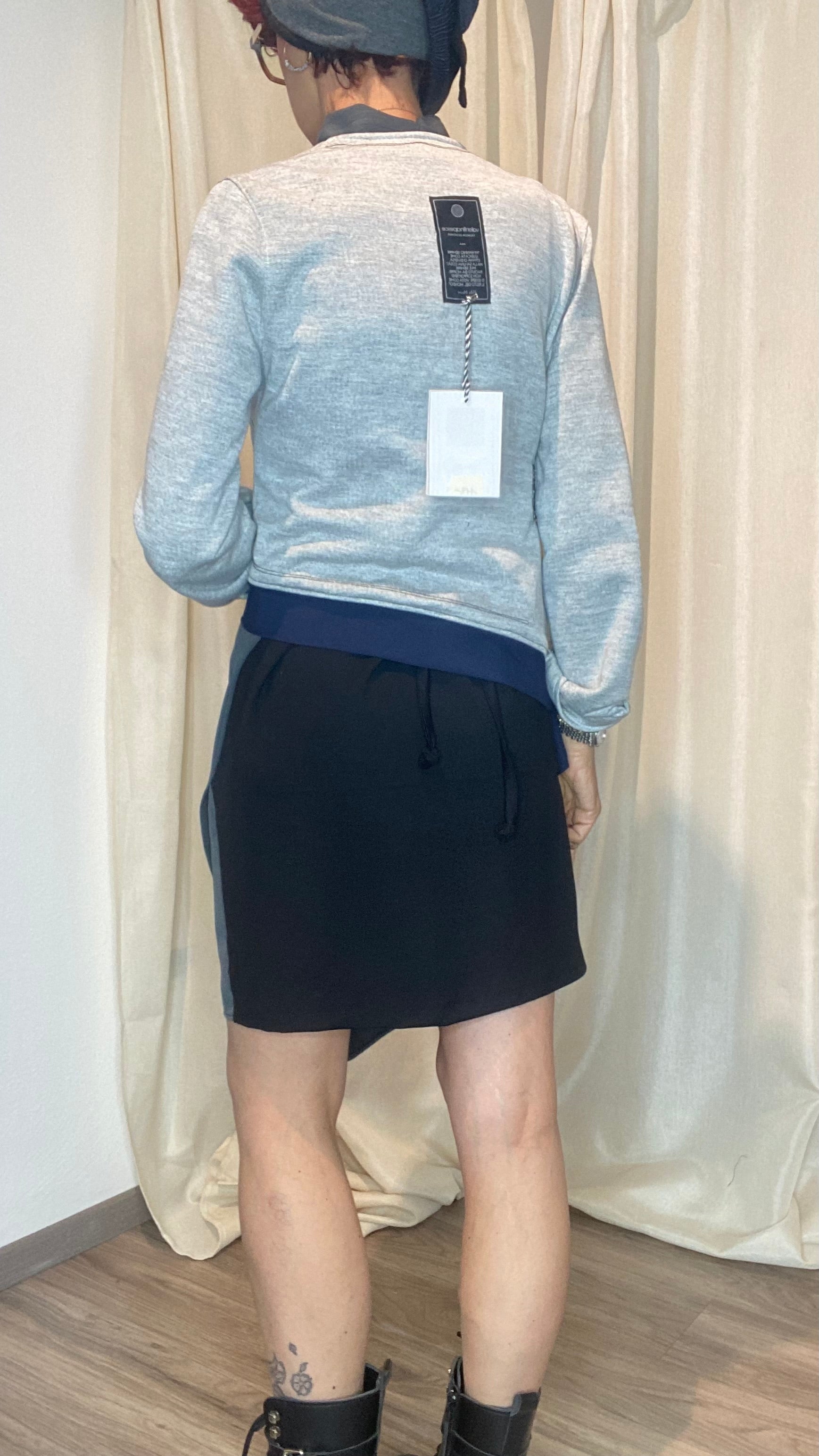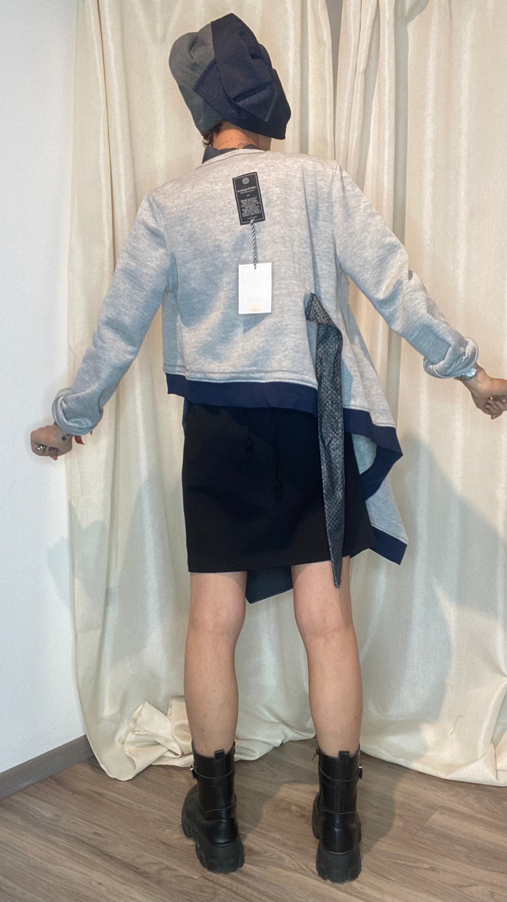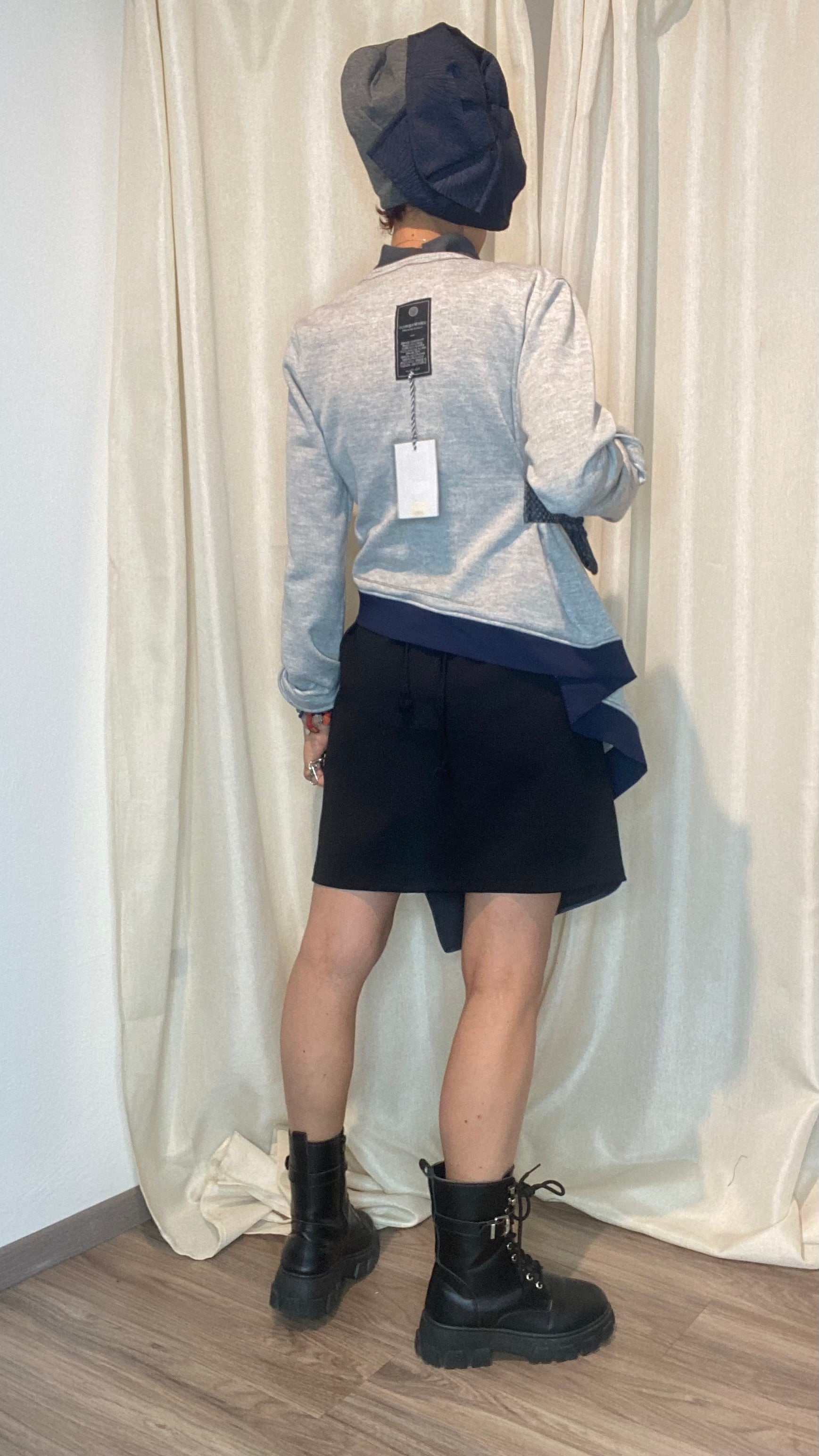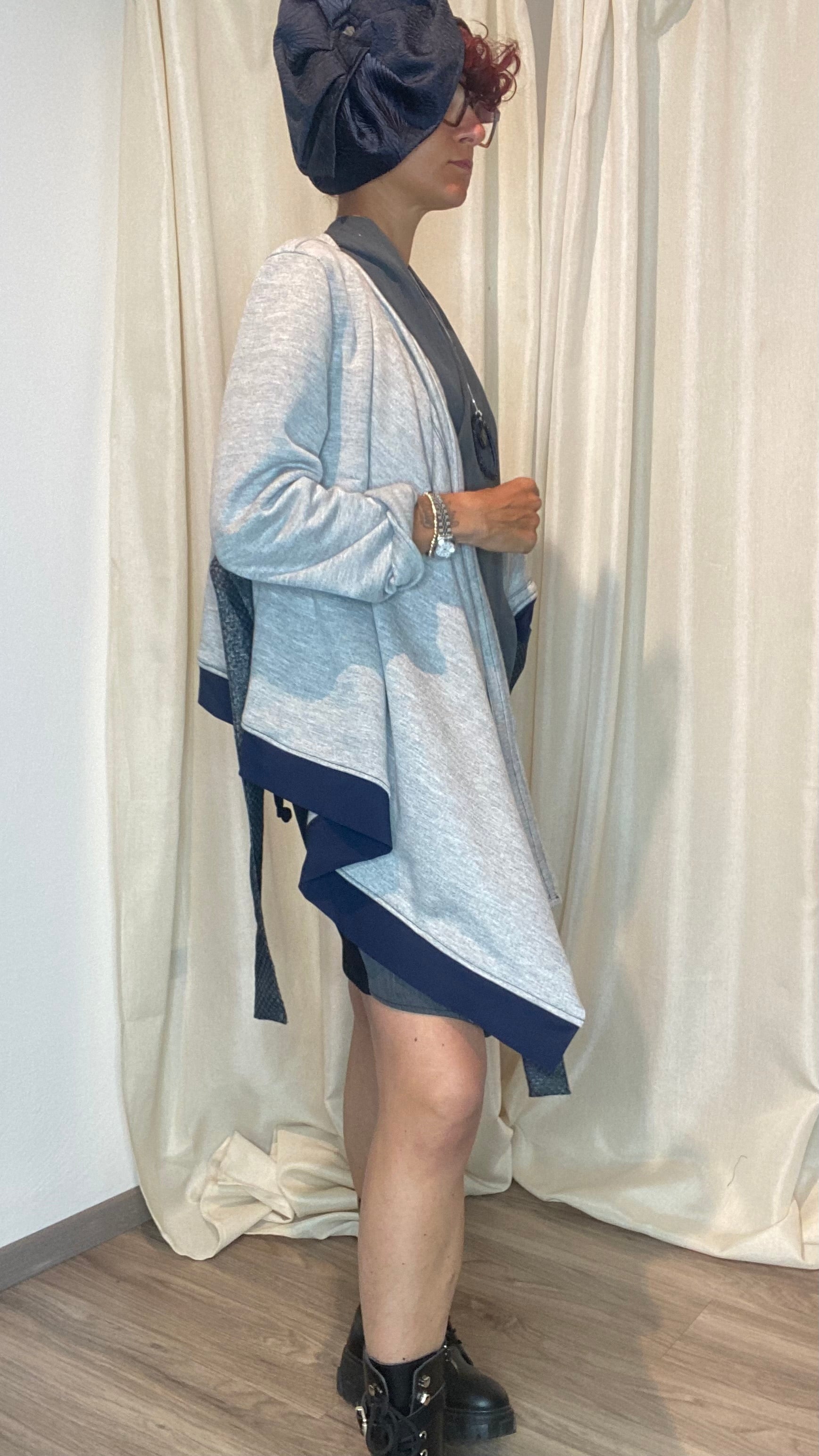 Felpa asimmetrica caldissima, a manica lunga, con chiusura laterale mediante lacci e bordo blu a contrasto. Taglia unica, veste dalla tg 38 alla 50.