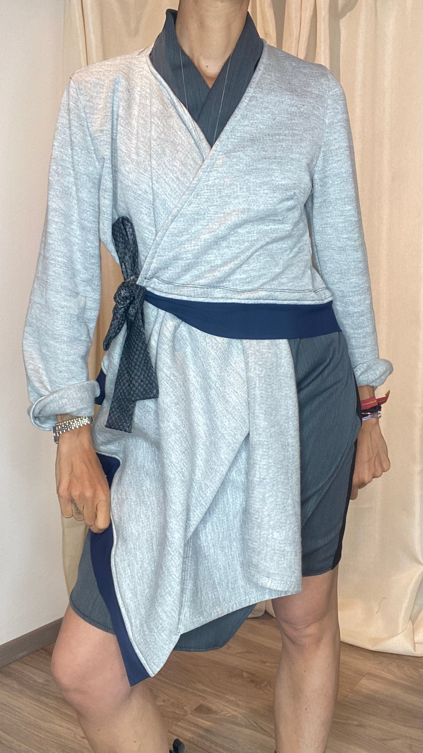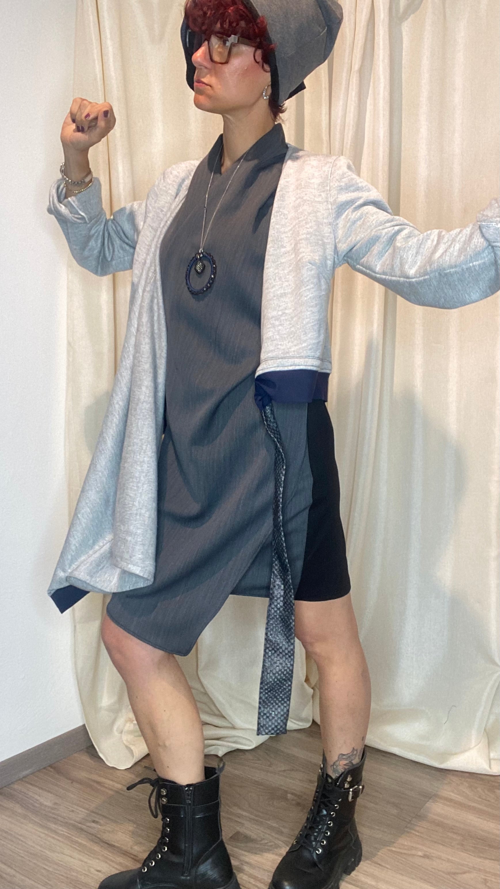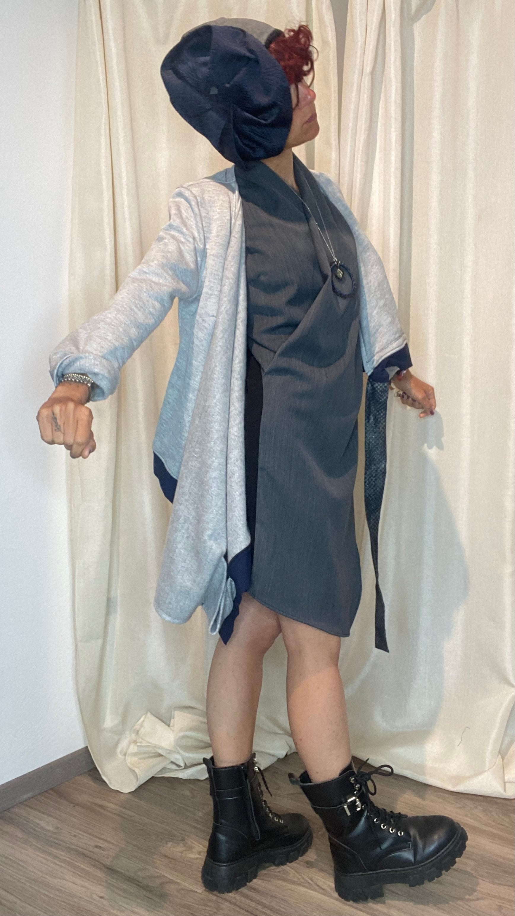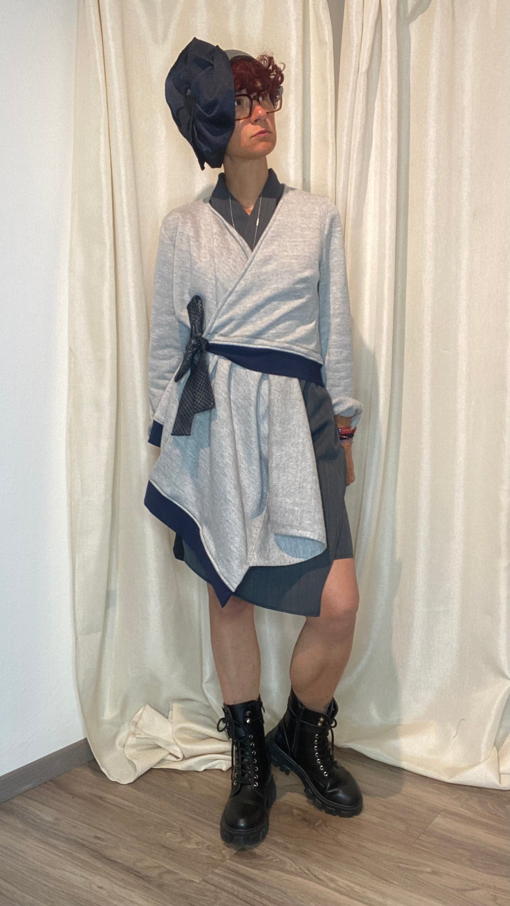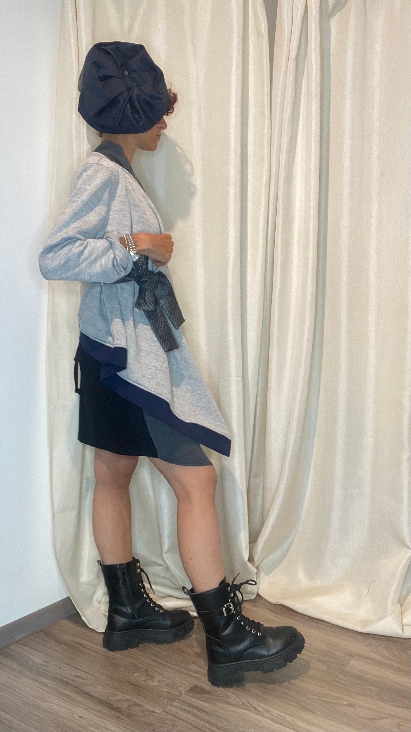 Felpa asimmetrica caldissima, a manica lunga, con chiusura laterale mediante lacci e bordo blu a contrasto. Taglia unica, veste dalla tg 38 alla 50.
