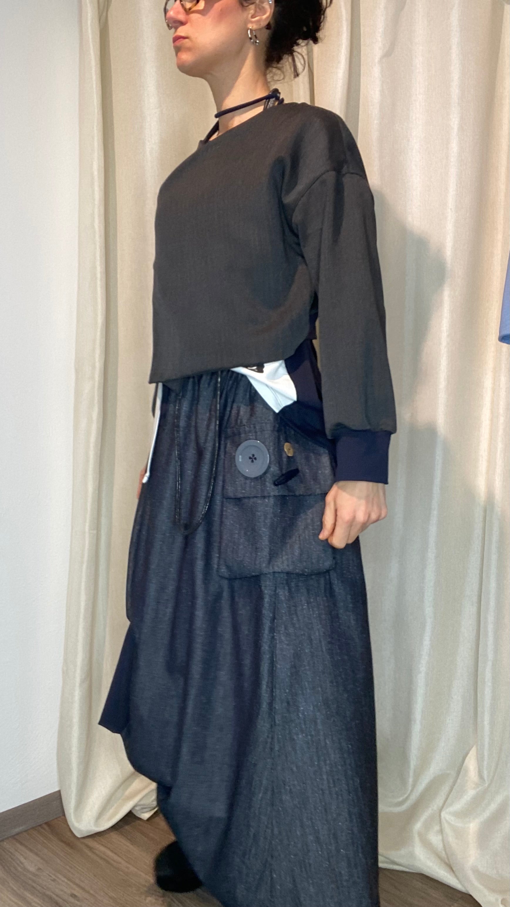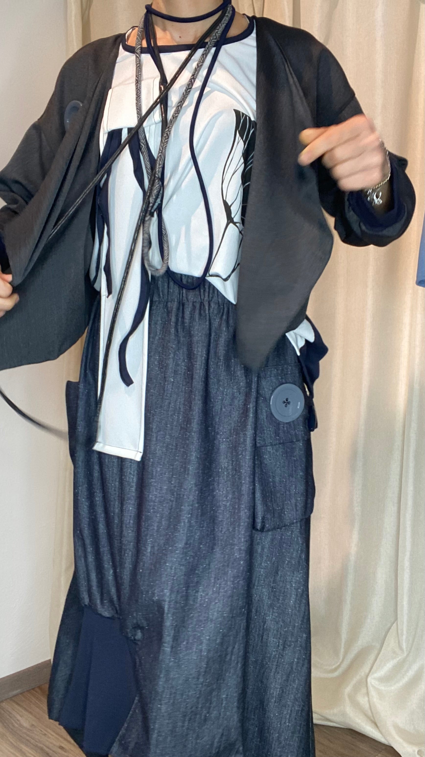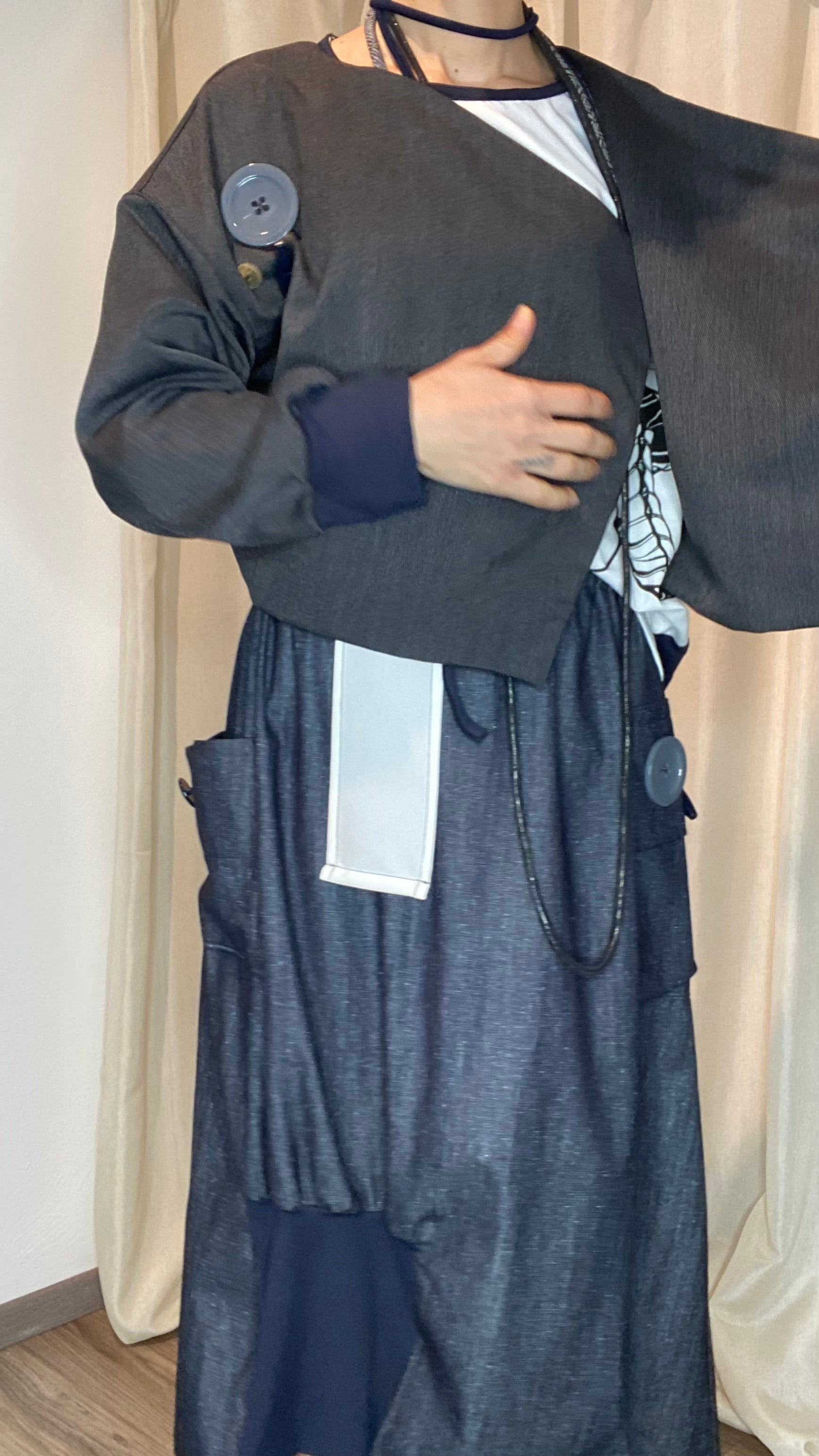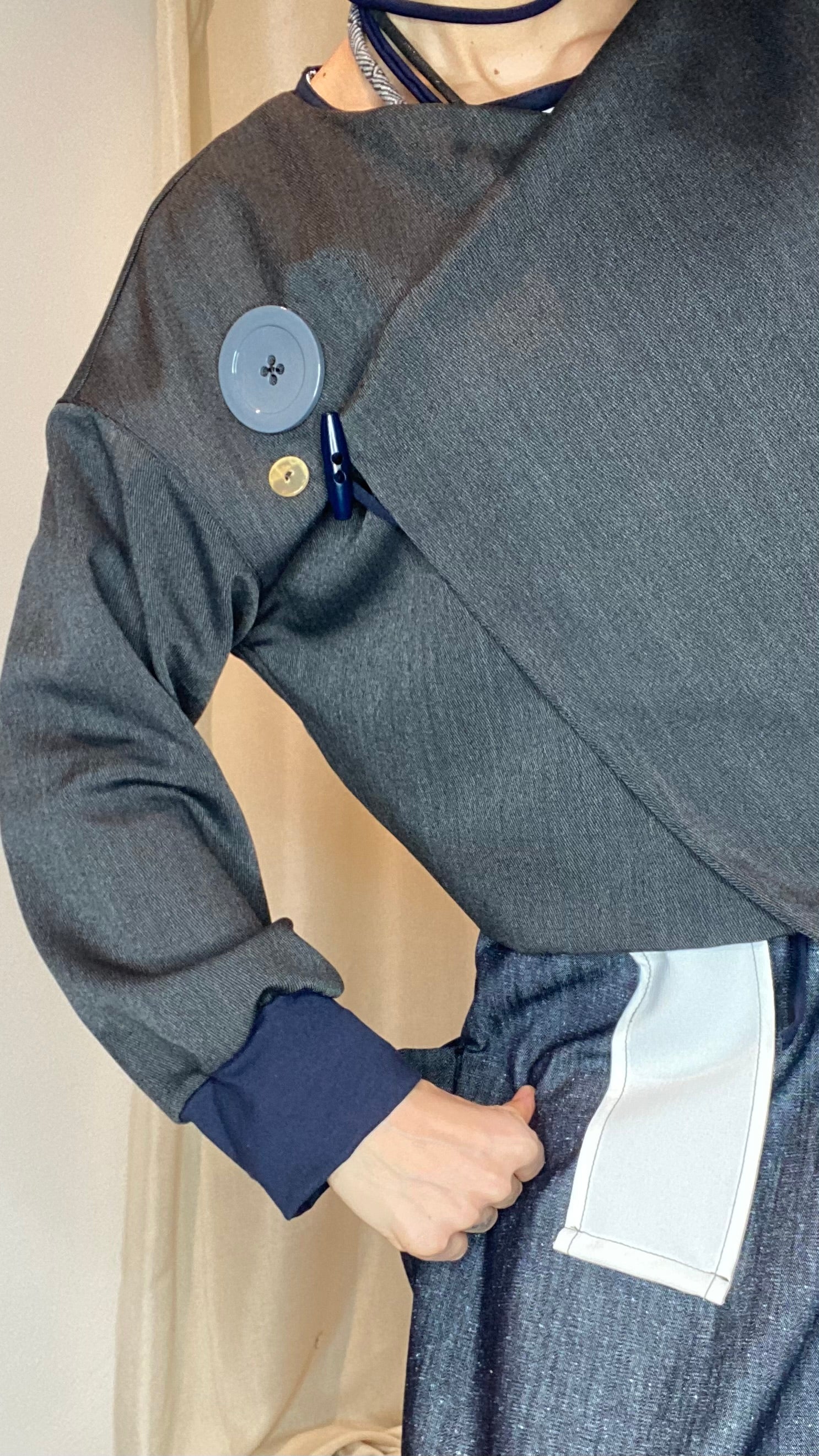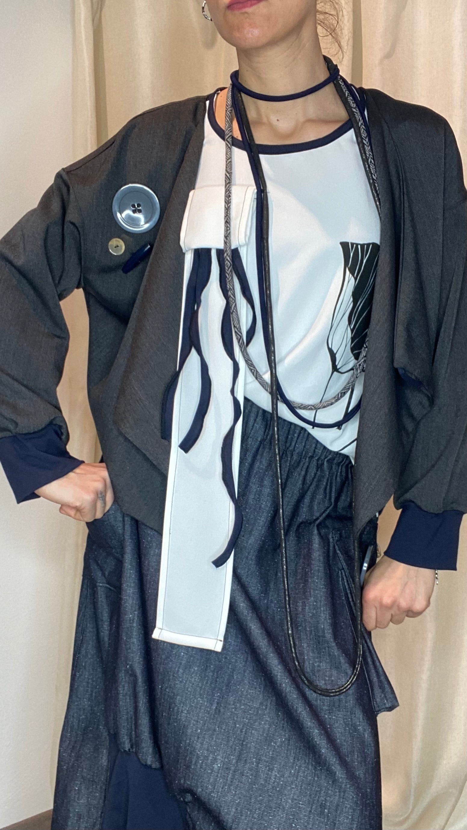 Giacca asimmetrica, con maniche lunghe, bottoni applicati e sbuffo sul dietro. Veste dalla taglia 38 alla taglia 50.