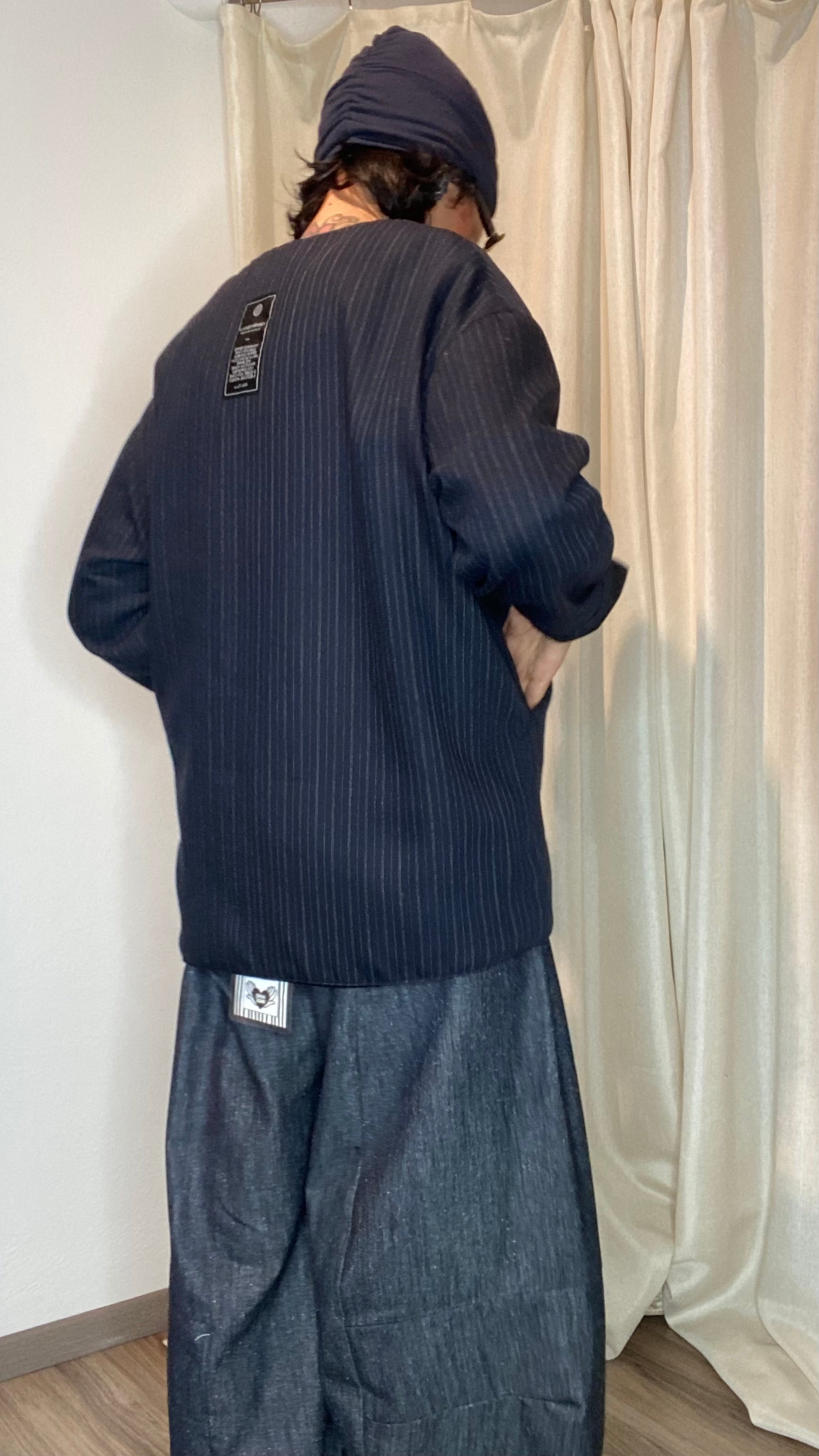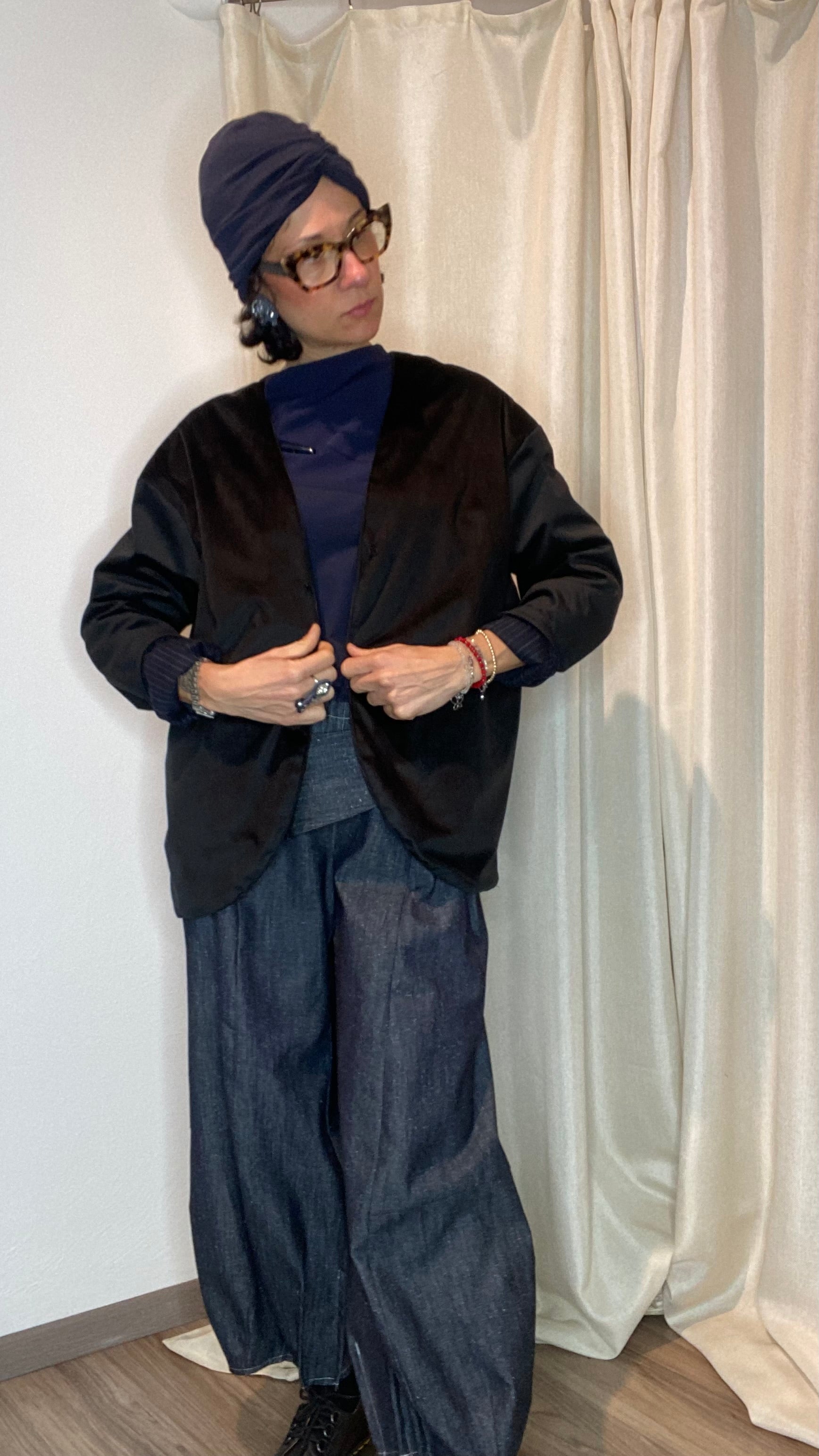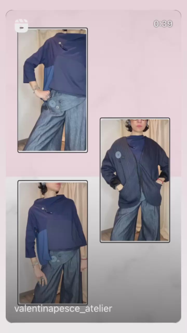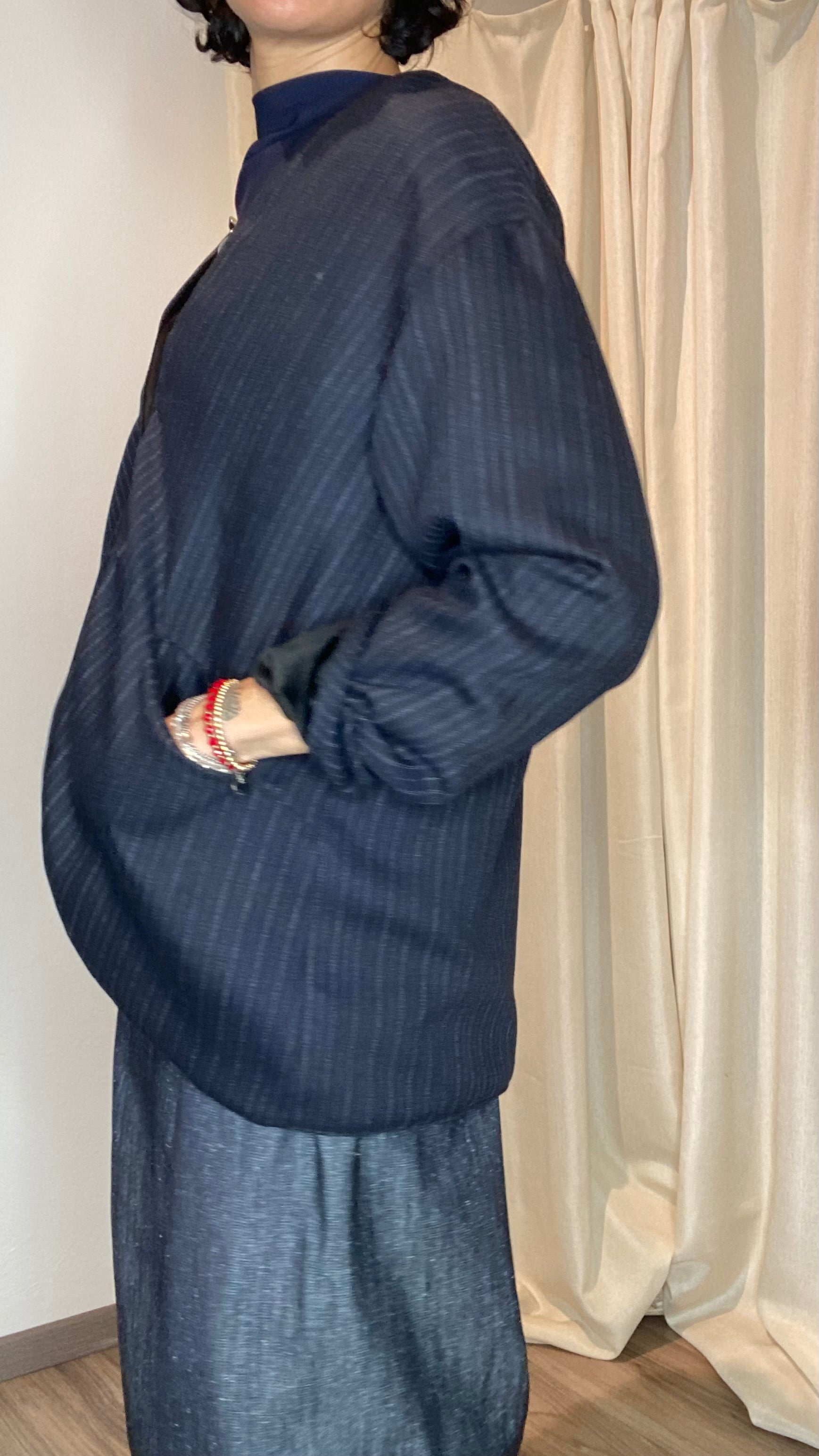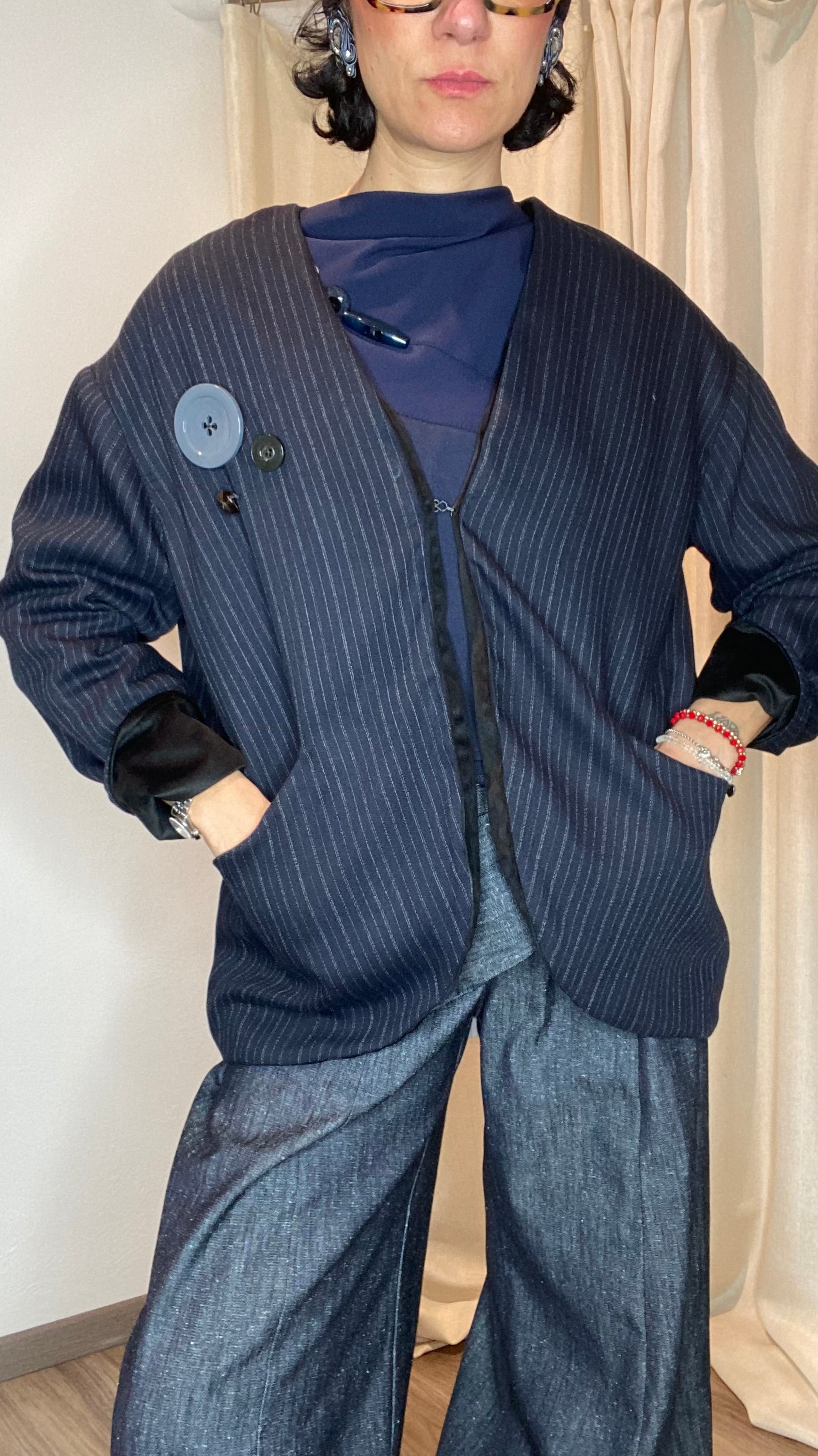 Giacca reversibile un fresco di lana gessato e velluto, con tasche laterali, bottoni applicati e gancetto per chiuderla. Veste dalla taglia 38 alla taglia 50.