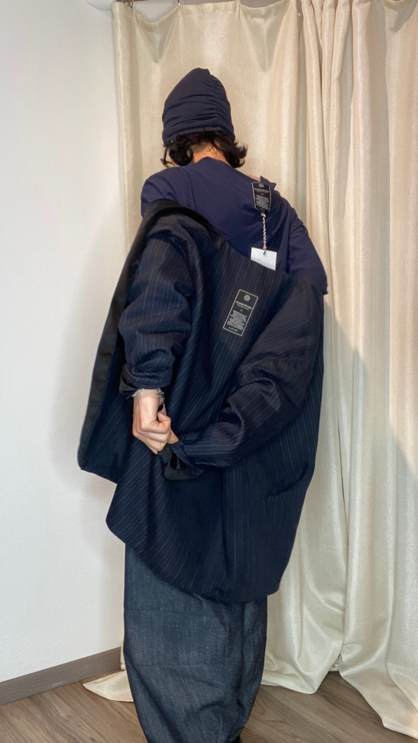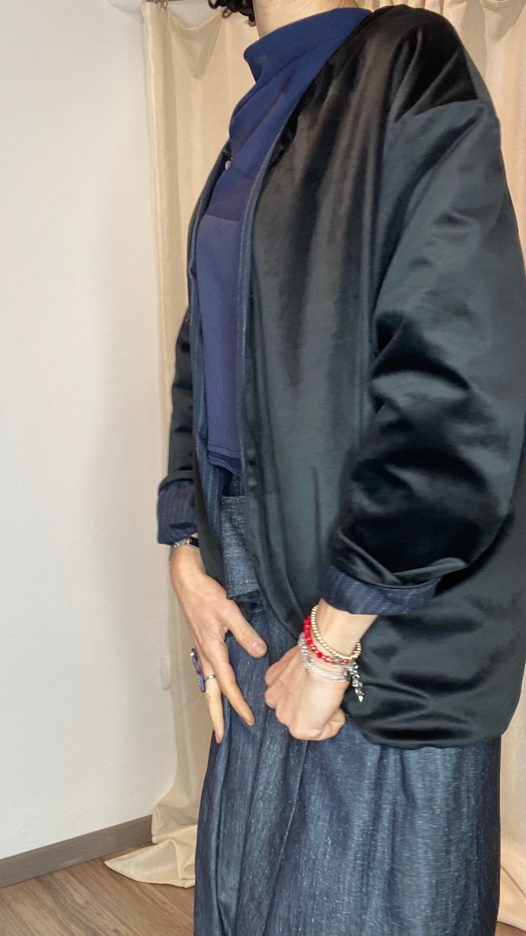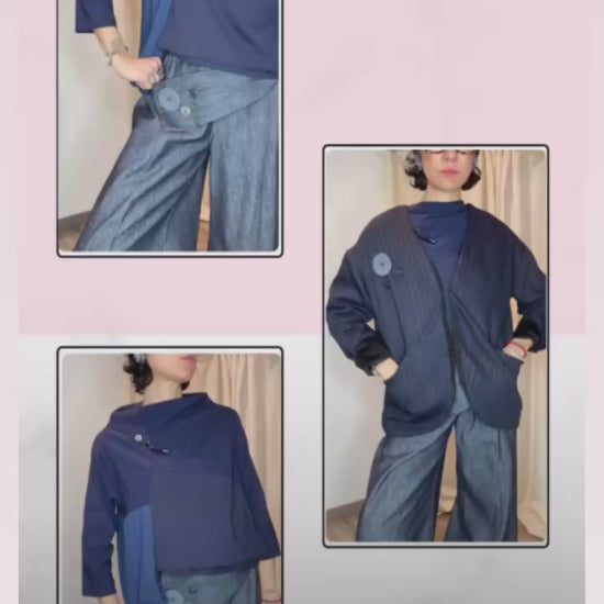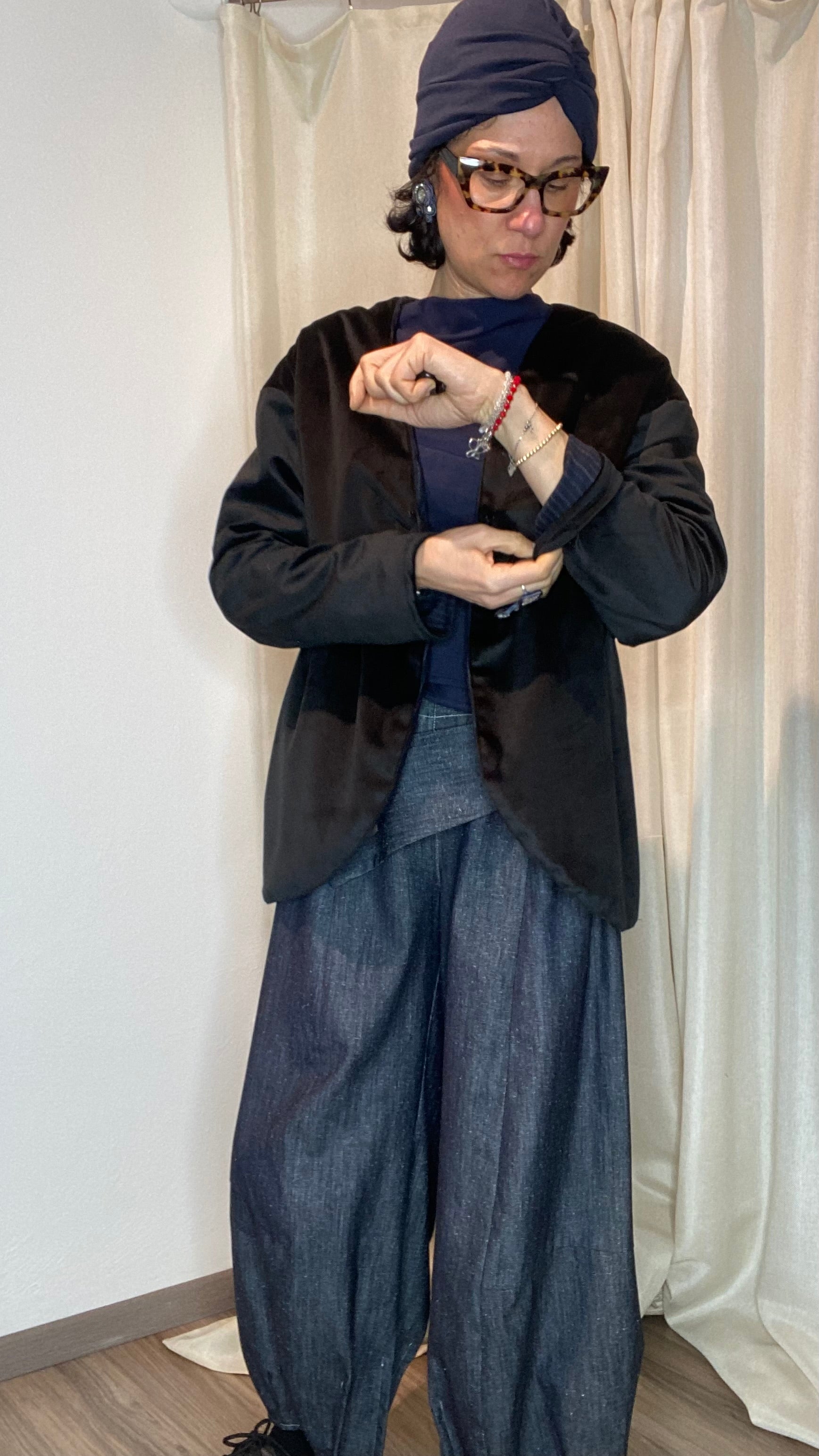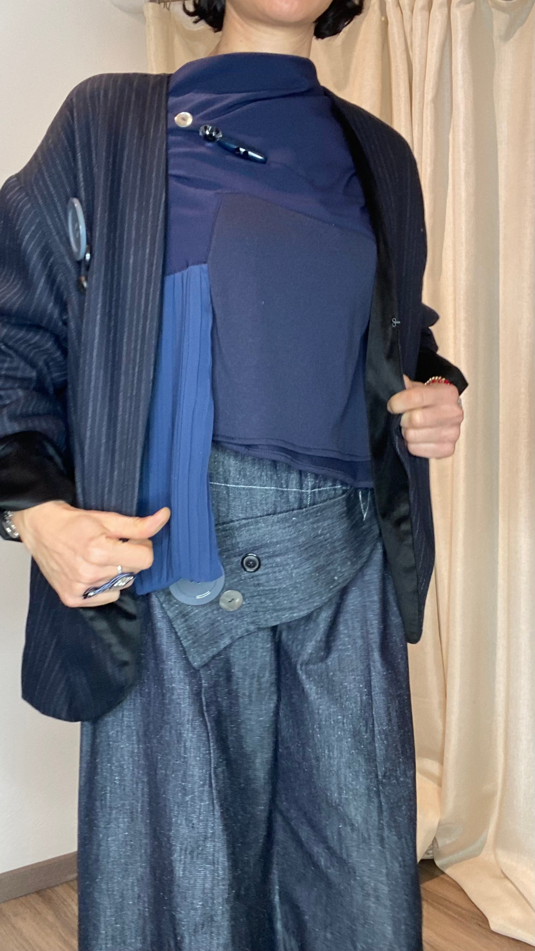 Giacca reversibile un fresco di lana gessato e velluto, con tasche laterali, bottoni applicati e gancetto per chiuderla. Veste dalla taglia 38 alla taglia 50.