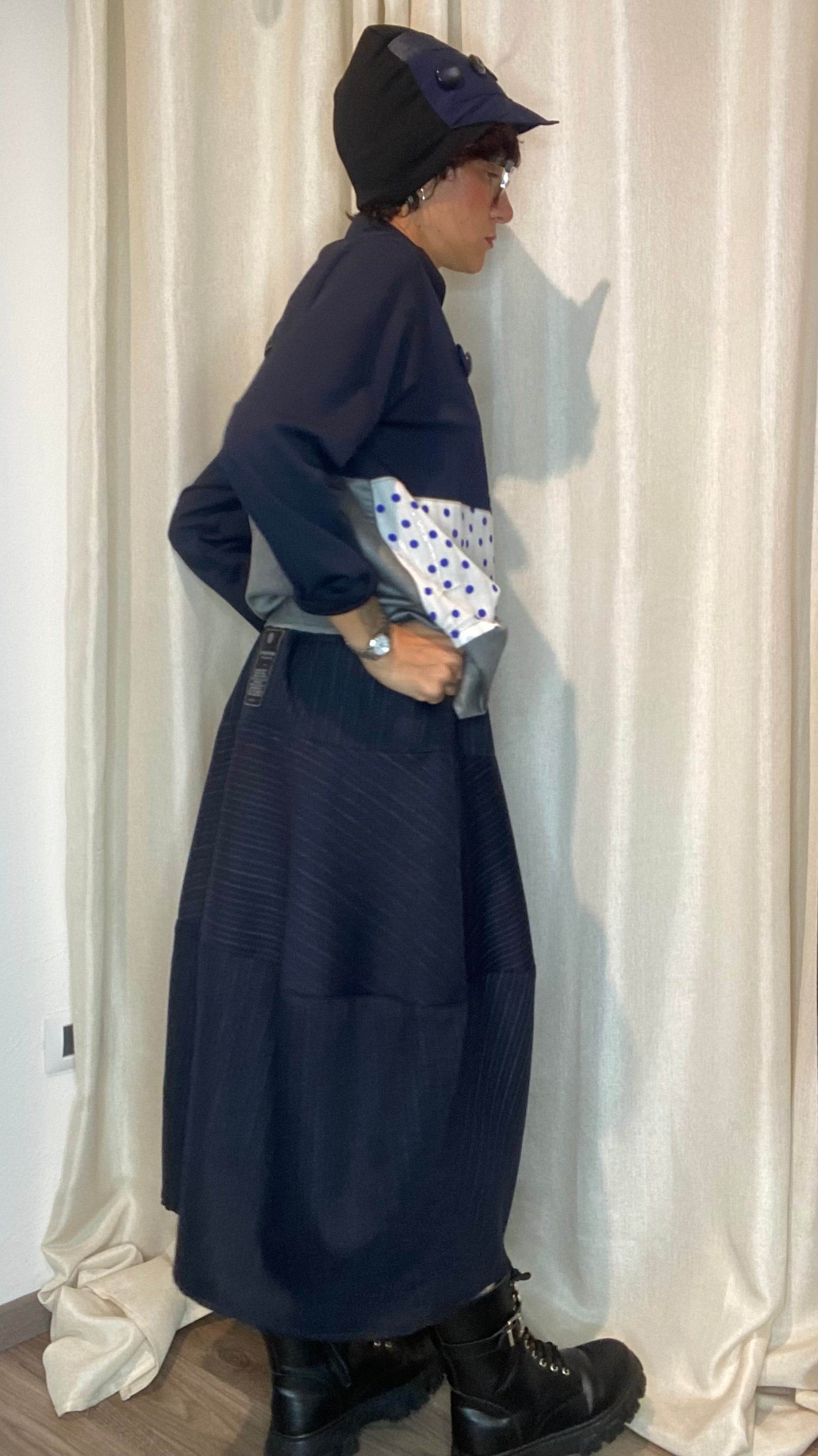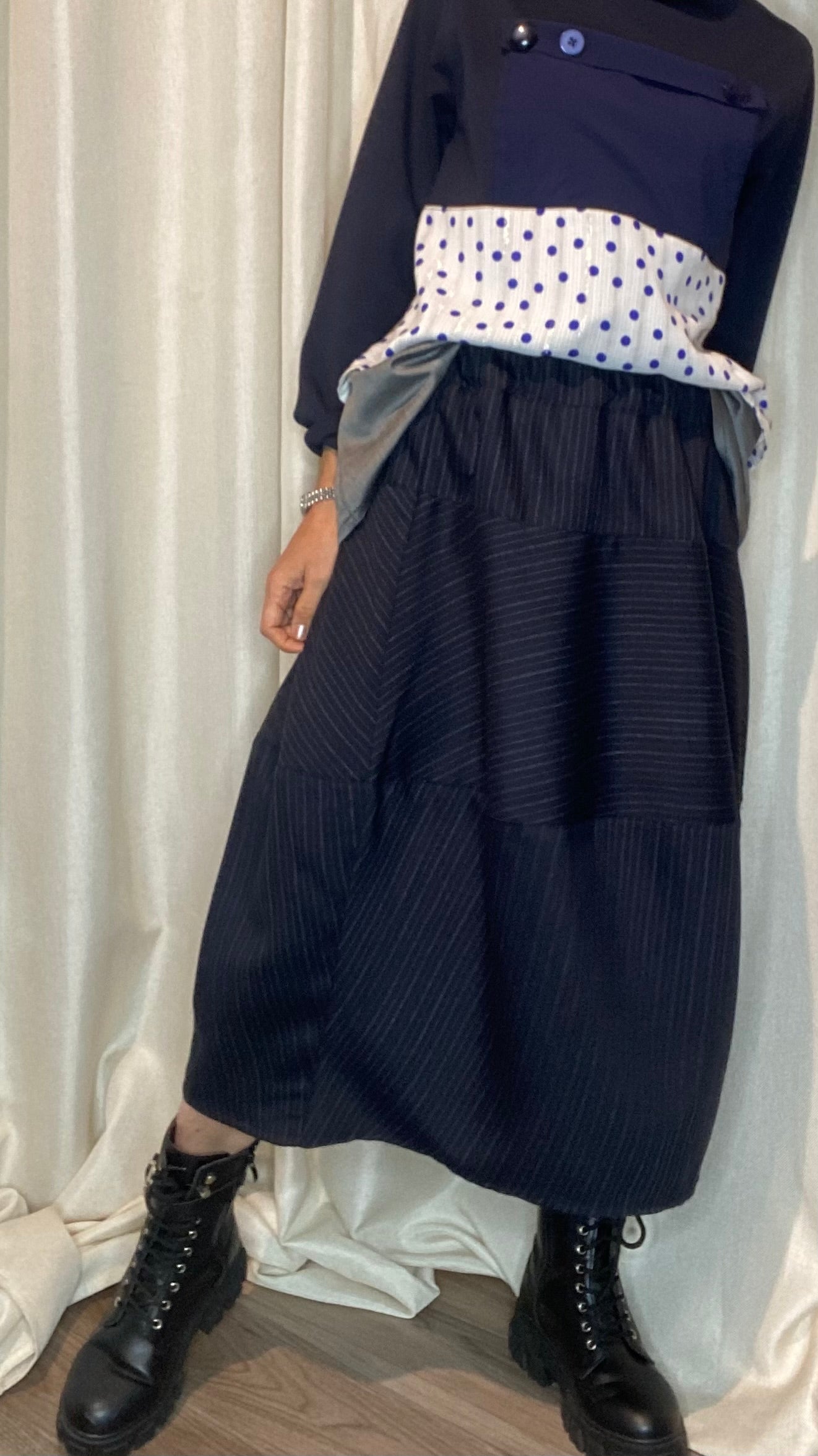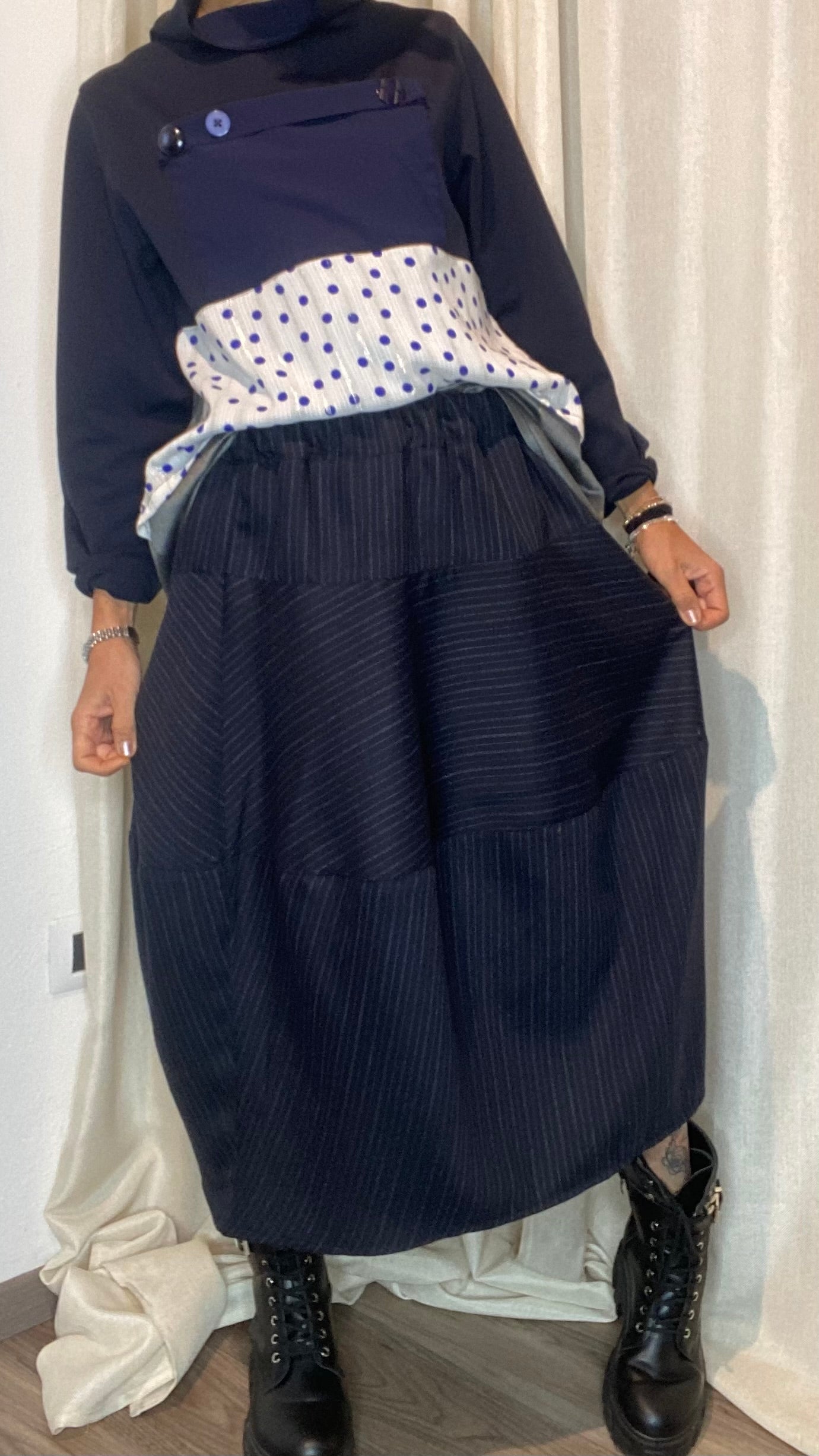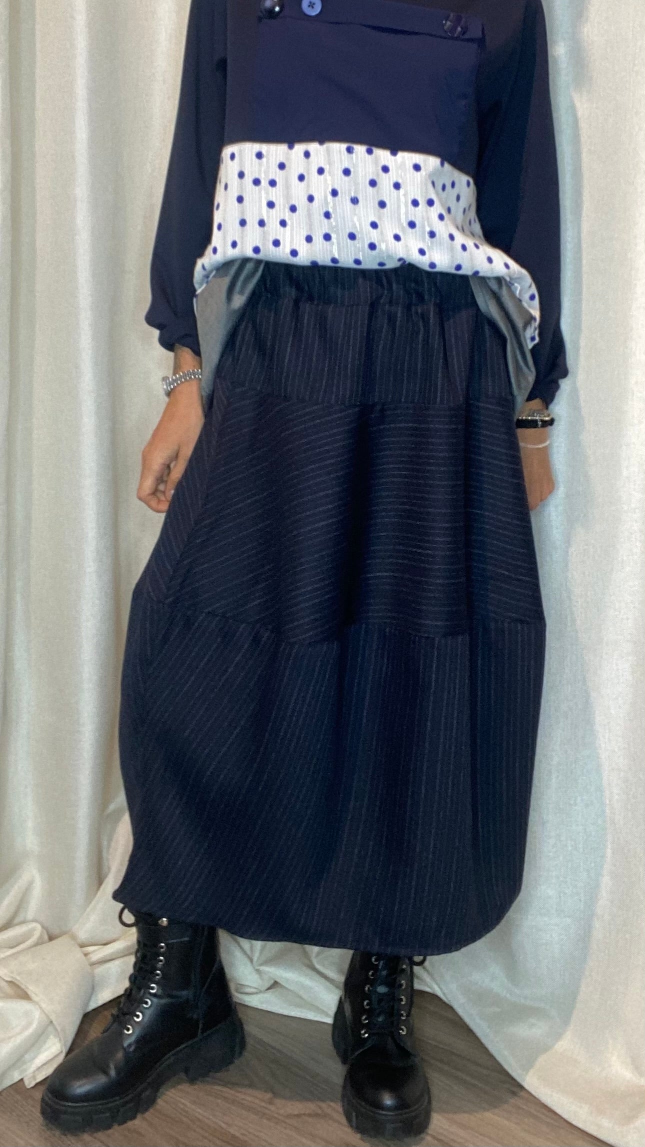 Gonnellone in lana gessata, a balze e con elastico piatto in vita. Taglia unica, veste dalla tg 38 alla tg 50.