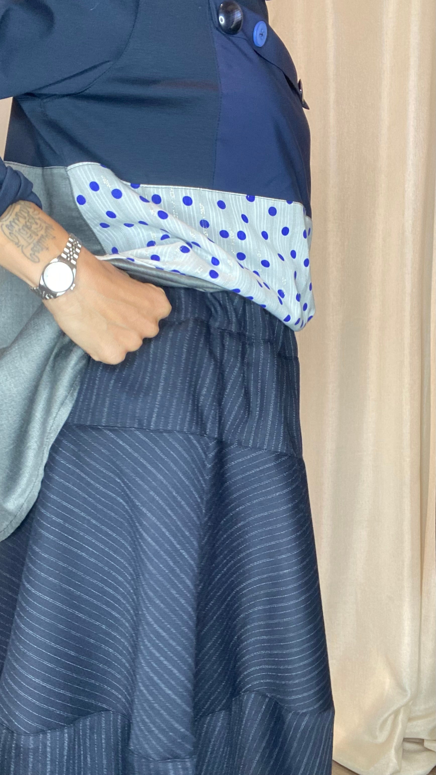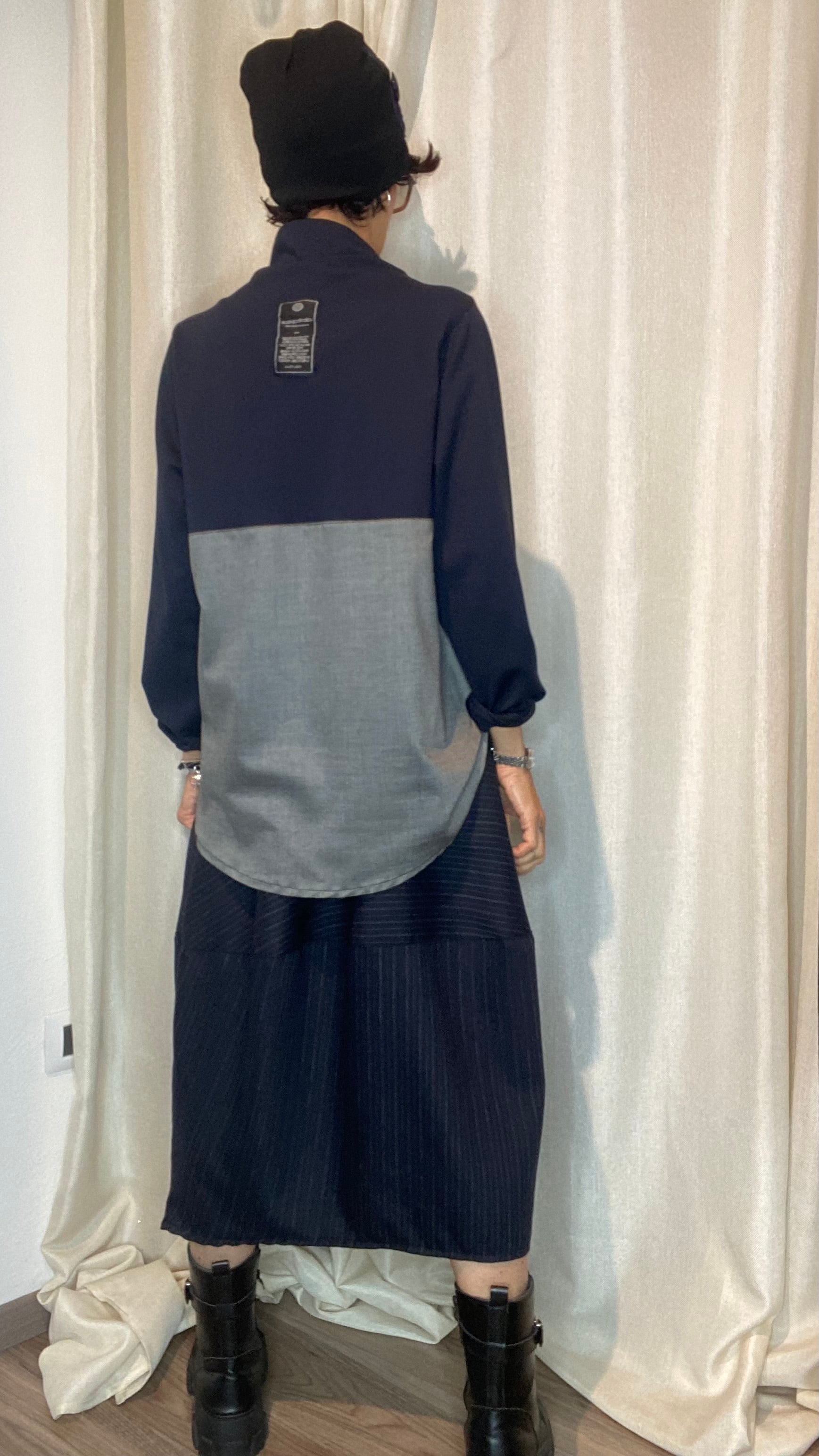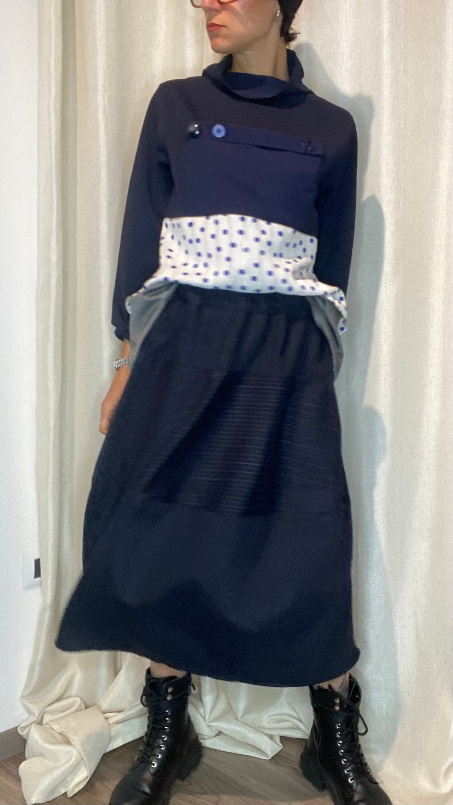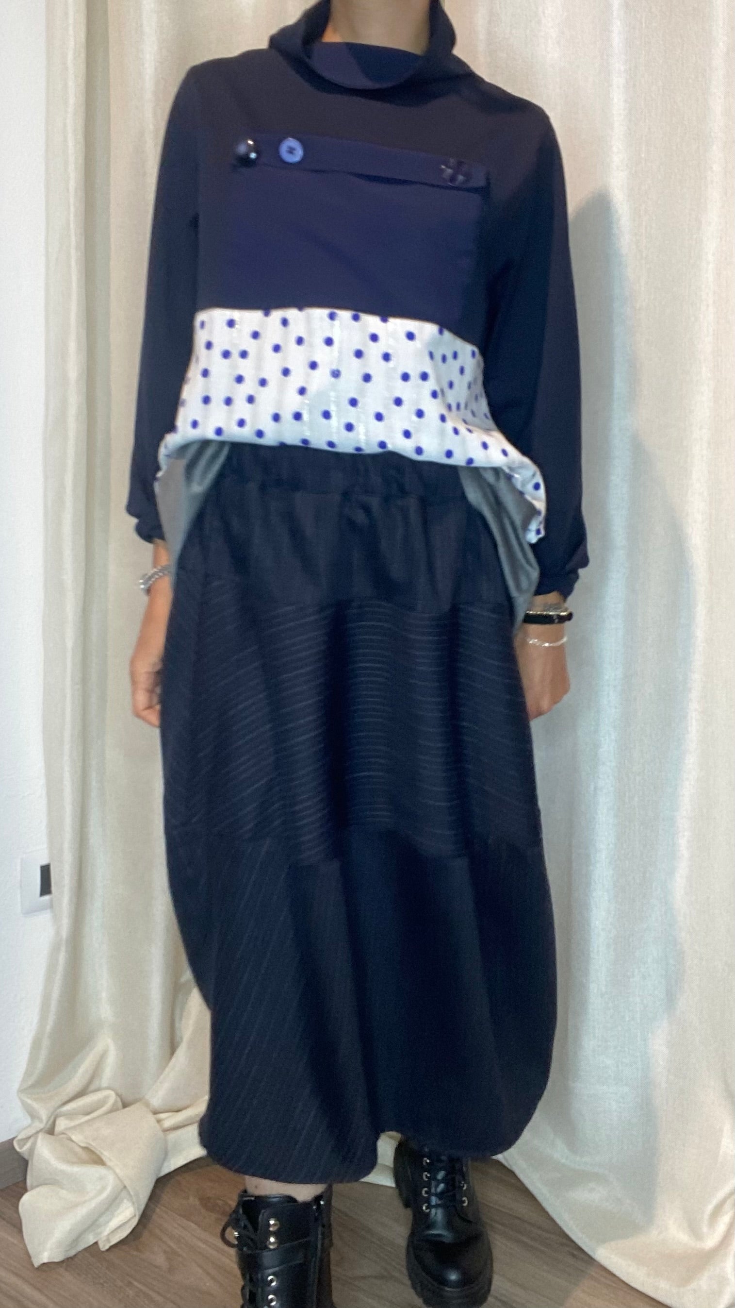 Gonnellone in lana gessata, a balze e con elastico piatto in vita. Taglia unica, veste dalla tg 38 alla tg 50.