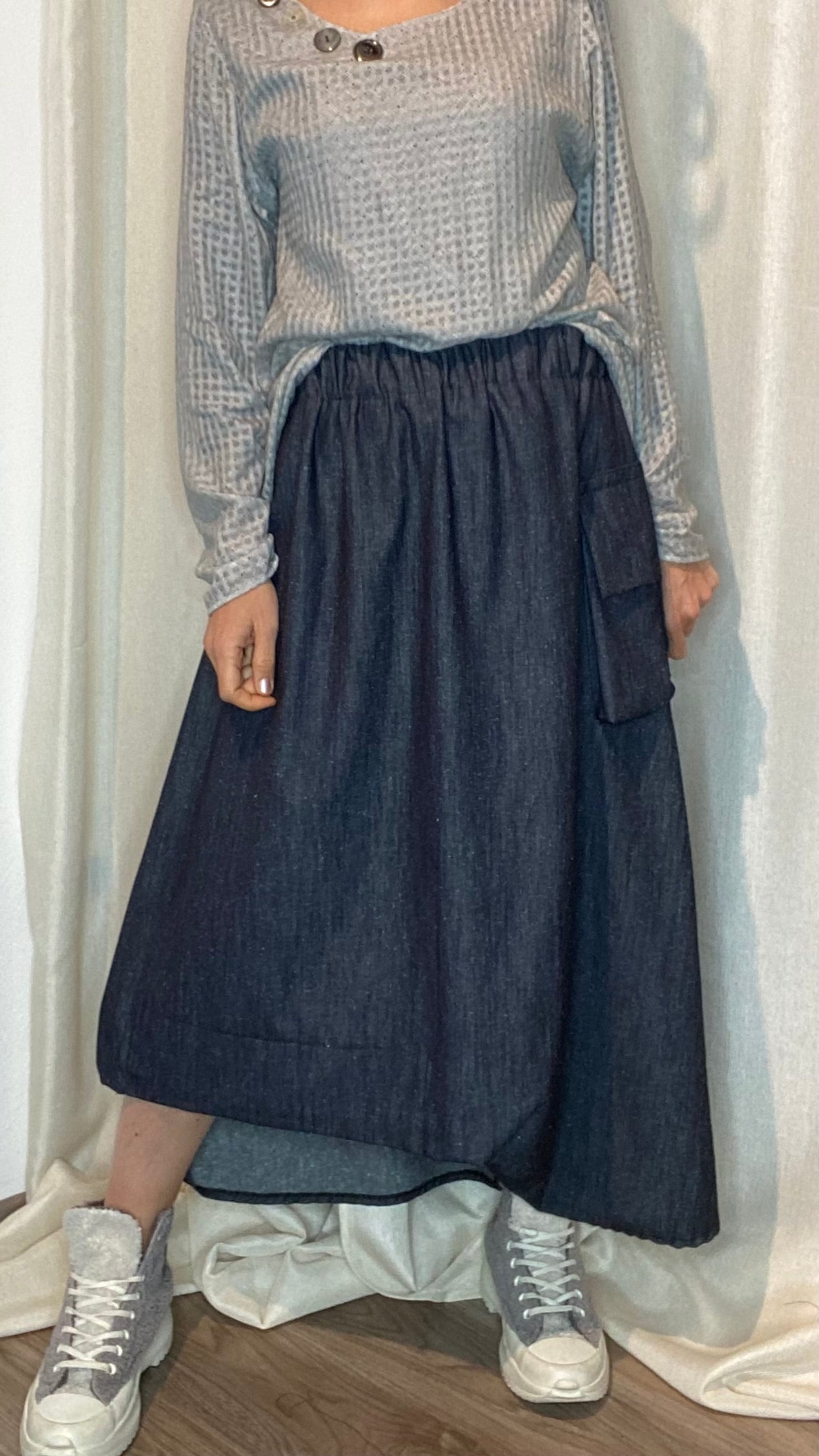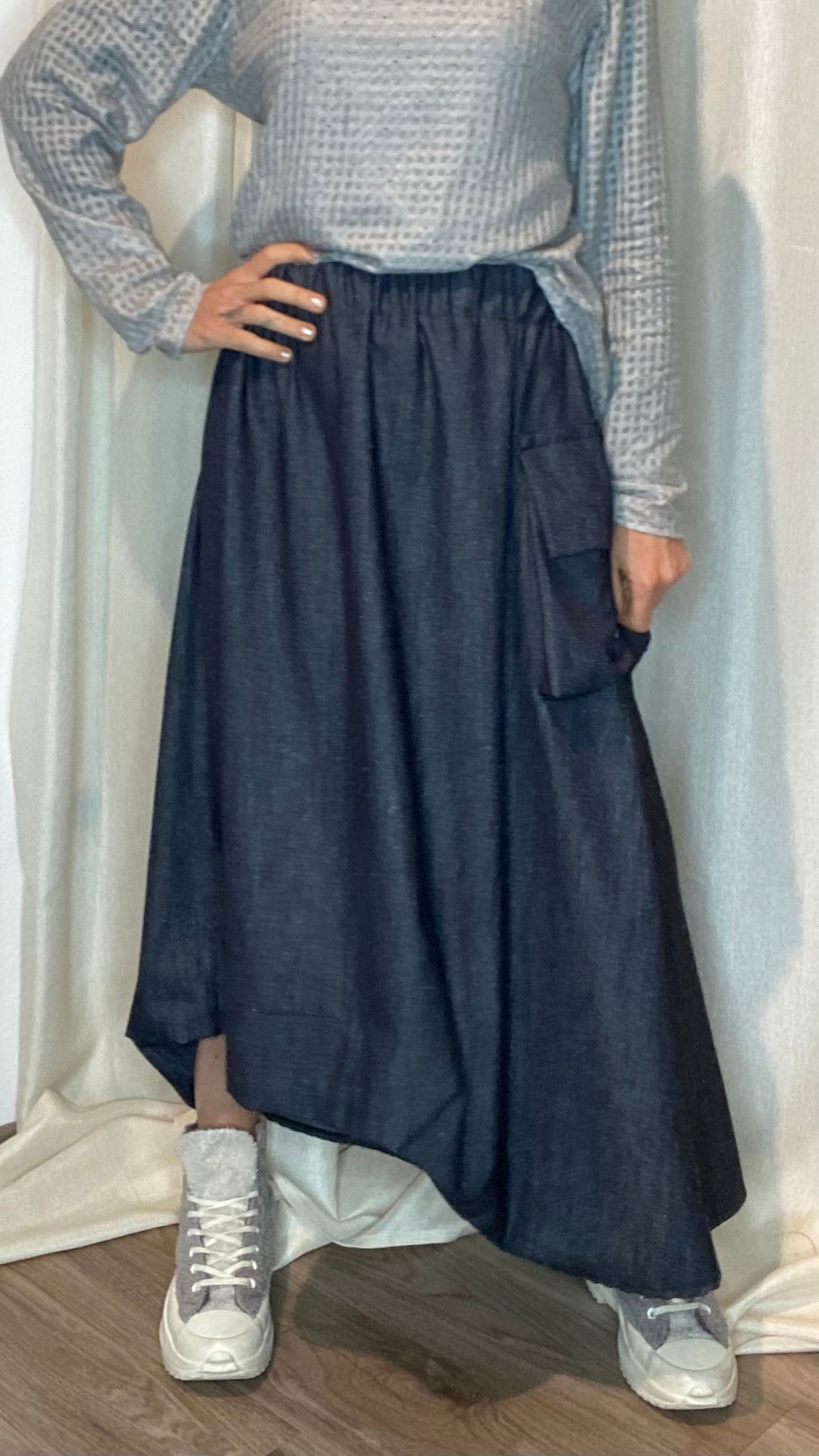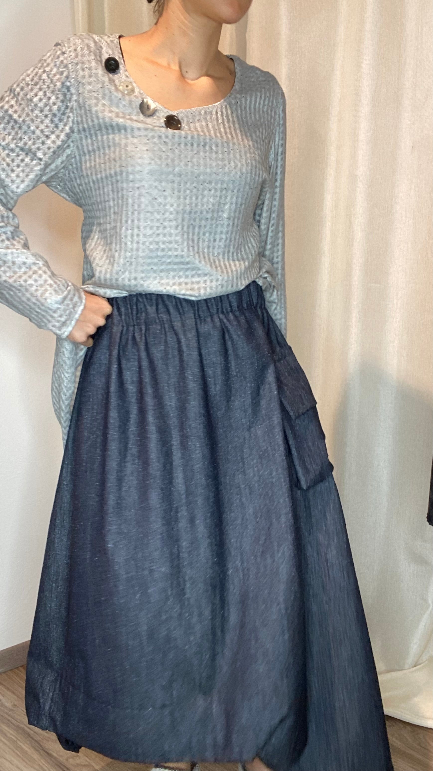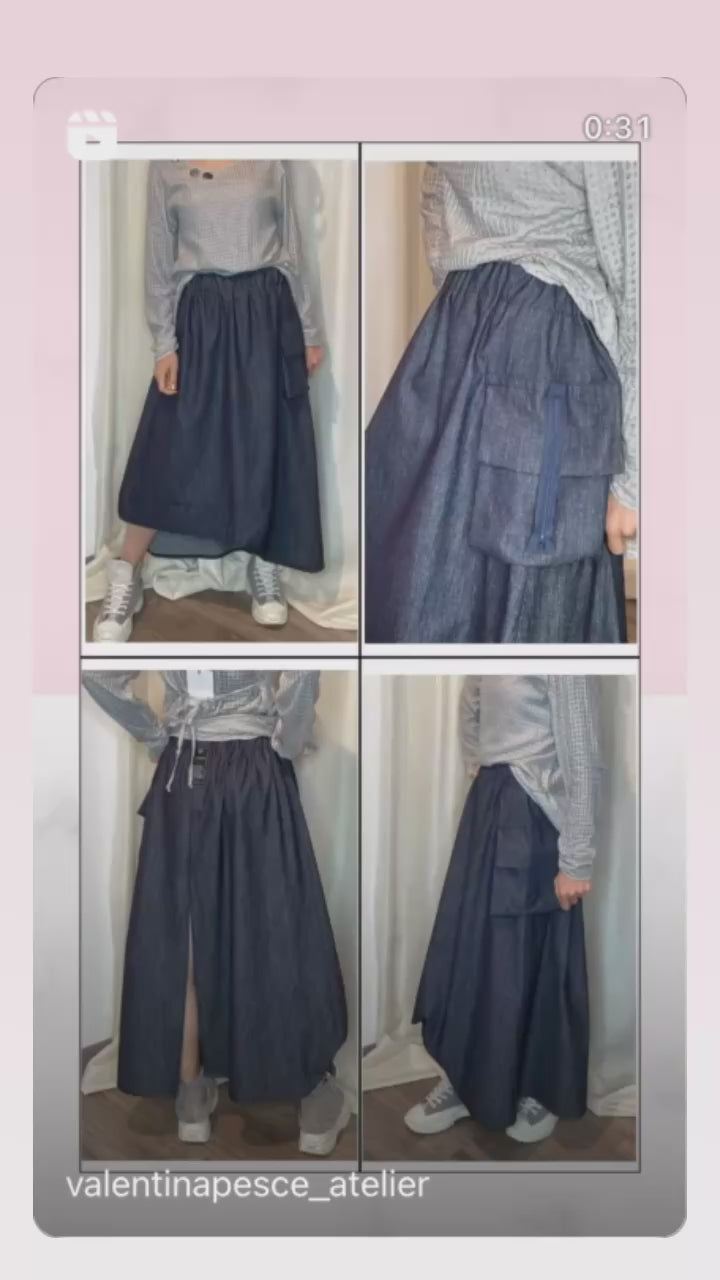 Gonna in jeans di cotone con elastico piatto in vita, tasca laterale, spacco sul dietro e drappeggio sul fondo. Taglia unica, veste dalla tg 38 alla tg 50.