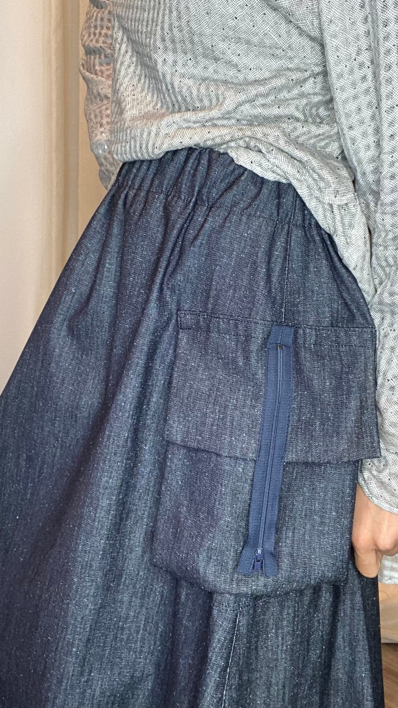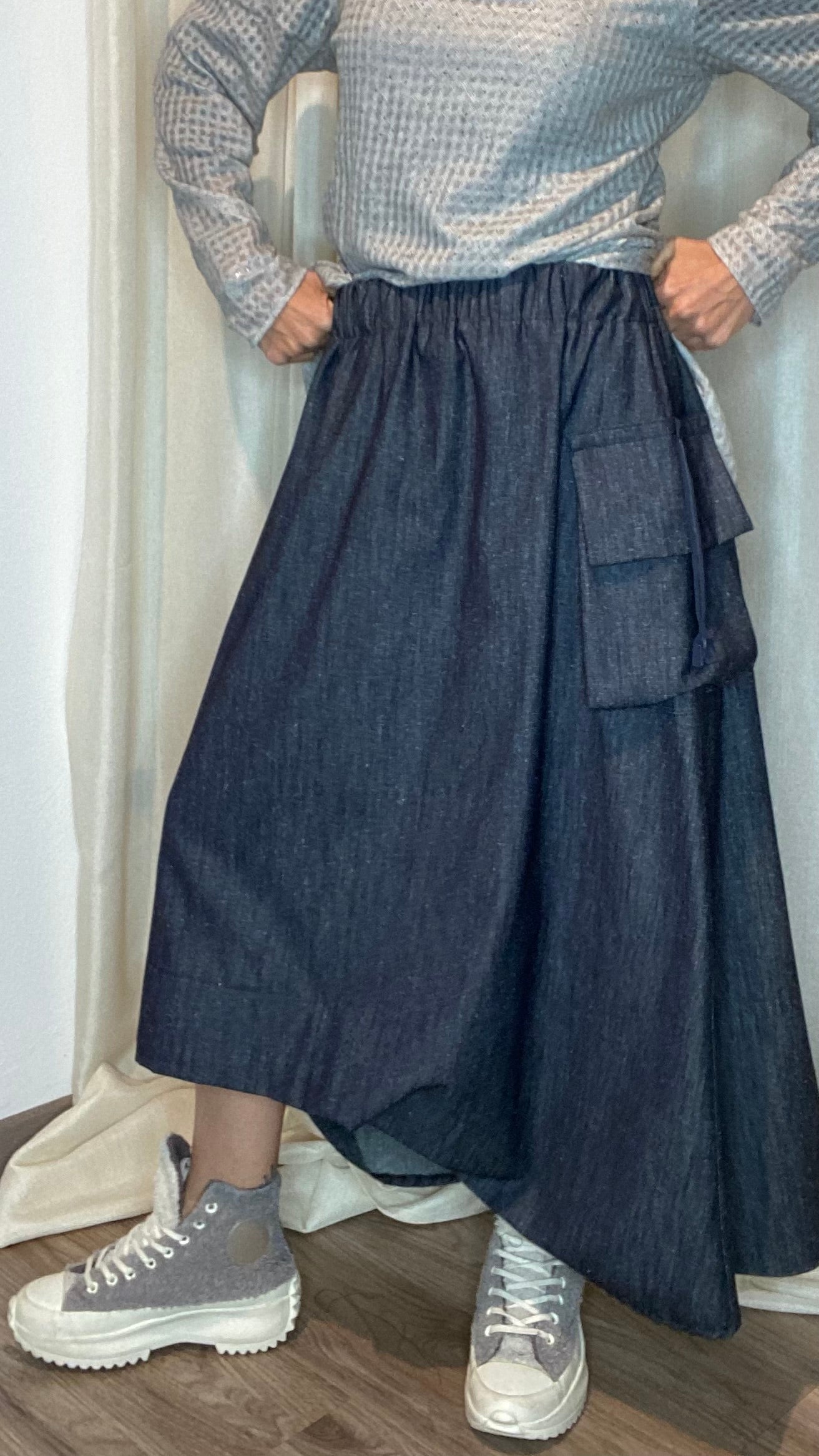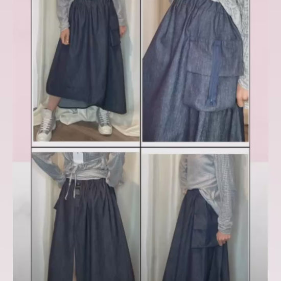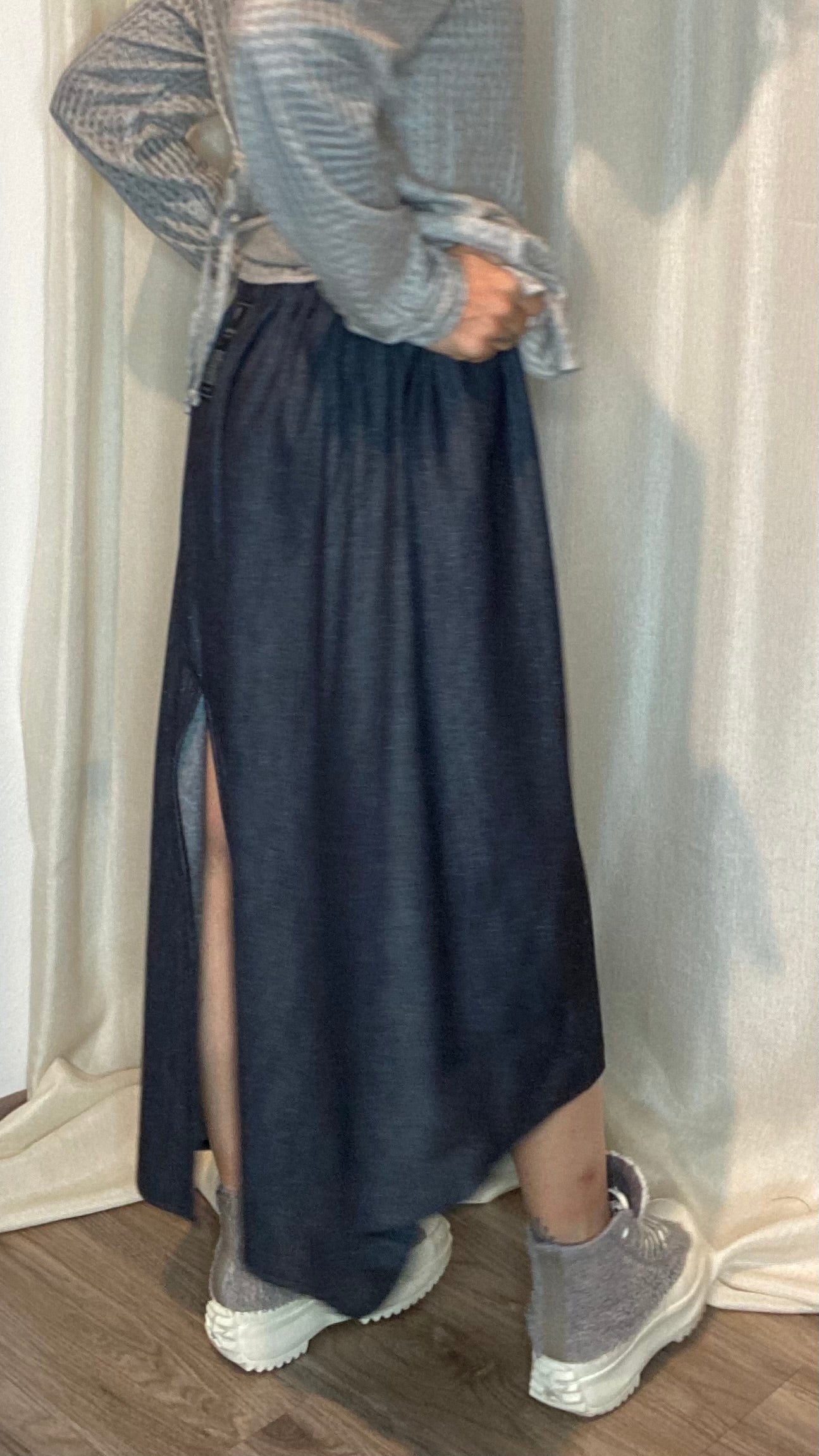 Gonna in jeans di cotone con elastico piatto in vita, tasca laterale, spacco sul dietro e drappeggio sul fondo. Taglia unica, veste dalla tg 38 alla tg 50.