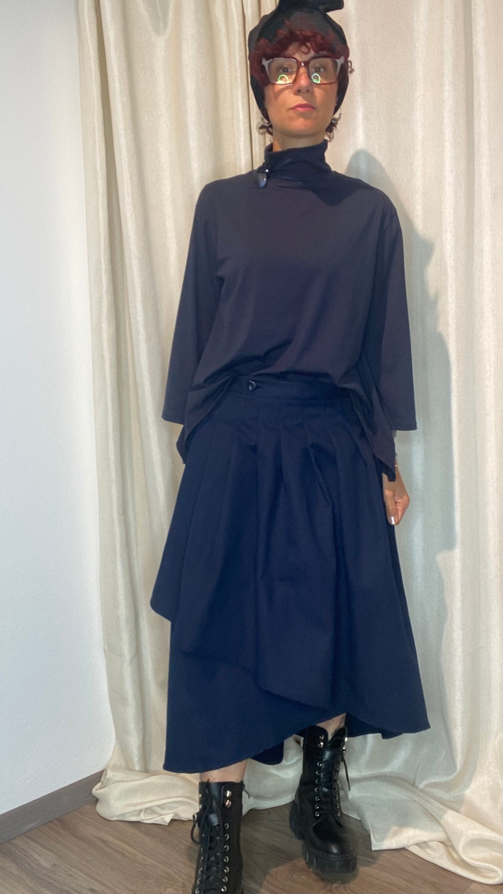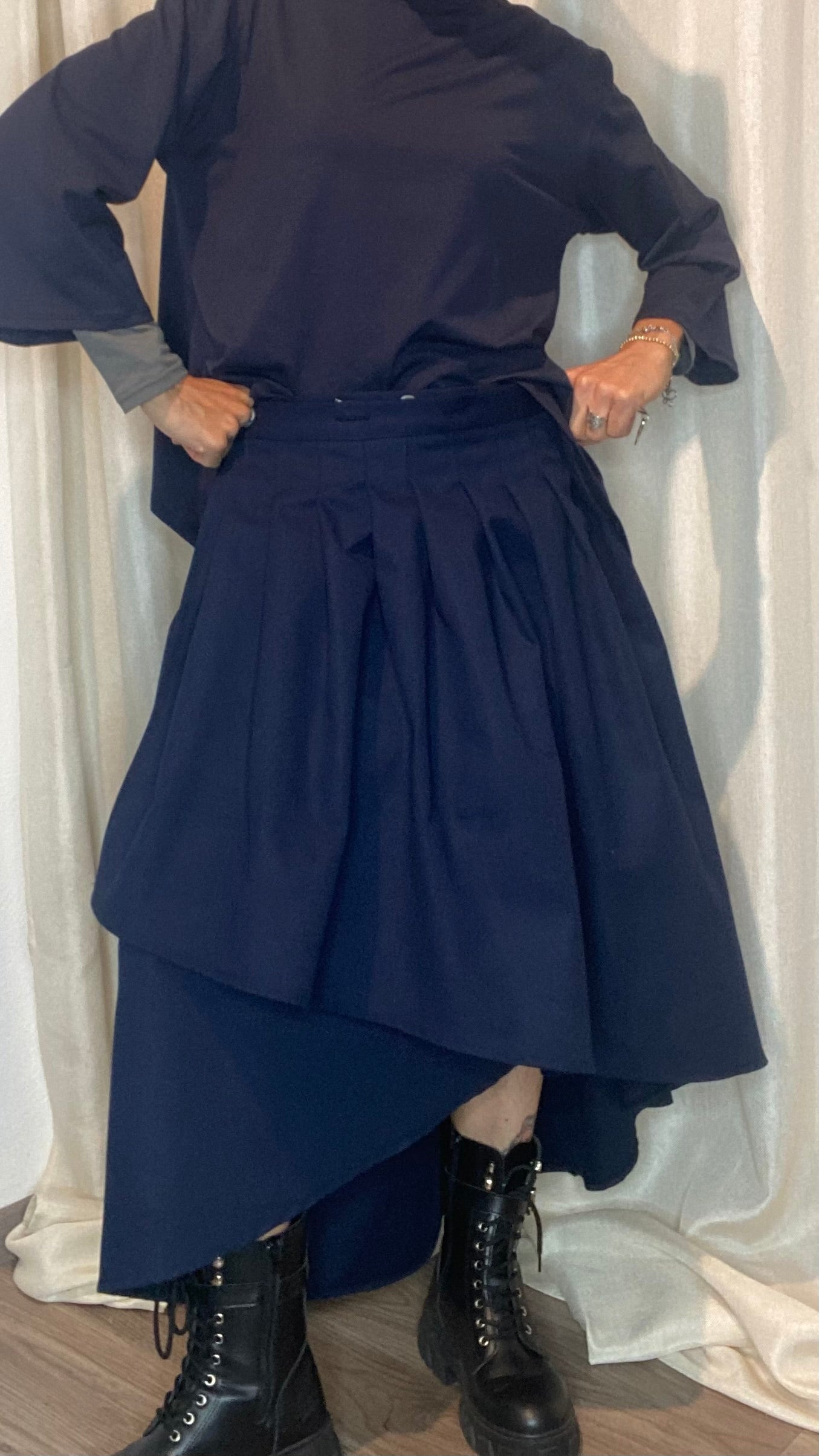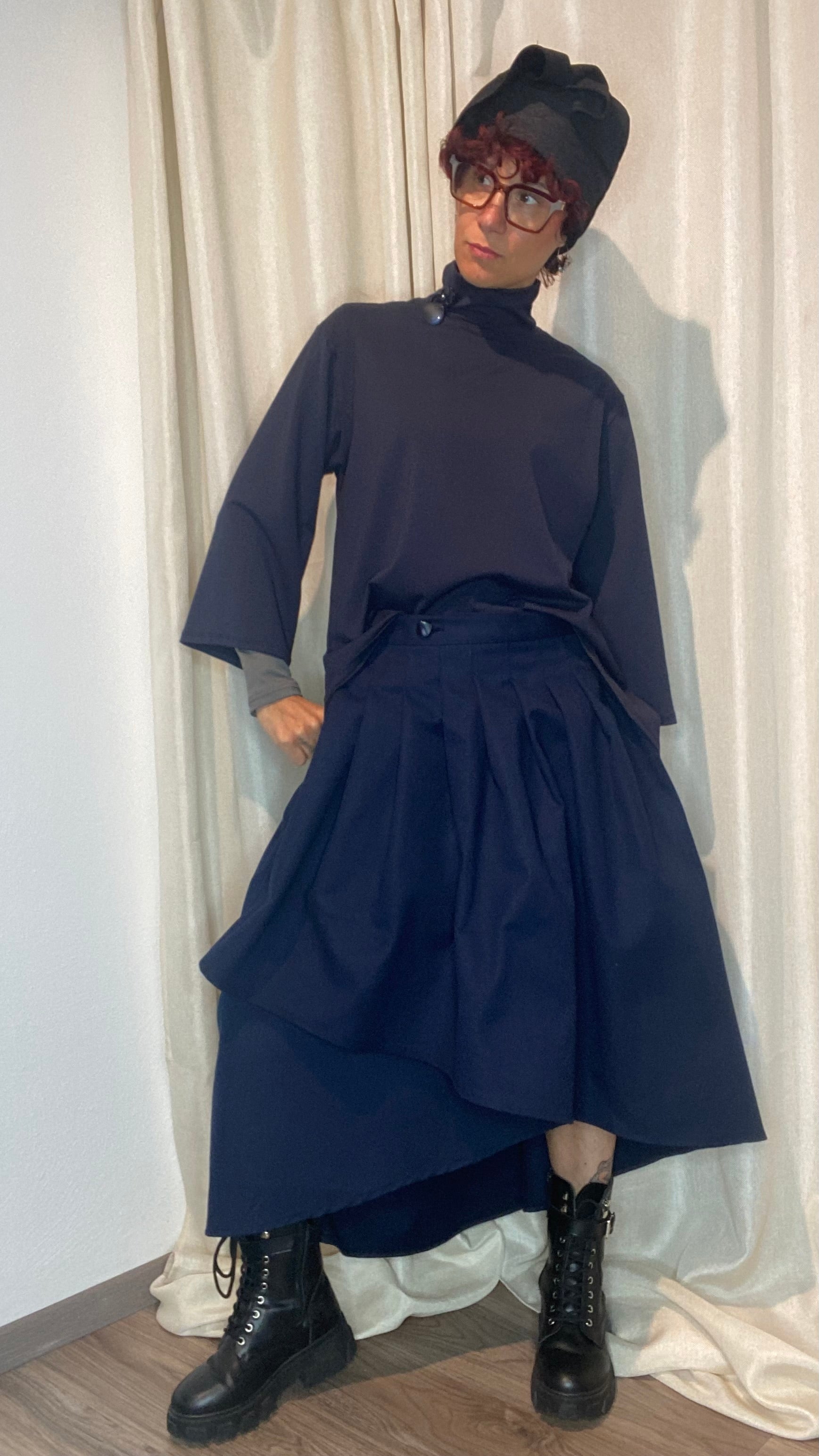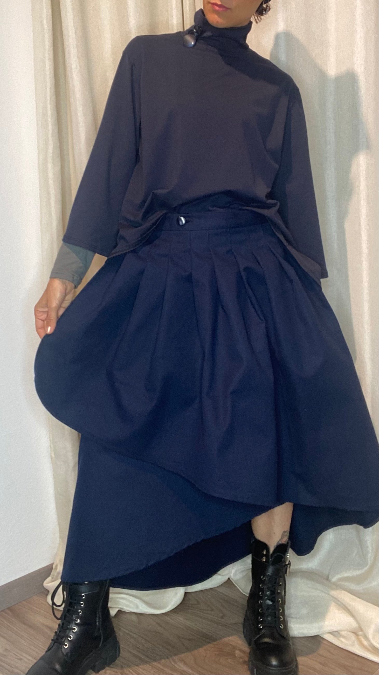 Gonna asimmetrica a pieghe in cotone pesante, con regolazione in vita mediante botyoni. Taglia unica, veste dalla tg 38 alla tg 50.