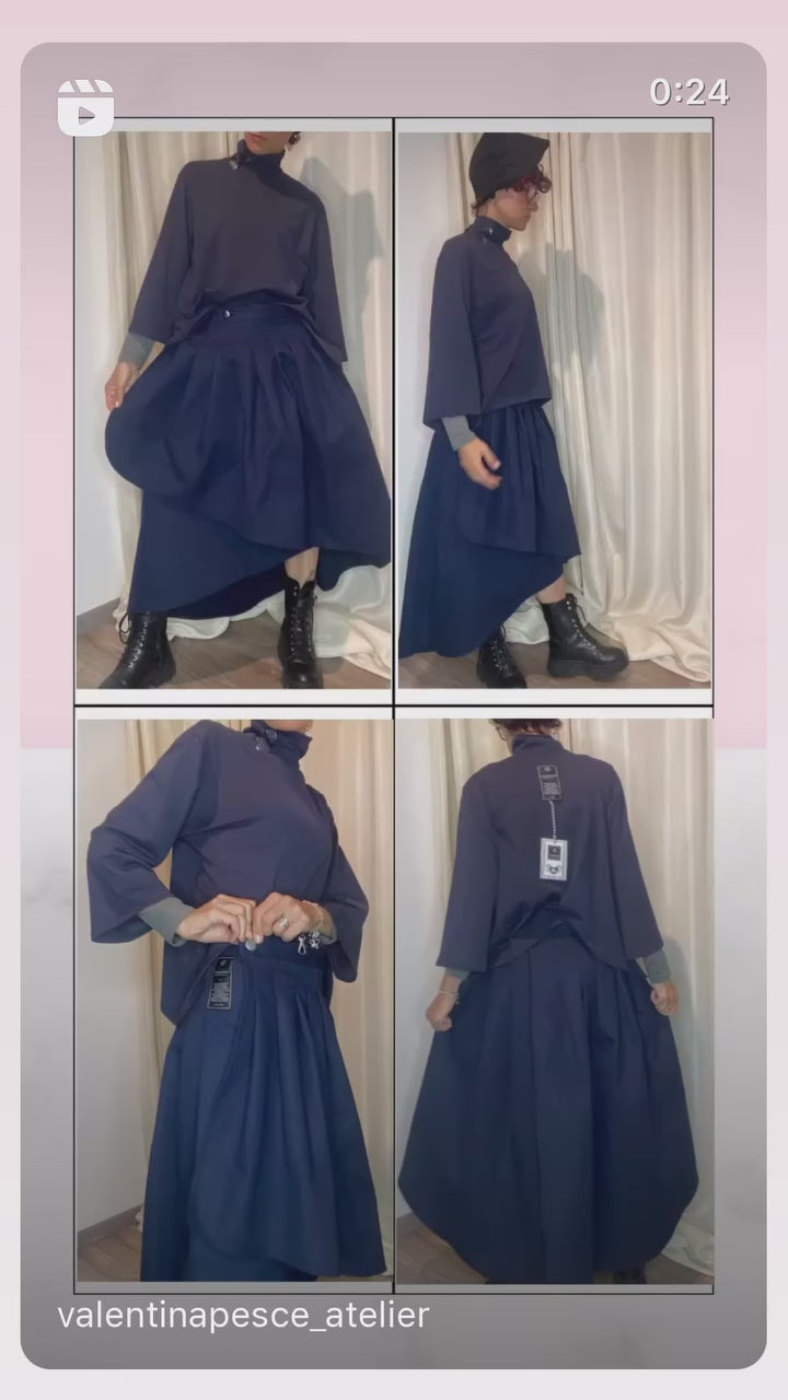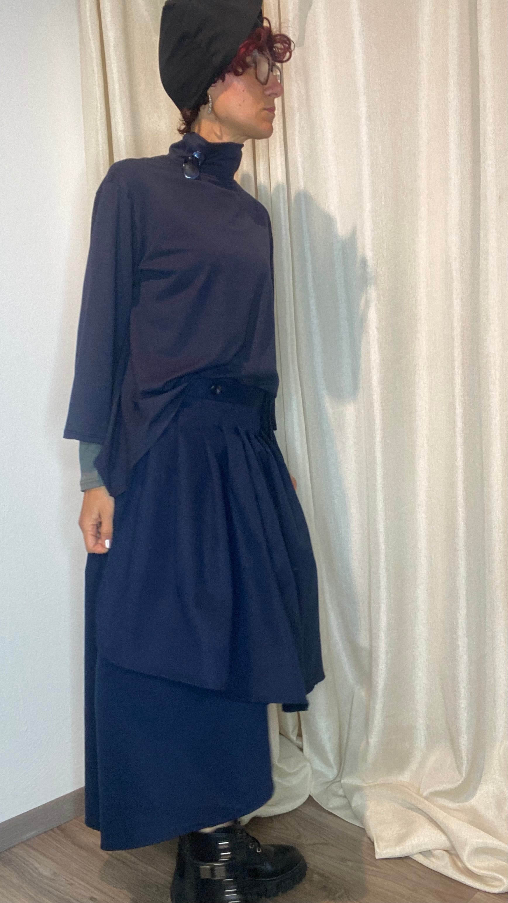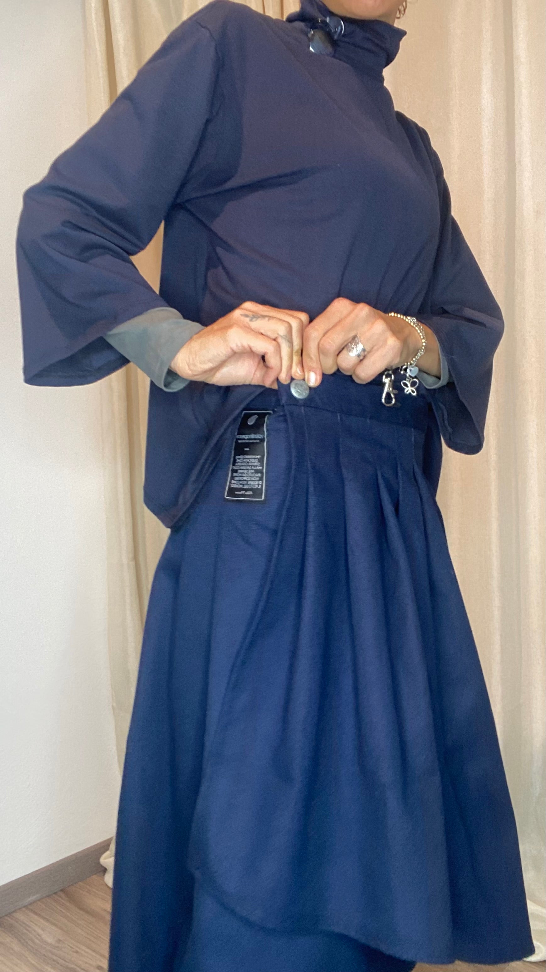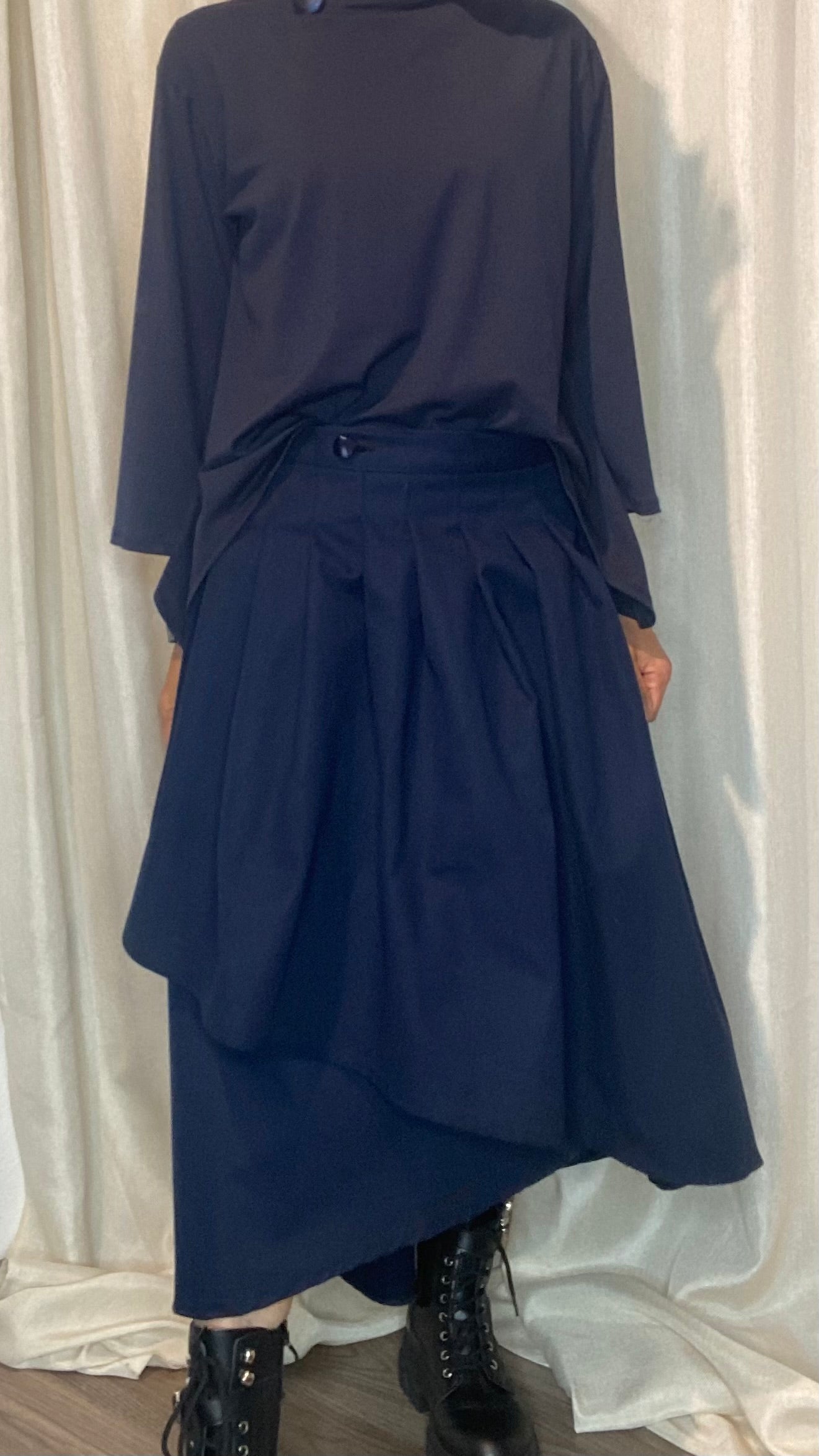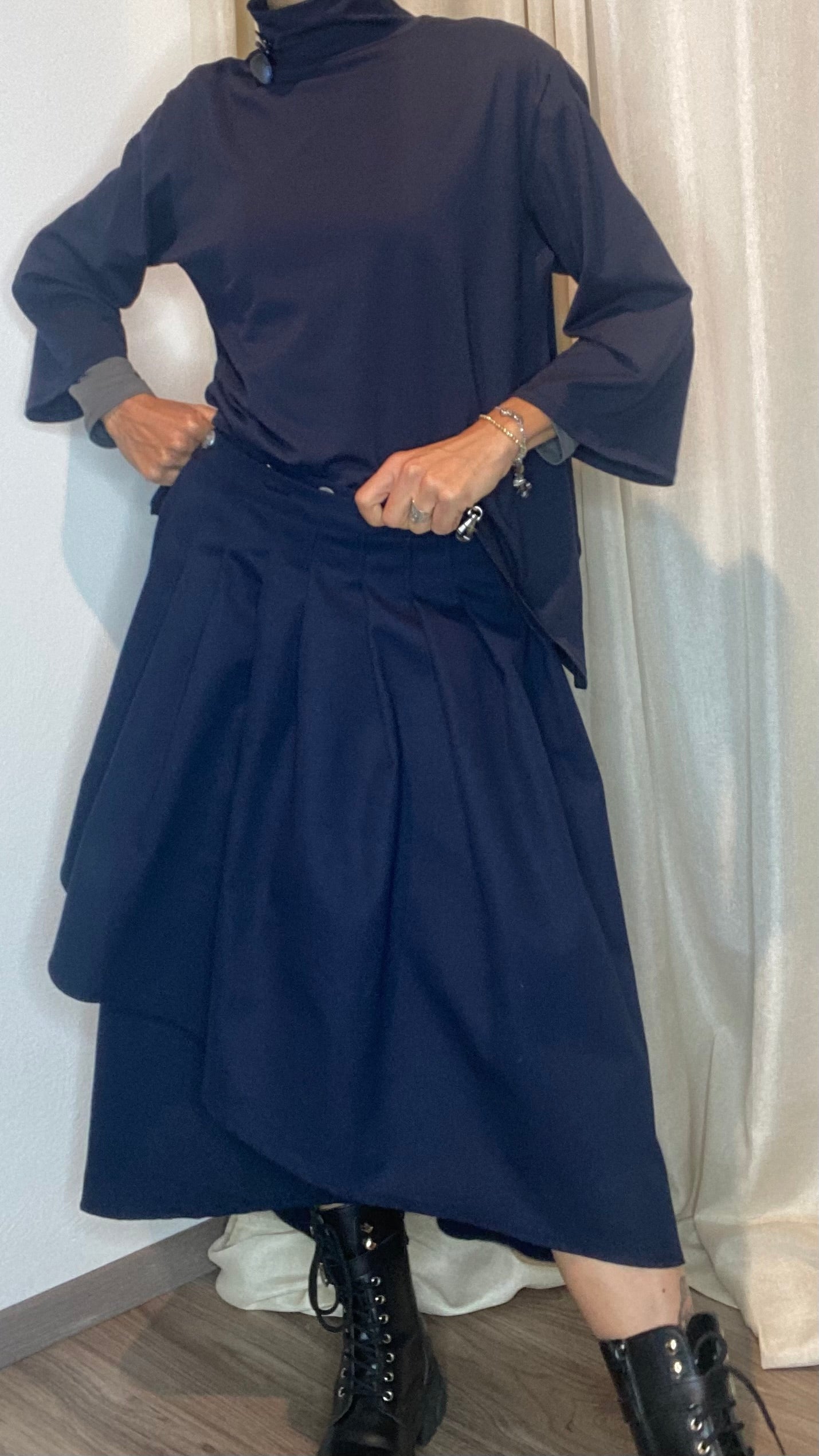Gonna asimmetrica a pieghe in cotone pesante, con regolazione in vita mediante botyoni. Taglia unica, veste dalla tg 38 alla tg 50.