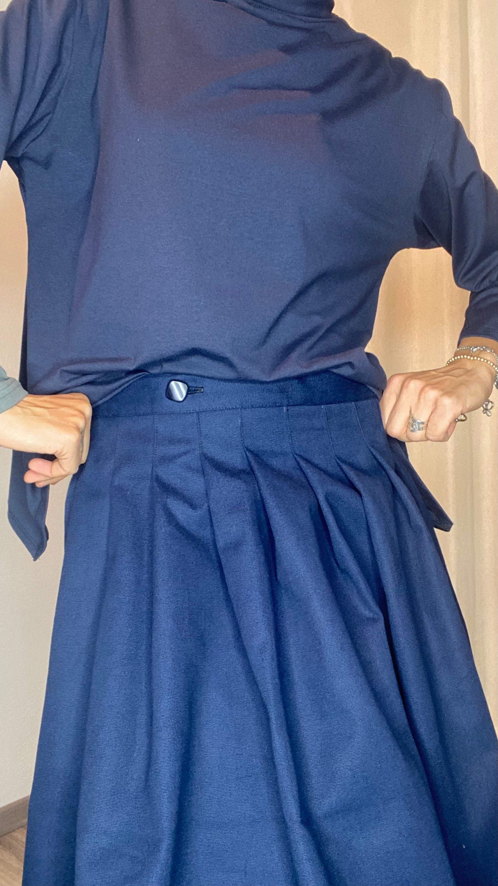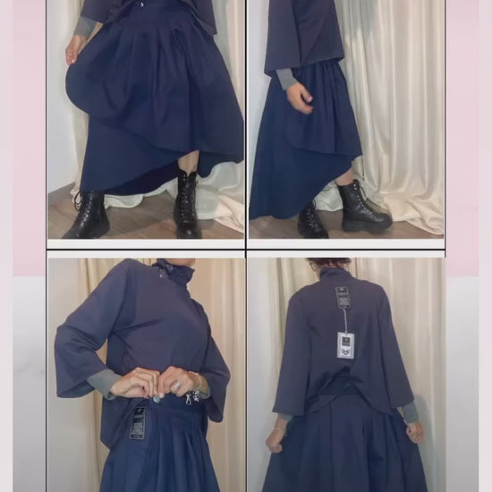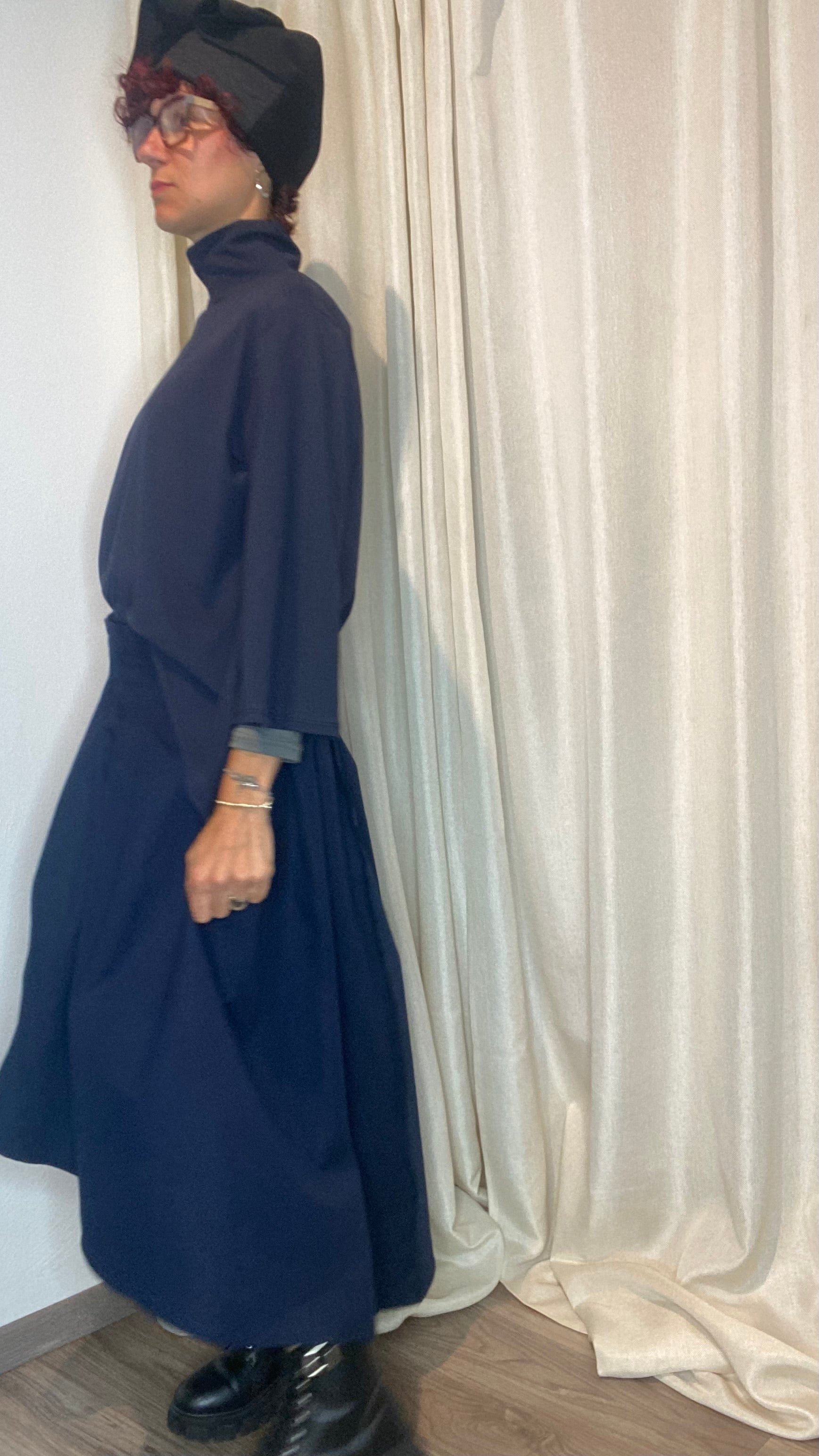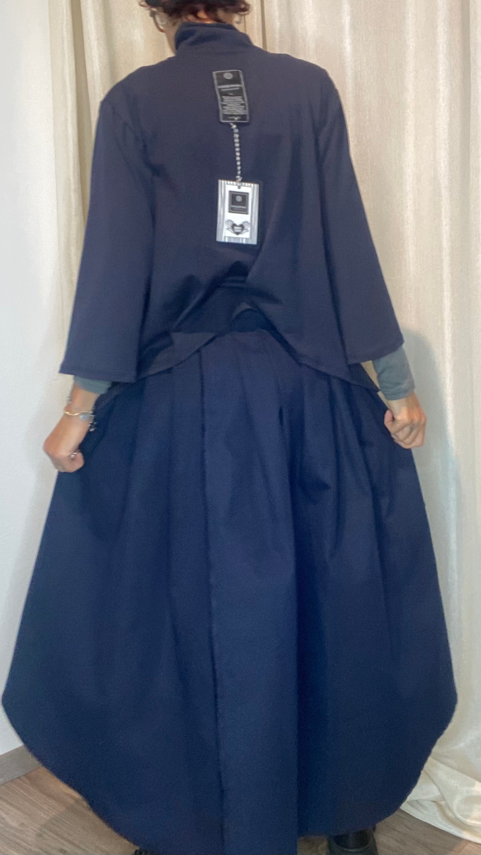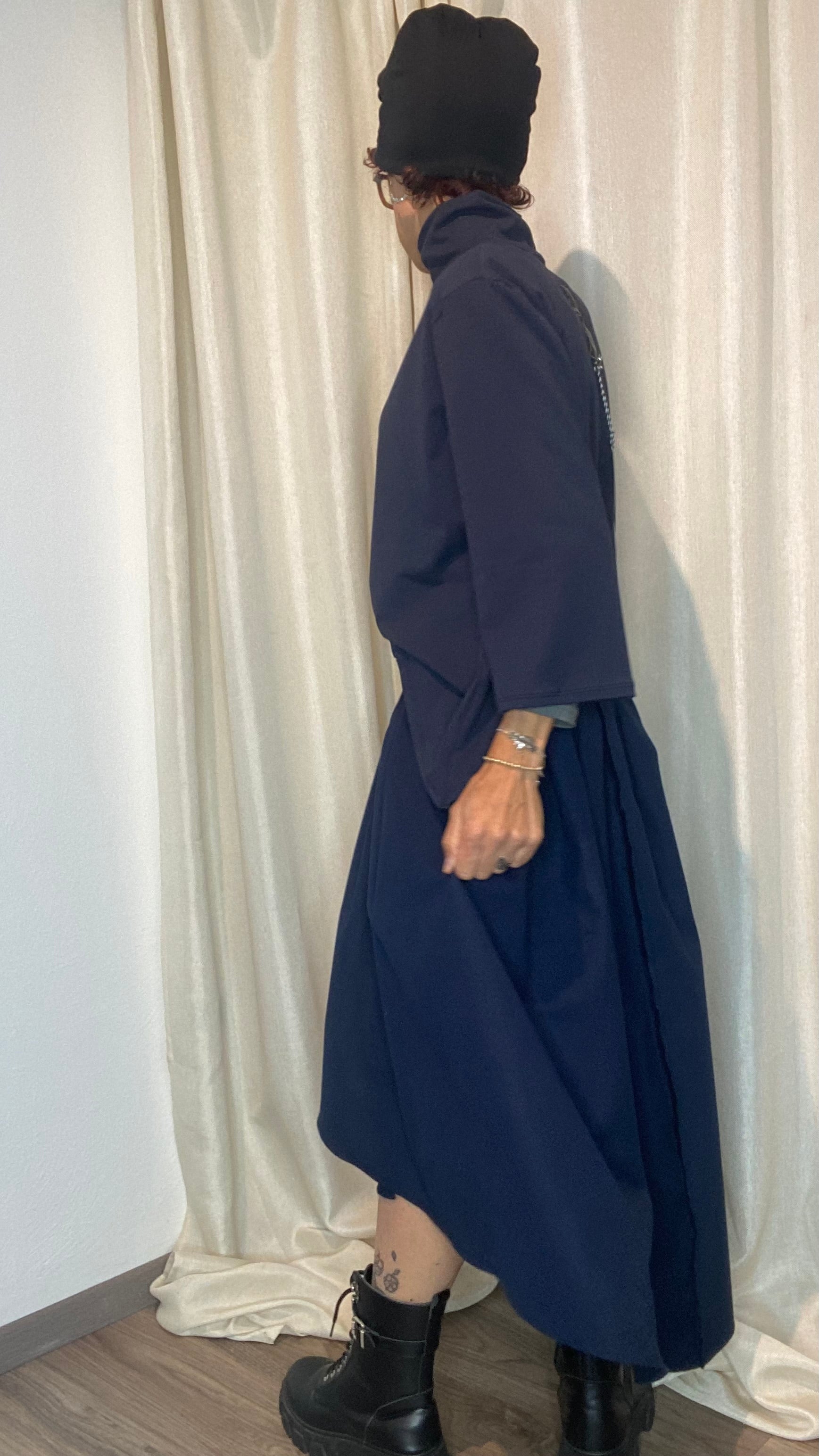 Gonna asimmetrica a pieghe in cotone pesante, con regolazione in vita mediante botyoni. Taglia unica, veste dalla tg 38 alla tg 50.