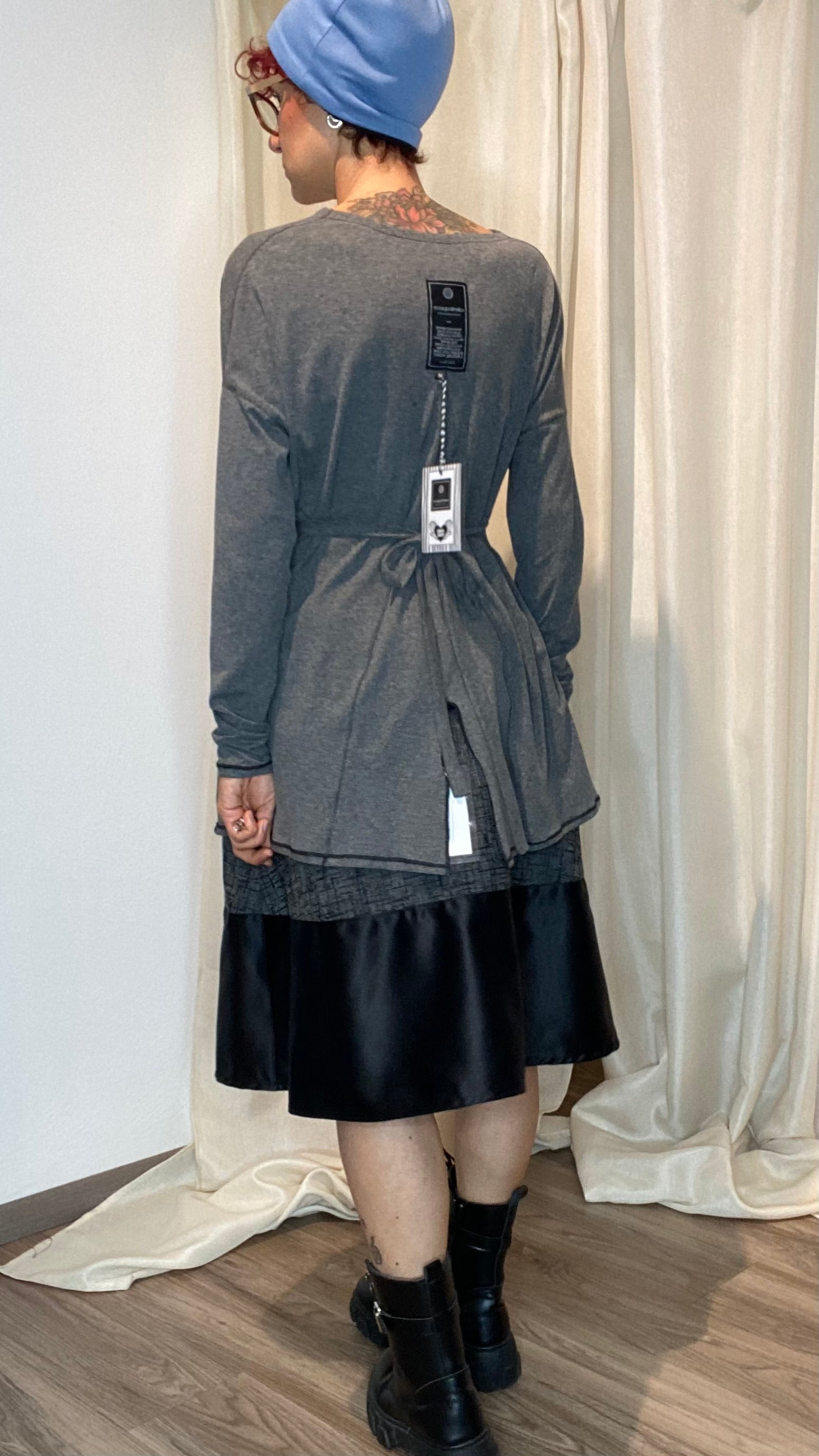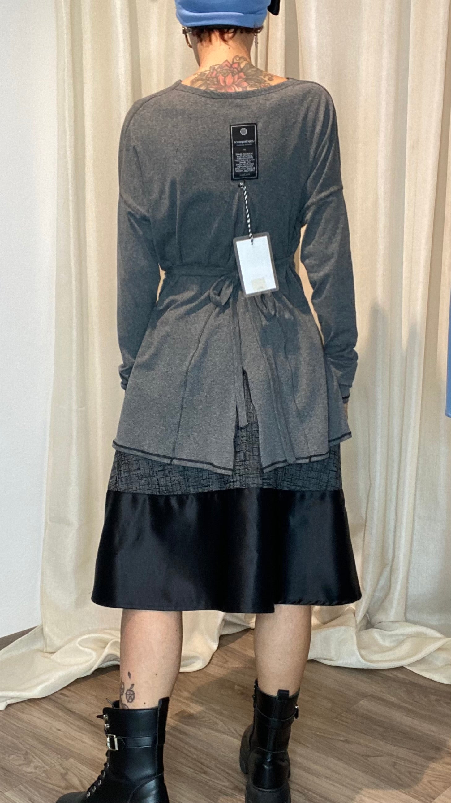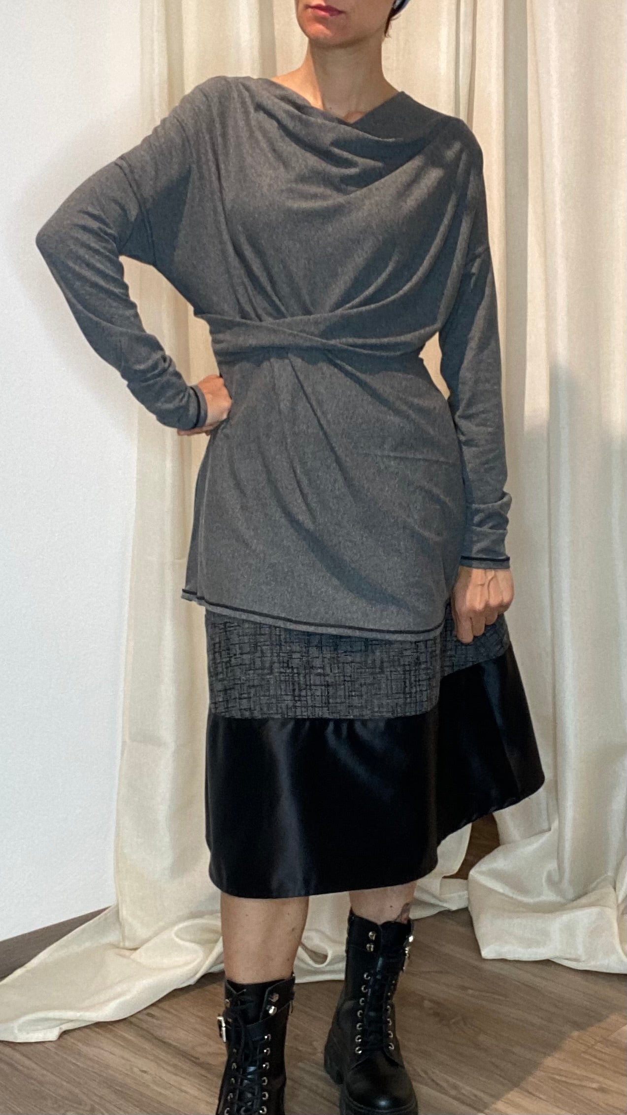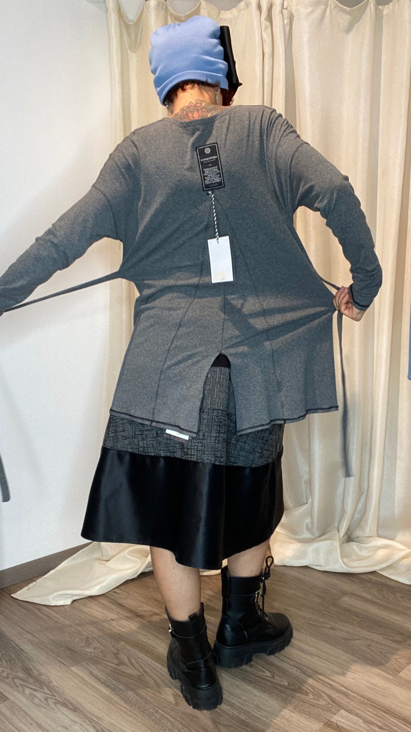 Maglia in morbida maglina di cotone a manica lunga, spacco sul dietro e regolazione in vita tramite laccetti. Veste dalla tg 38 alla 48.
