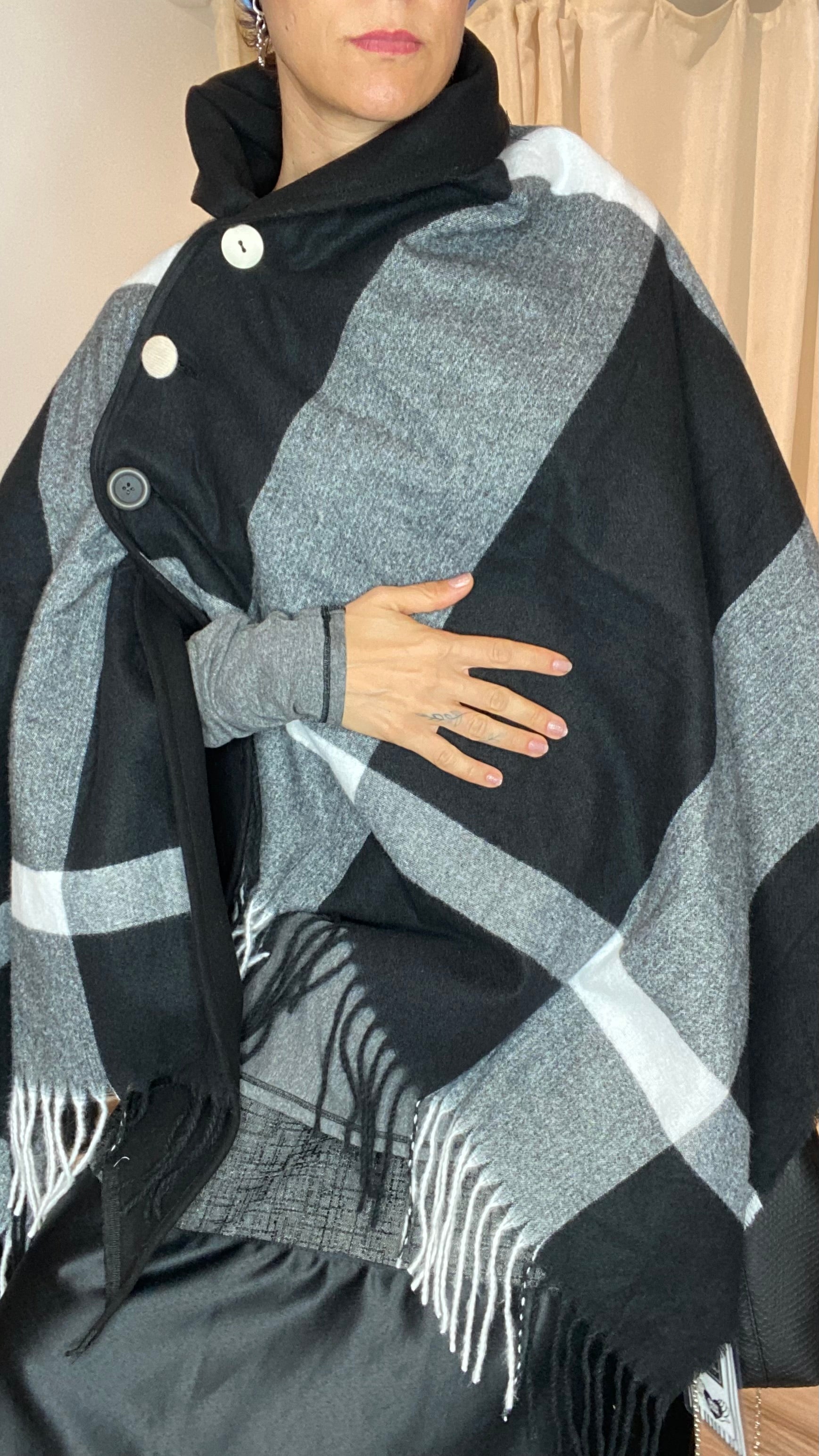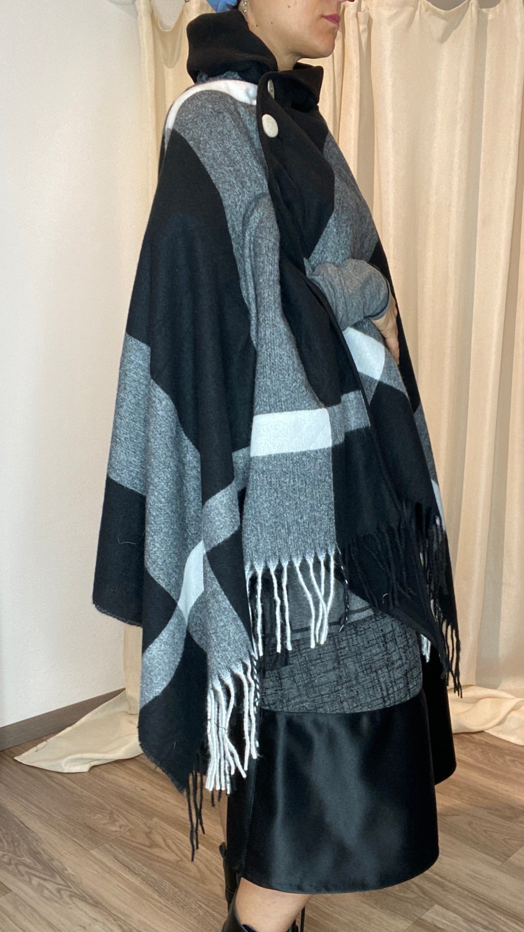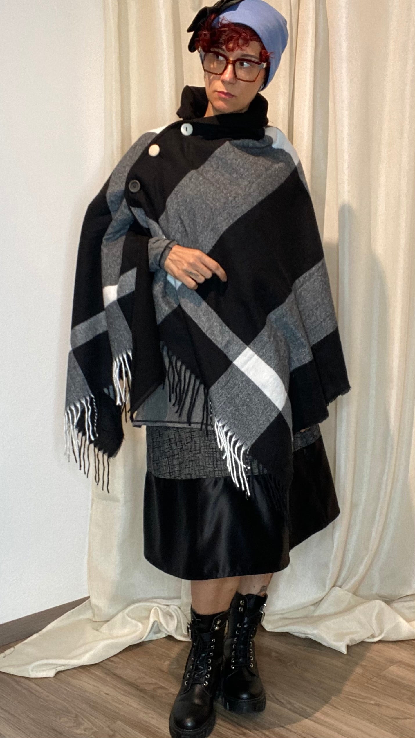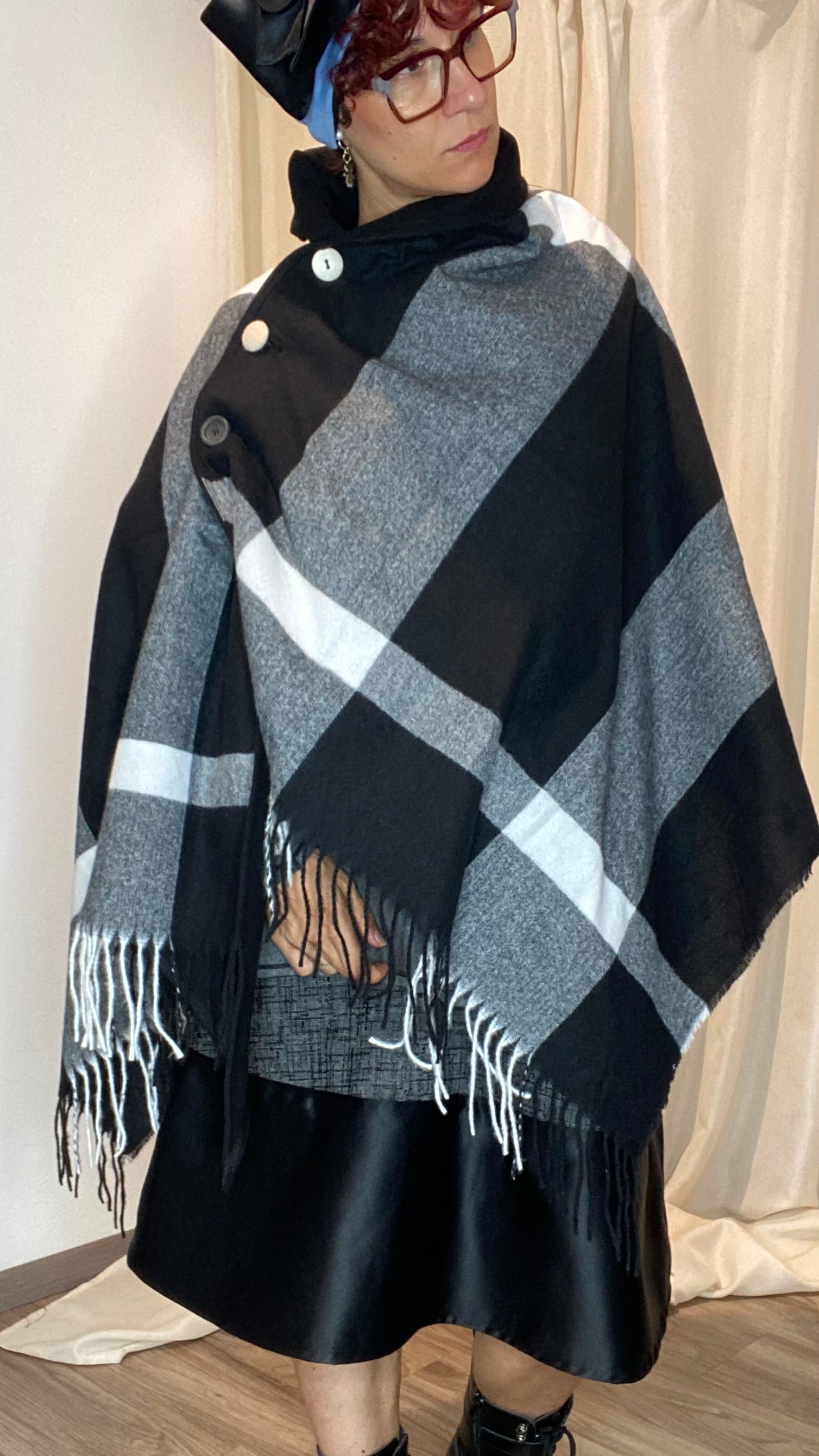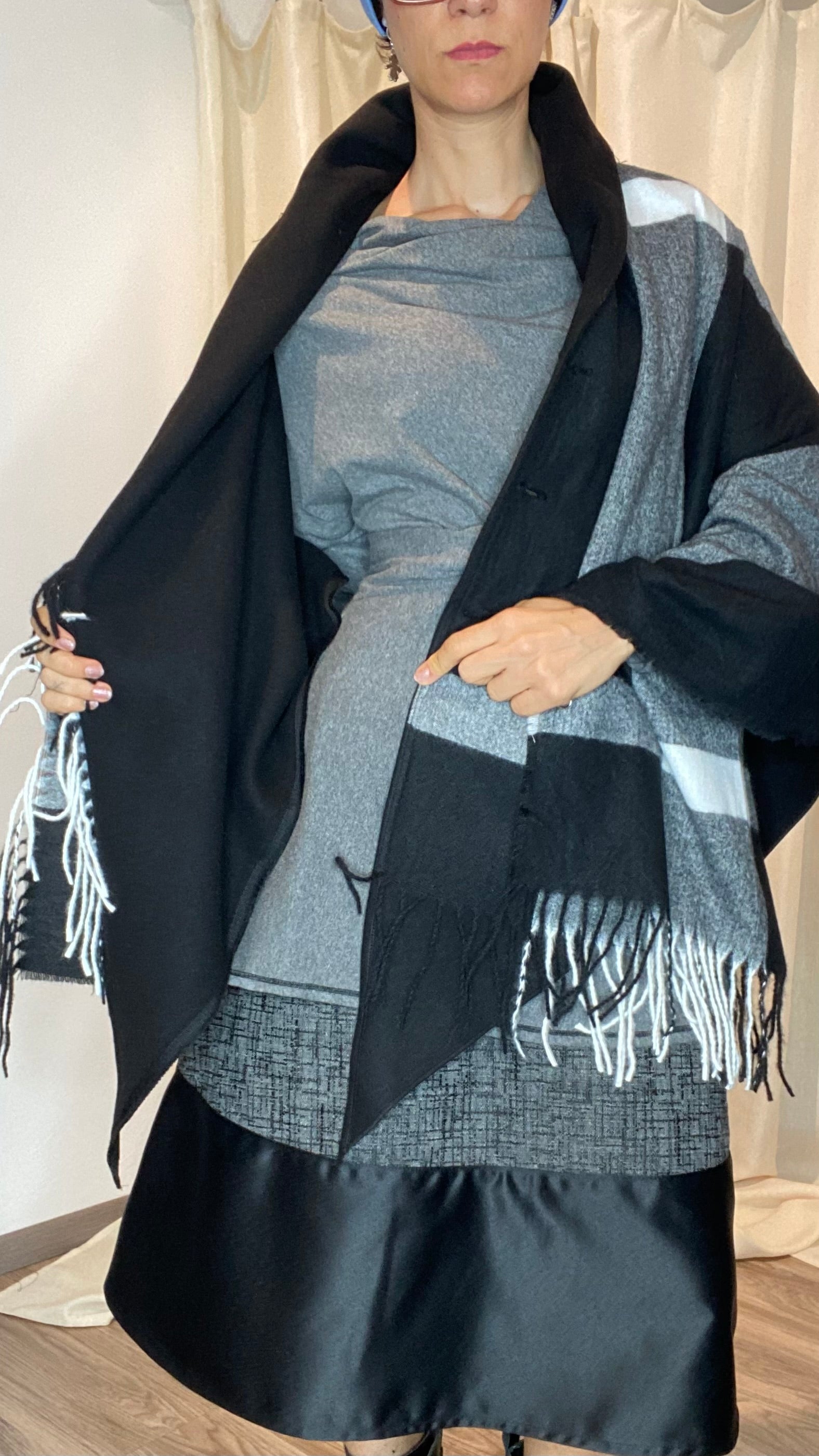 Mantella caldissima in lana cotta con parte superiore in tessuto misto con frange, collo arricciato e abbottonatura laterale. Da indossare da sola, su un cappotto o sopra un piumino. Taglia unica, veste dalla tg 38 alla 50.