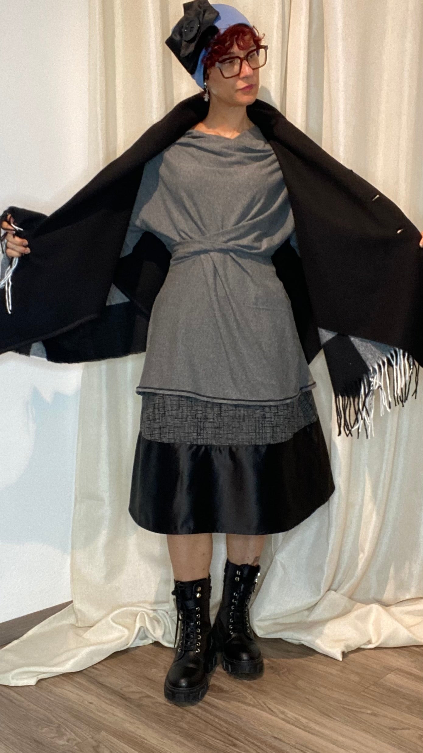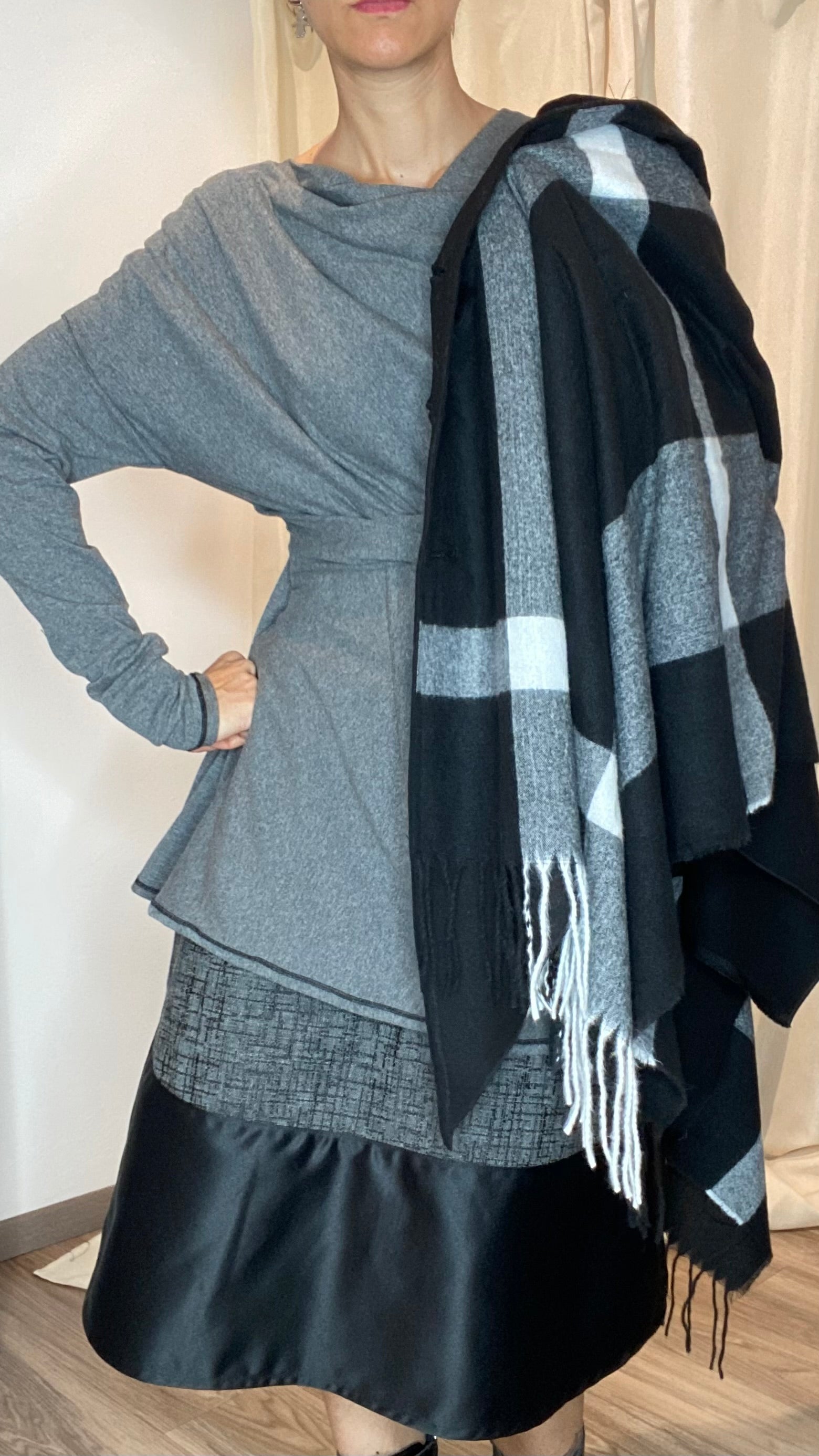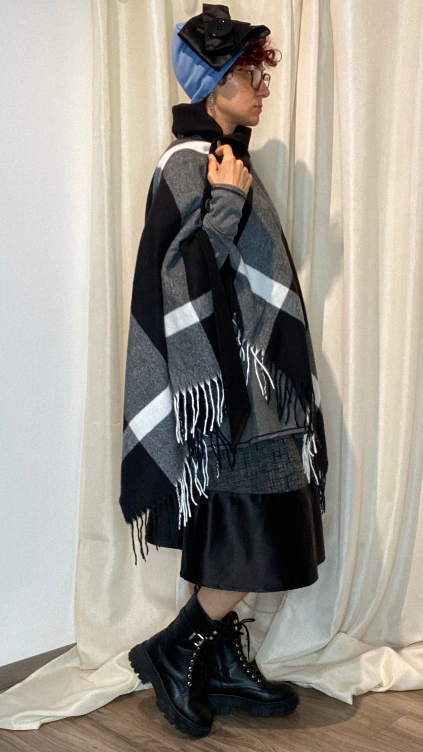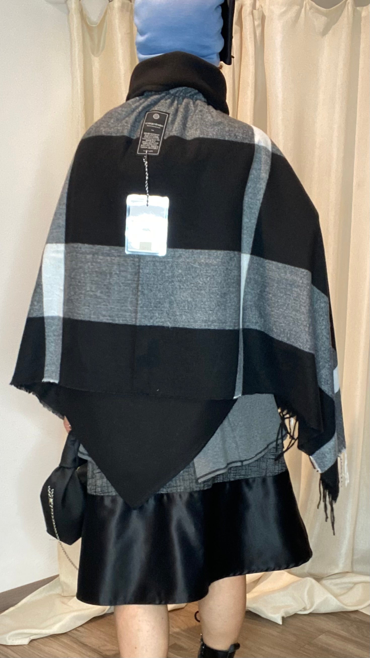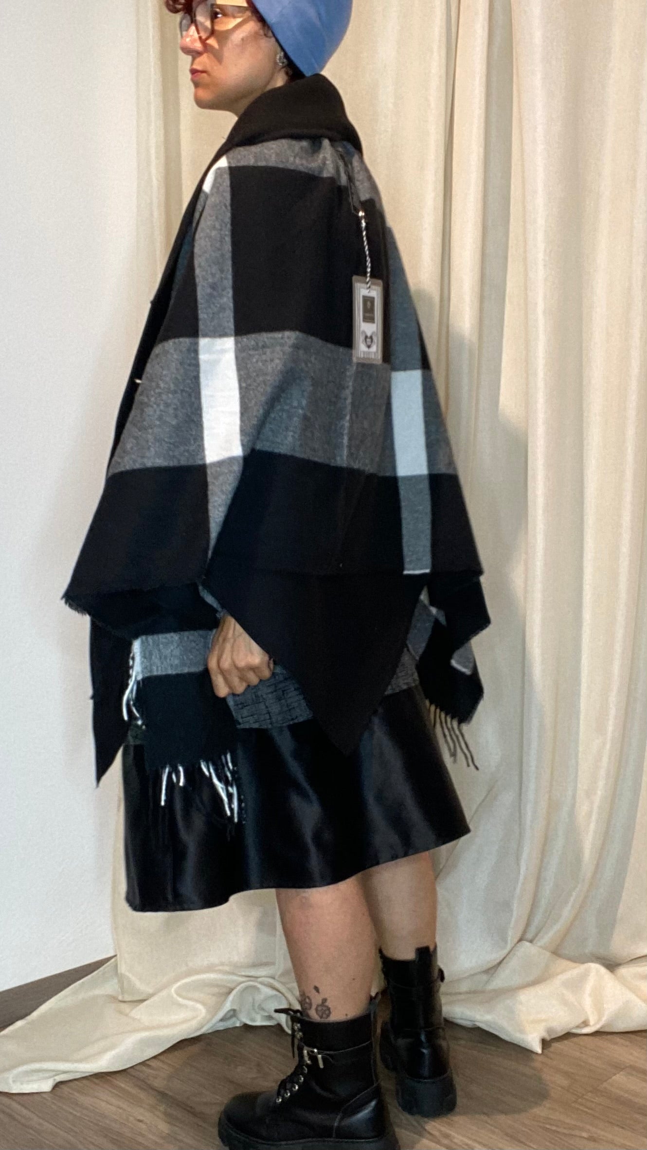 Mantella caldissima in lana cotta con parte superiore in tessuto misto con frange, collo arricciato e abbottonatura laterale. Da indossare da sola, su un cappotto o sopra un piumino. Taglia unica, veste dalla tg 38 alla 50.