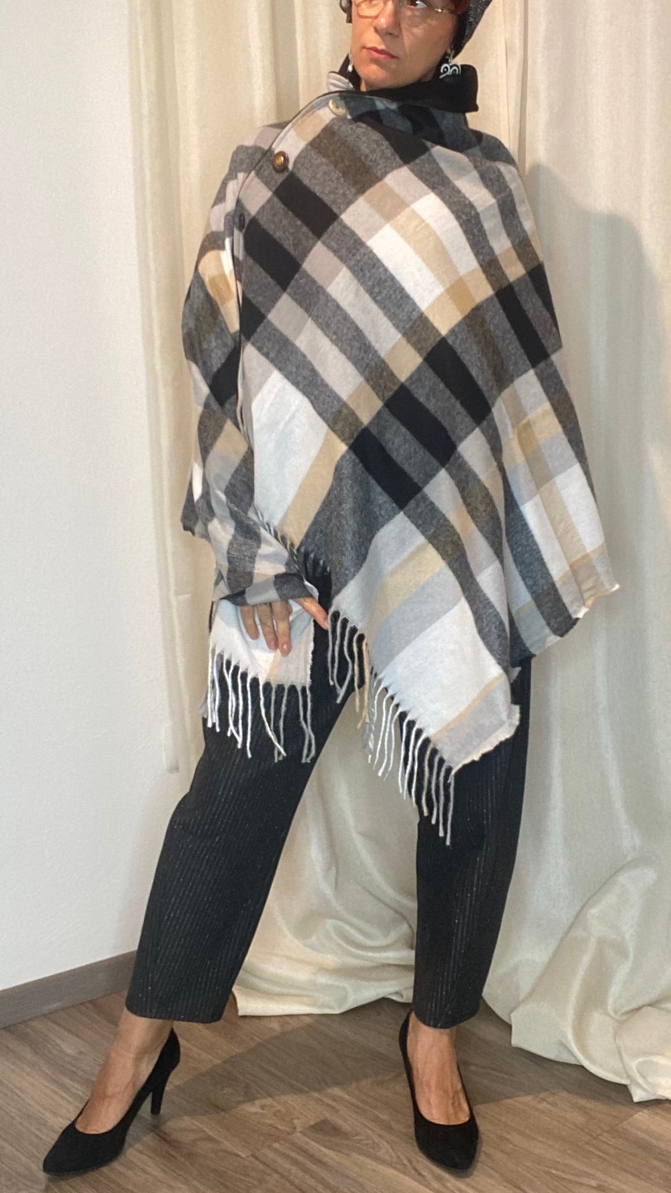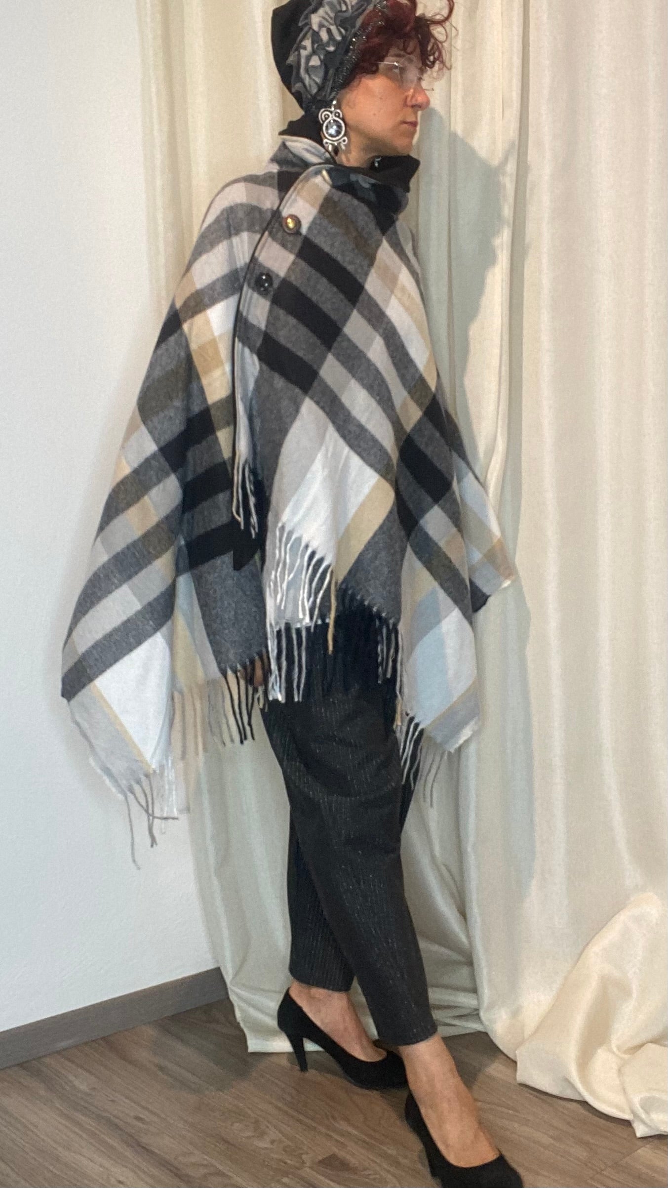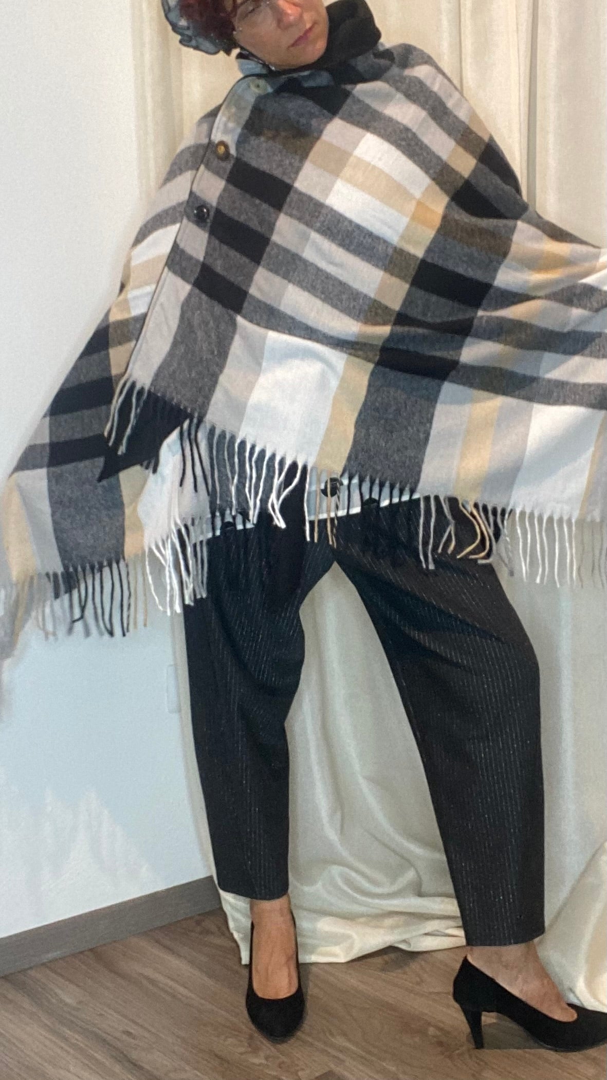 Mantella caldissima in lana cotta con parte superiore in tessuto misto con frange, collo arricciato e abbottonatura laterale. Da indossare da sola, su un cappotto o sopra un piumino. Taglia unica, veste dalla tg 38 alla 50.