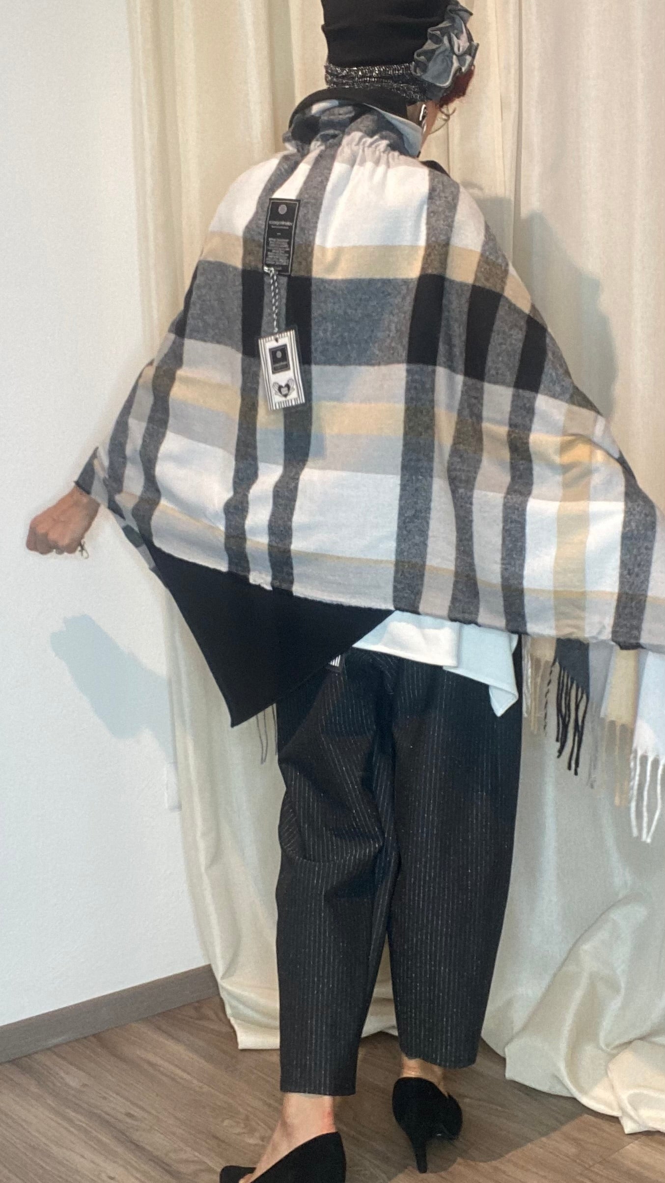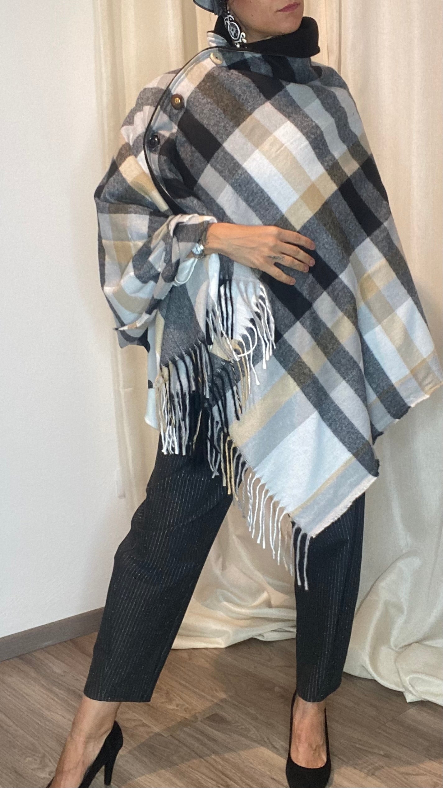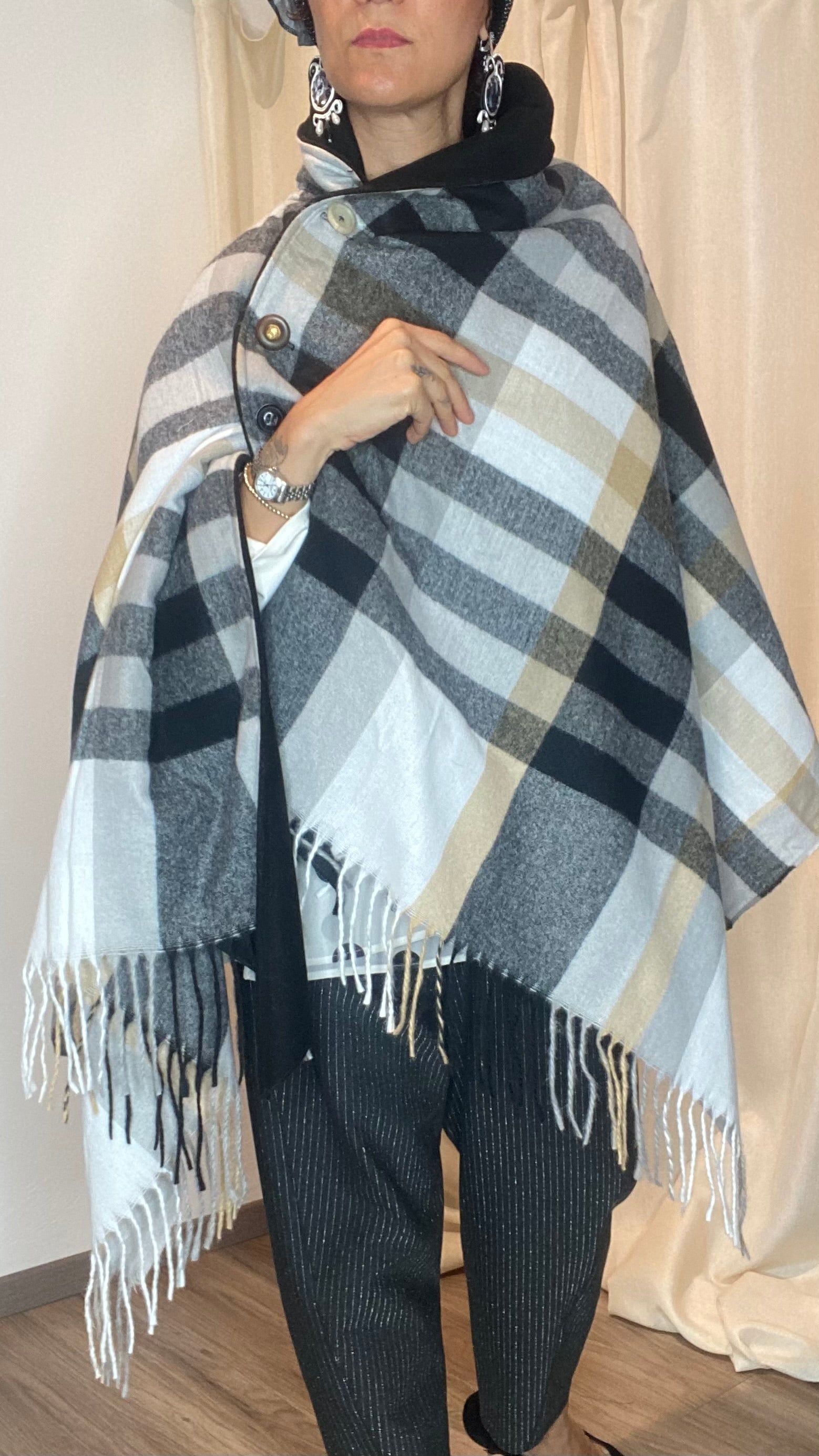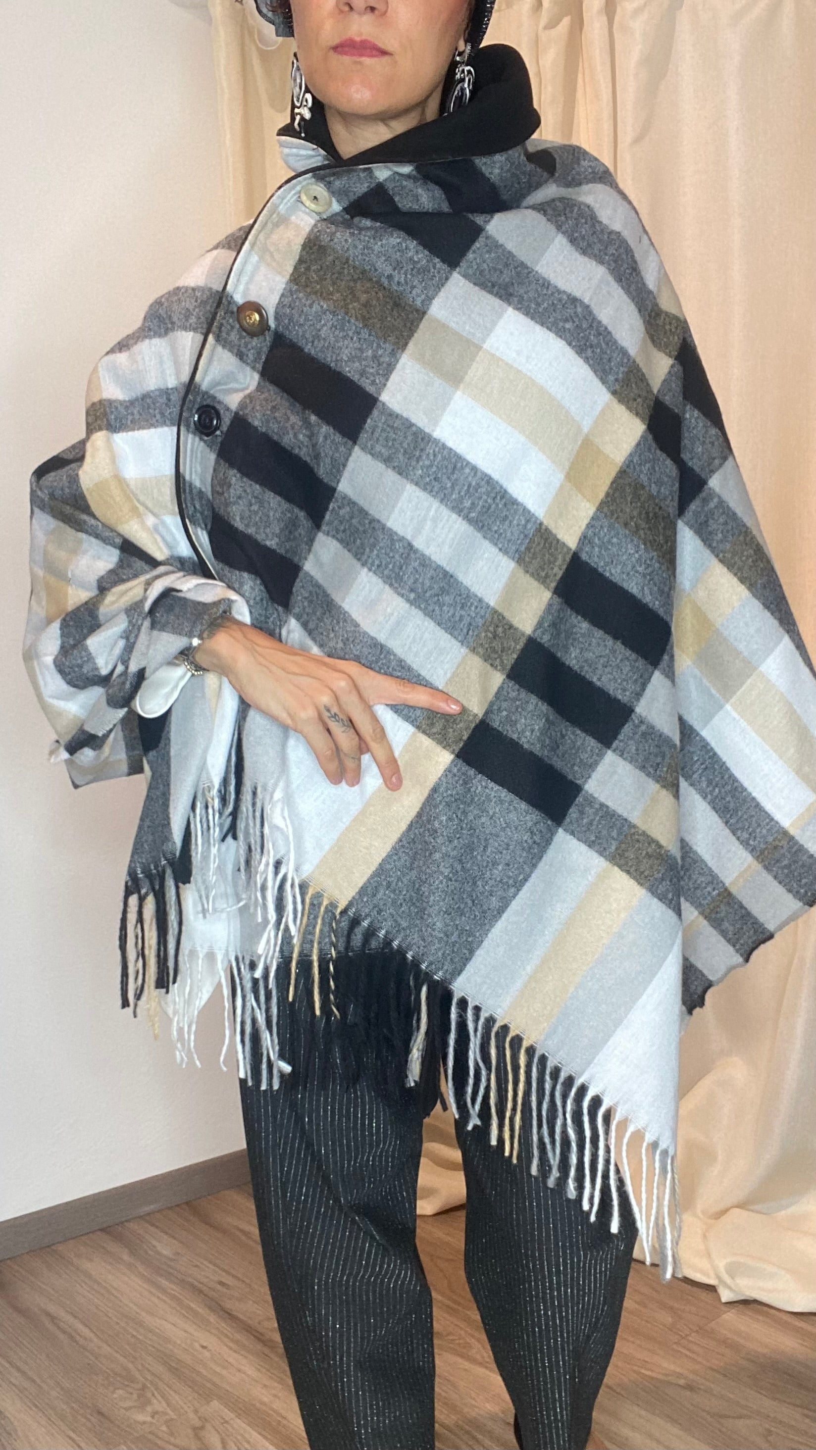Mantella caldissima in lana cotta con parte superiore in tessuto misto con frange, collo arricciato e abbottonatura laterale. Da indossare da sola, su un cappotto o sopra un piumino. Taglia unica, veste dalla tg 38 alla 50.