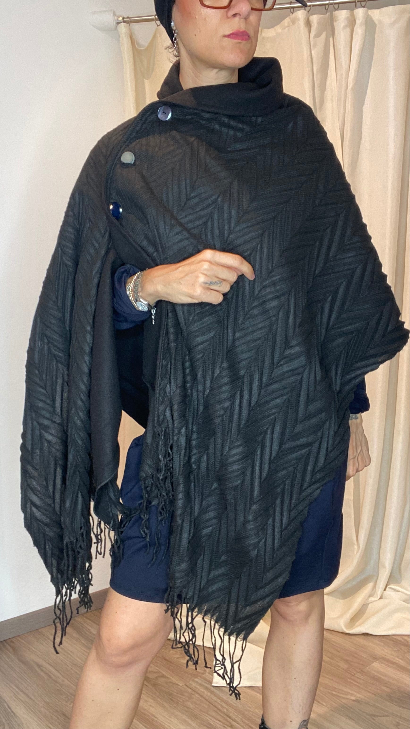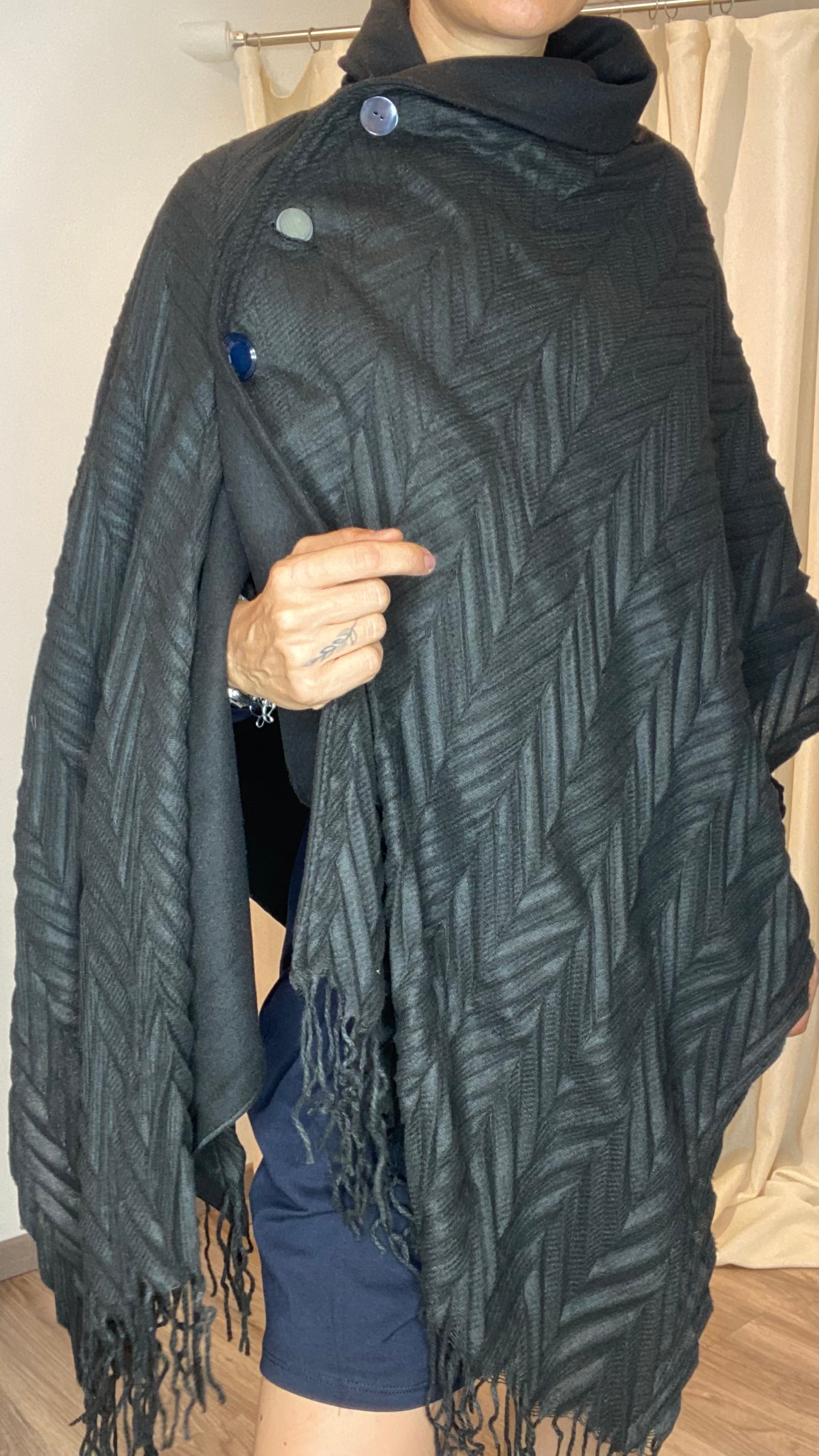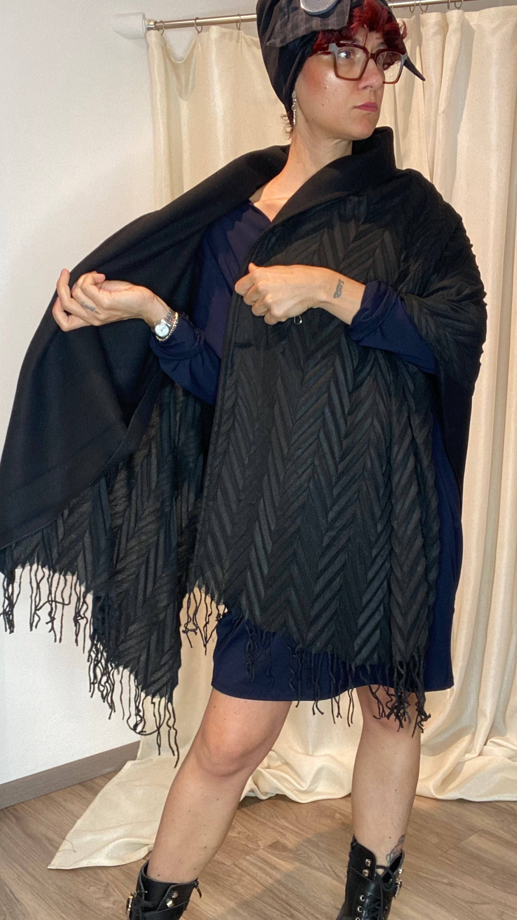 Mantella caldissima in lana cotta con parte superiore in tessuto misto con frange, collo arricciato e abbottonatura laterale. Da indossare da sola, su un cappotto o sopra un piumino. Taglia unica, veste dalla tg 38 alla 50.