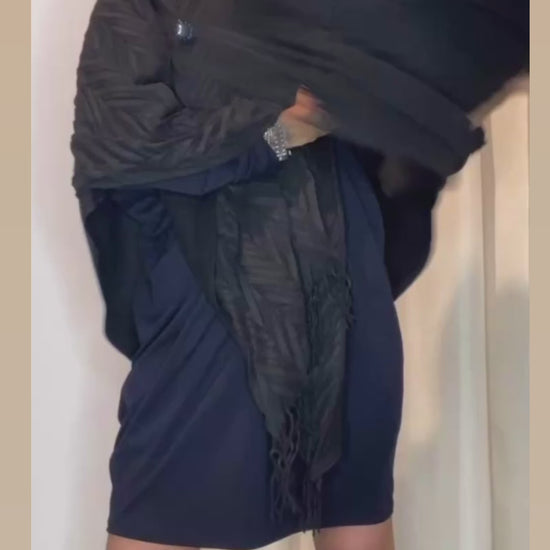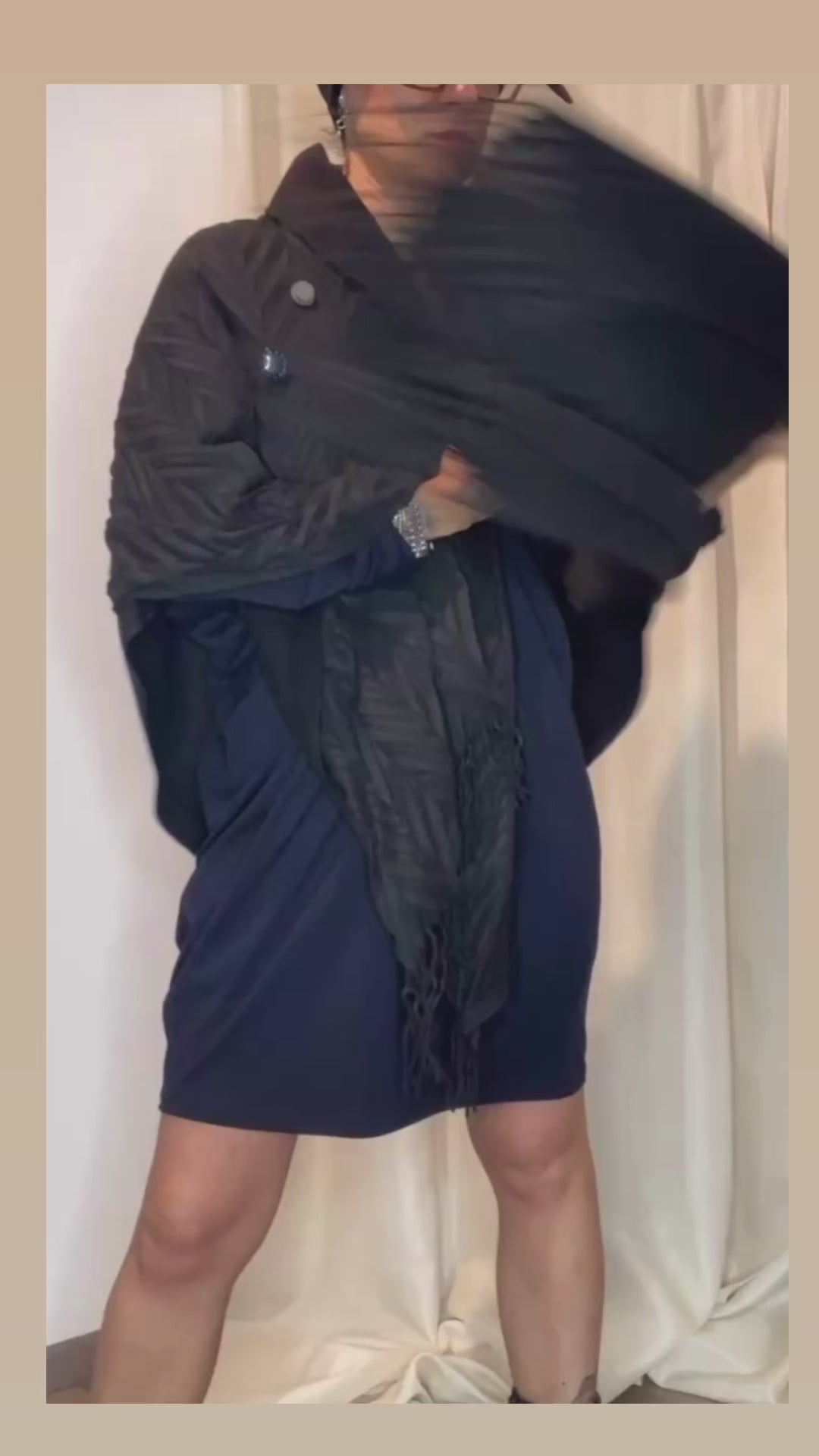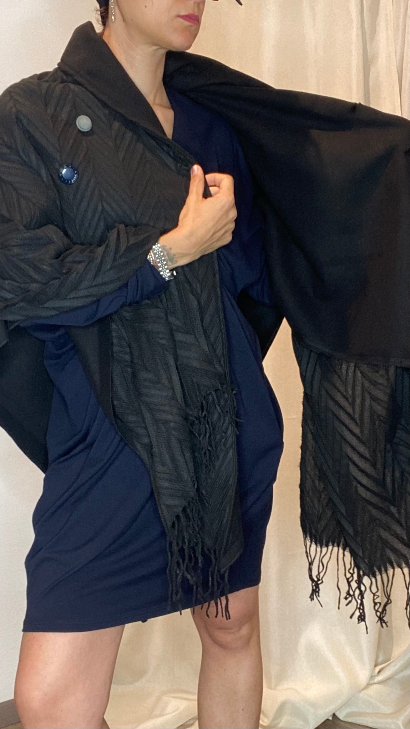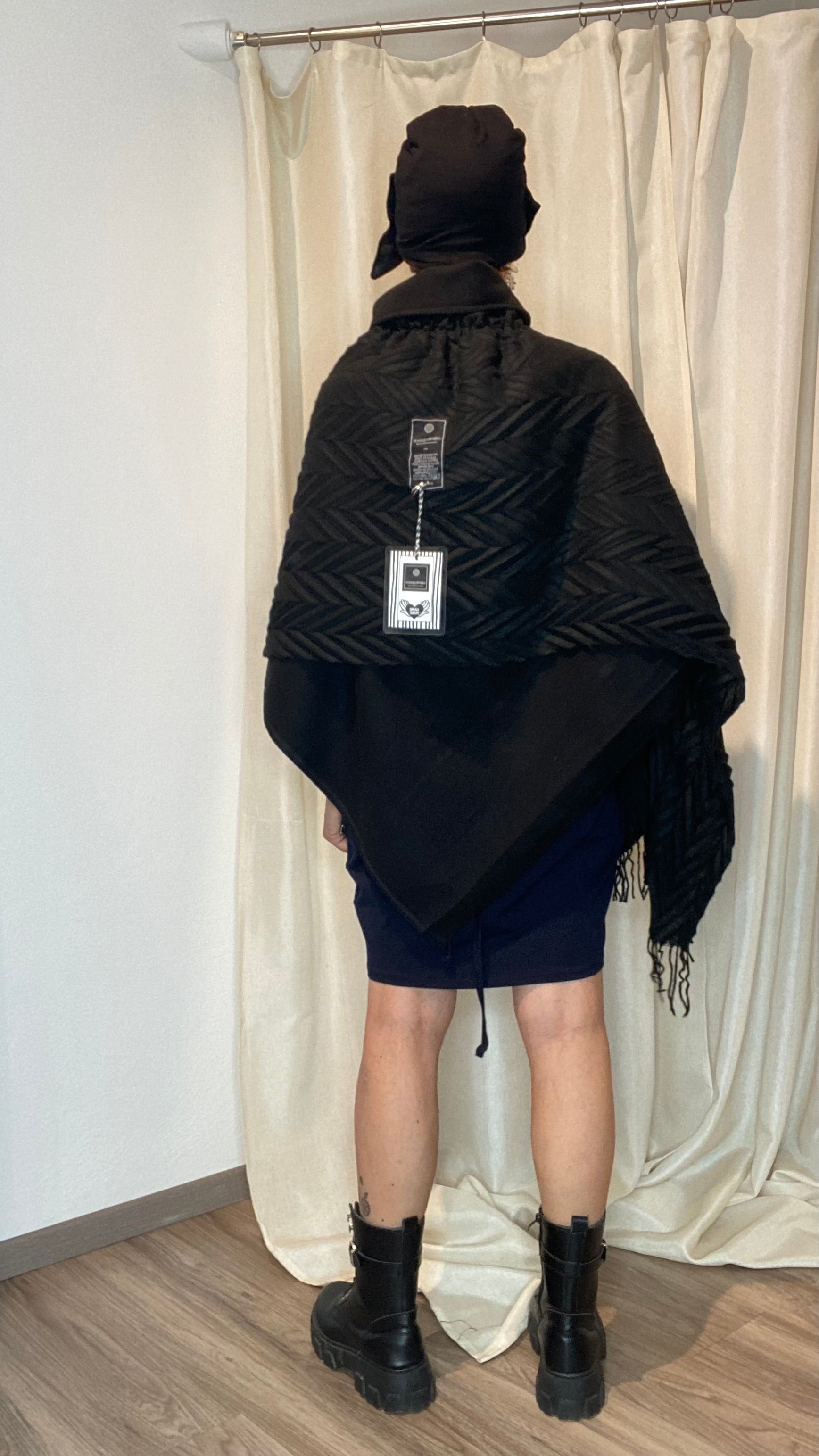 Mantella caldissima in lana cotta con parte superiore in tessuto misto con frange, collo arricciato e abbottonatura laterale. Da indossare da sola, su un cappotto o sopra un piumino. Taglia unica, veste dalla tg 38 alla 50.