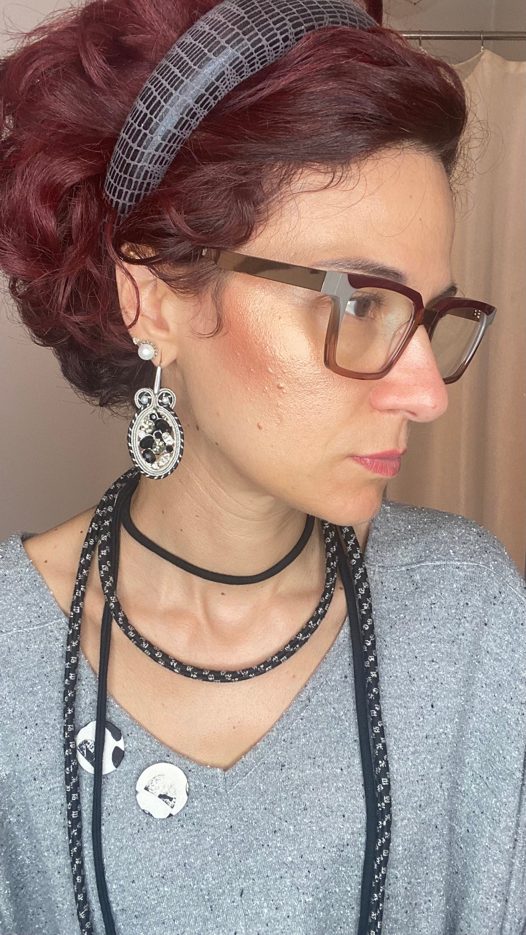Orecchini cucito a mano in soutache con cabochon in strass e monachelle in acciaio chirurgico Nichel free.