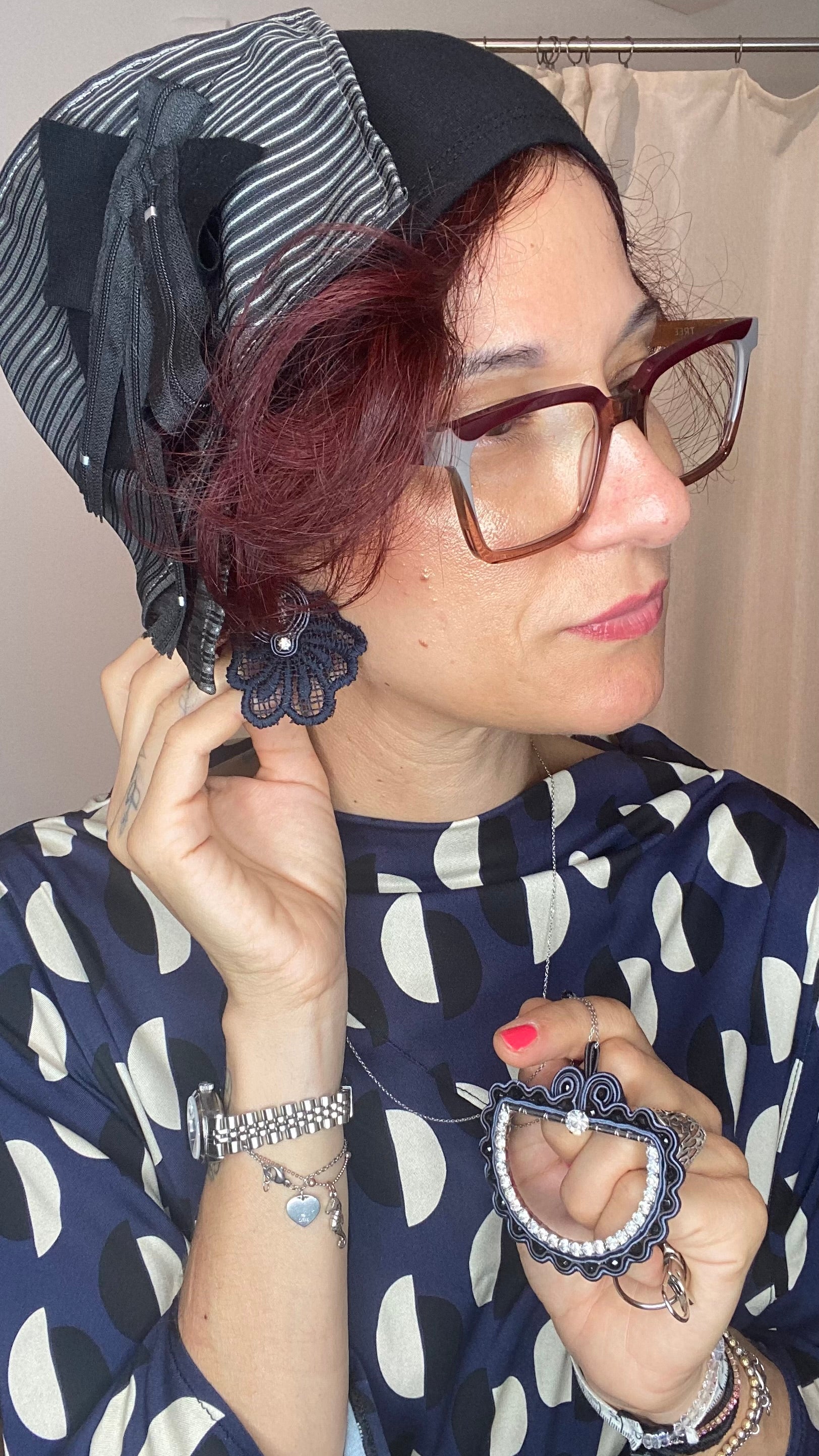 Orecchini cucito a mano in soutache con cabochon in tessuto, pizzo intagliato e chiusura a perno in acciaio chirurgico Nichel free.