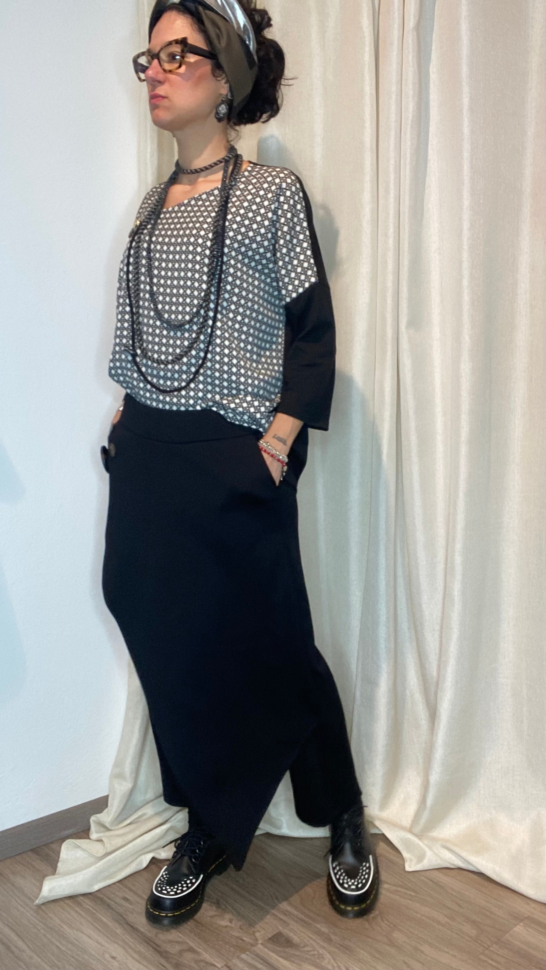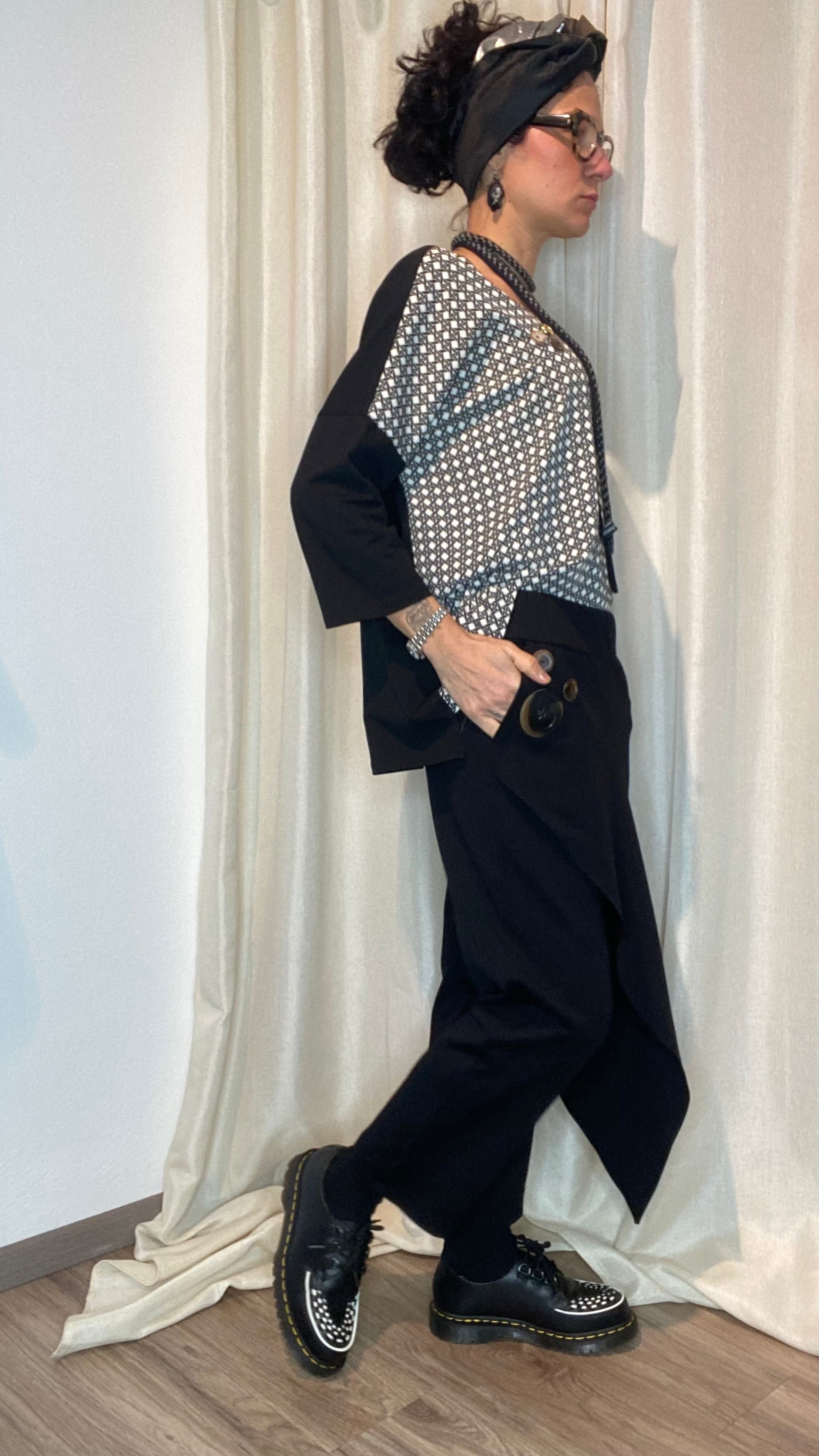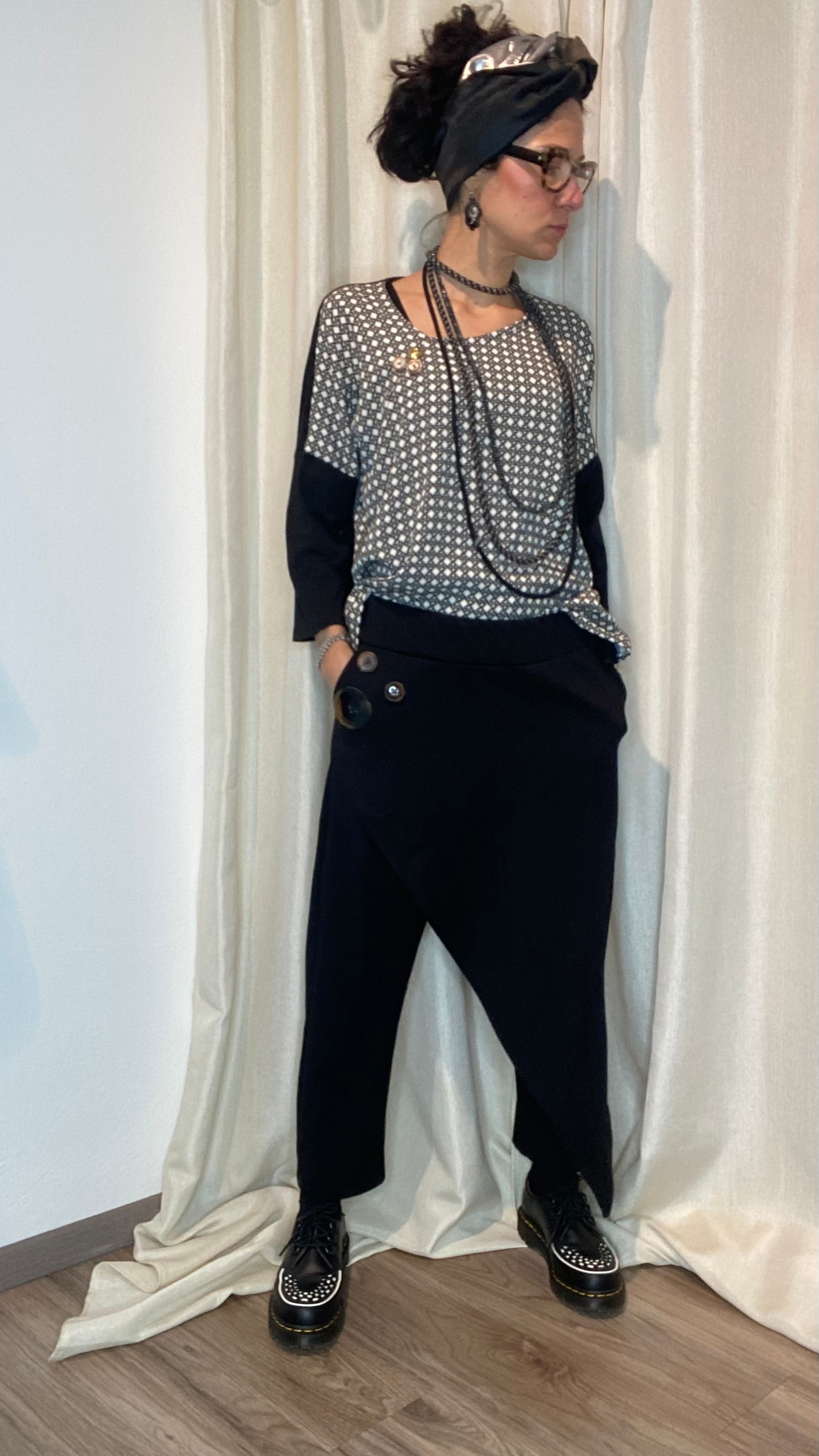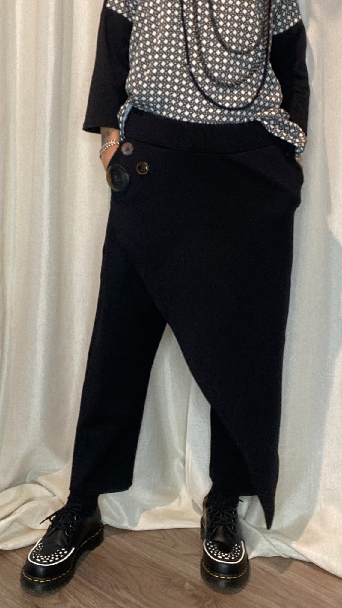 Morbido pantalone asimmetrico in maglia punto Milano con drappeggiato sul davanti, a gamba diritta, bottoni laterali, tasche ed elastico piatto in vita. Taglia unica, veste dalla tg 38 alla tg 50.