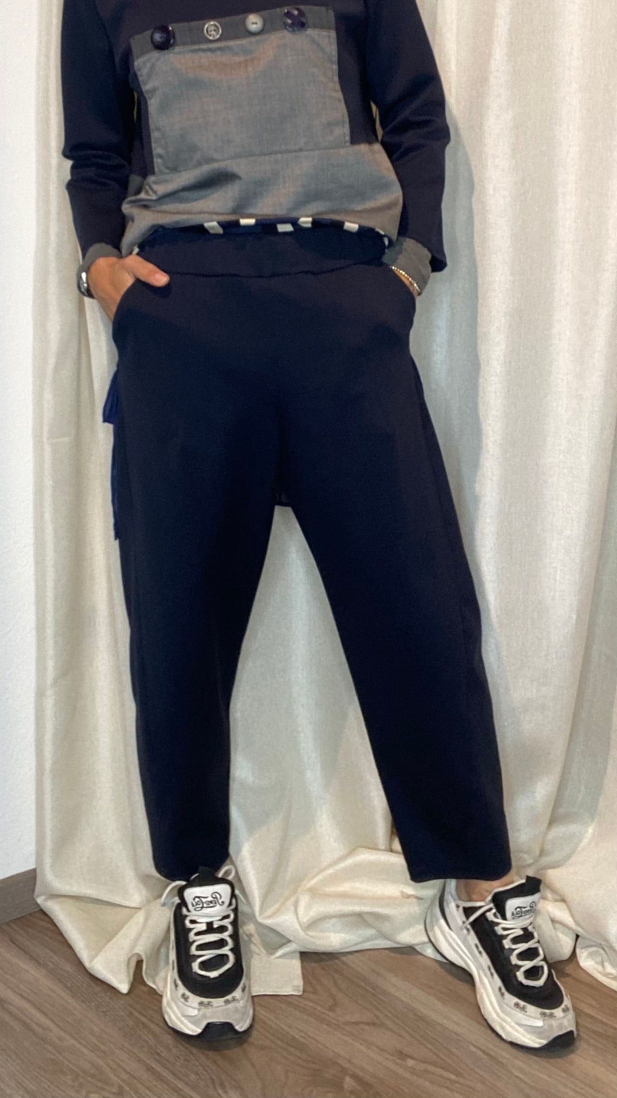 Morbido pantalone in maglia punto Milano con gamba a uovo, tasche laterali ed elastico piatto in vita. Taglia unica, veste dalla tg 38 alla tg 50.