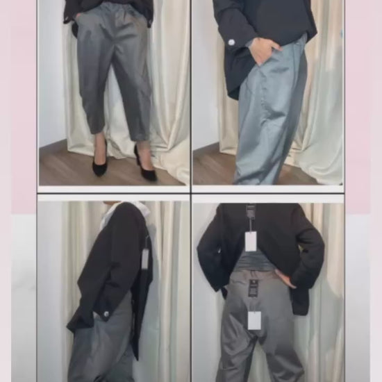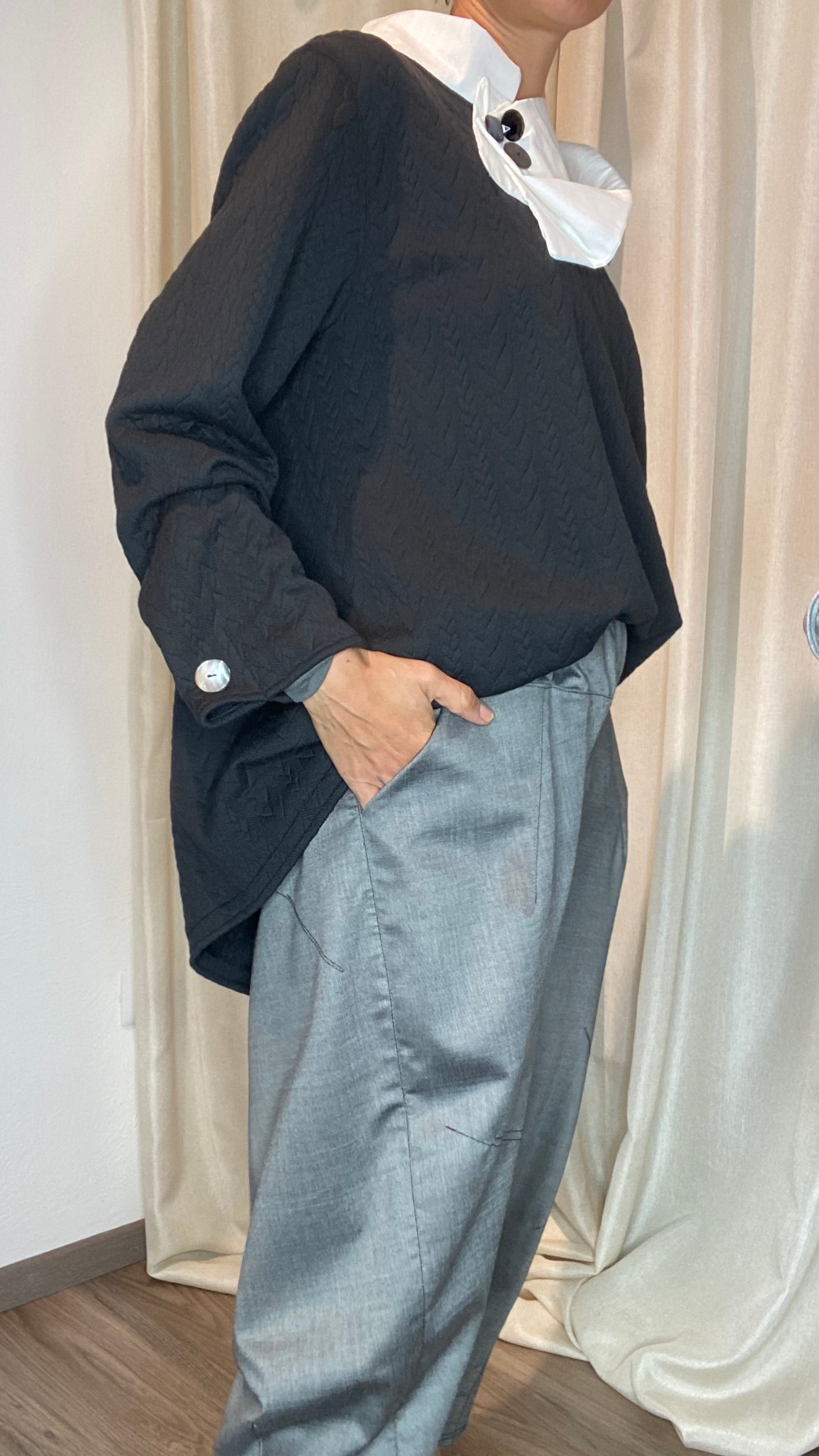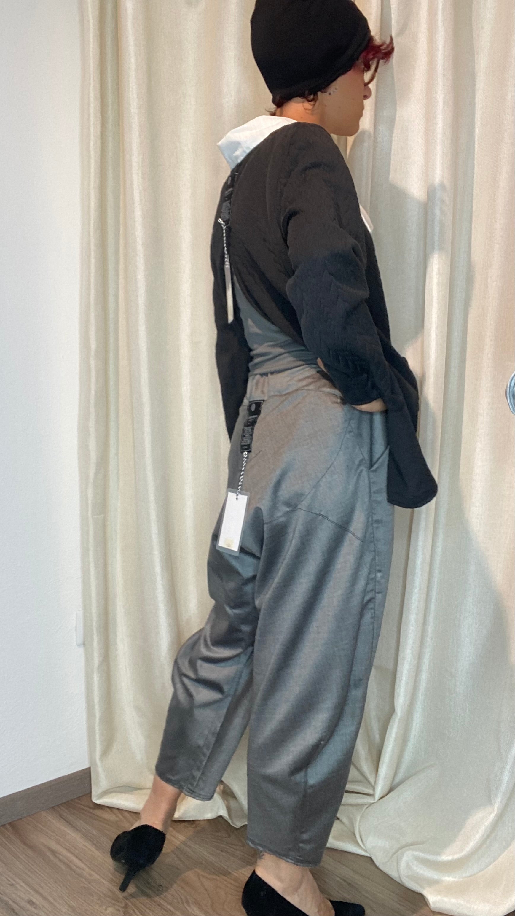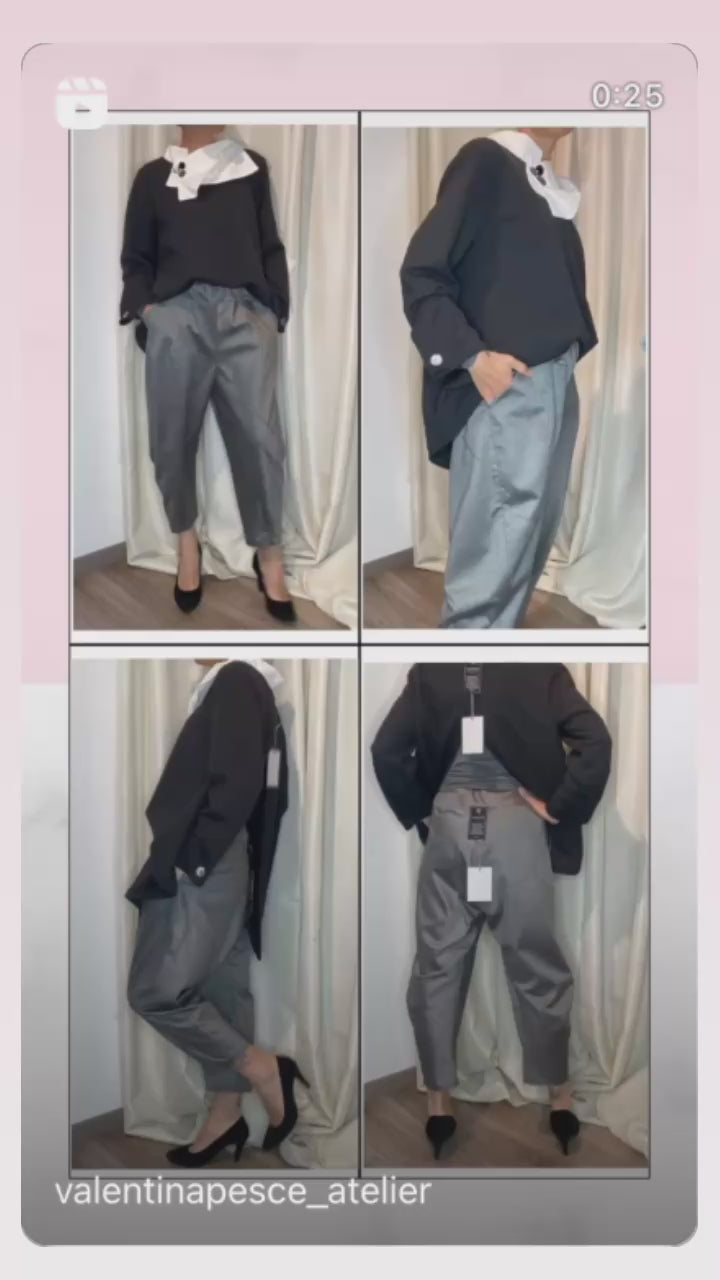 Morbido pantalone in fresco di lana grigio con cuciture, gamba a uovo, tasche laterali ed elastico piatto in vita. Taglia unica, veste dalla tg 38 alla tg 50.