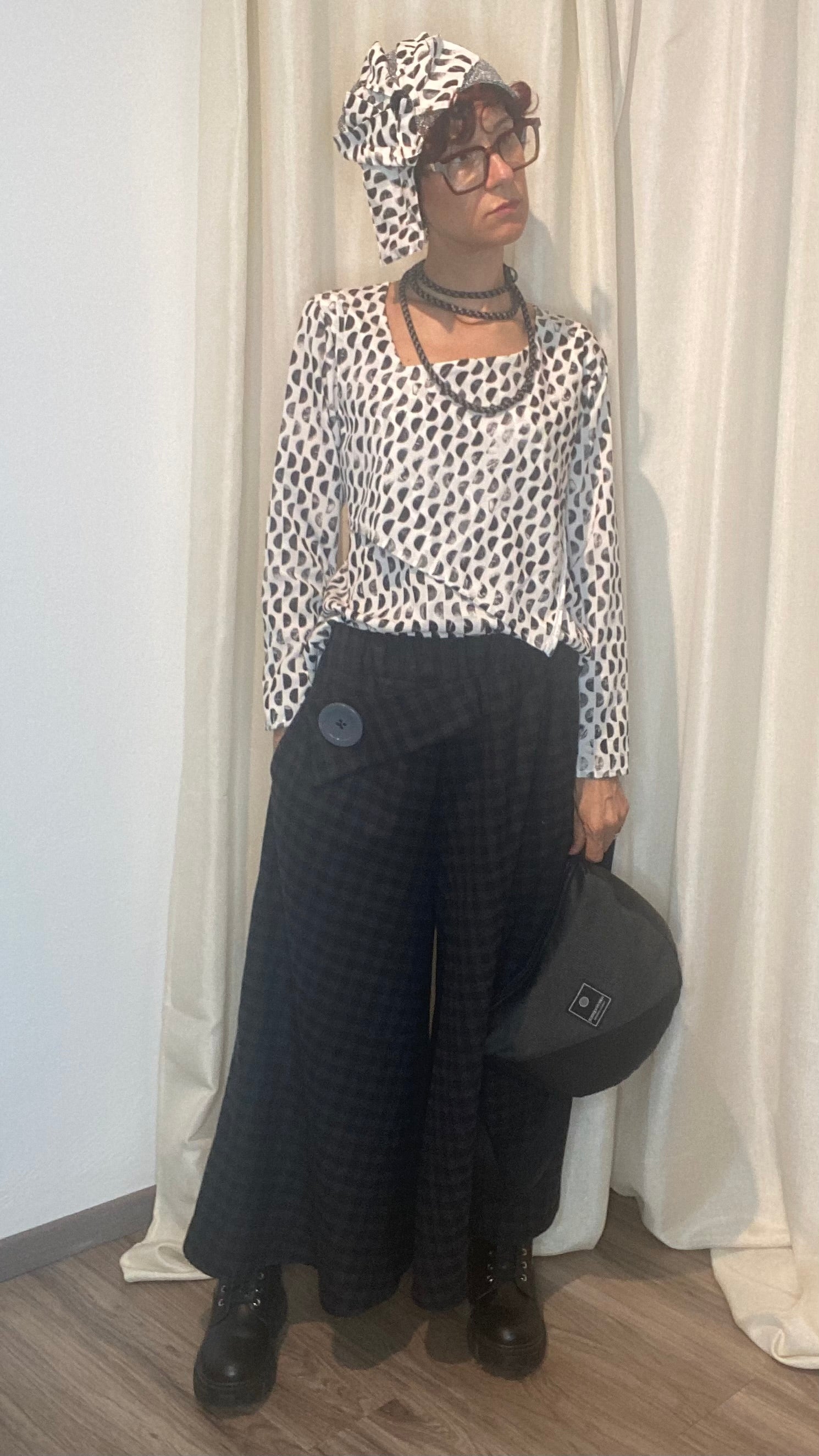 Morbido pantalone in lana a quadri con gamba ampia, tasche laterali, bottone grande ed elastico piatto in vita. Taglia unica, veste dalla the 38 alla tg 48.