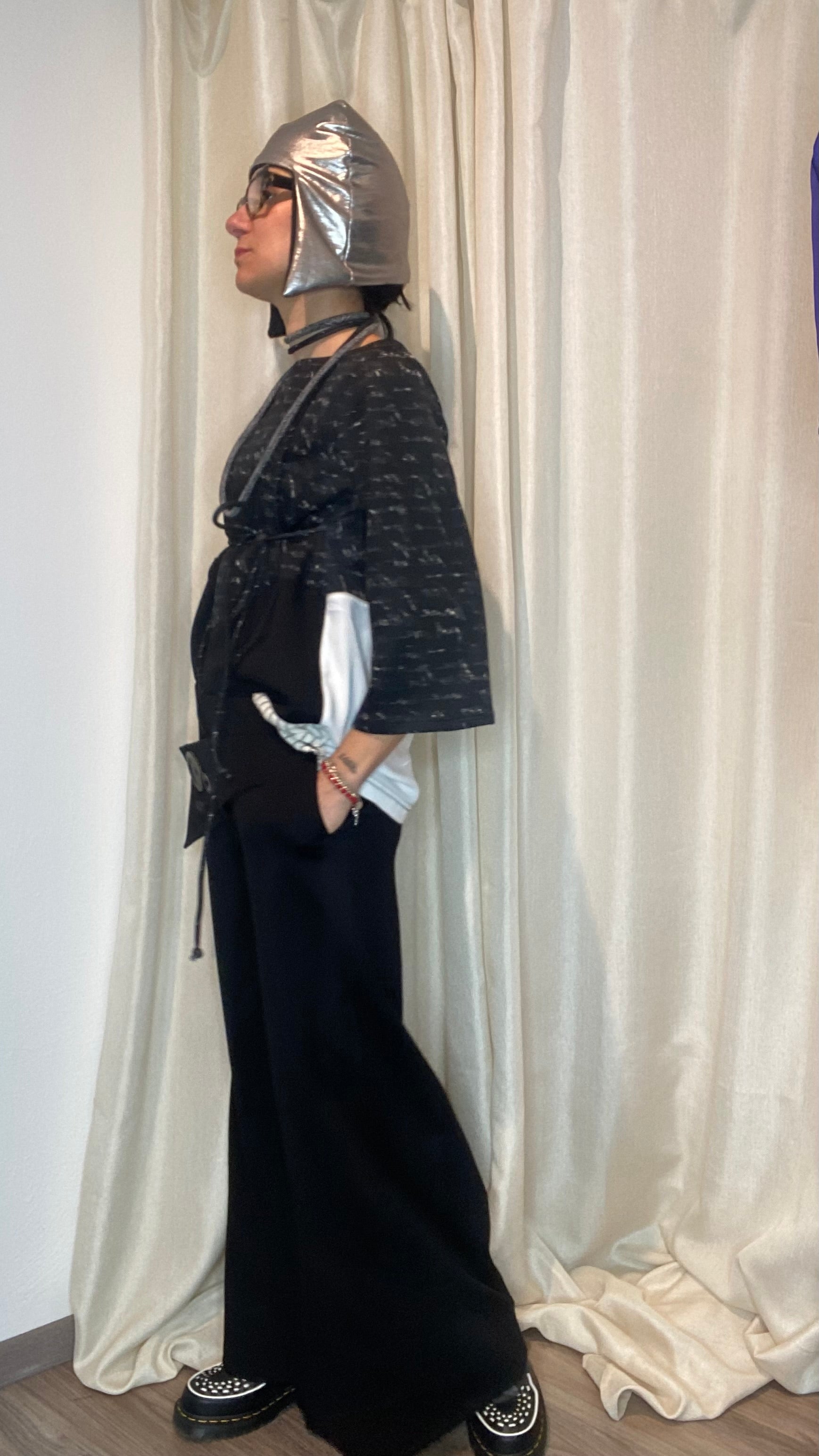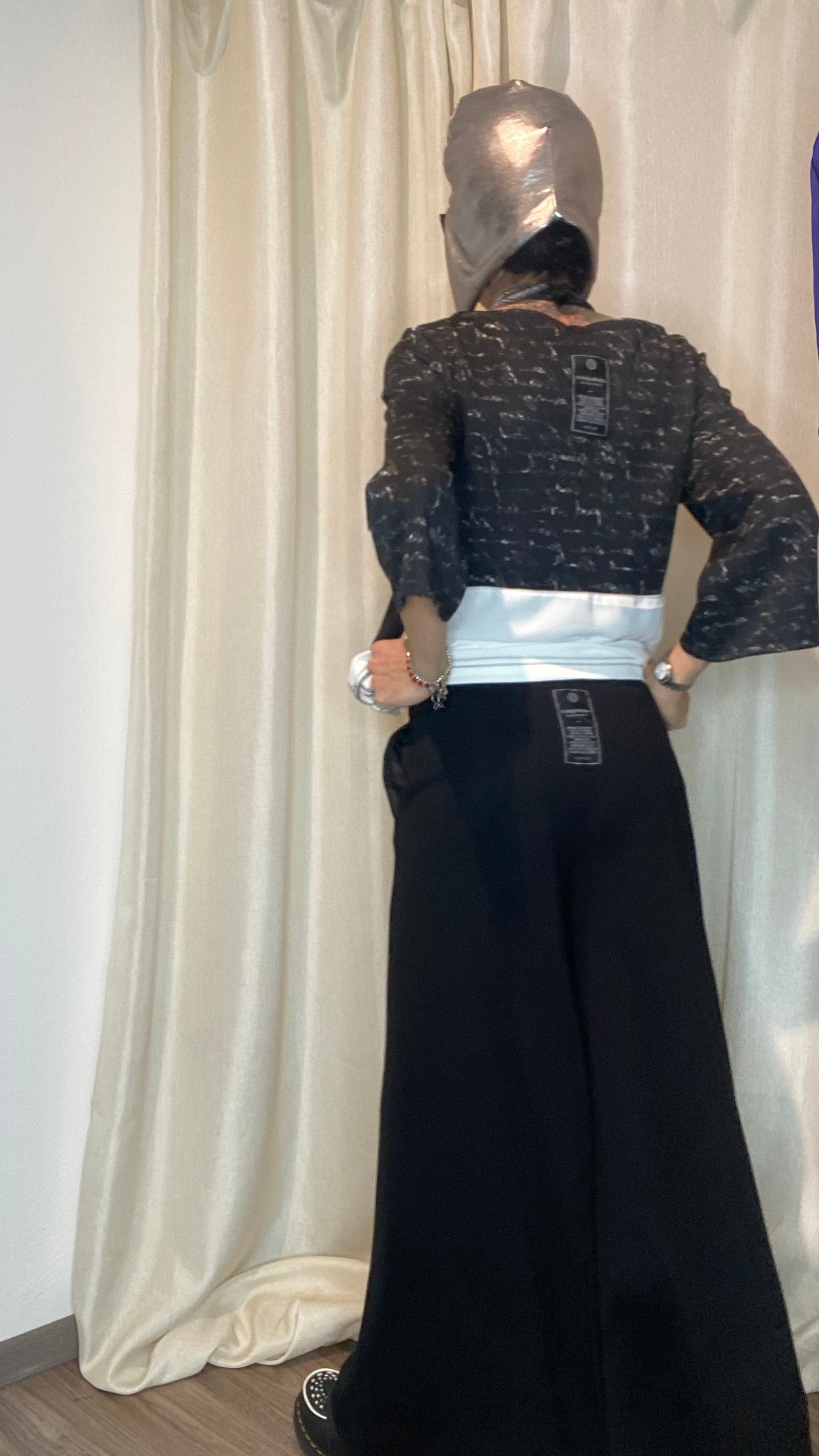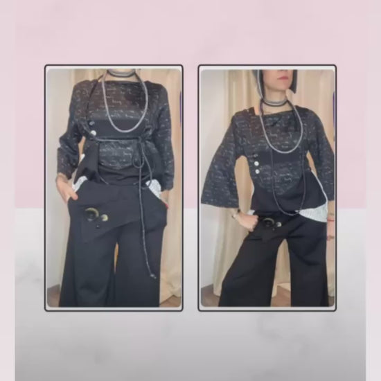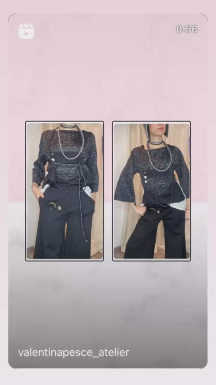 Morbido pantalone a gamba larga in maglia punto Milano, con patta e bottoni applicati sul davanti, tasche laterali ed elastico piatto in vita. Taglia unica, veste dalla tg 38 alla tg 50.