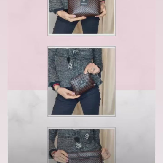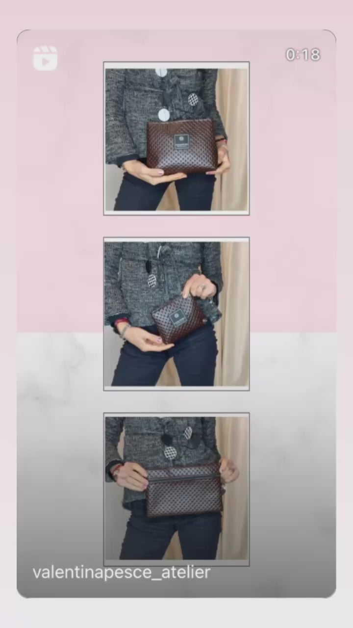 Pratiche e robuste, pochette in pelle vegetale color Testa di Moro a trama, le trovate in tre formati, la grande, la piccola e pitta porta documenti, tutte dotate di cerniera esterna.