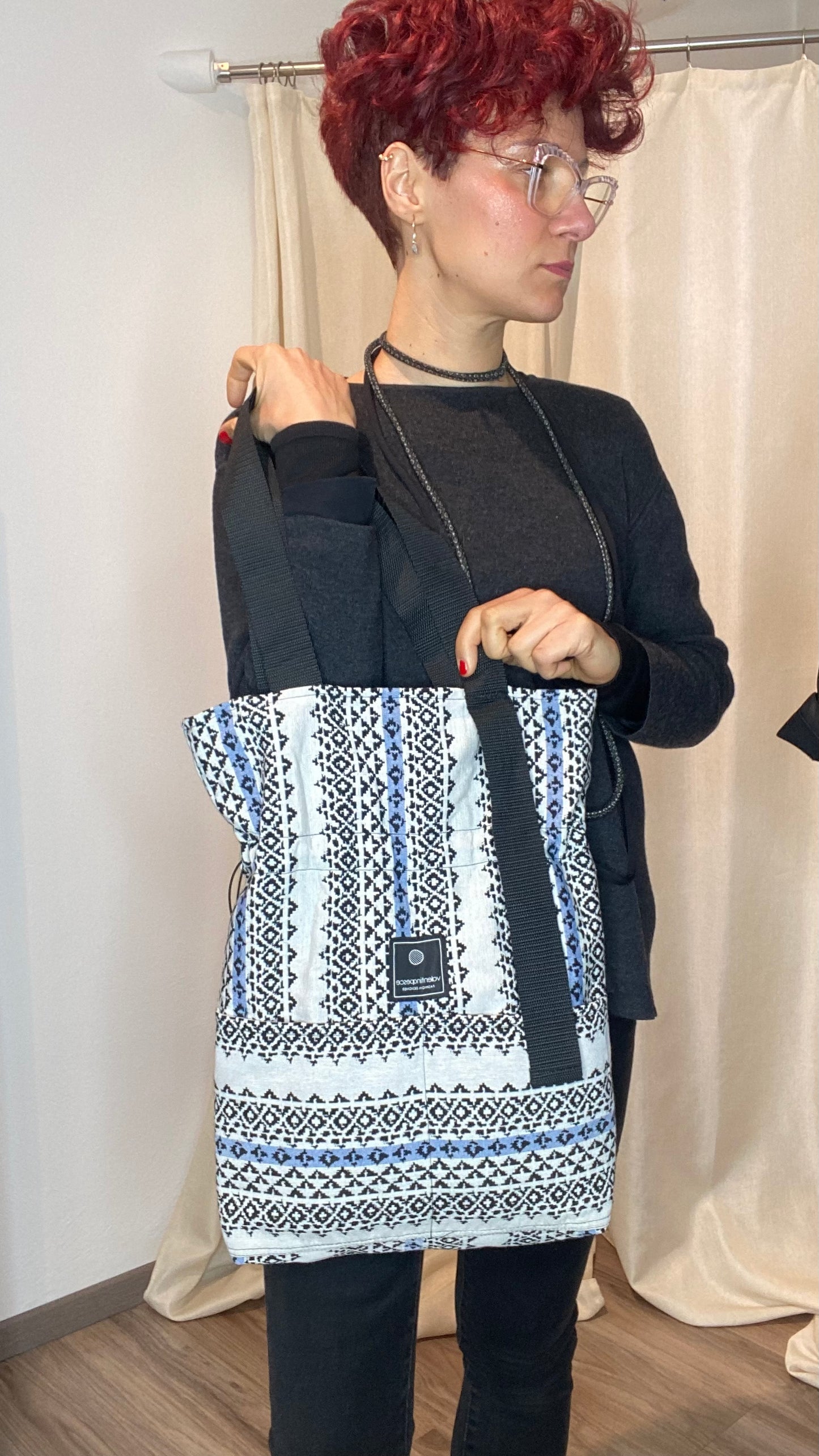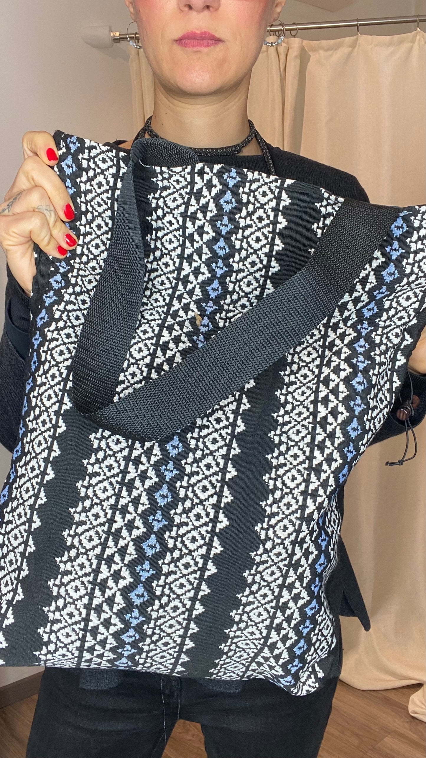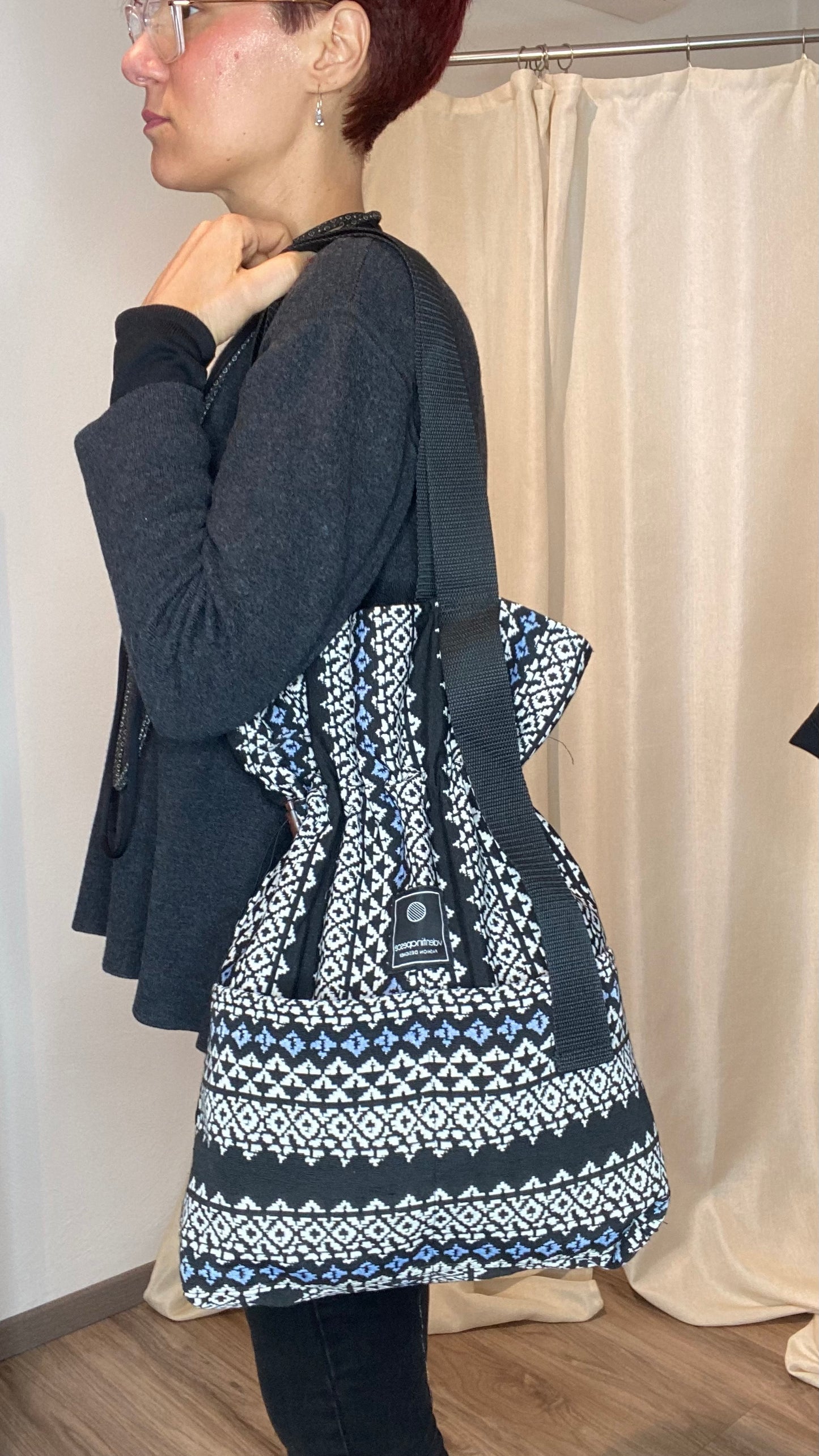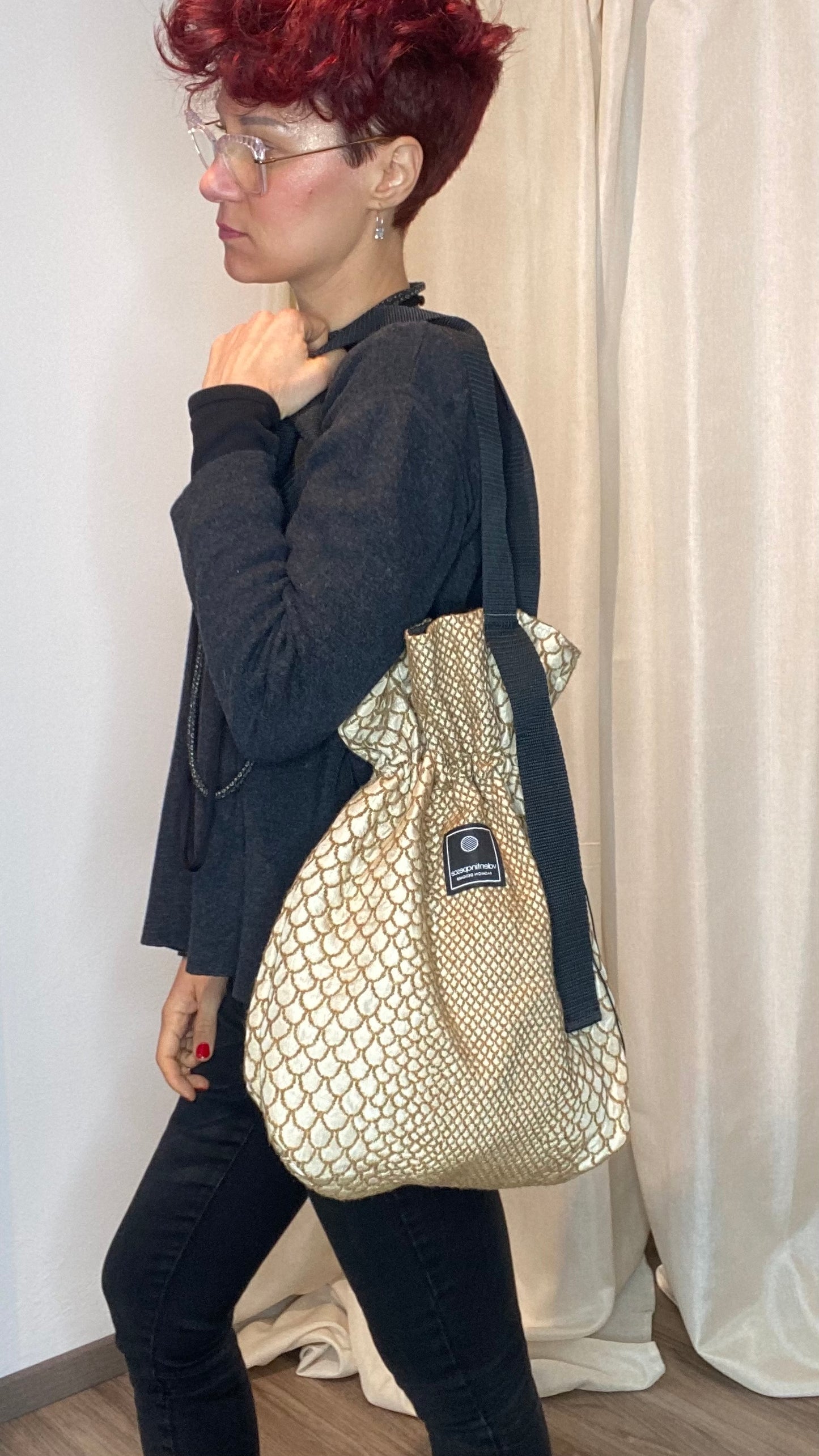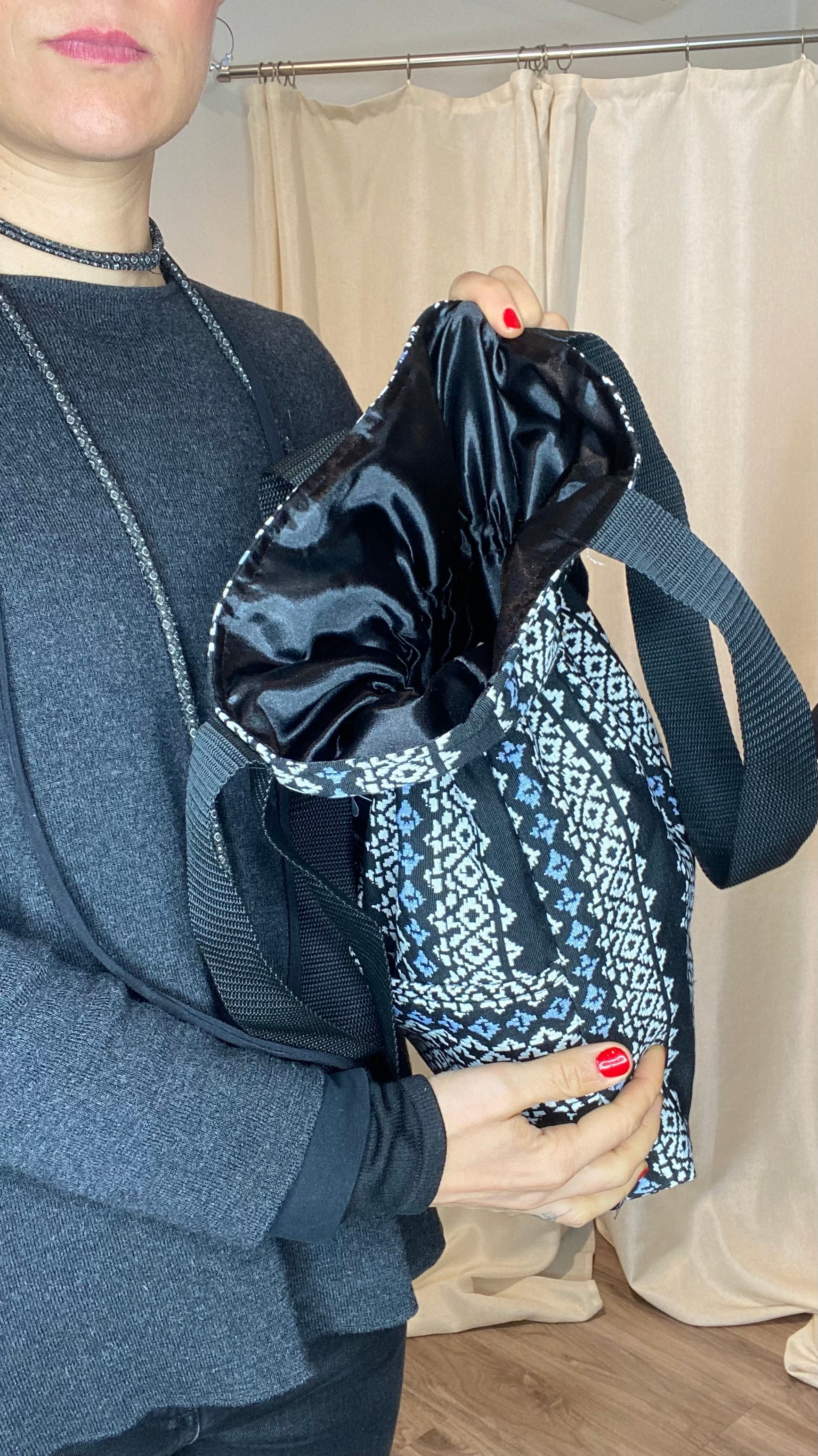 Borsa a Sacchetto in tessuto lavorato, foderata in raso con tasca interna e coulisse elastica come chiusura. Comoda e capiente la su può utilizzare anche come borsa da lavoro per portare libri e quaderni.