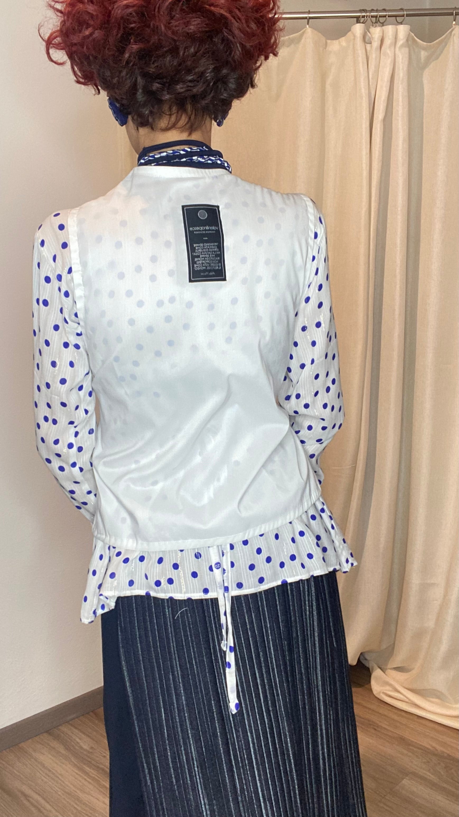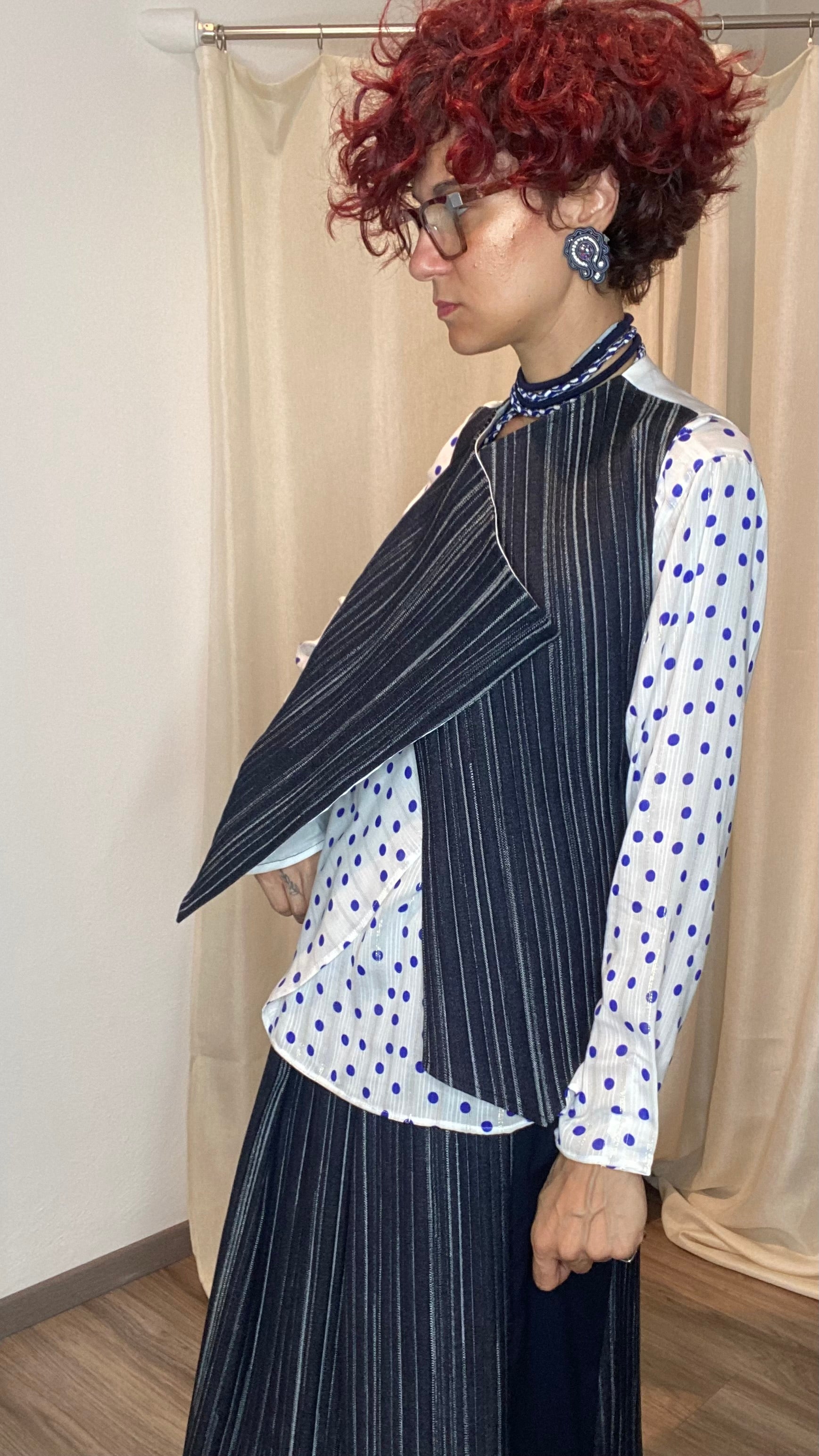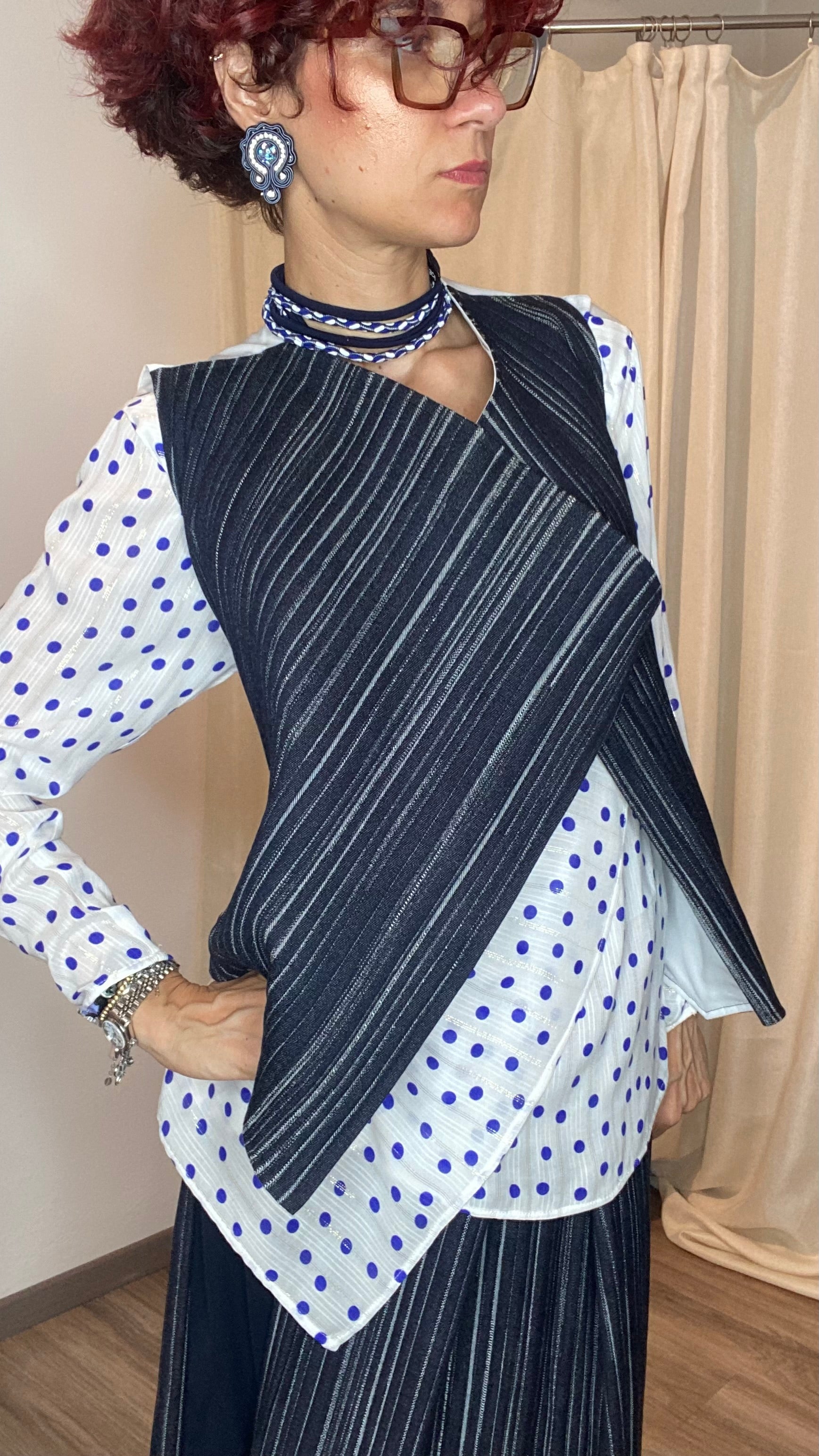 Gilet asimmetrico in jeans e cotone, regolabile in vita mediante laccetti. Veste dalla tg 38 alla 50.